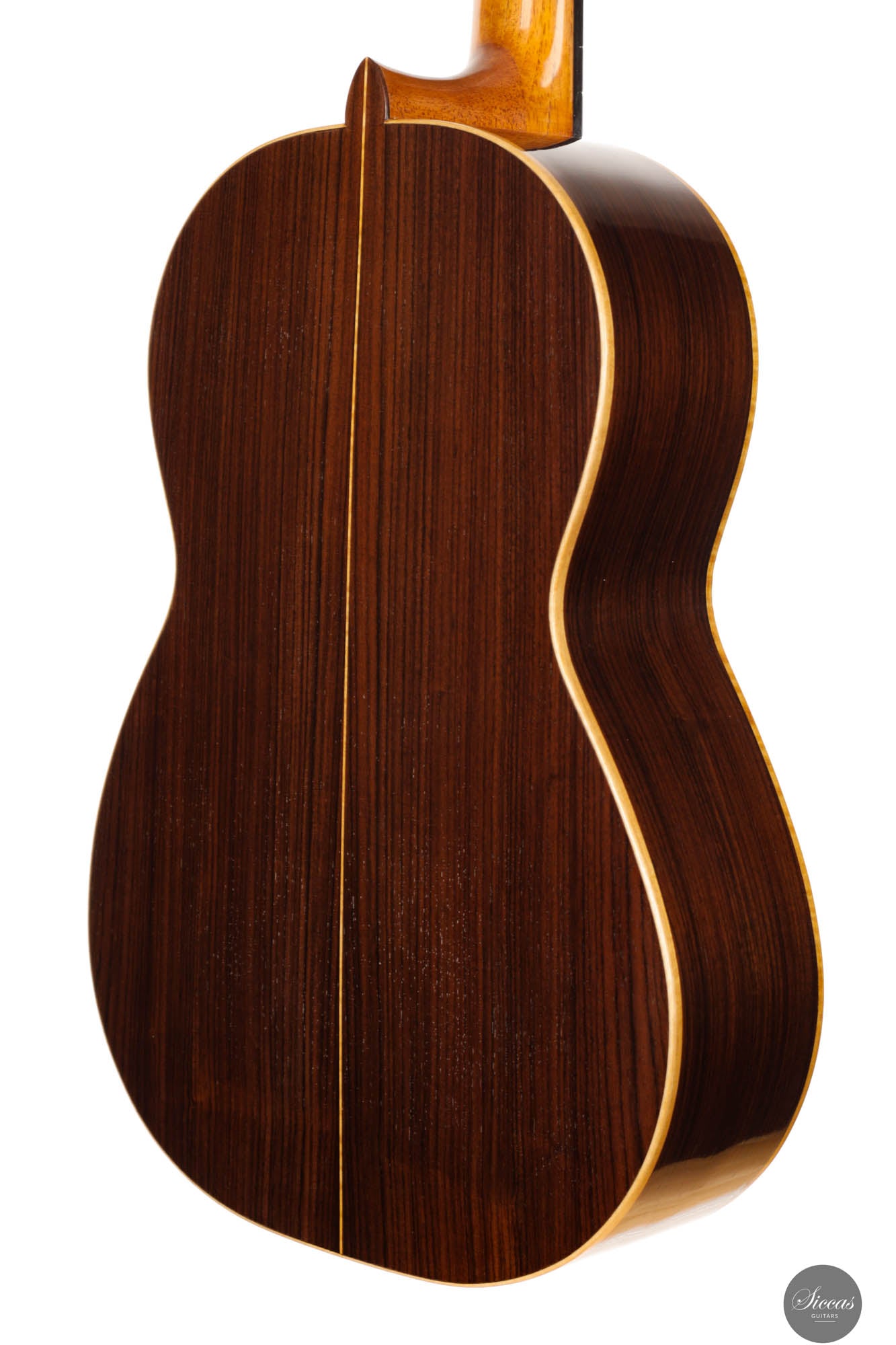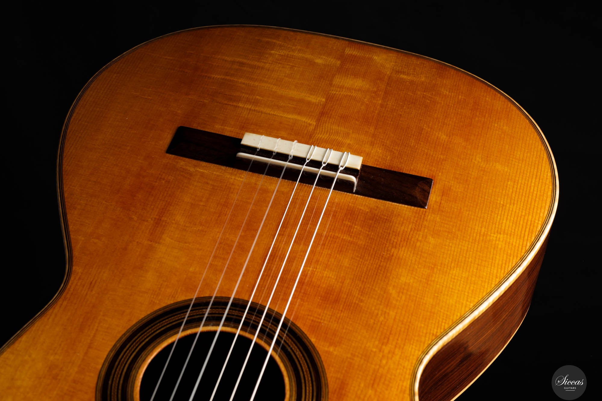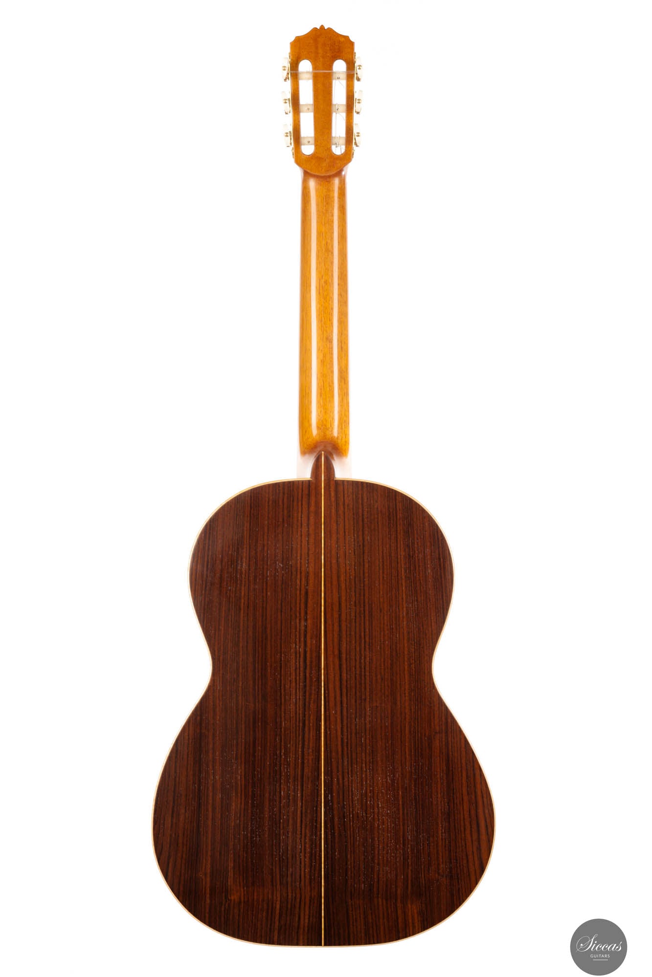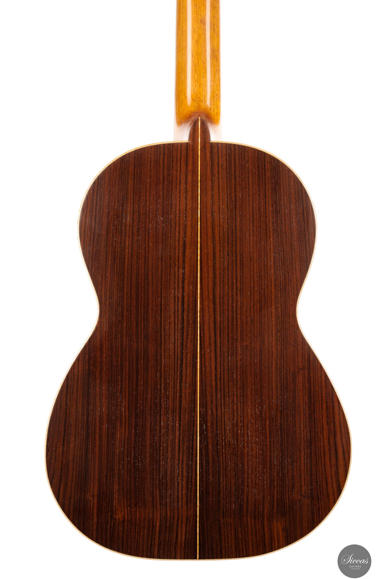 The guitar's aesthetic and sonic characteristics are both mesmerizing and authentic. It features deep, dark, and mysterious basses that harmoniously blend with airy and lush trebles, creating a sound profile that is both charismatic and unique. The visual aspect of the guitar is equally captivating. The golden honey-colored spruce soundboard not only enhances the guitar's resemblance to the iconic Ramirez but also adds a touch of elegance. This is beautifully complemented by the dark Indian rosewood used for the back and sides, making it a visual feast. Despite being a pre-loved instrument, this guitar has been meticulously maintained and remains in excellent condition, showing only superficial playing marks.