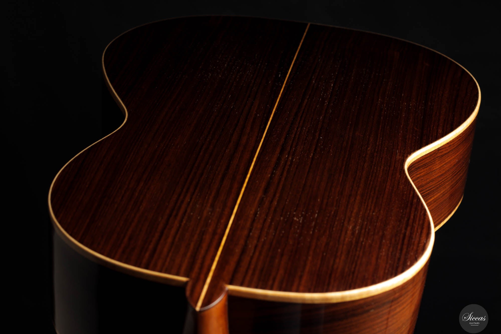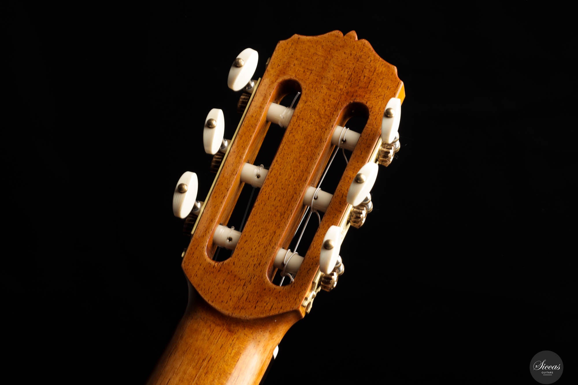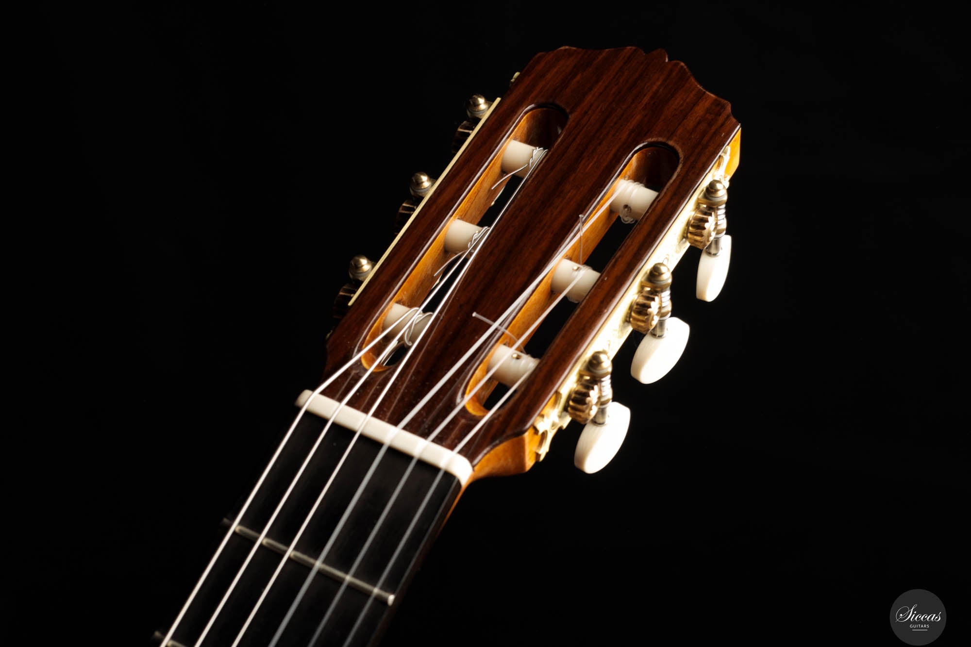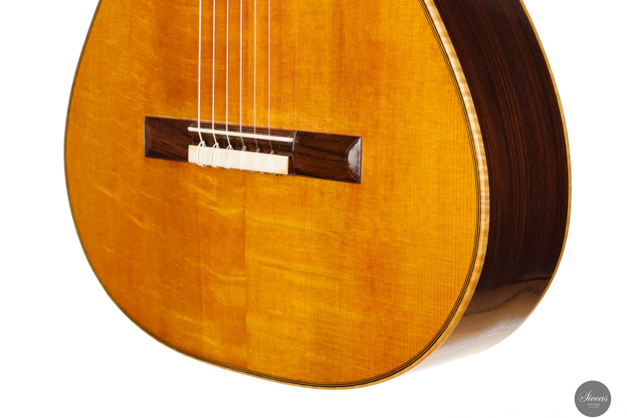 The guitar's aesthetic and sonic characteristics are both mesmerizing and authentic. It features deep, dark, and mysterious basses that harmoniously blend with airy and lush trebles, creating a sound profile that is both charismatic and unique. The visual aspect of the guitar is equally captivating. The golden honey-colored spruce soundboard not only enhances the guitar's resemblance to the iconic Ramirez but also adds a touch of elegance. This is beautifully complemented by the dark Indian rosewood used for the back and sides, making it a visual feast. Despite being a pre-loved instrument, this guitar has been meticulously maintained and remains in excellent condition, showing only superficial playing marks.