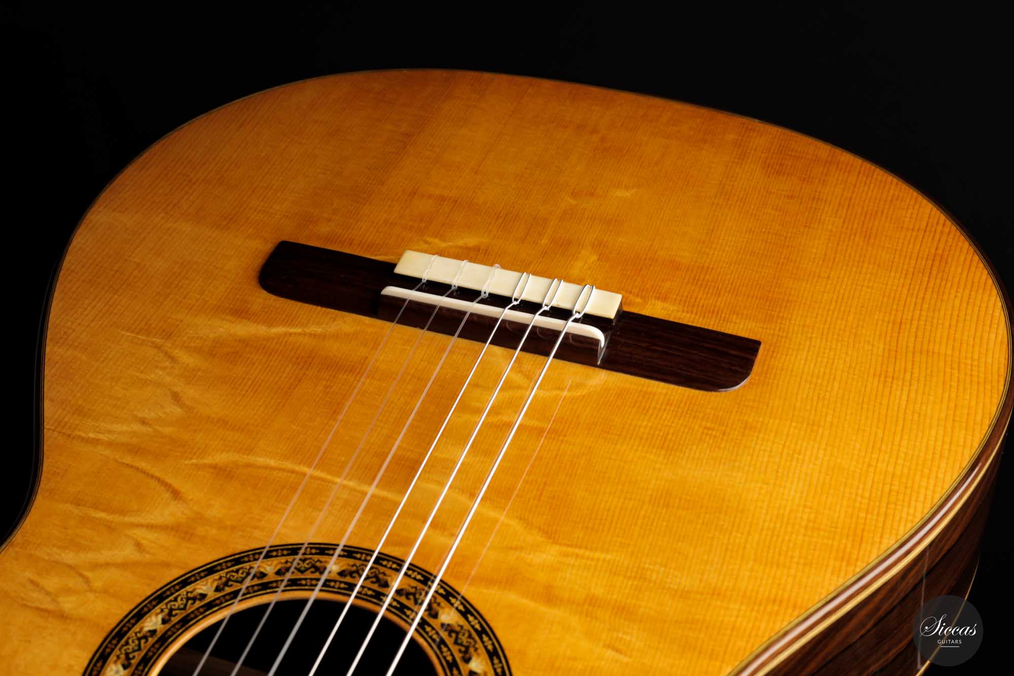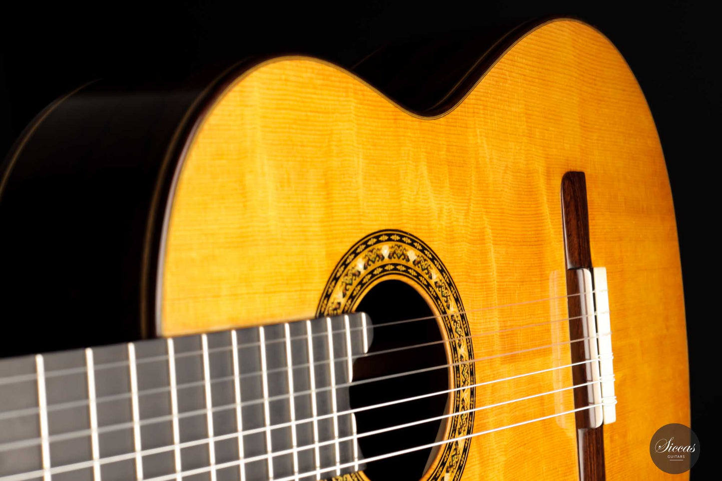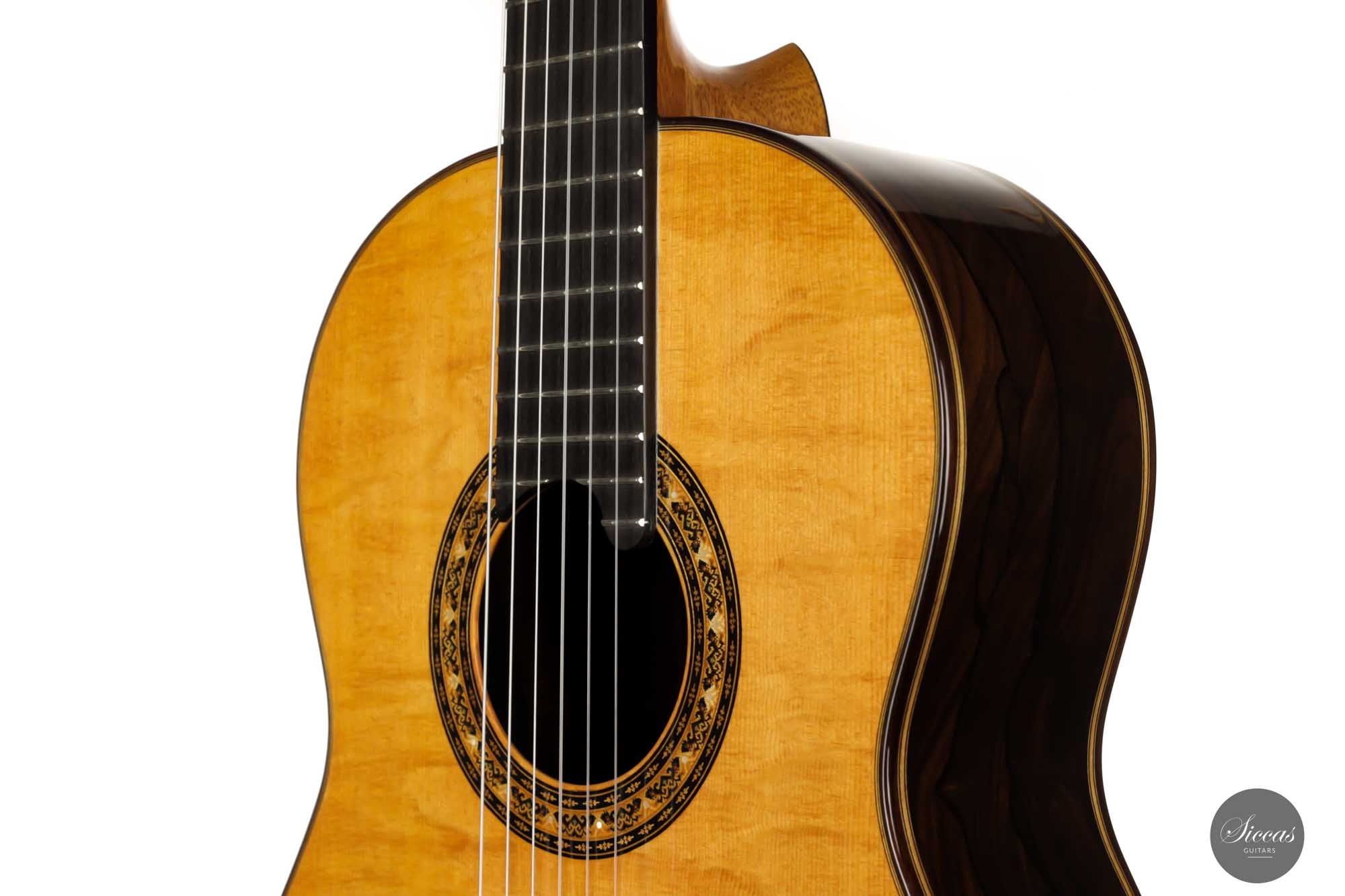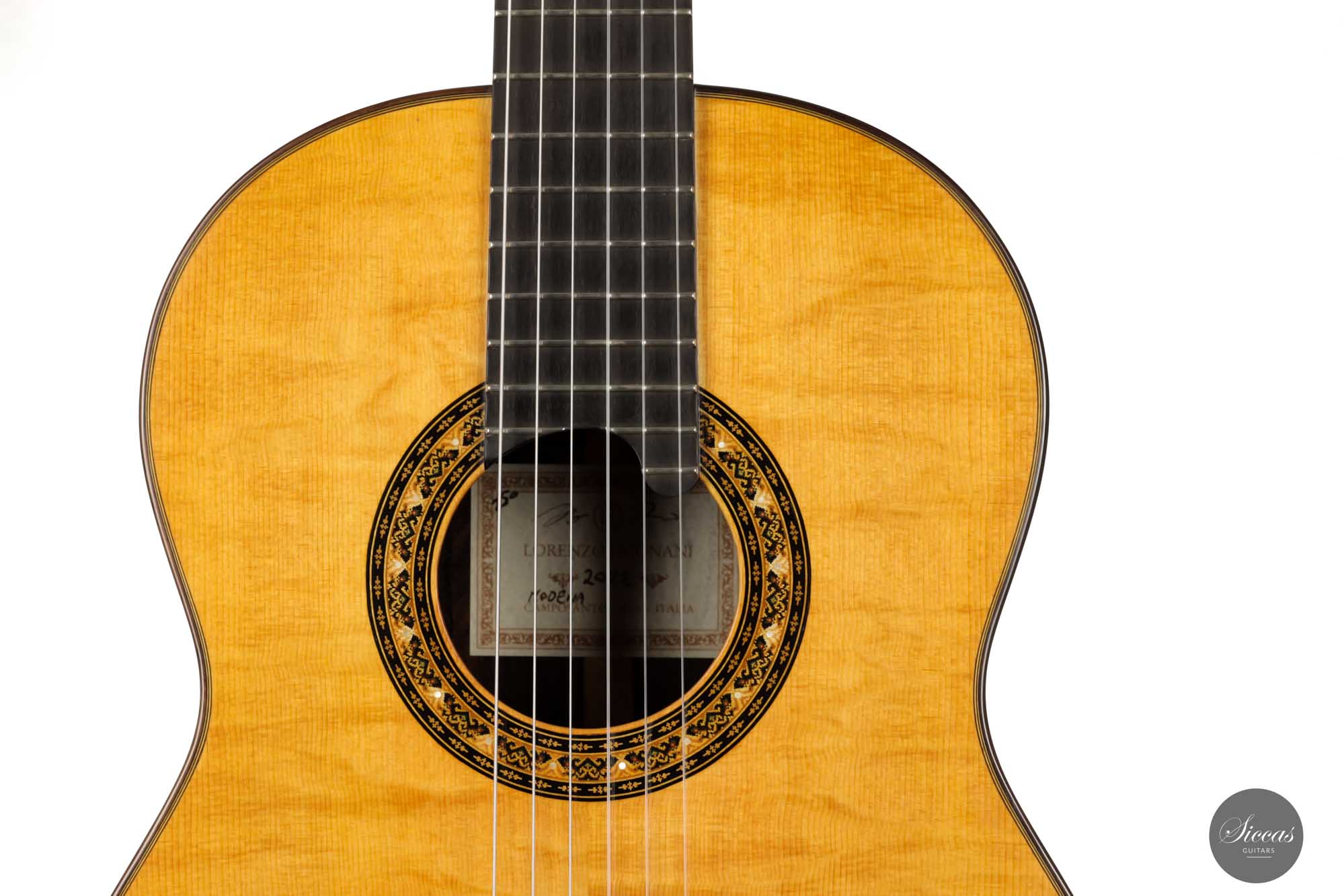 One can easily notice the striking and impressive look of this instrument No. 250 from 2022. The exceptional quality Bearclaw spruce combined with dark and highly decorated ziricote back and sides give this guitar a particular value and one-of-a-kind aesthetic. Lorenzo Frignani found inspiration for this beautiful instrument number 250 in the guitars of David Rubio. Using Rubio's plantilla and ideal of sound, he adapted the internal construction and opted for a traditional "x-bracing," the hallmark of Lorenzo Frignani's guitars. Finally, the mother of pearl dots in the rosette and headstock and the many refined marquetry details make this instrument a true gem. The clear and rich basses with thick singing exhibit this instrument's outstanding overall balance. Easily one of the highest-level concert guitars with stunning craftsmanship.