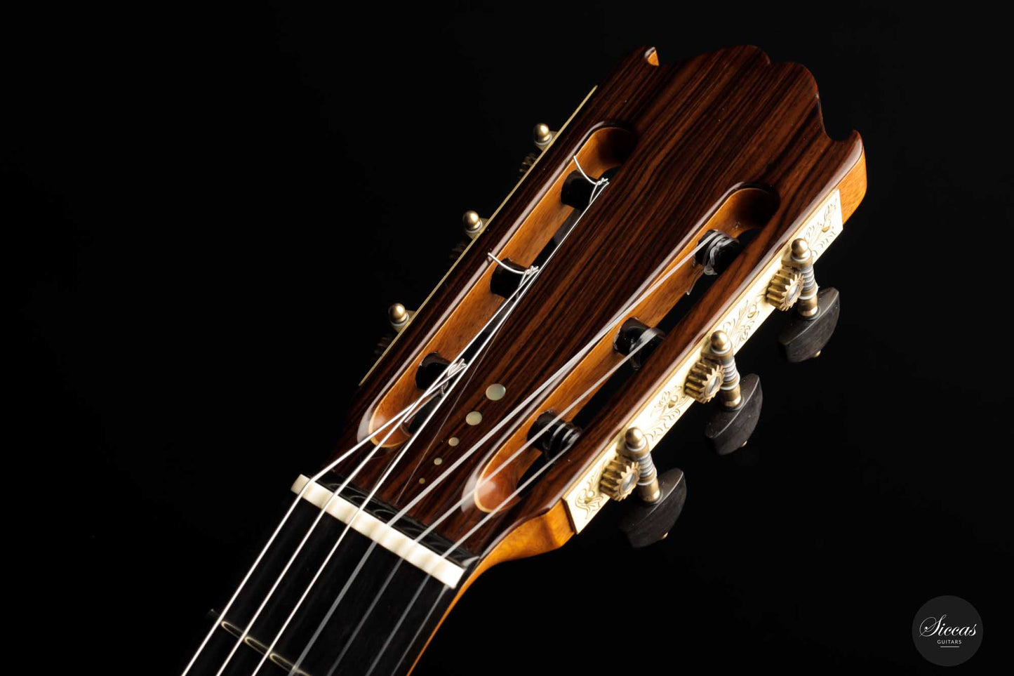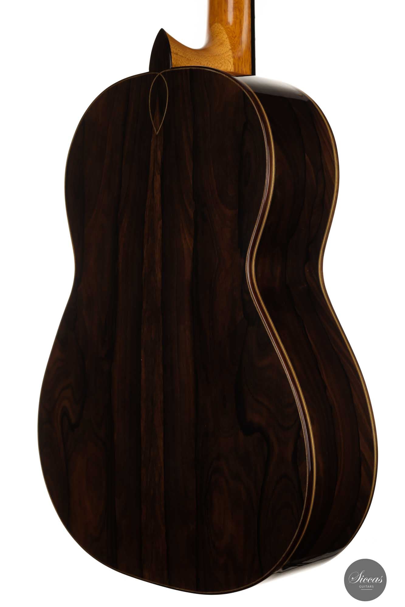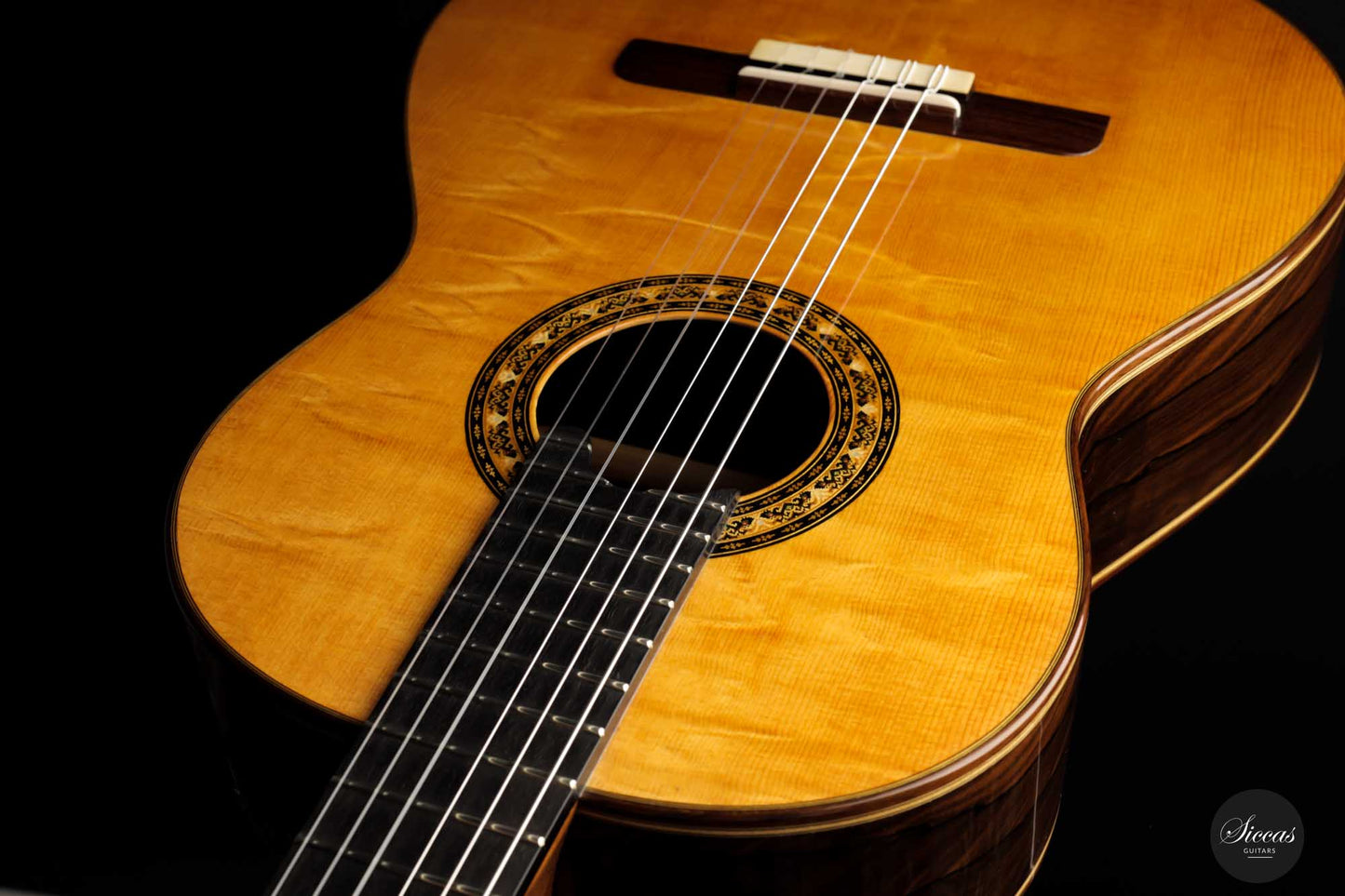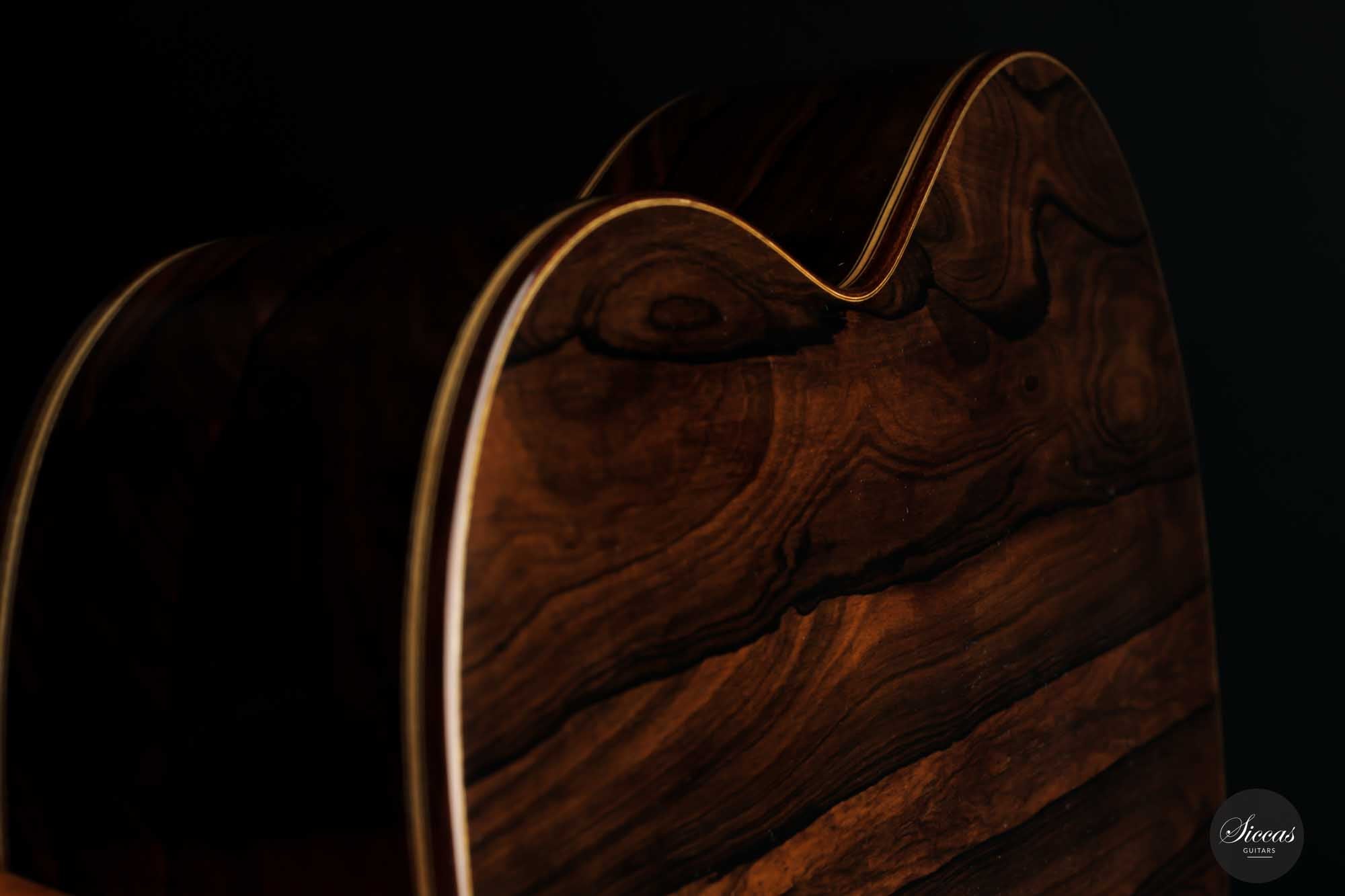 One can easily notice the striking and impressive look of this instrument No. 250 from 2022. The exceptional quality Bearclaw spruce combined with dark and highly decorated ziricote back and sides give this guitar a particular value and one-of-a-kind aesthetic. Lorenzo Frignani found inspiration for this beautiful instrument number 250 in the guitars of David Rubio. Using Rubio's plantilla and ideal of sound, he adapted the internal construction and opted for a traditional "x-bracing," the hallmark of Lorenzo Frignani's guitars. Finally, the mother of pearl dots in the rosette and headstock and the many refined marquetry details make this instrument a true gem. The clear and rich basses with thick singing exhibit this instrument's outstanding overall balance. Easily one of the highest-level concert guitars with stunning craftsmanship.