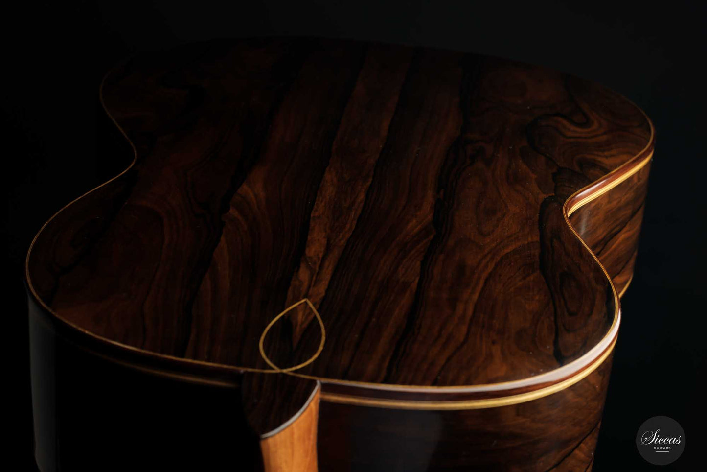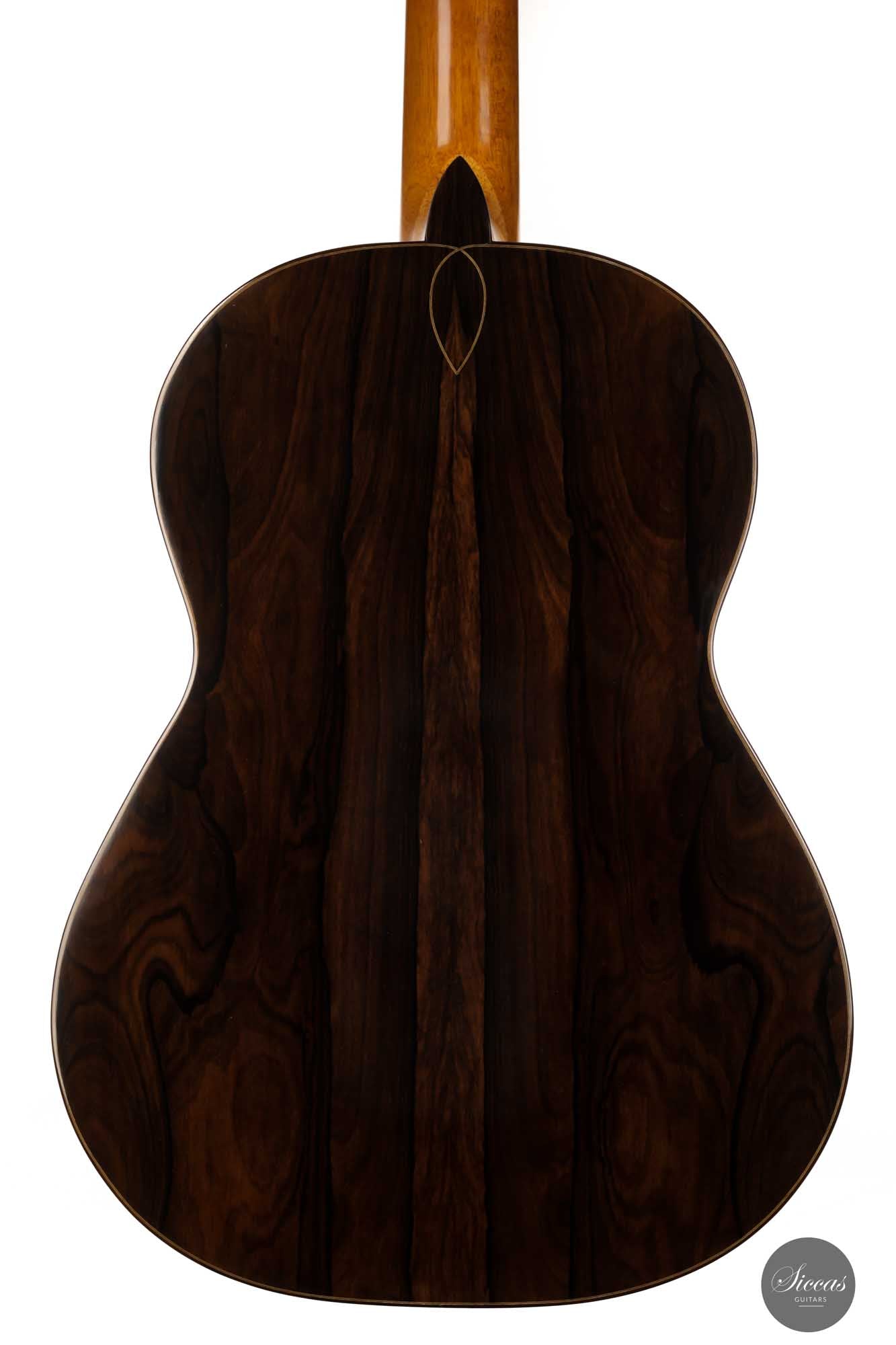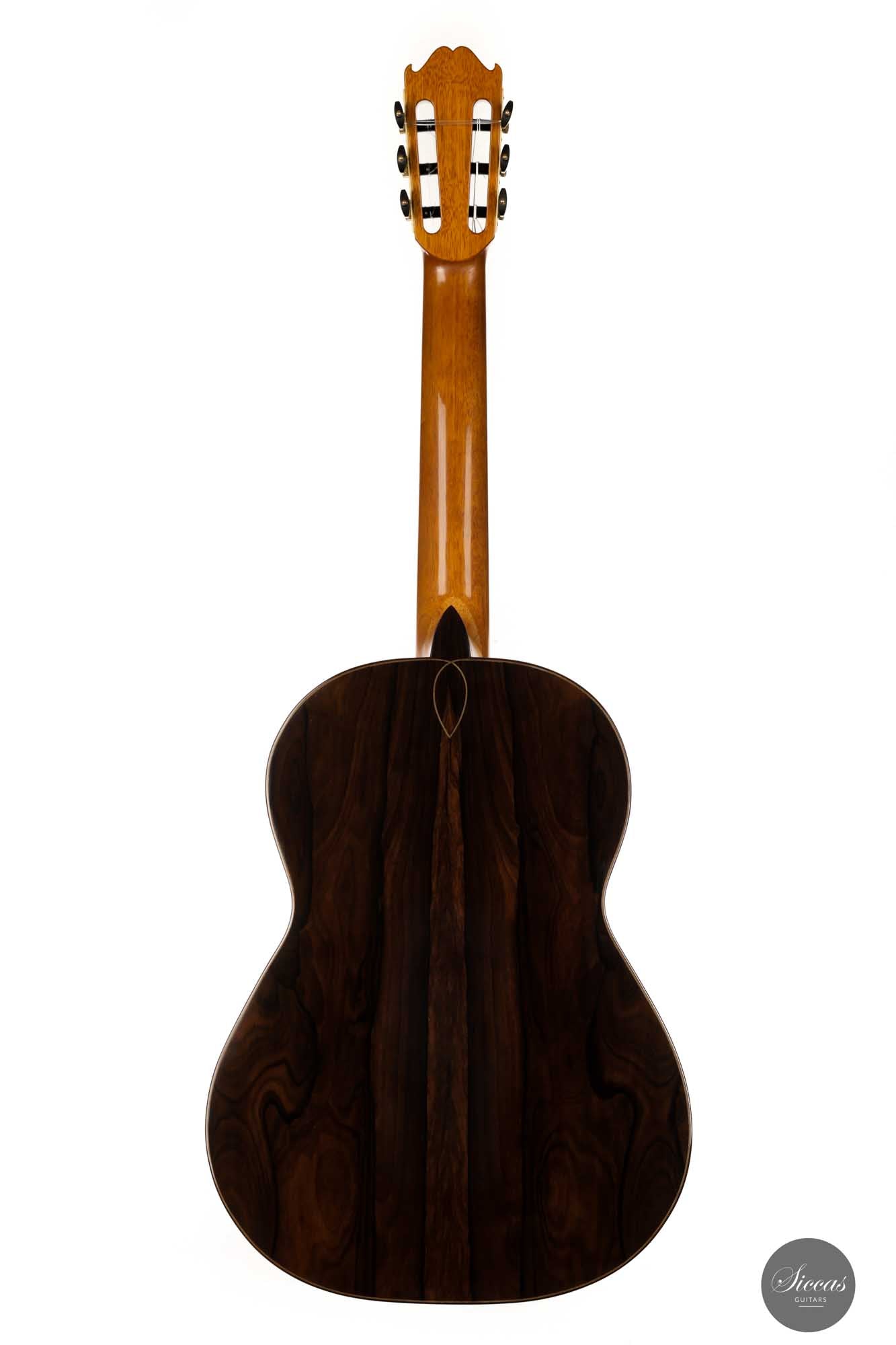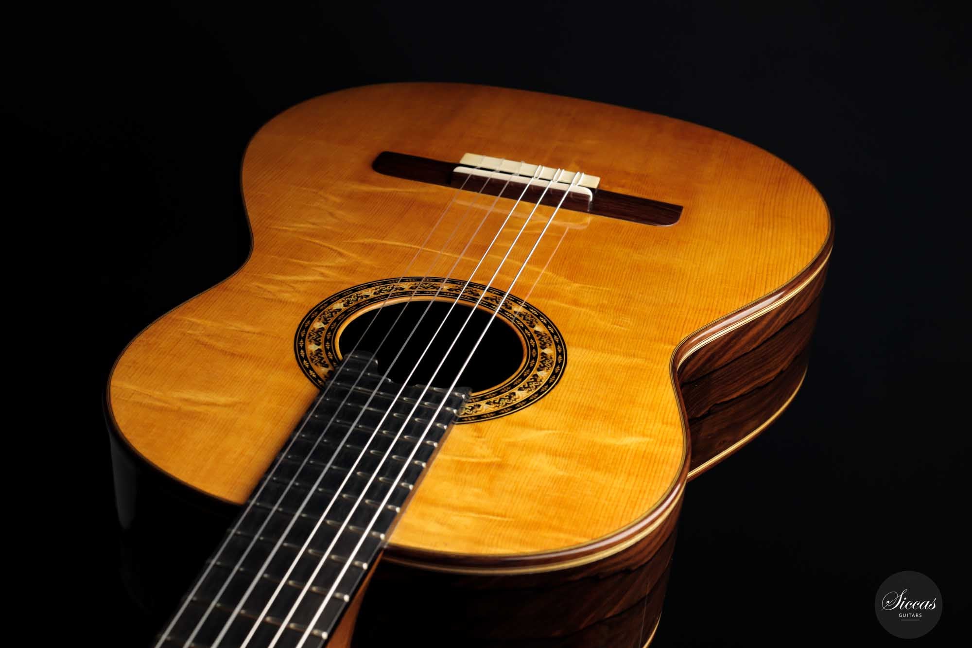 One can easily notice the striking and impressive look of this instrument No. 250 from 2022. The exceptional quality Bearclaw spruce combined with dark and highly decorated ziricote back and sides give this guitar a particular value and one-of-a-kind aesthetic. Lorenzo Frignani found inspiration for this beautiful instrument number 250 in the guitars of David Rubio. Using Rubio's plantilla and ideal of sound, he adapted the internal construction and opted for a traditional "x-bracing," the hallmark of Lorenzo Frignani's guitars. Finally, the mother of pearl dots in the rosette and headstock and the many refined marquetry details make this instrument a true gem. The clear and rich basses with thick singing exhibit this instrument's outstanding overall balance. Easily one of the highest-level concert guitars with stunning craftsmanship.