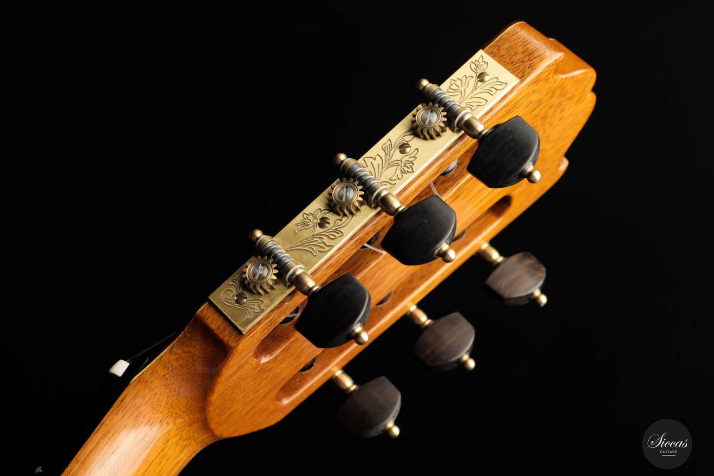 Immediately eye-catching to the eye is the striking and impressive appearance of this Frignani No. 250 from 2022. The combination of exceptionally beautiful bear-claw-spruce of exquisite quality and the dark, finely decorated body give this guitar a very particular appeal and a unique aesthetic. Lorenzo Frignani was inspired by David Rubio's guitars to create this beautiful instrument. Following the plantilla and Rubio's sound ideal, he adapted the interior construction and opted for a traditional "x-bracing", which is the trademark of the Italian maestro. Also, the mother of pearl dots in the rosette and in the headstock as well as the many refined inlay details make this instrument a unique masterpiece. Its clear and rich basses with their full expression, harmonise perfectly with the warmly singing trebles and provide an excellent overall balance. Without a doubt, this instrument belongs to the high-class and outstandingly crafted concert guitars.