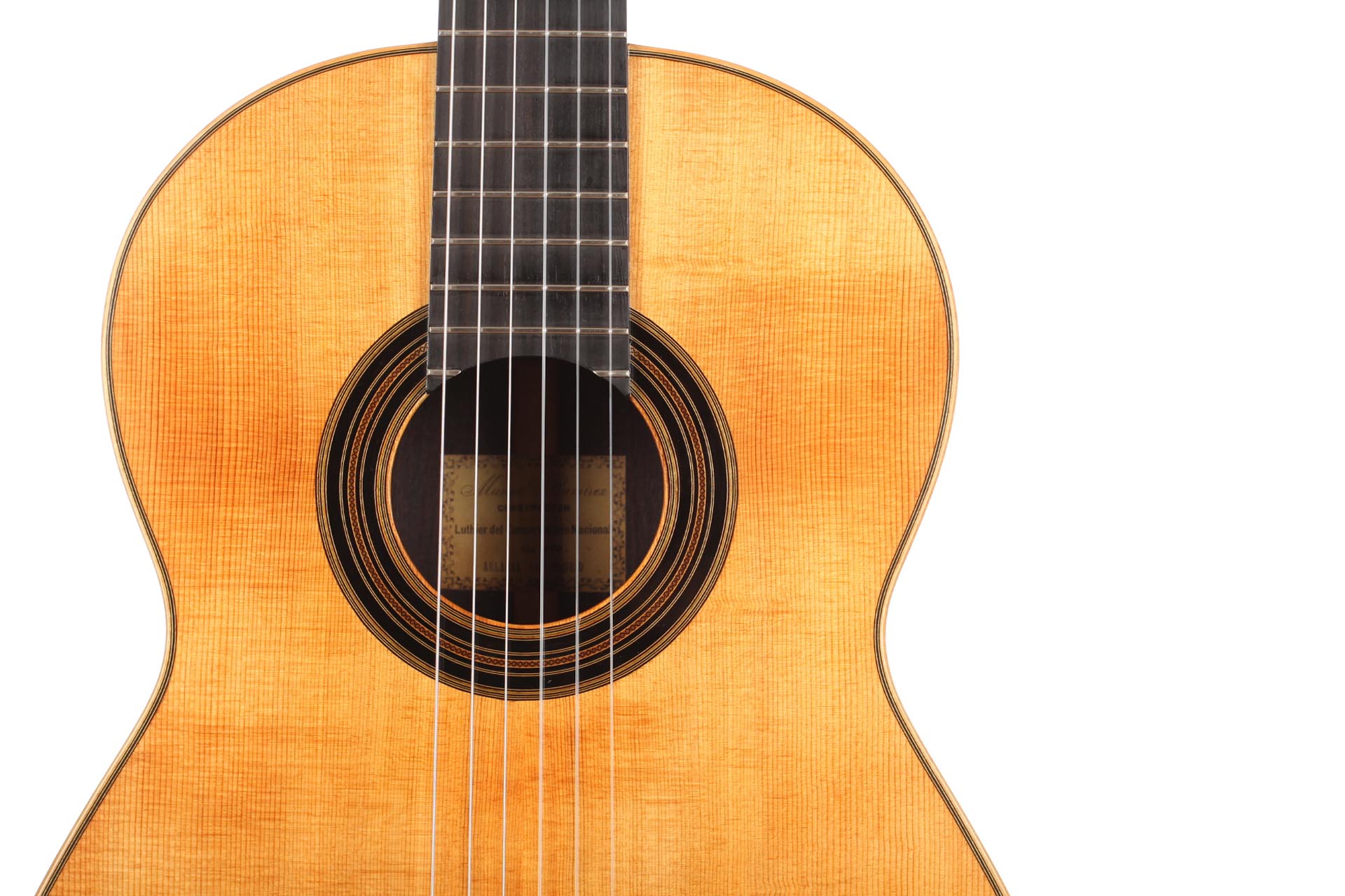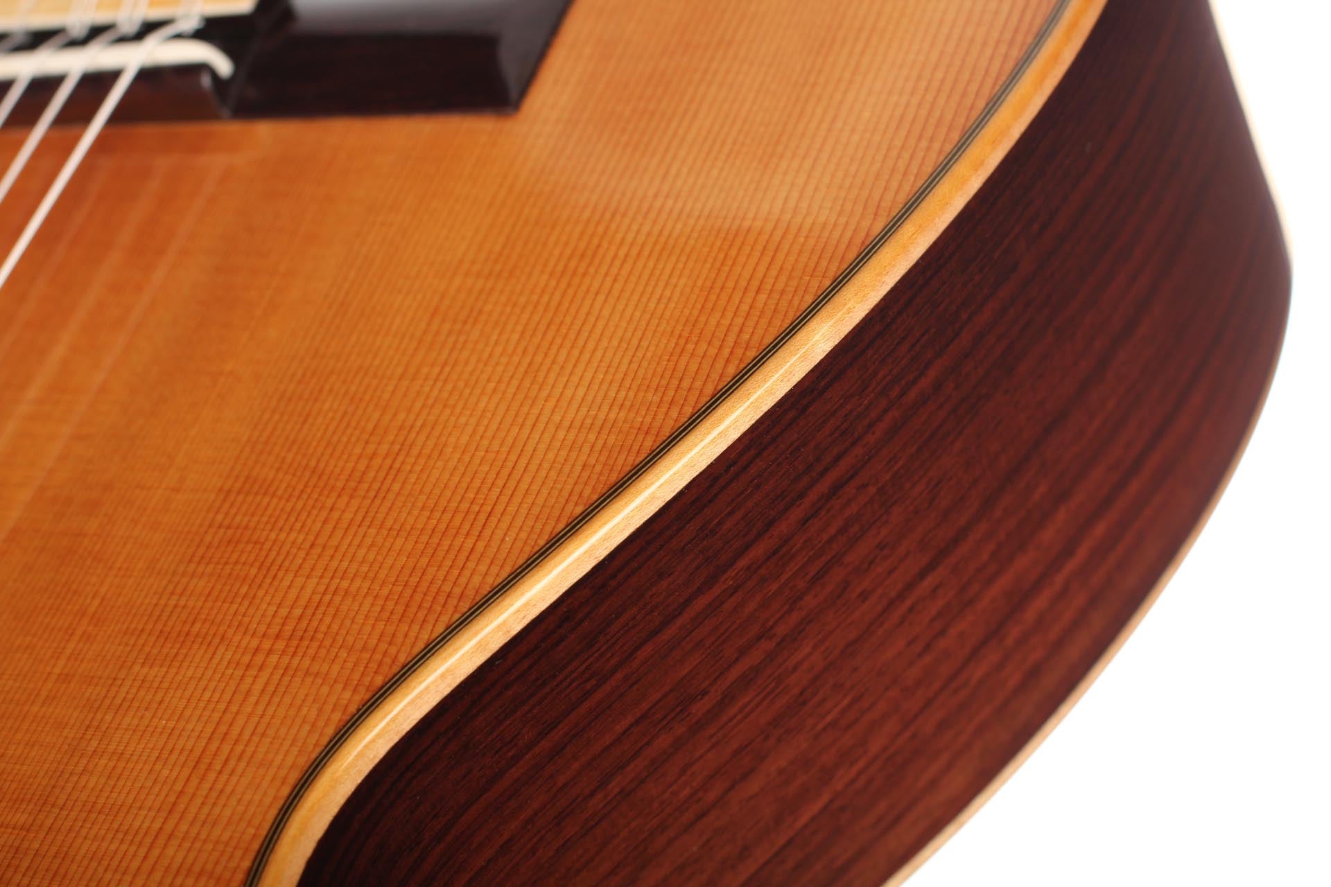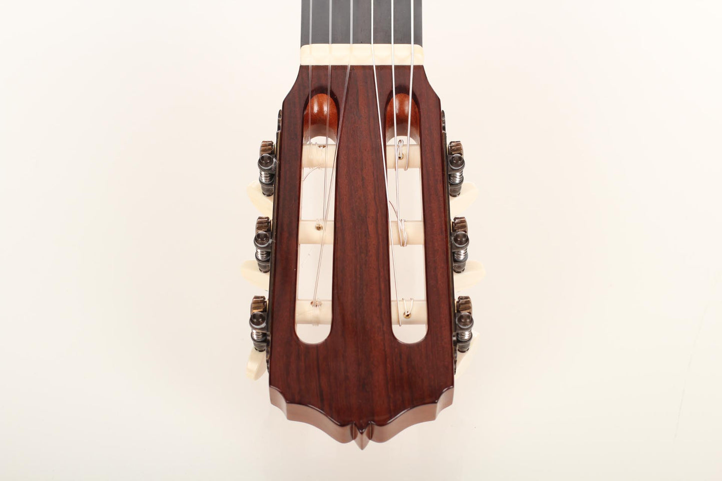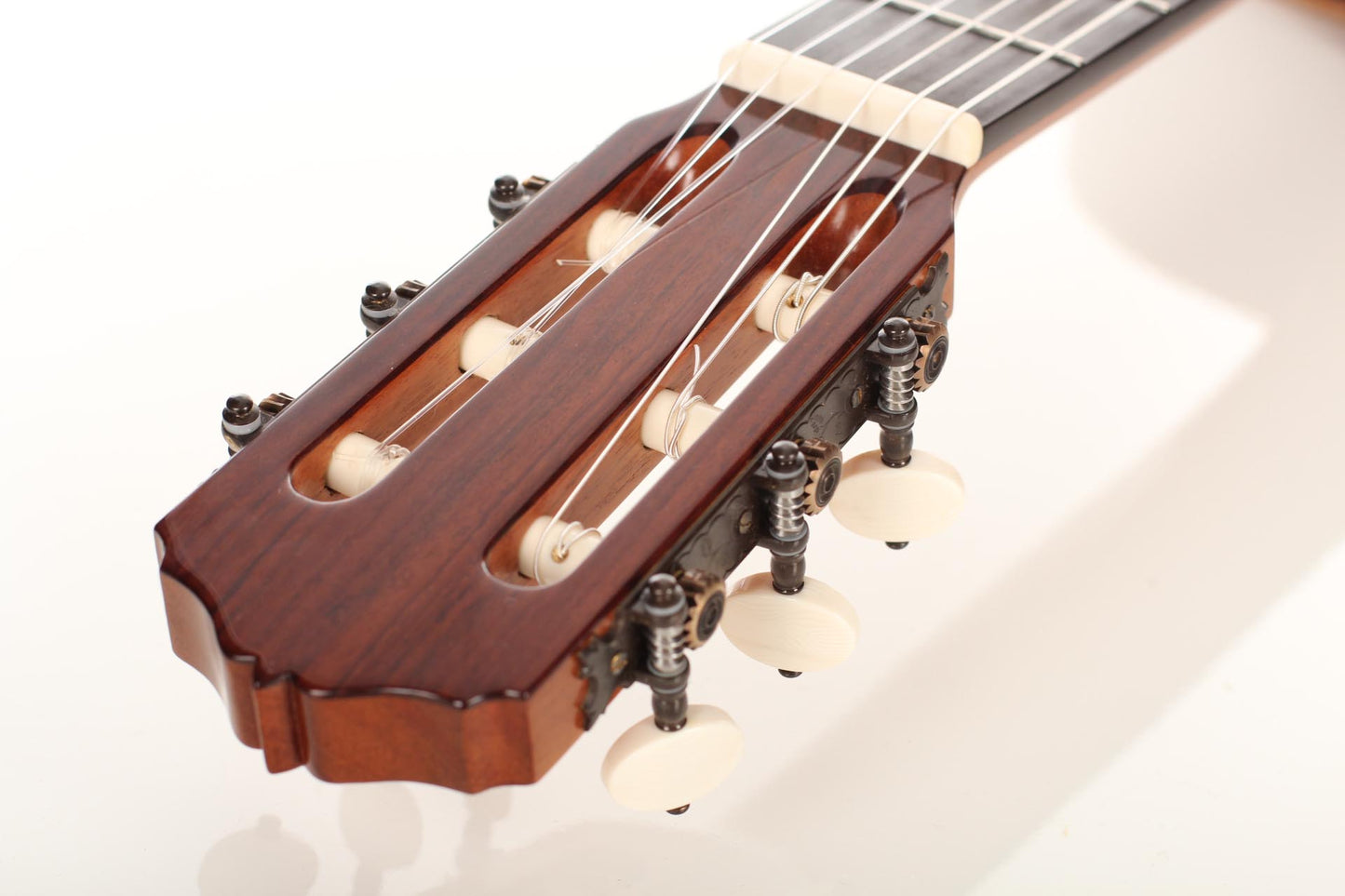 Every instrument constructed in Lorenzo Frignani's workshop is made of the highest quality seasoned woods, as for example this special 1910 Manuel Ramirez copy. The original is part of his private collection. Lorenzo's goal is to build a guitar that is as close to the original as possible regarding construction and quality of sound. He enjoys to copy original guitars and to create a sound that is rare these days. This new Manuel Ramirez copy has a spruce top and Indian Rosewood back and sides. The French-polish finish was “aged” to give the instrument a used look. The craftsmanship is impressive and shows the love for every detail. The sound is lovely and comes extremely close to the original instrument – it has a beautiful warm old world sound. Hear and see our video that we recorded with this guitar to get an impression and feeling of this magnificent instrument. As tuning machines Lorenzo Frignani has chosen Alessi tuners, which fit aesthetically very well with the instrument. A Hiscox Pro II case is included.
