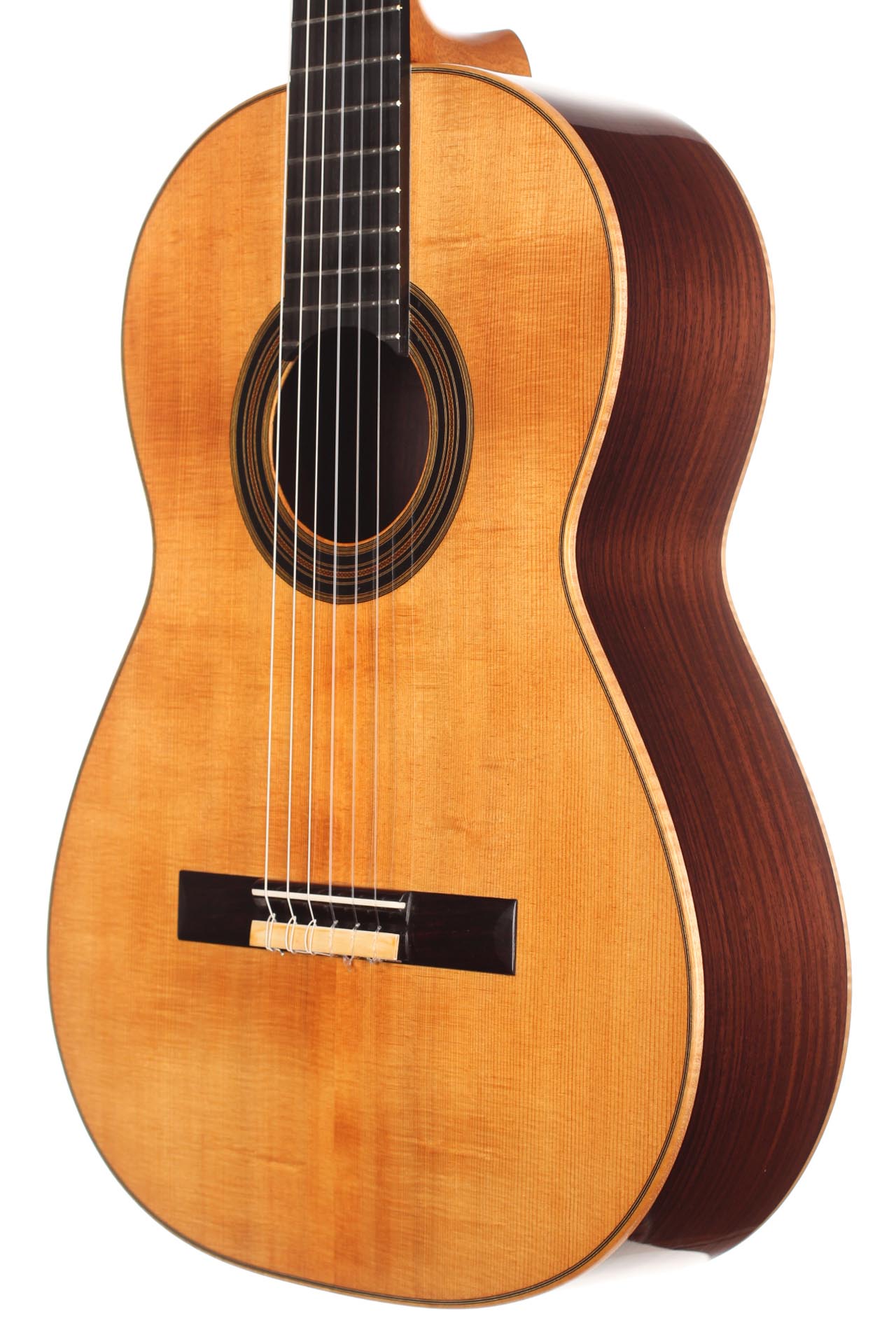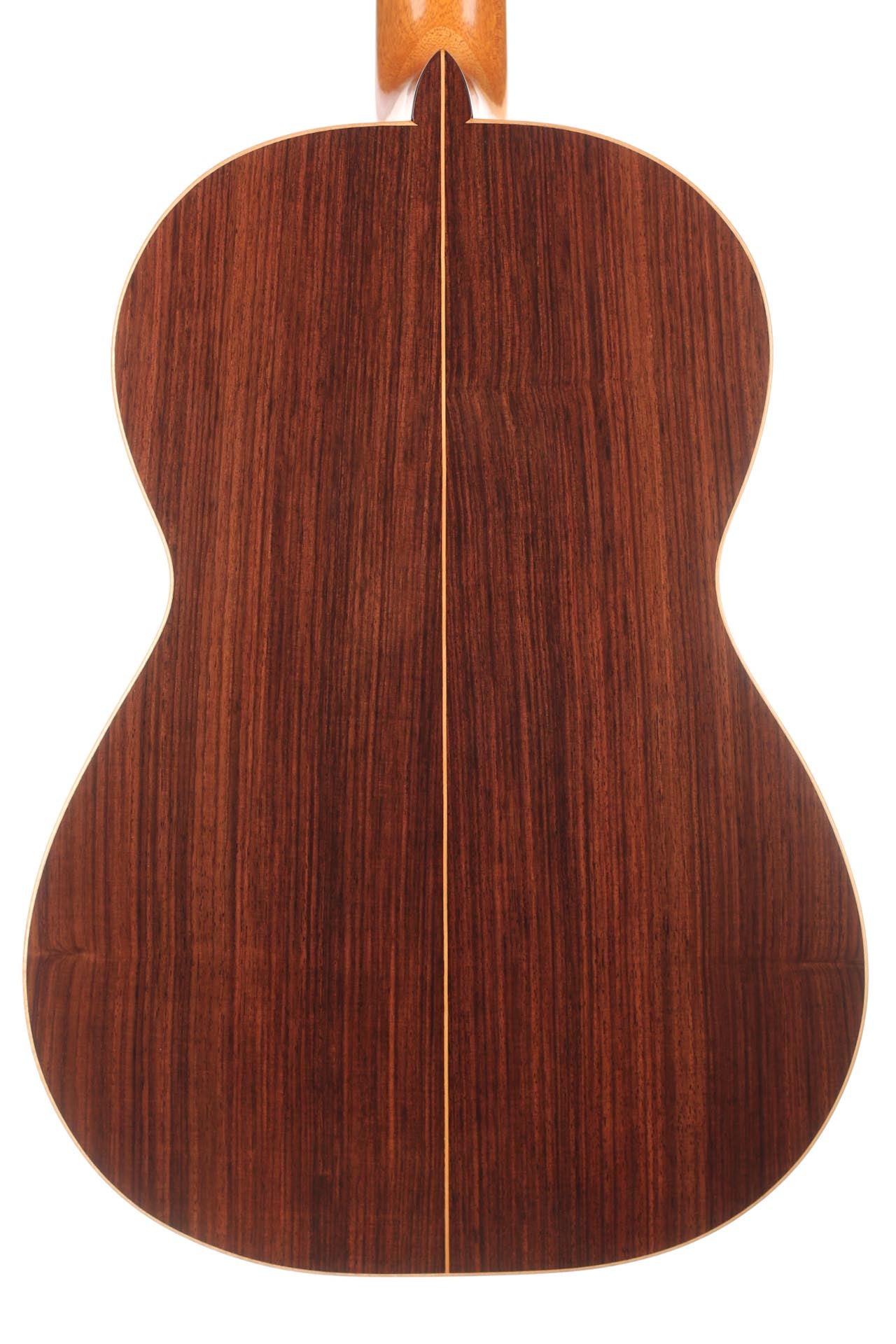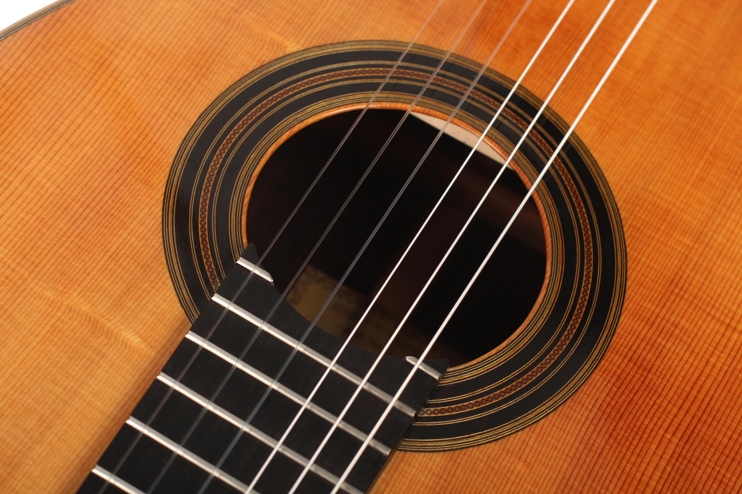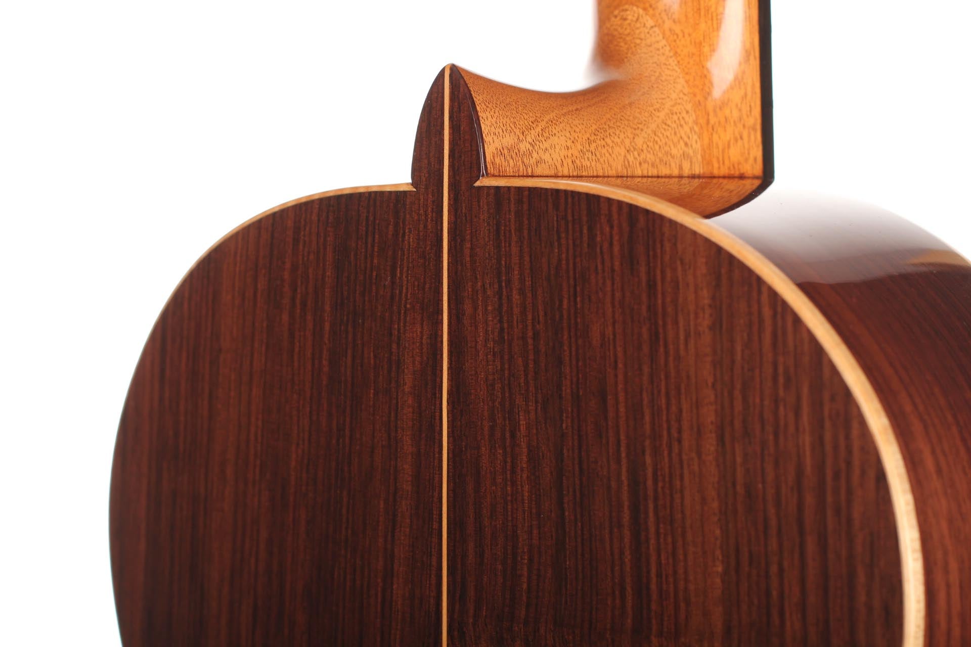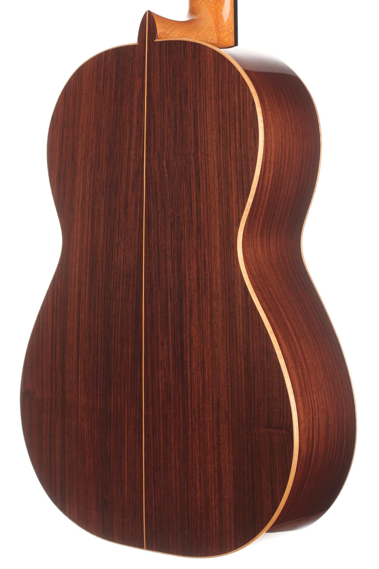 Every instrument constructed in Lorenzo Frignani's workshop is made of the highest quality seasoned woods, as for example this special 1910 Manuel Ramirez copy. The original is part of his private collection. Lorenzo's goal is to build a guitar that is as close to the original as possible regarding construction and quality of sound. He enjoys to copy original guitars and to create a sound that is rare these days. This new Manuel Ramirez copy has a spruce top and Indian Rosewood back and sides. The French-polish finish was “aged” to give the instrument a used look. The craftsmanship is impressive and shows the love for every detail. The sound is lovely and comes extremely close to the original instrument – it has a beautiful warm old world sound. Hear and see our video that we recorded with this guitar to get an impression and feeling of this magnificent instrument. As tuning machines Lorenzo Frignani has chosen Alessi tuners, which fit aesthetically very well with the instrument. A Hiscox Pro II case is included.
