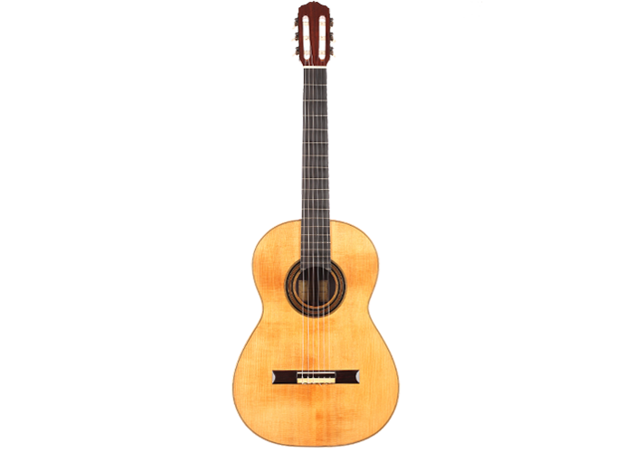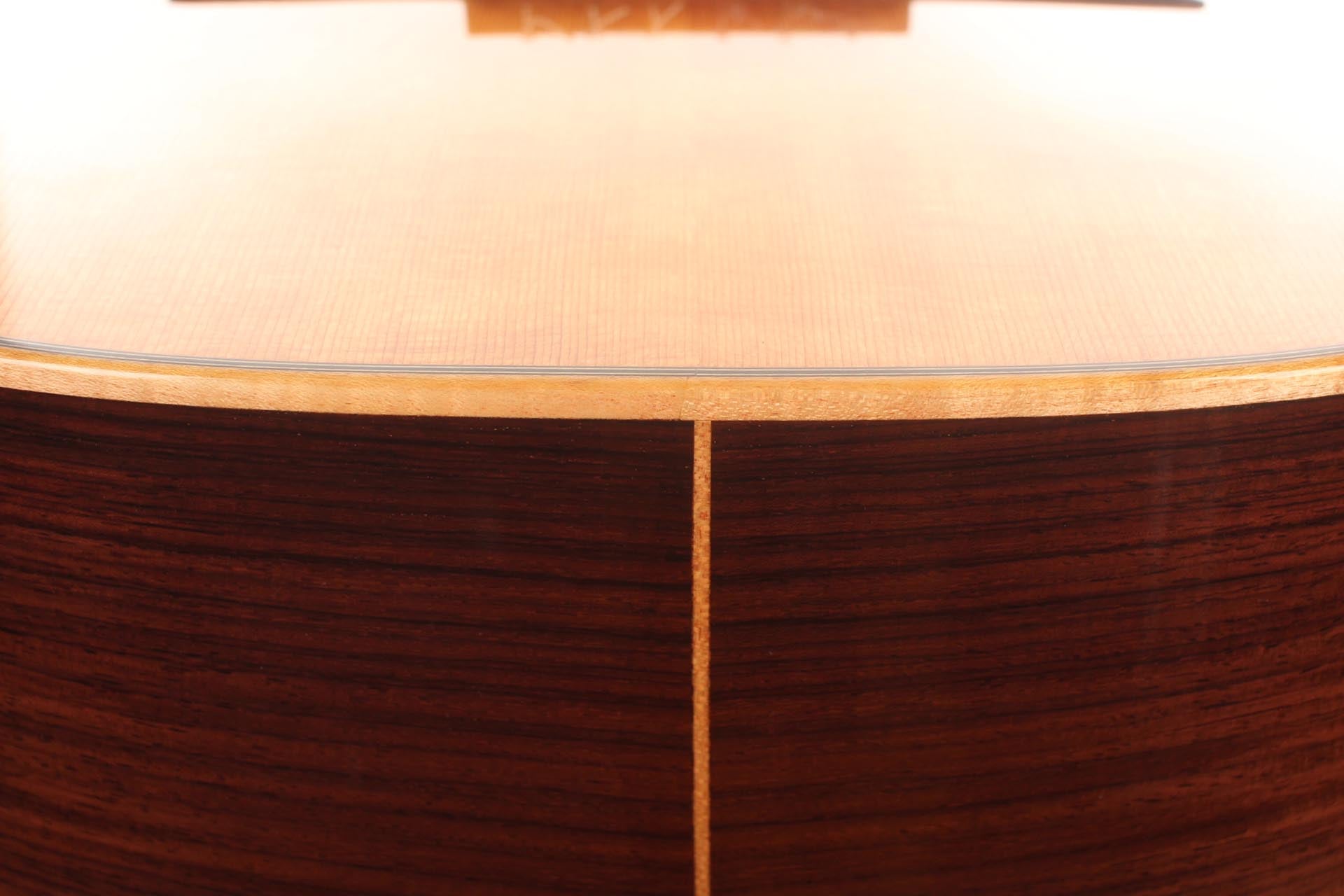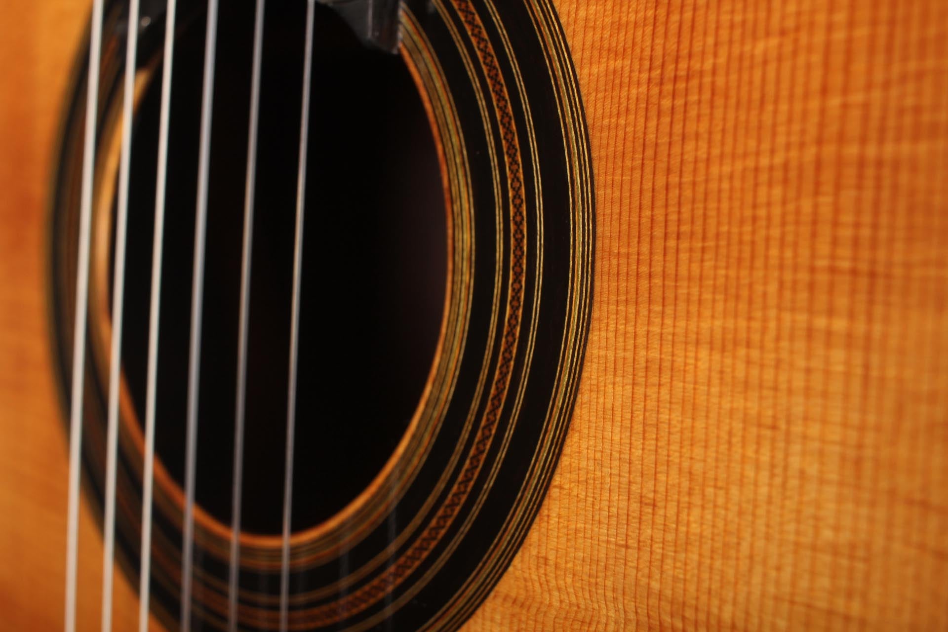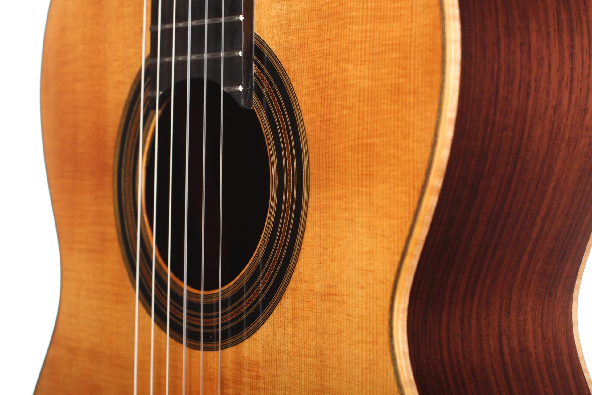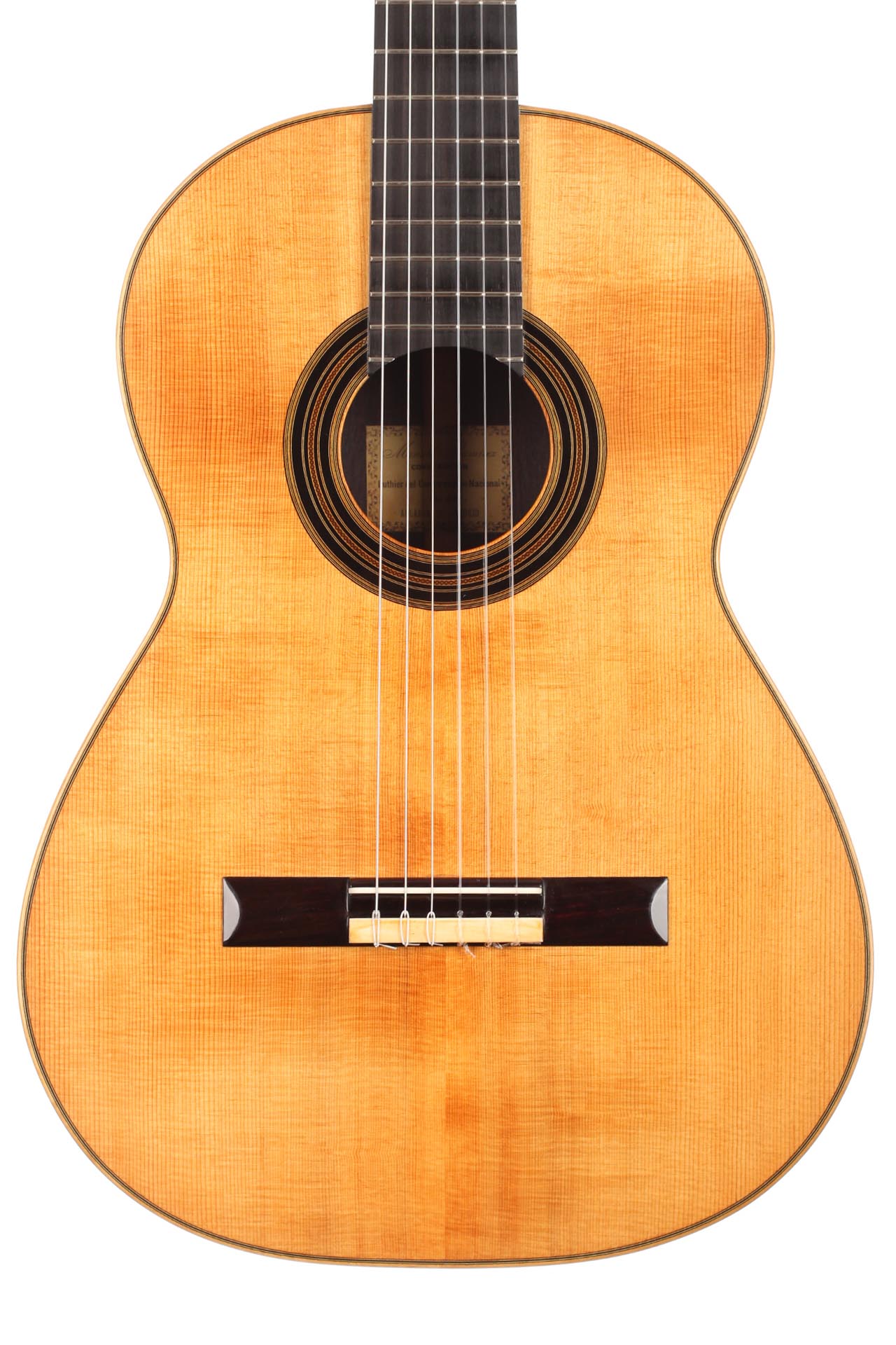 Every instrument constructed in Lorenzo Frignani's workshop is made of the highest quality seasoned woods, as for example this special 1910 Manuel Ramirez copy. The original is part of his private collection. Lorenzo's goal is to build a guitar that is as close to the original as possible regarding construction and quality of sound. He enjoys to copy original guitars and to create a sound that is rare these days. This new Manuel Ramirez copy has a spruce top and Indian Rosewood back and sides. The French-polish finish was “aged” to give the instrument a used look. The craftsmanship is impressive and shows the love for every detail. The sound is lovely and comes extremely close to the original instrument – it has a beautiful warm old world sound. Hear and see our video that we recorded with this guitar to get an impression and feeling of this magnificent instrument. As tuning machines Lorenzo Frignani has chosen Alessi tuners, which fit aesthetically very well with the instrument. A Hiscox Pro II case is included.