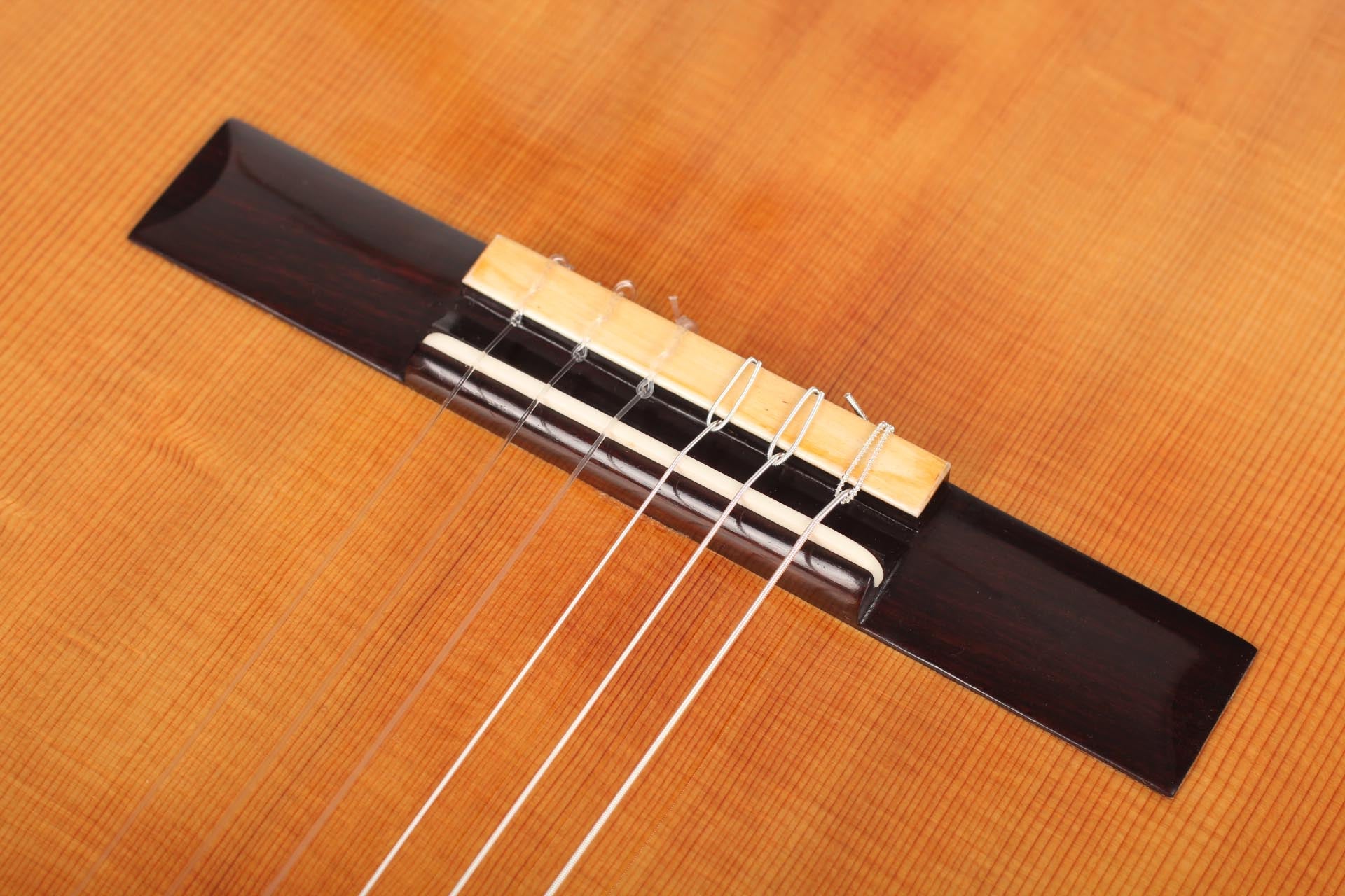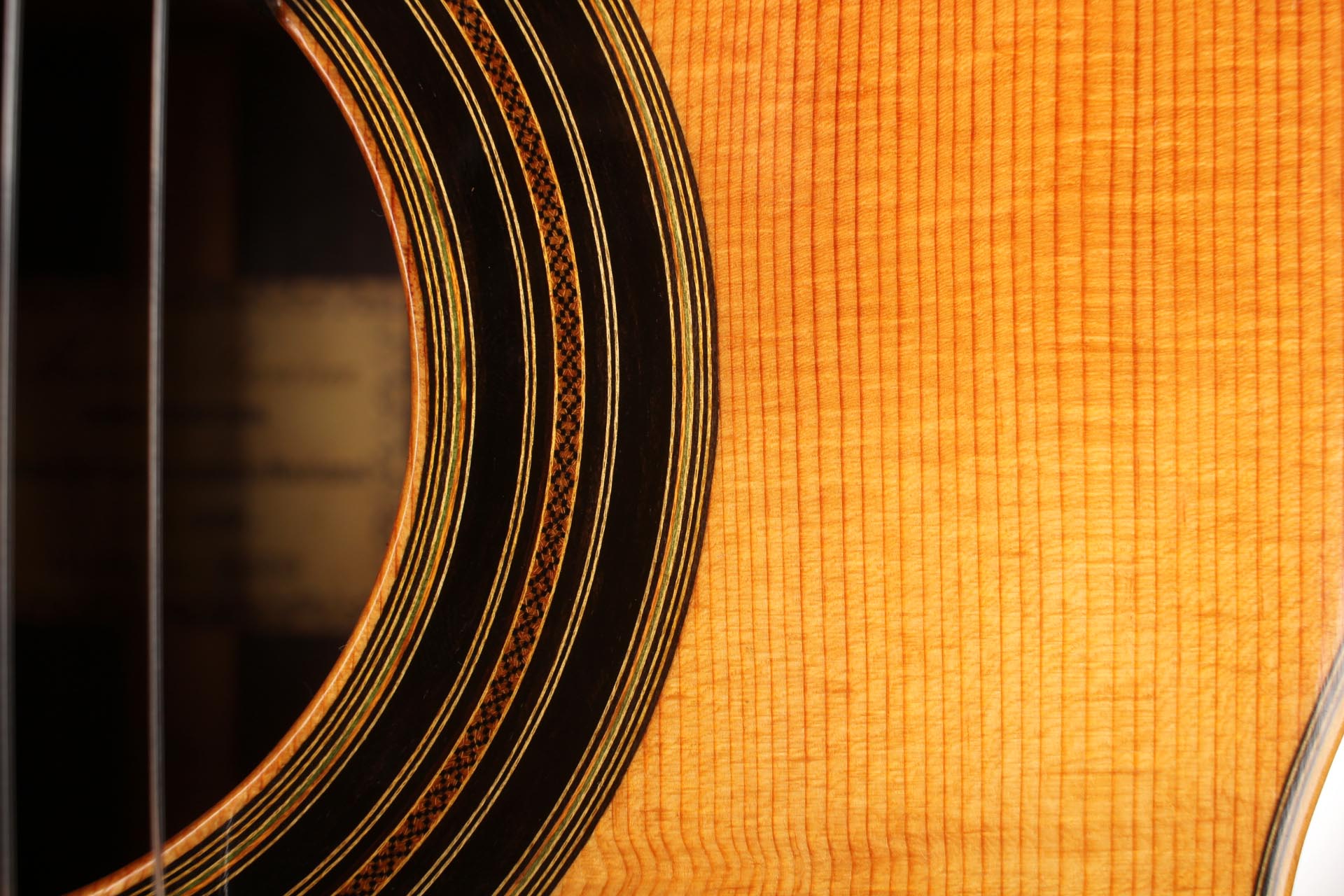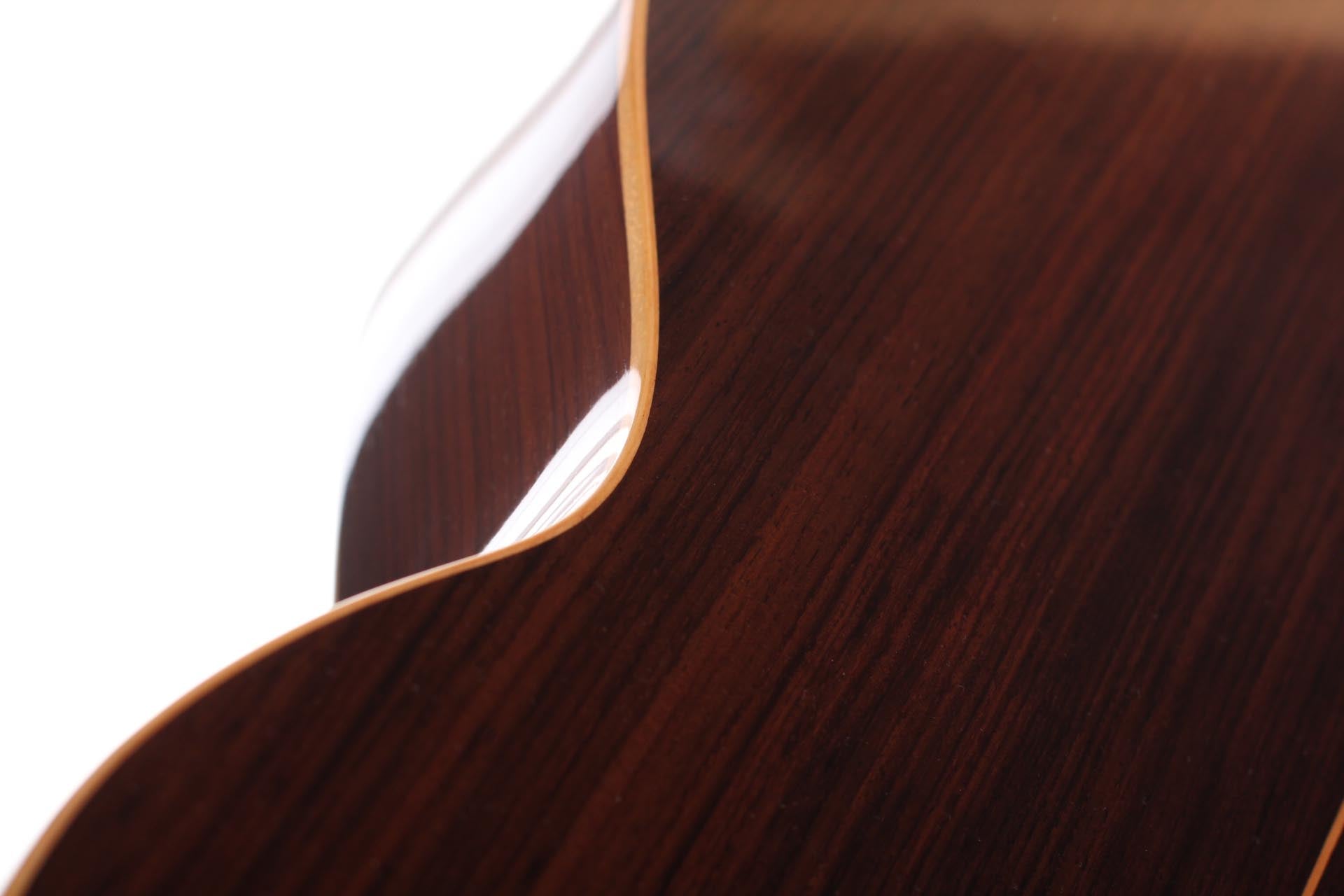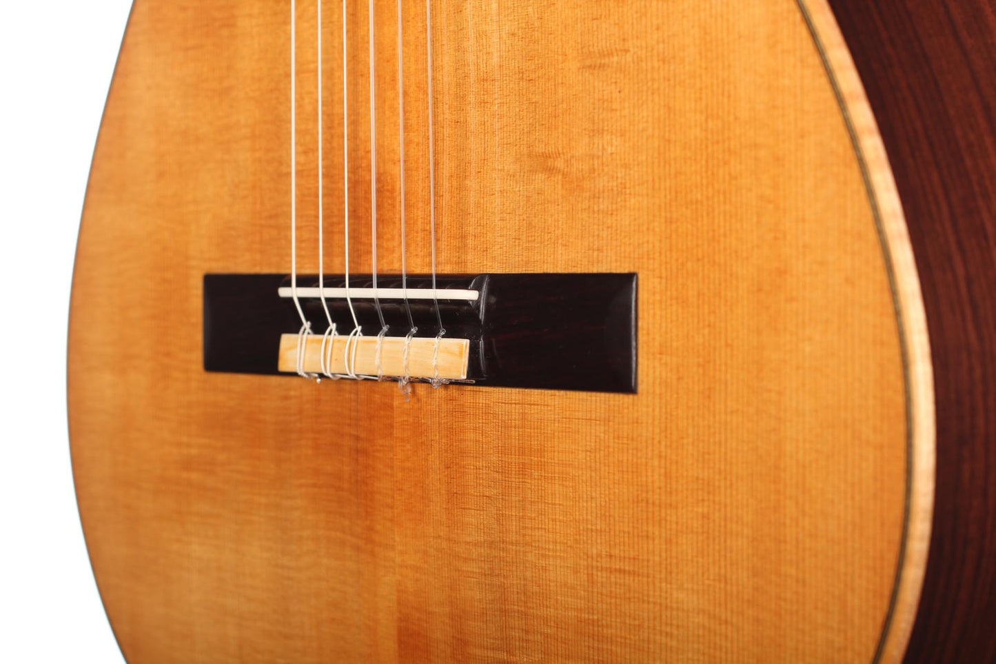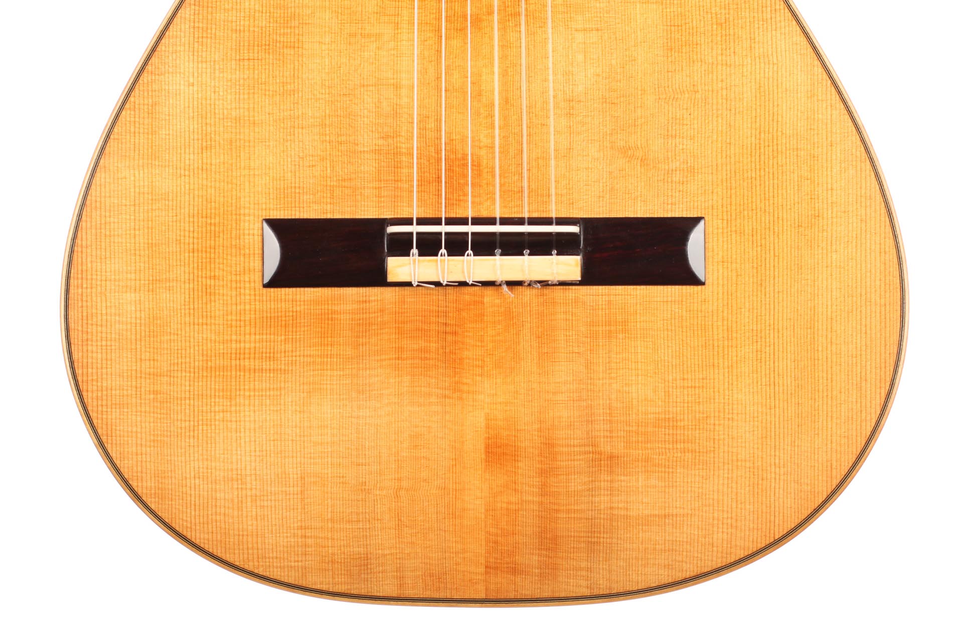 Every instrument constructed in Lorenzo Frignani's workshop is made of the highest quality seasoned woods, as for example this special 1910 Manuel Ramirez copy. The original is part of his private collection. Lorenzo's goal is to build a guitar that is as close to the original as possible regarding construction and quality of sound. He enjoys to copy original guitars and to create a sound that is rare these days. This new Manuel Ramirez copy has a spruce top and Indian Rosewood back and sides. The French-polish finish was “aged” to give the instrument a used look. The craftsmanship is impressive and shows the love for every detail. The sound is lovely and comes extremely close to the original instrument – it has a beautiful warm old world sound. Hear and see our video that we recorded with this guitar to get an impression and feeling of this magnificent instrument. As tuning machines Lorenzo Frignani has chosen Alessi tuners, which fit aesthetically very well with the instrument. A Hiscox Pro II case is included.