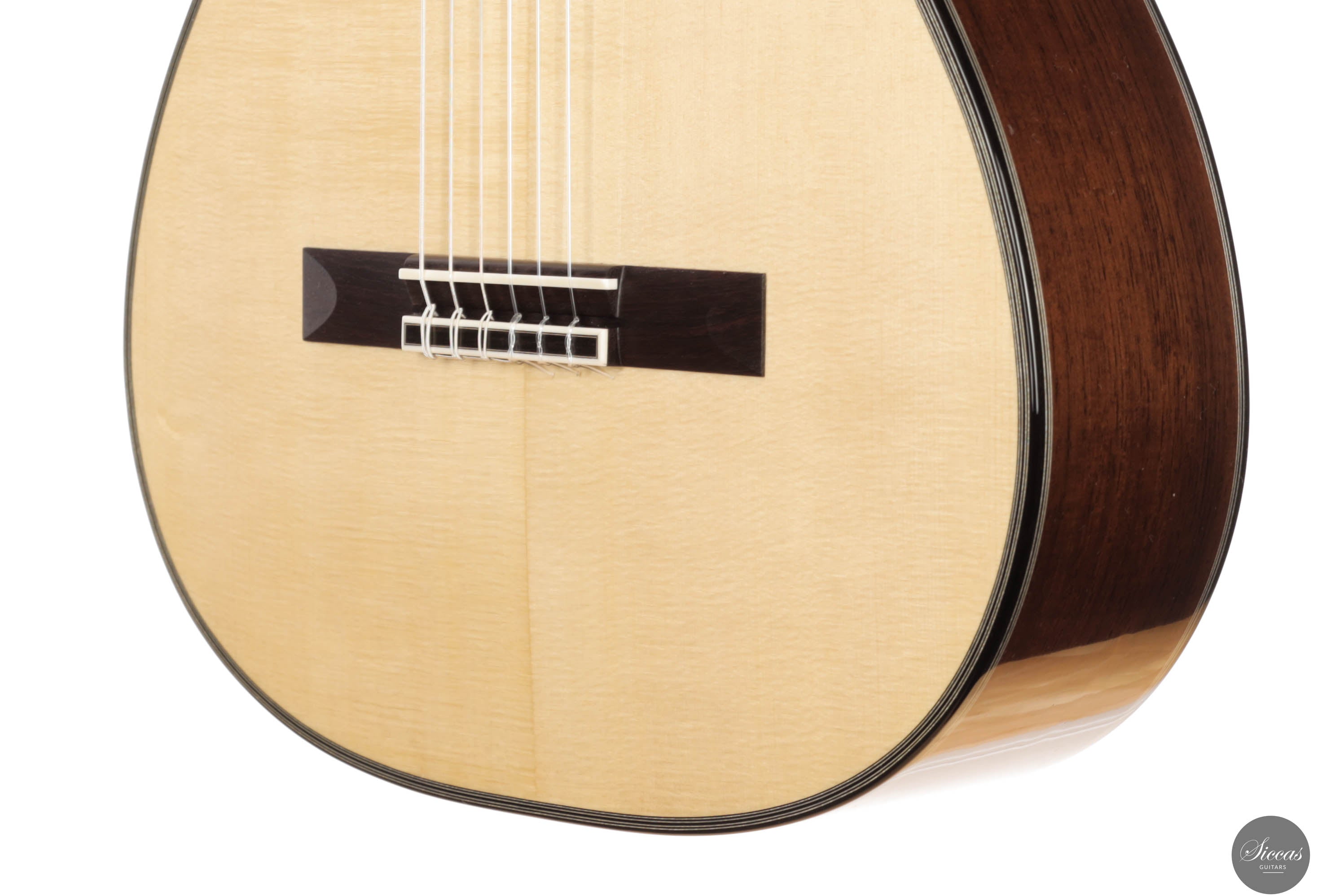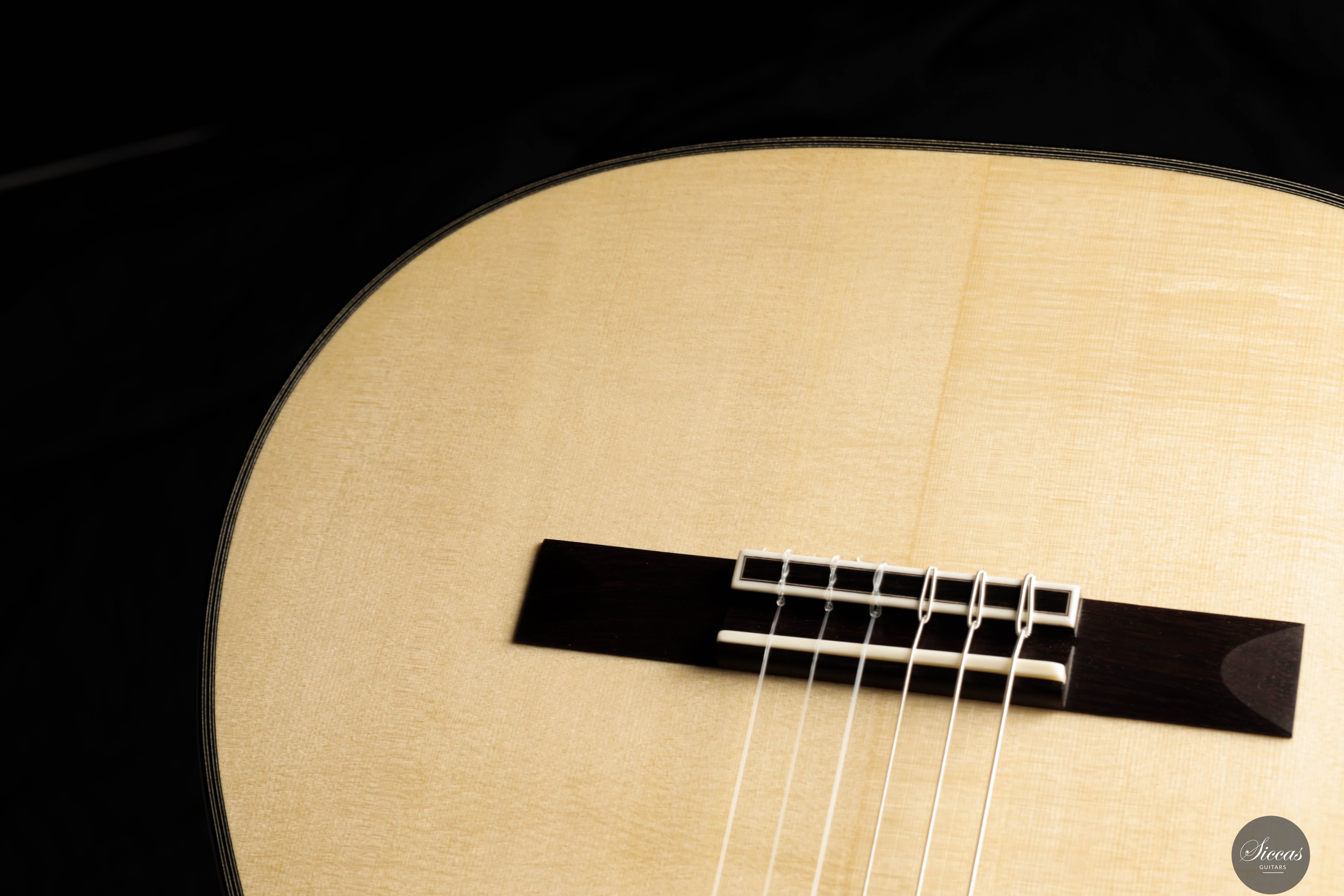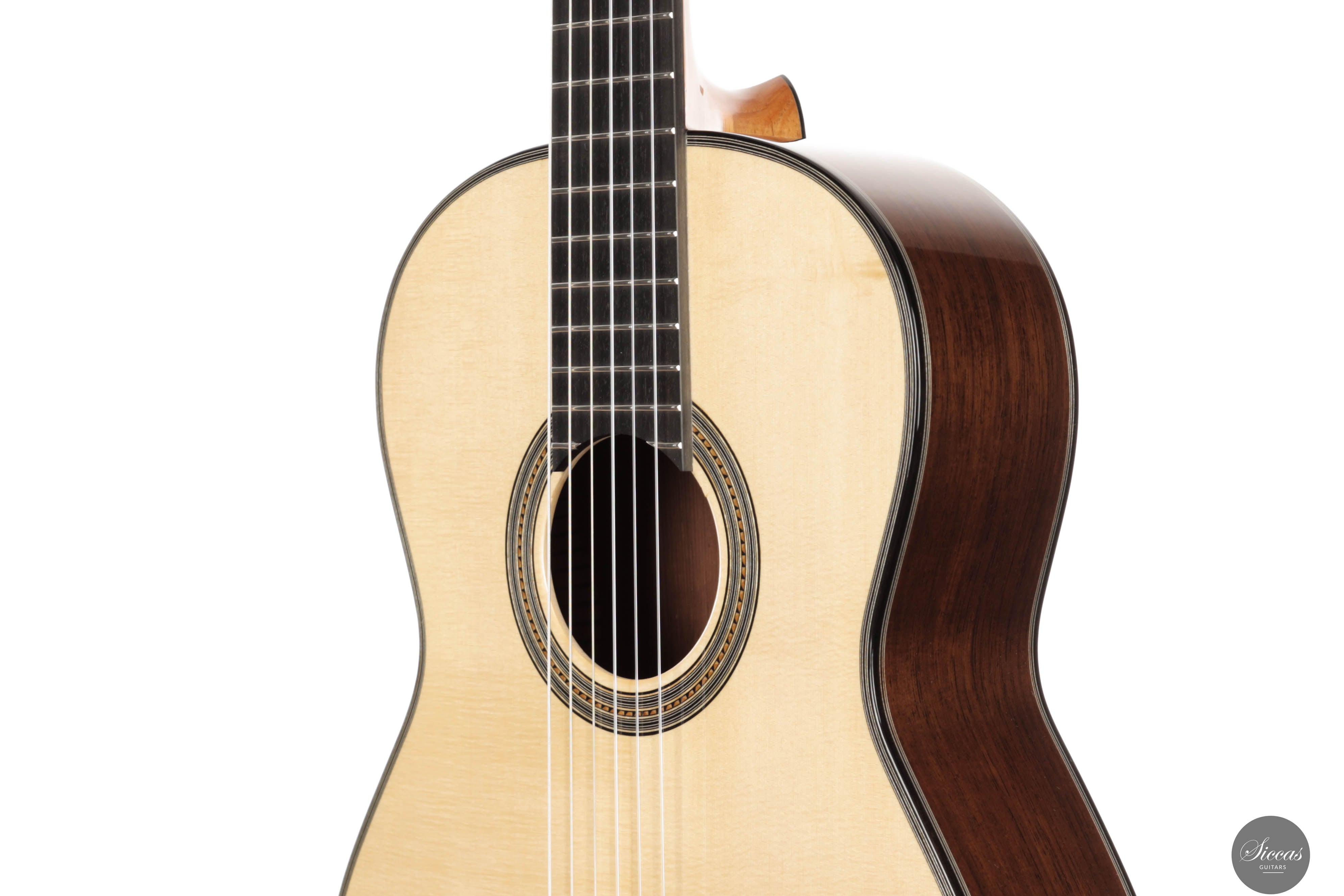 The REG 2025 Limited Edition “Concerto No. 16” is a continuation of Luca Pollastro’s personal concert guitar model. It features a traditional seven-fan bracing system assembled with natural hide glue. The result is an instrument that delivers a dynamic, refined voice with strong projection, tonal clarity, and a warm, expressive character that blends traditional resonance with contemporary demands. For this model, Luca selected an Italian spruce top and Madagascar rosewood for the back and sides, both carefully chosen for their tonal properties and visual beauty. The neck is carved from Spanish cedar and paired with an African ebony fingerboard. A standout detail is the custom-carved headstock, which adds an elegant visual focal point to the instrument. The guitar is finished with a hand-applied French polish that enhances both the wood’s natural texture and the overall resonance. The binding and purfling elements reflect Luca’s refined taste for subtle ornamentation, bringing cohesion to the instrument’s visual identity. Every element, from construction to decoration, expresses the clarity of his vision and the maturity of his craft.Regular care extends the life of the instrument