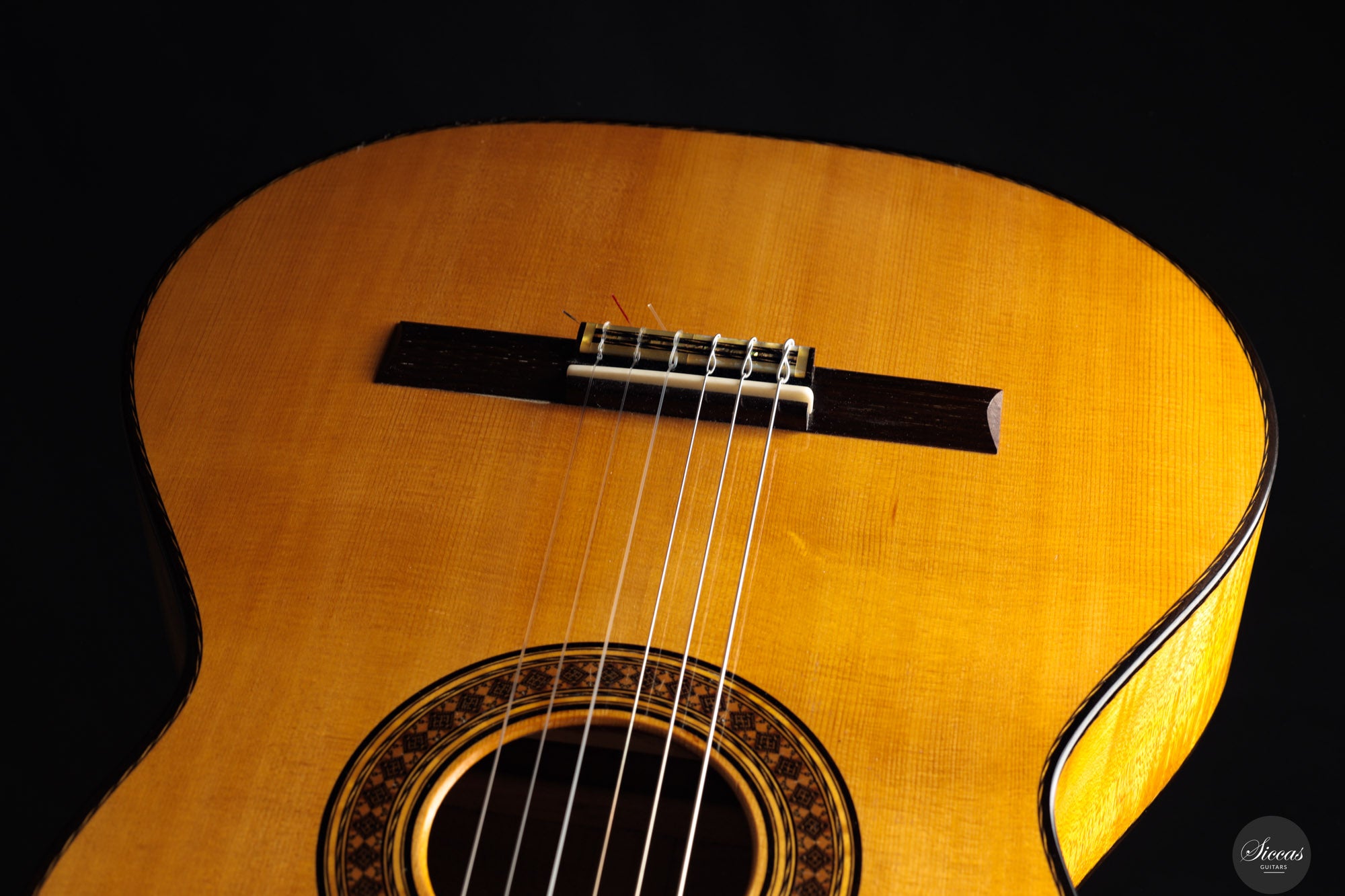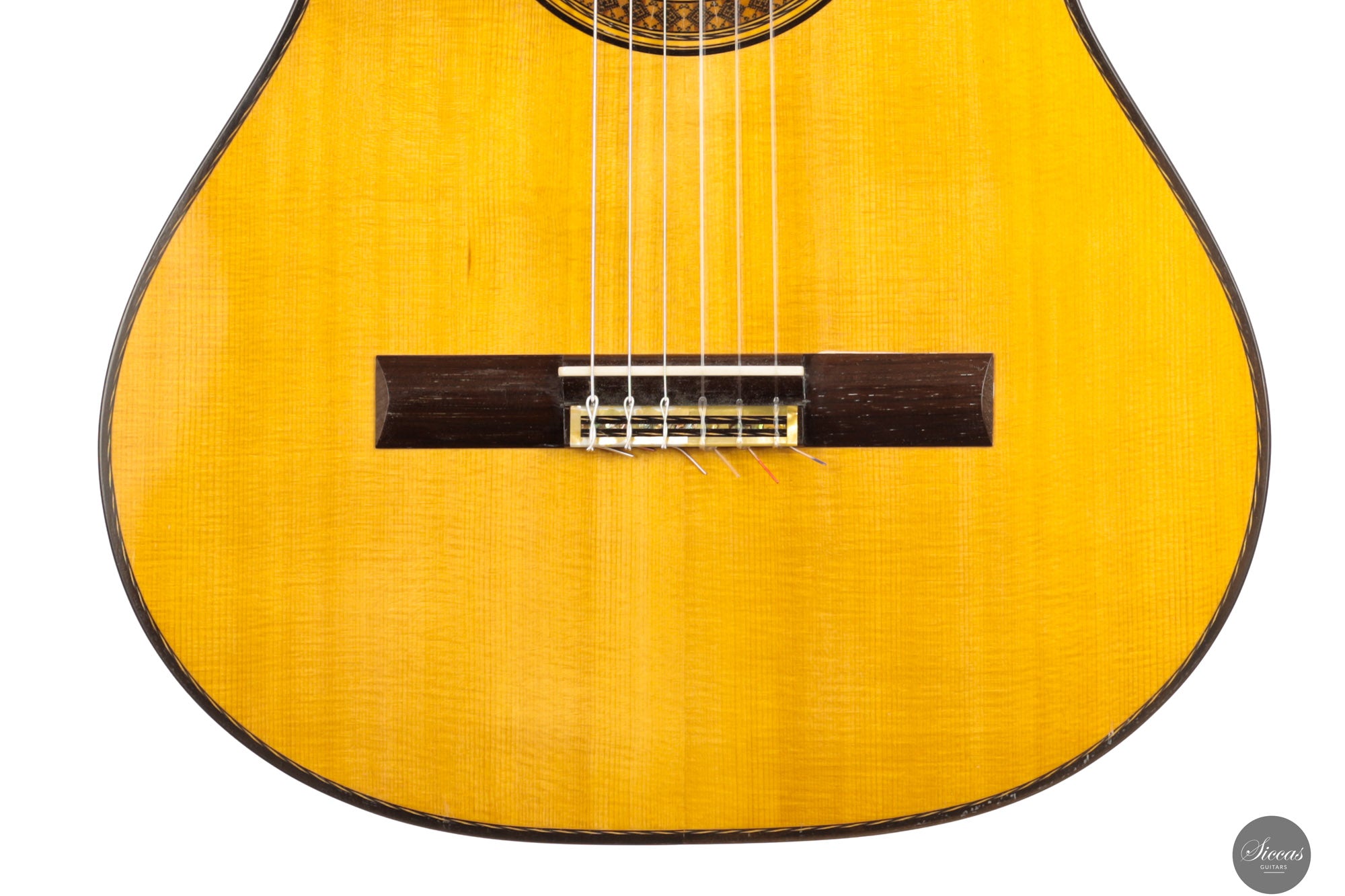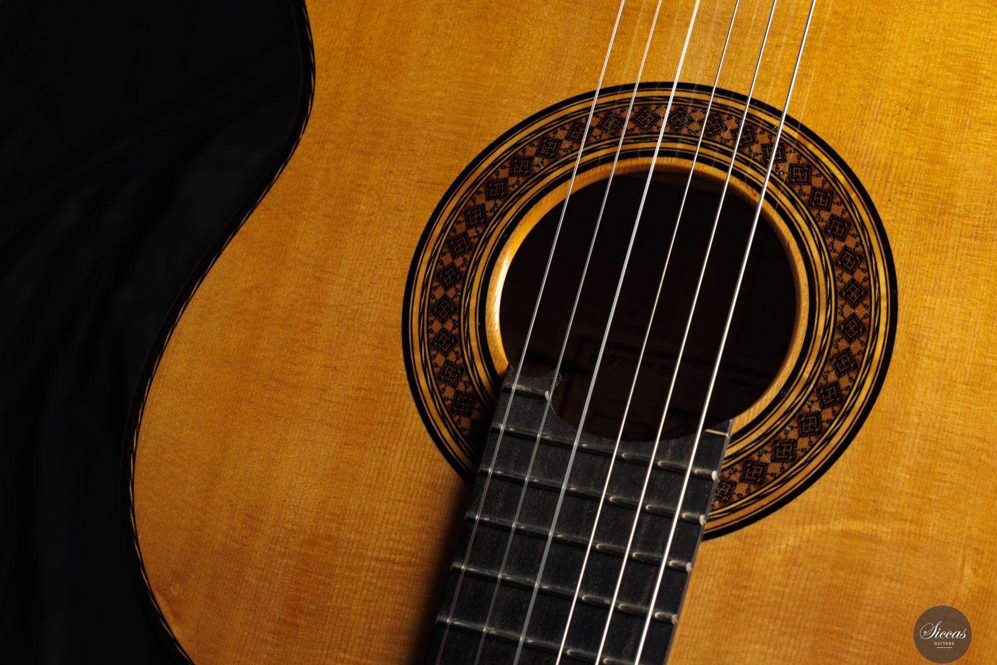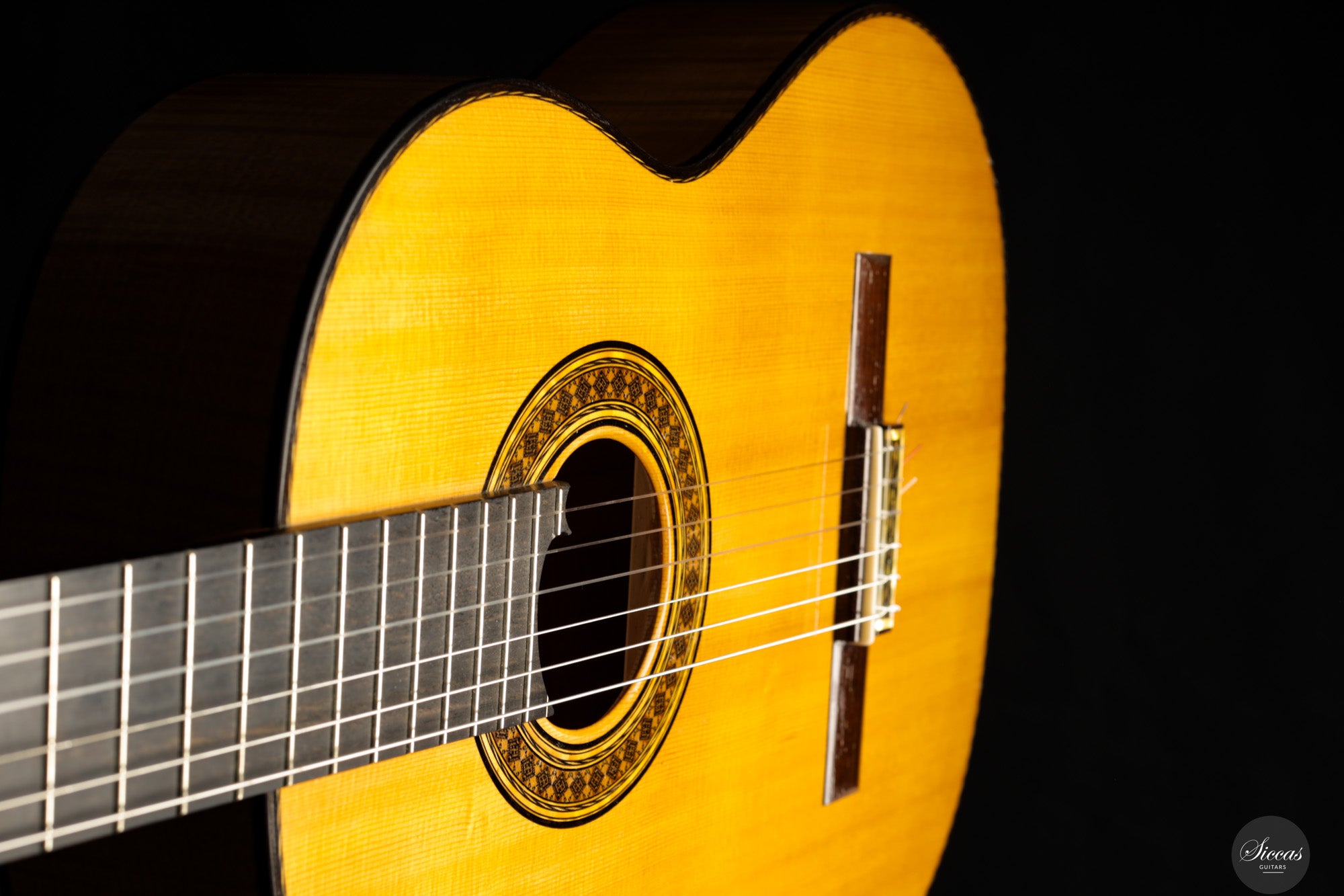 Tonally, the guitar delivers a long sustain and a sound rich in overtones and subtle colour. The bass register has presence and fullness, while the upper voices remain clear and articulate with a slightly nasal edge—qualities often found in romantic‑style instruments. The air‑body resonance around A/A♯ gives the entire voice a poised but bold character. Playability is smooth and engaging, making this guitar suitable for both refined recital work and expressive solo performance.