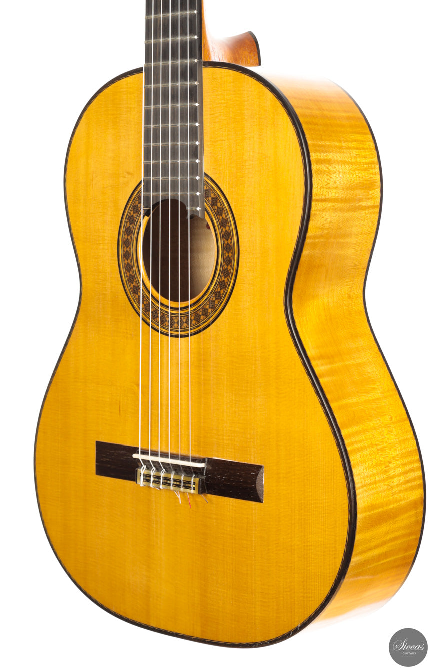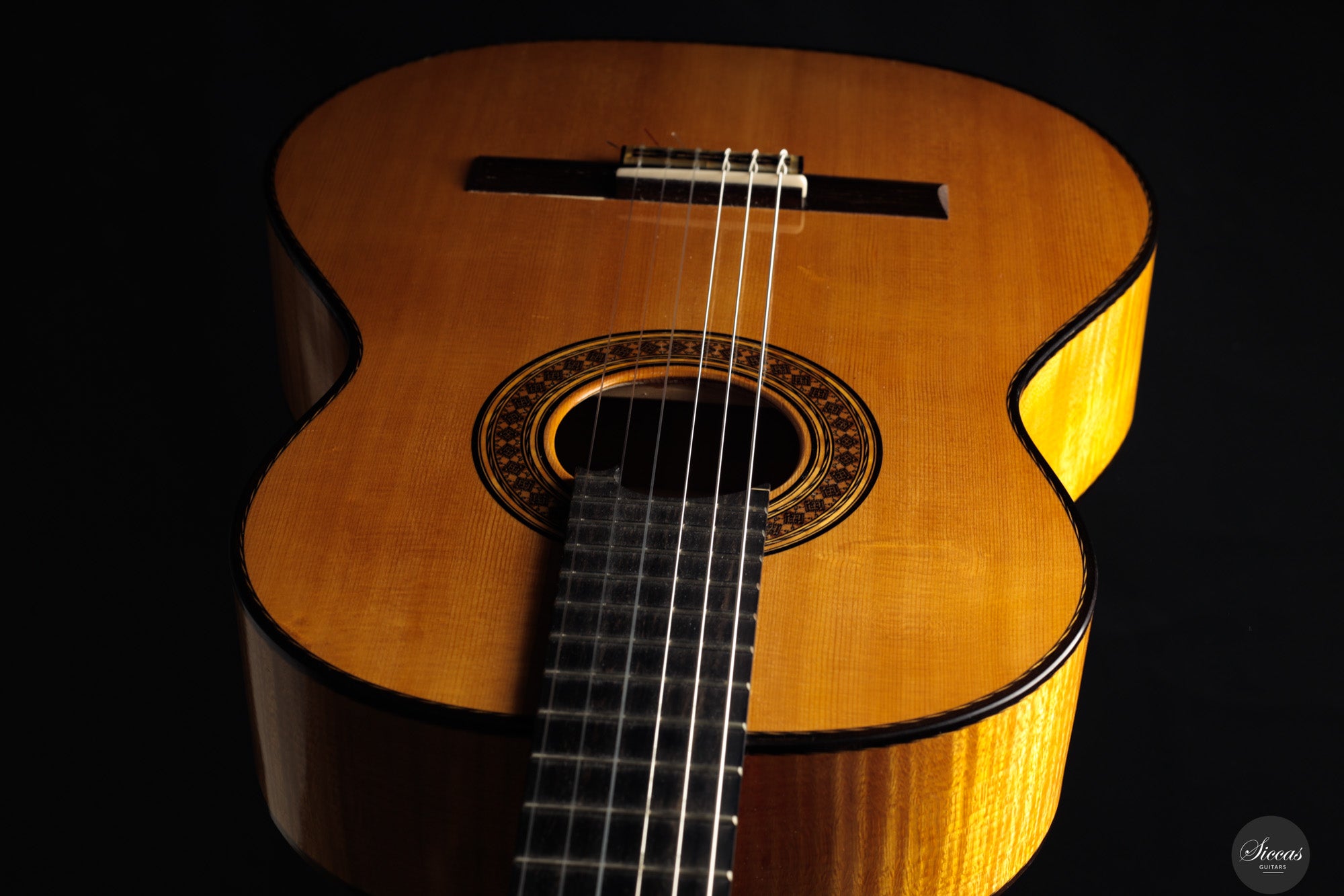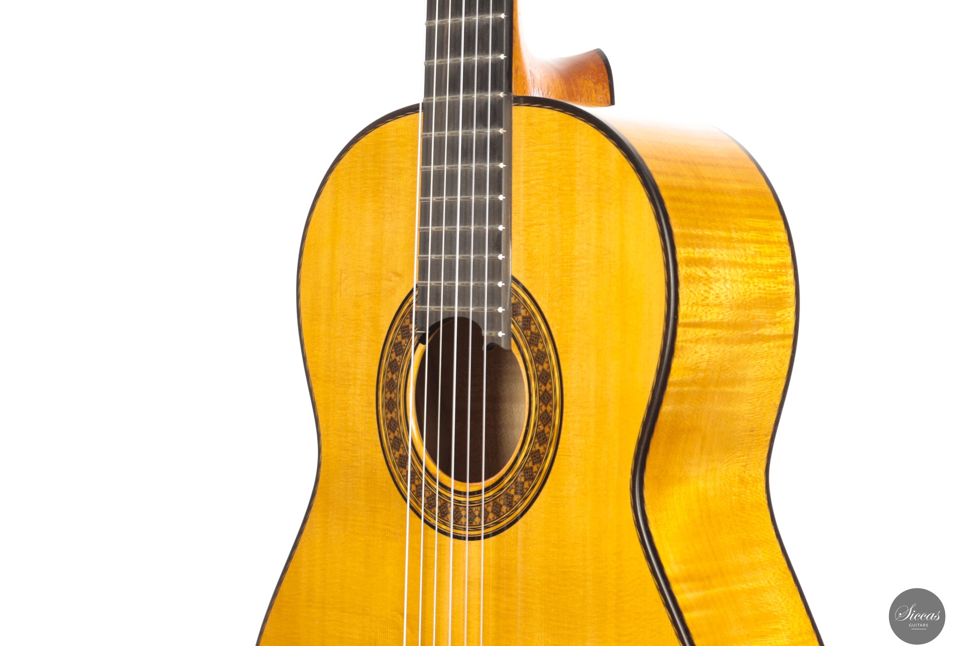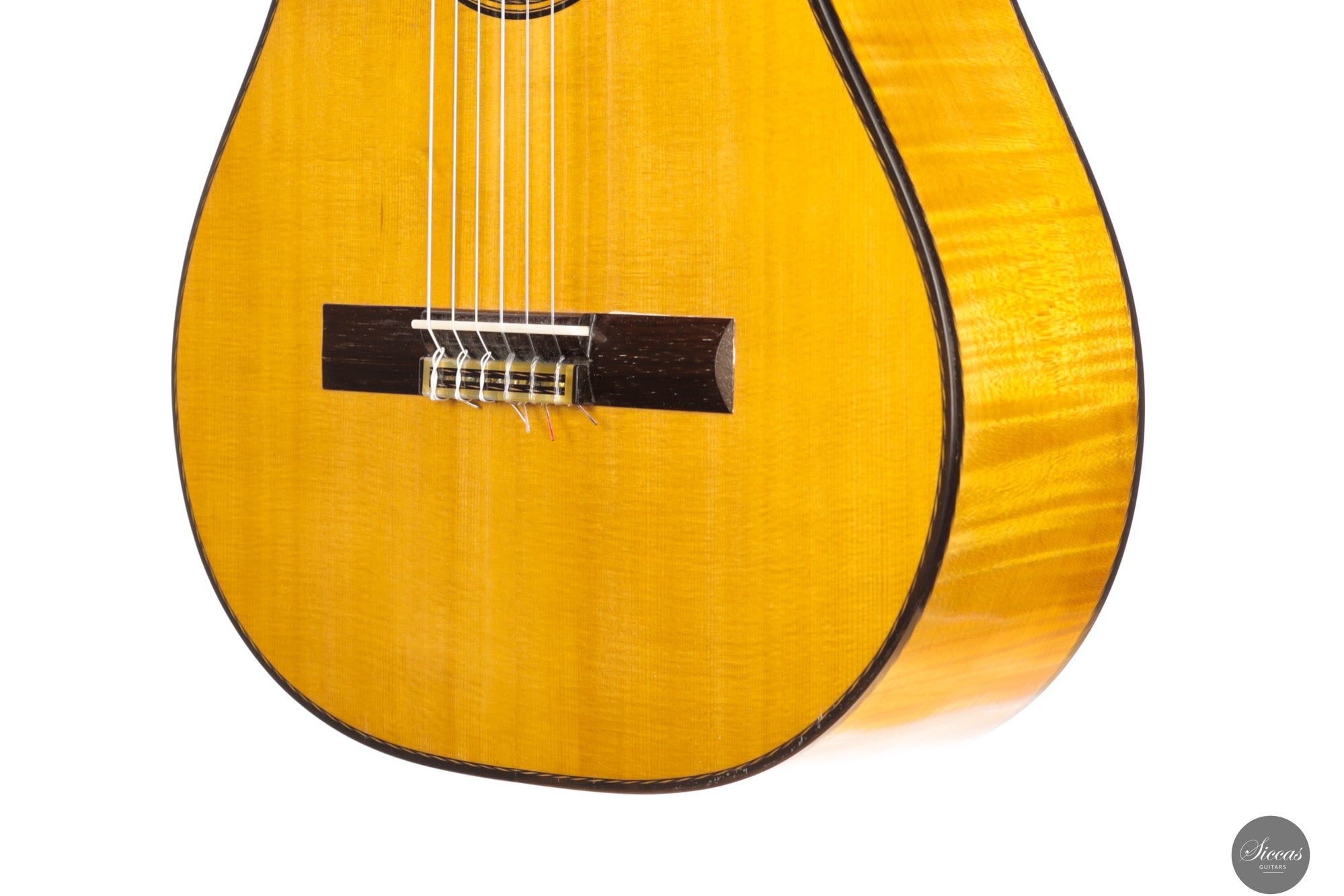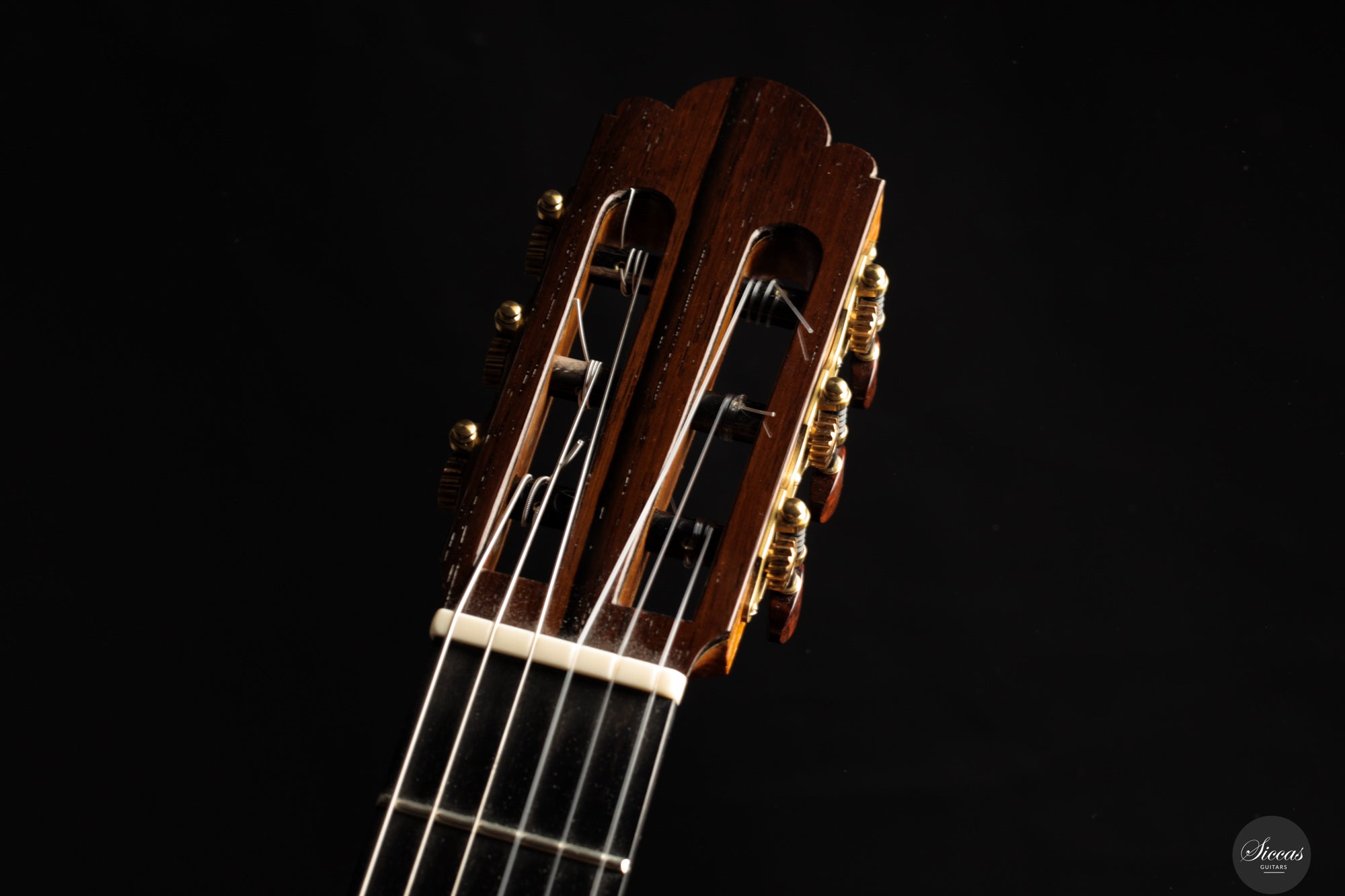 Tonally, the guitar delivers a long sustain and a sound rich in overtones and subtle colour. The bass register has presence and fullness, while the upper voices remain clear and articulate with a slightly nasal edge—qualities often found in romantic‑style instruments. The air‑body resonance around A/A♯ gives the entire voice a poised but bold character. Playability is smooth and engaging, making this guitar suitable for both refined recital work and expressive solo performance.
