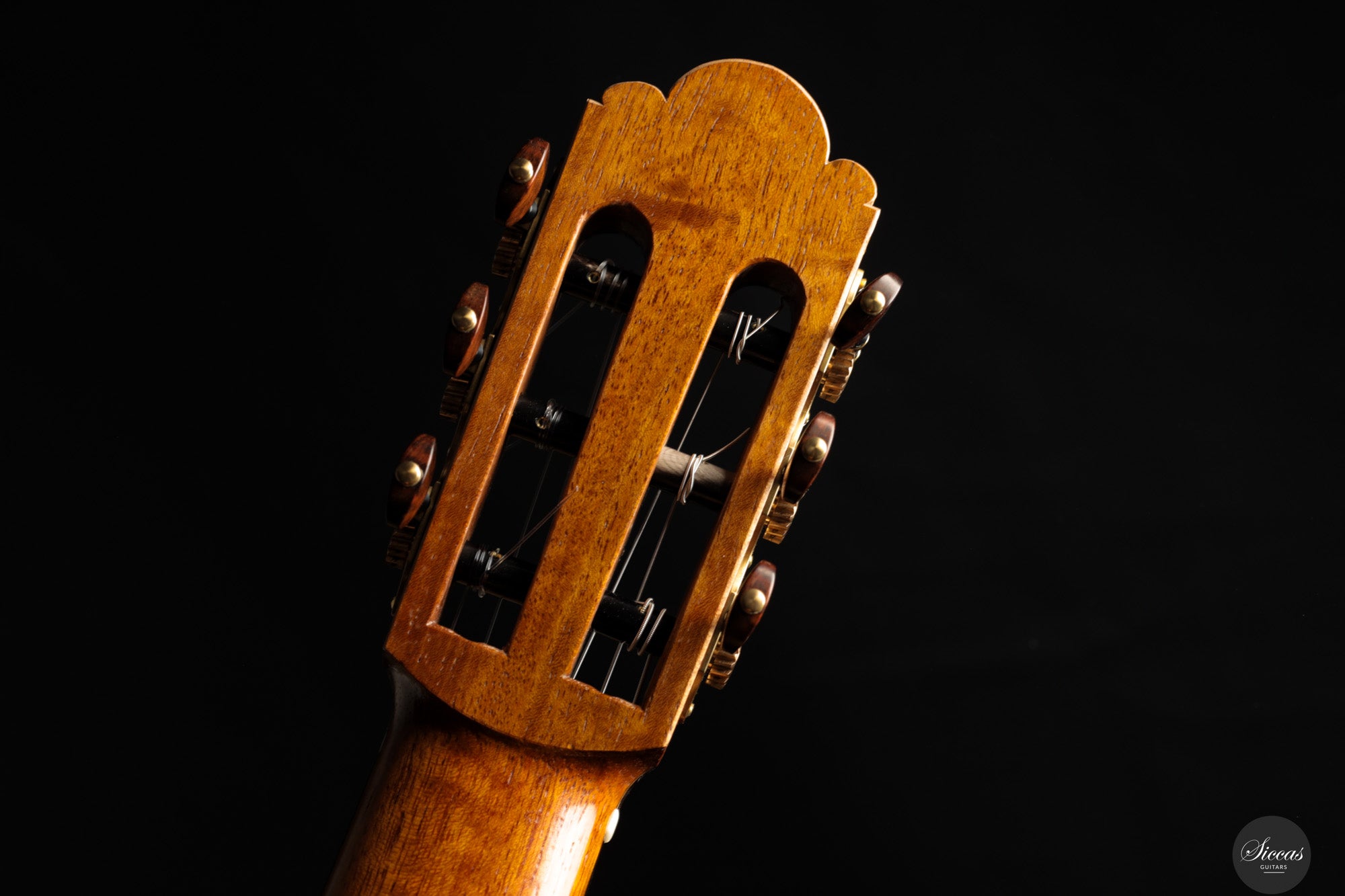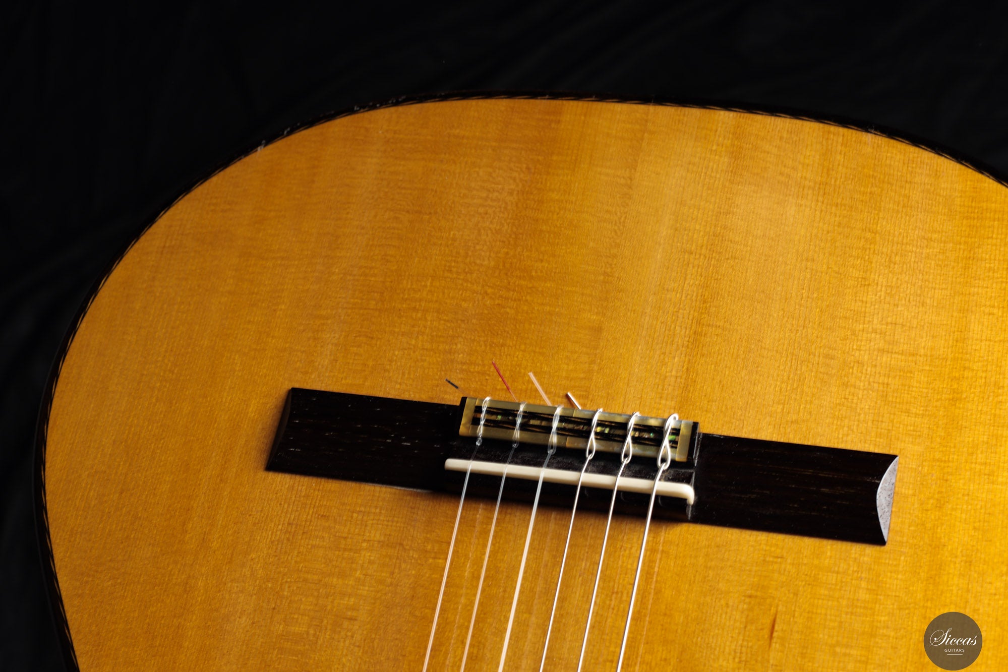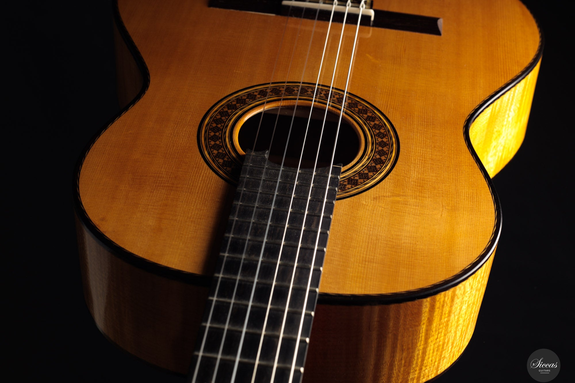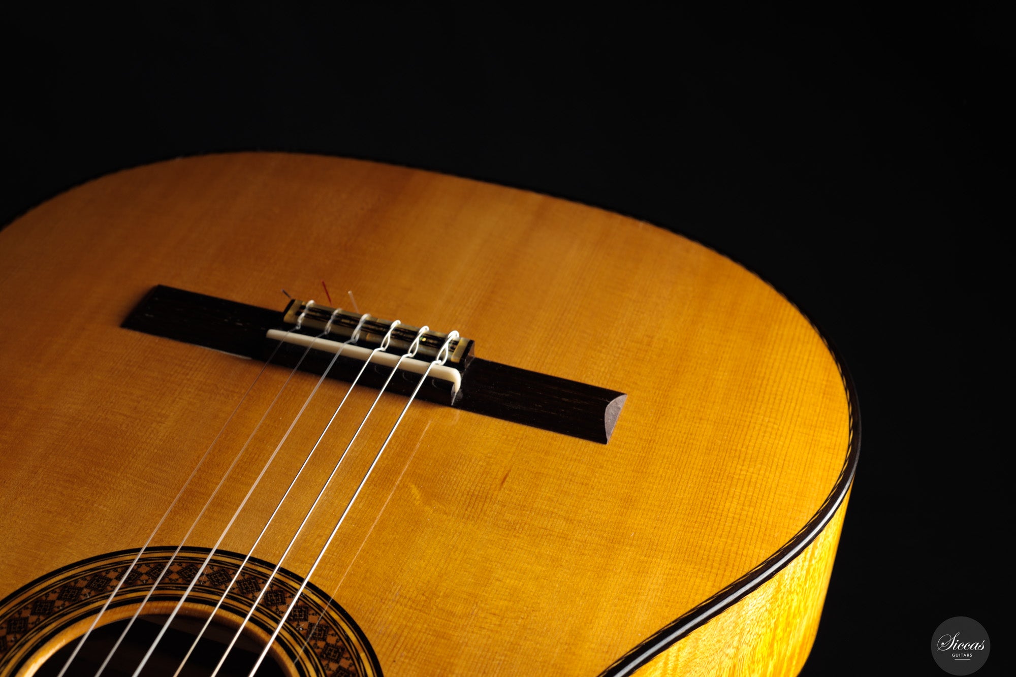 Tonally, the guitar delivers a long sustain and a sound rich in overtones and subtle colour. The bass register has presence and fullness, while the upper voices remain clear and articulate with a slightly nasal edge—qualities often found in romantic‑style instruments. The air‑body resonance around A/A♯ gives the entire voice a poised but bold character. Playability is smooth and engaging, making this guitar suitable for both refined recital work and expressive solo performance.