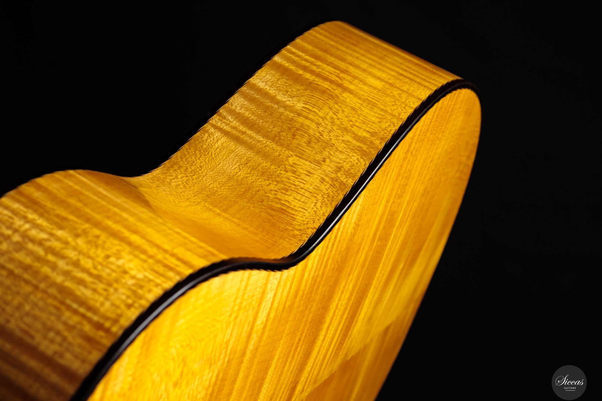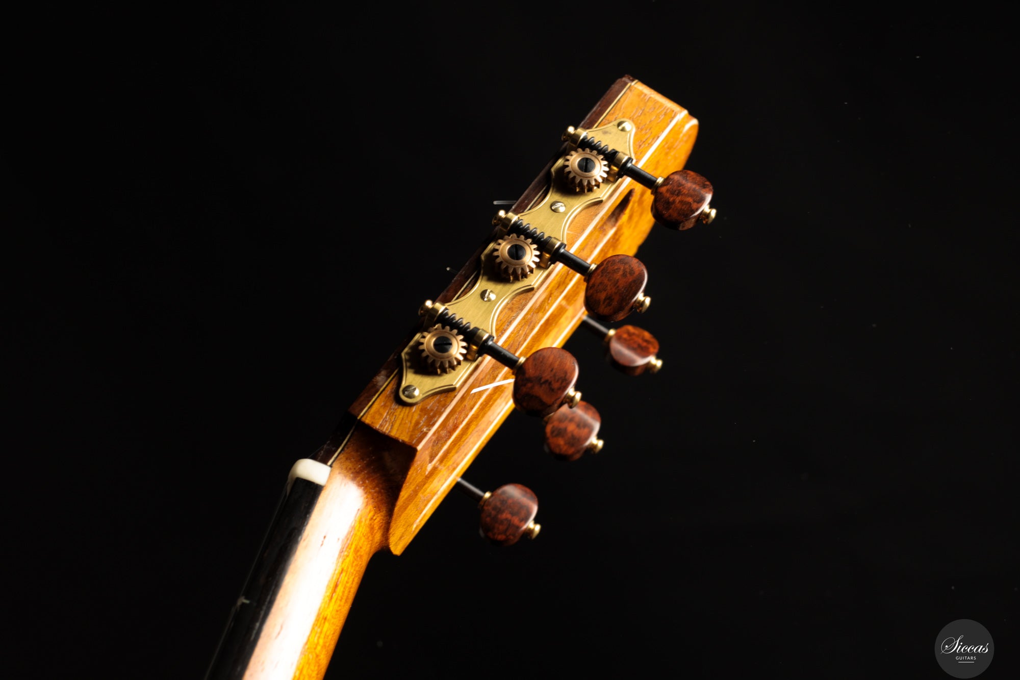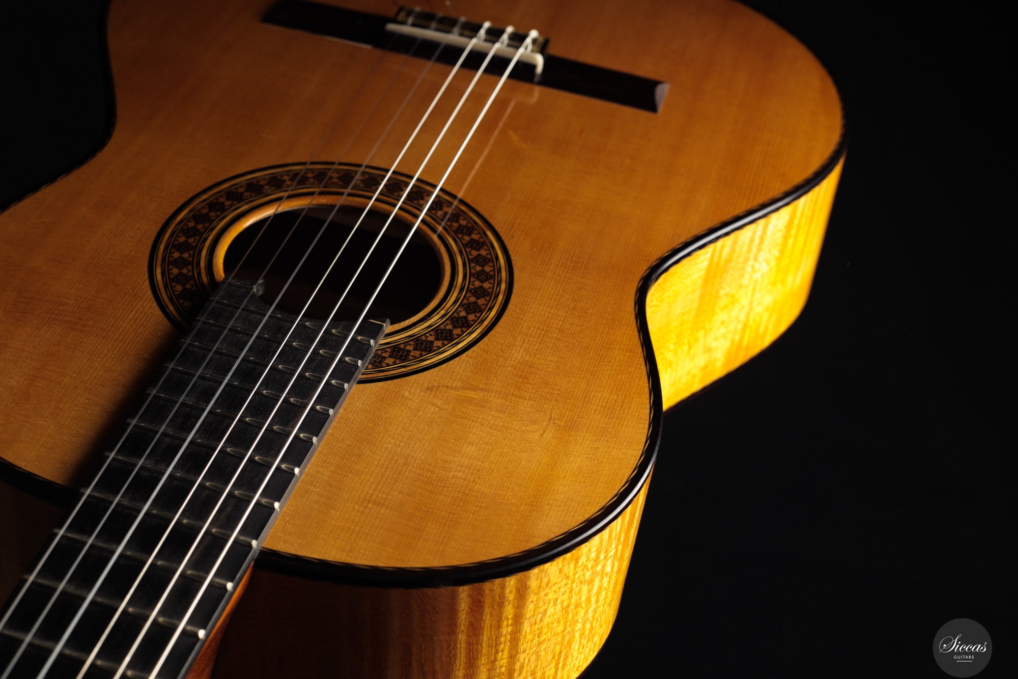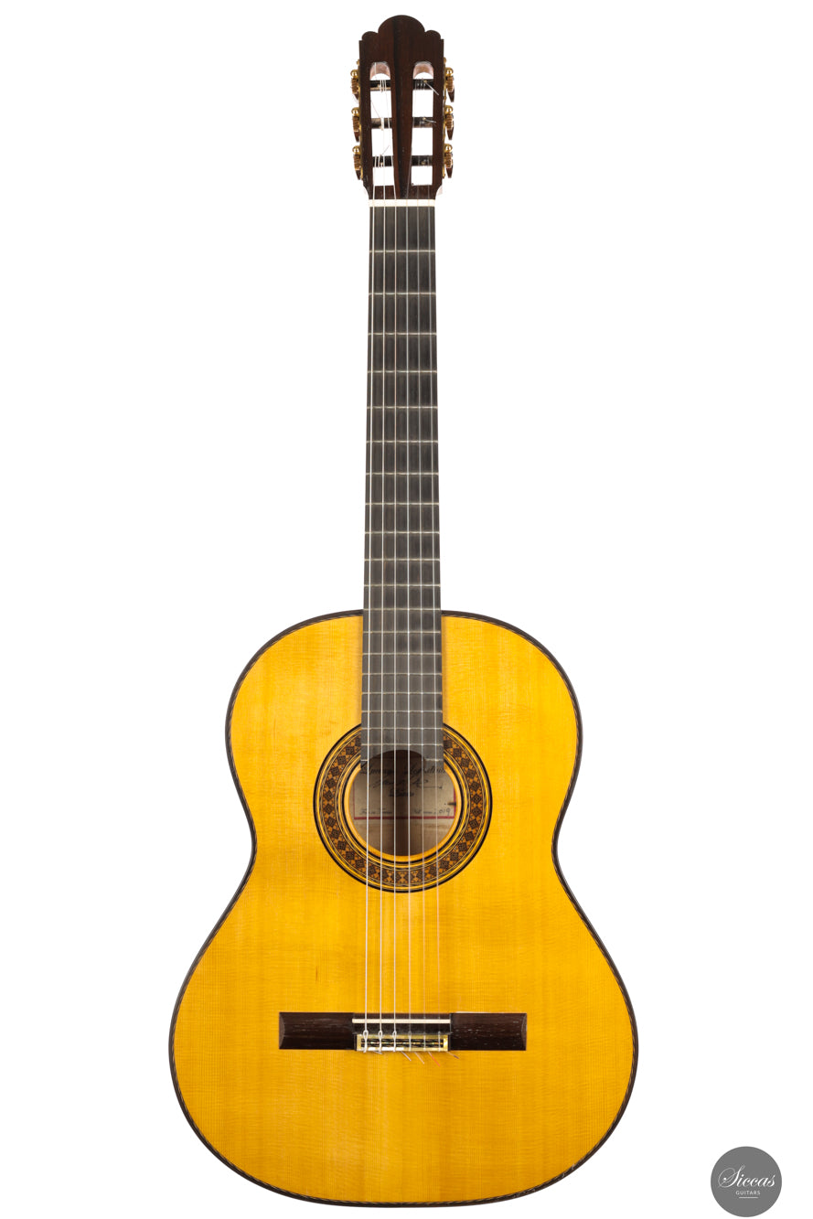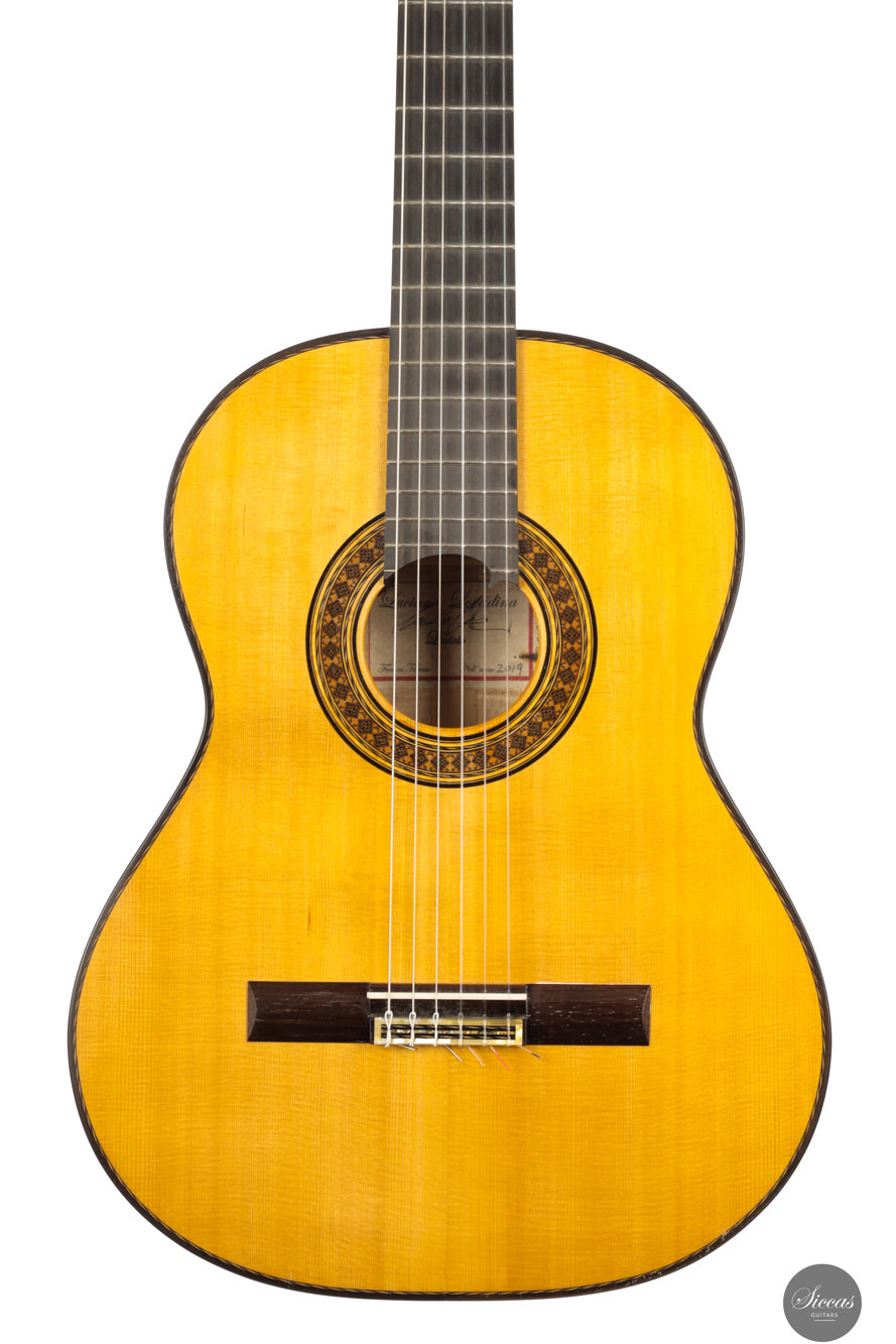 Tonally, the guitar delivers a long sustain and a sound rich in overtones and subtle colour. The bass register has presence and fullness, while the upper voices remain clear and articulate with a slightly nasal edge—qualities often found in romantic‑style instruments. The air‑body resonance around A/A♯ gives the entire voice a poised but bold character. Playability is smooth and engaging, making this guitar suitable for both refined recital work and expressive solo performance.