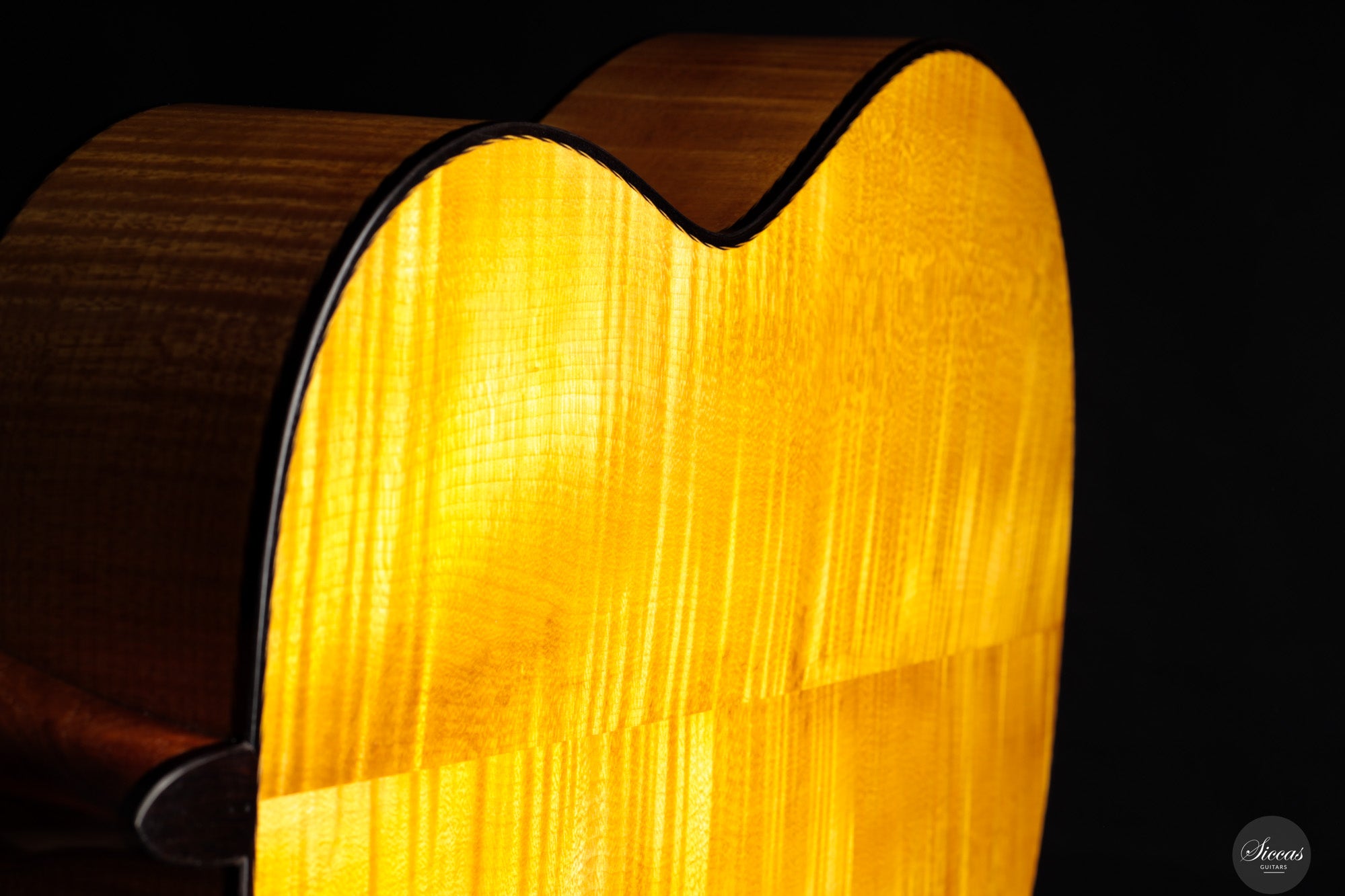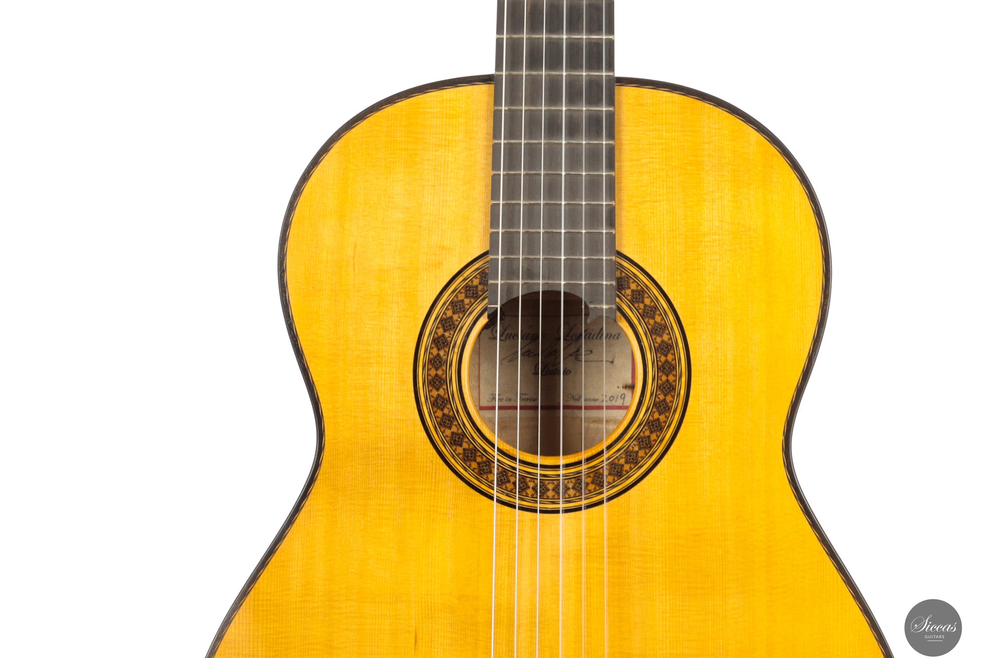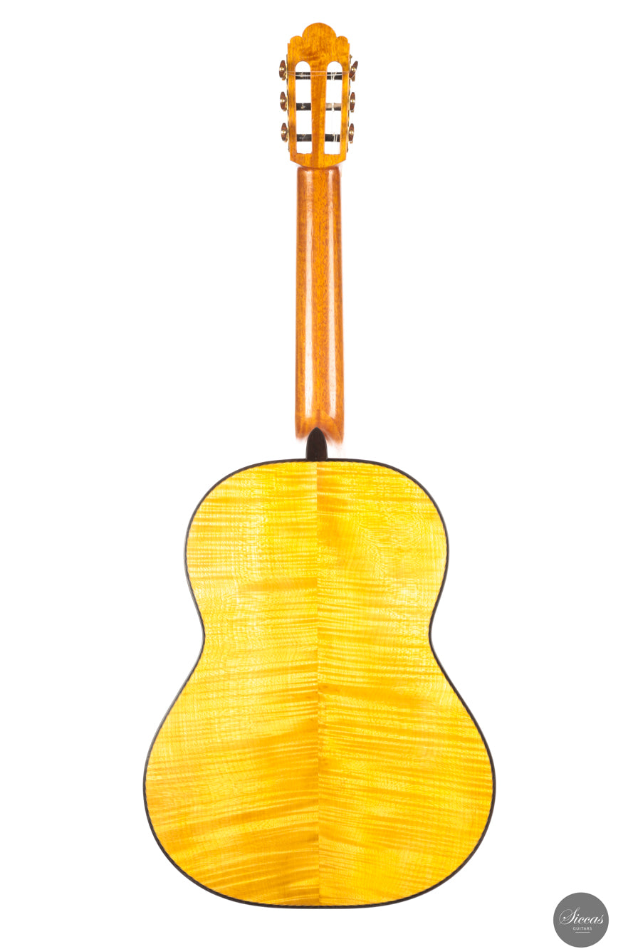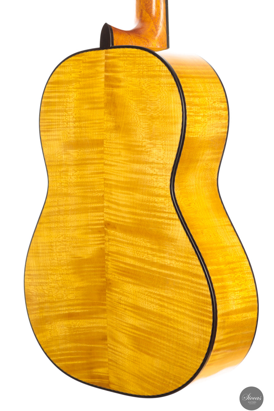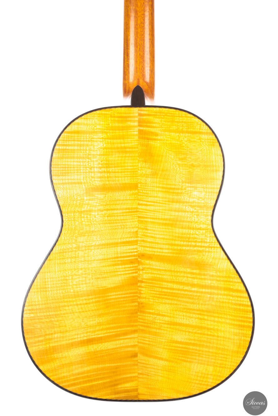 Built in 2019, this traditionally‑constructed concert guitar by Lovadina features a spruce top and back and sides of flamed maple. The finish is a classic French polish that subtly accentuates the wood’s natural figure. With a scale of 650 mm and a nut width of 52 mm, the instrument offers a comfortable and authoritative feel under the fingers. The body weight of approximately 1,730 grams signals a build that favours substance and depth.