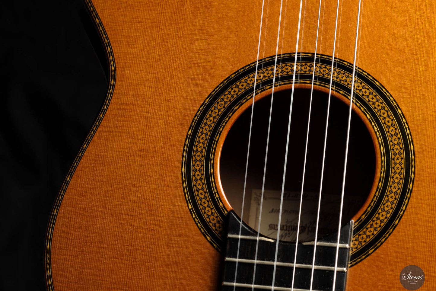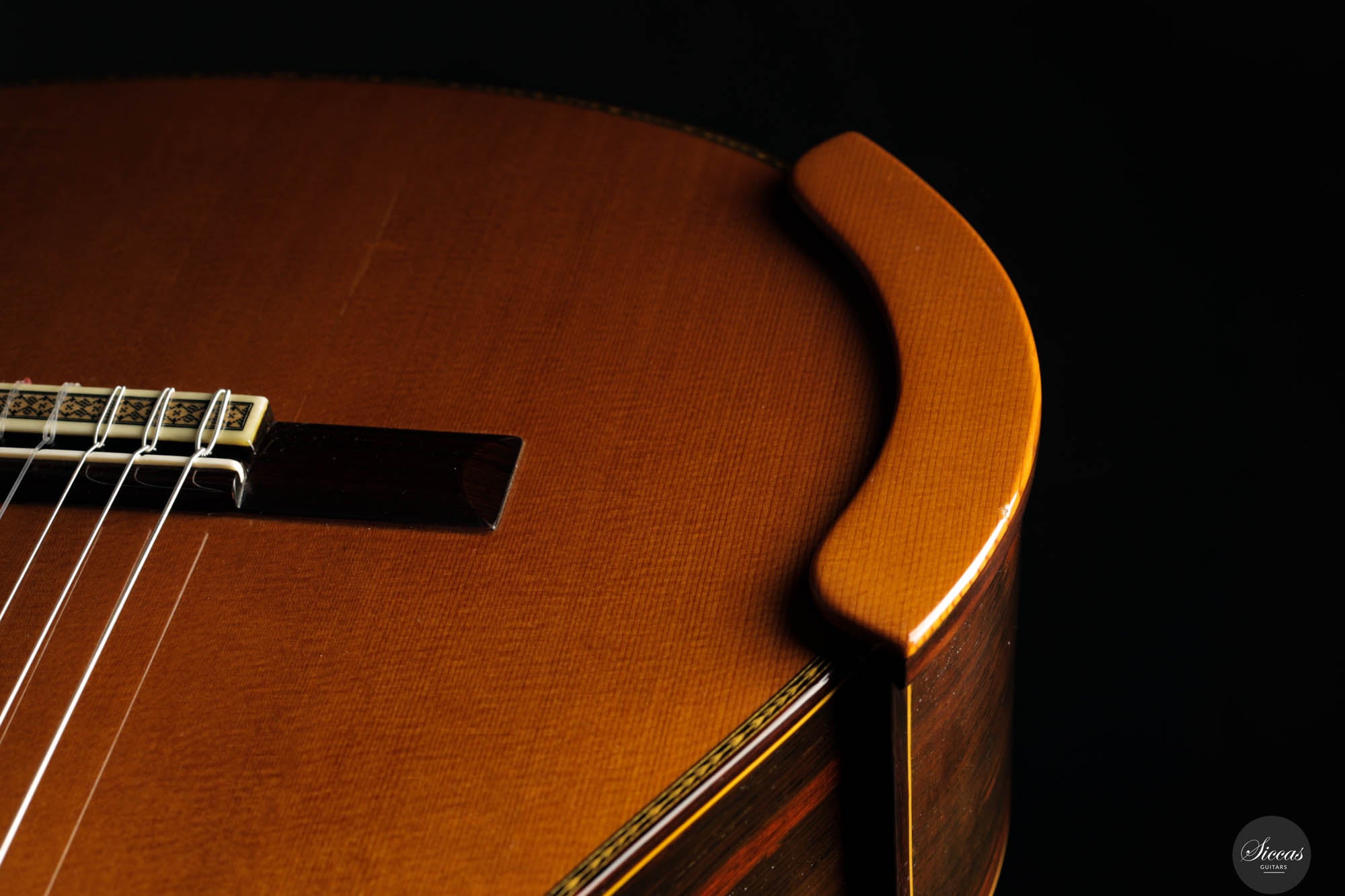 This extraordinary instrument, crafted by one of the most renowned Spanish luthiers, features a rare and innovative resonador—an outer resonating shell that completely shields the main guitar body from direct contact with the player. This design eliminates any dampening effect caused by the player’s body, allowing the entire interior body to resonate freely, maximizing projection and tonal depth. While resonador models are already considered rare, this particular instrument is even more exceptional due to its integrated cedar armrest, a unique feature that enhances both comfort and playability. The guitar is in very good condition, with just one expertly repaired crack on the lower bout of the cedar soundboard, ensuring full structural integrity. Sonically, this guitar delivers a huge, voluminous sound, yet retains a romantic warmth that is characteristic of the Madrid school of guitar making. Additionally, the presence of beautiful Brazilian rosewood further enhances its value and desirability, making this an exceptional and rare collector’s piece.