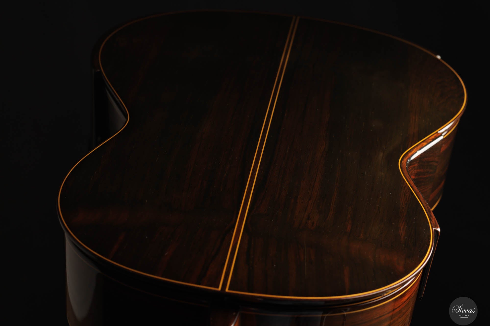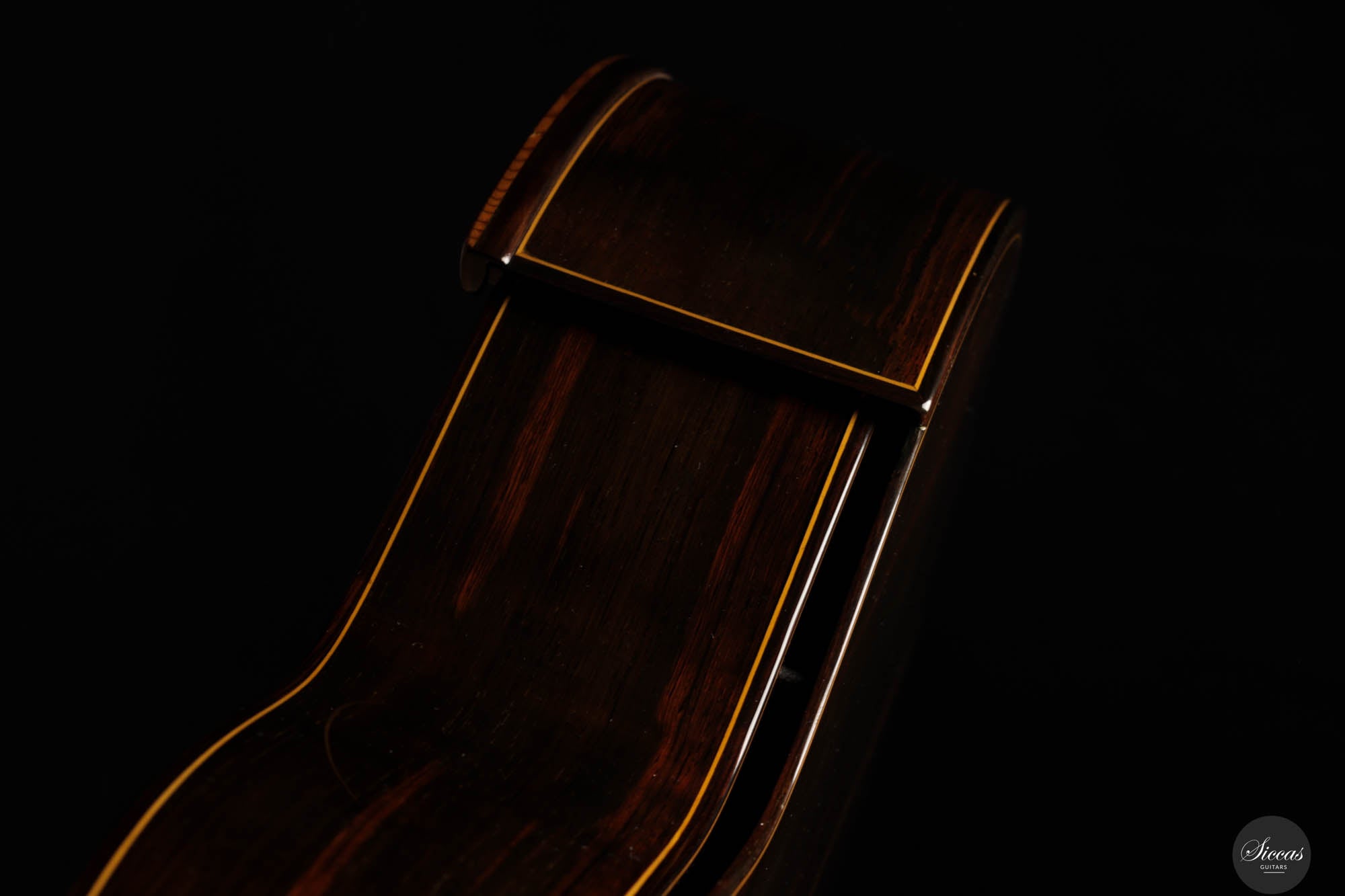 This rare resonador guitar by Manuel Gonzalez Contreras stands out as an innovative achievement of the Madrid school. Its distinctive outer resonating shell frees the inner body from contact with the player, resulting in remarkable projection and tonal depth. Enhanced by an integrated cedar armrest, it offers superior comfort and playability, a feature seldom found in such models. Built with Brazilian rosewood back and sides, the instrument combines elegance, exclusivity, and warmth. The sound is expansive and powerful, yet imbued with the romantic character typical of Contreras’ work. In very good condition with only one expertly restored crack, it represents both a valuable collector’s item and a compelling concert guitar of exceptional rarity.