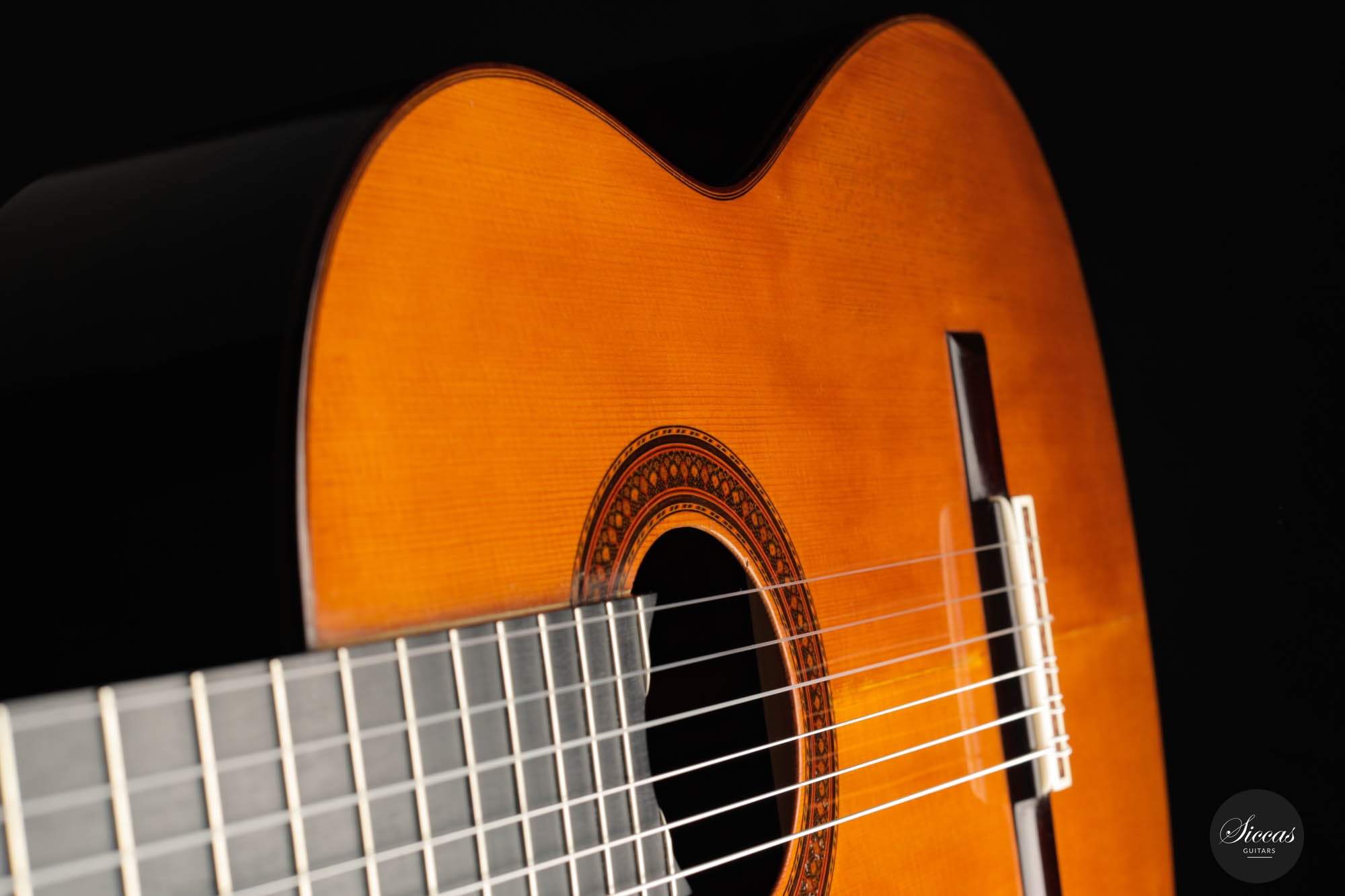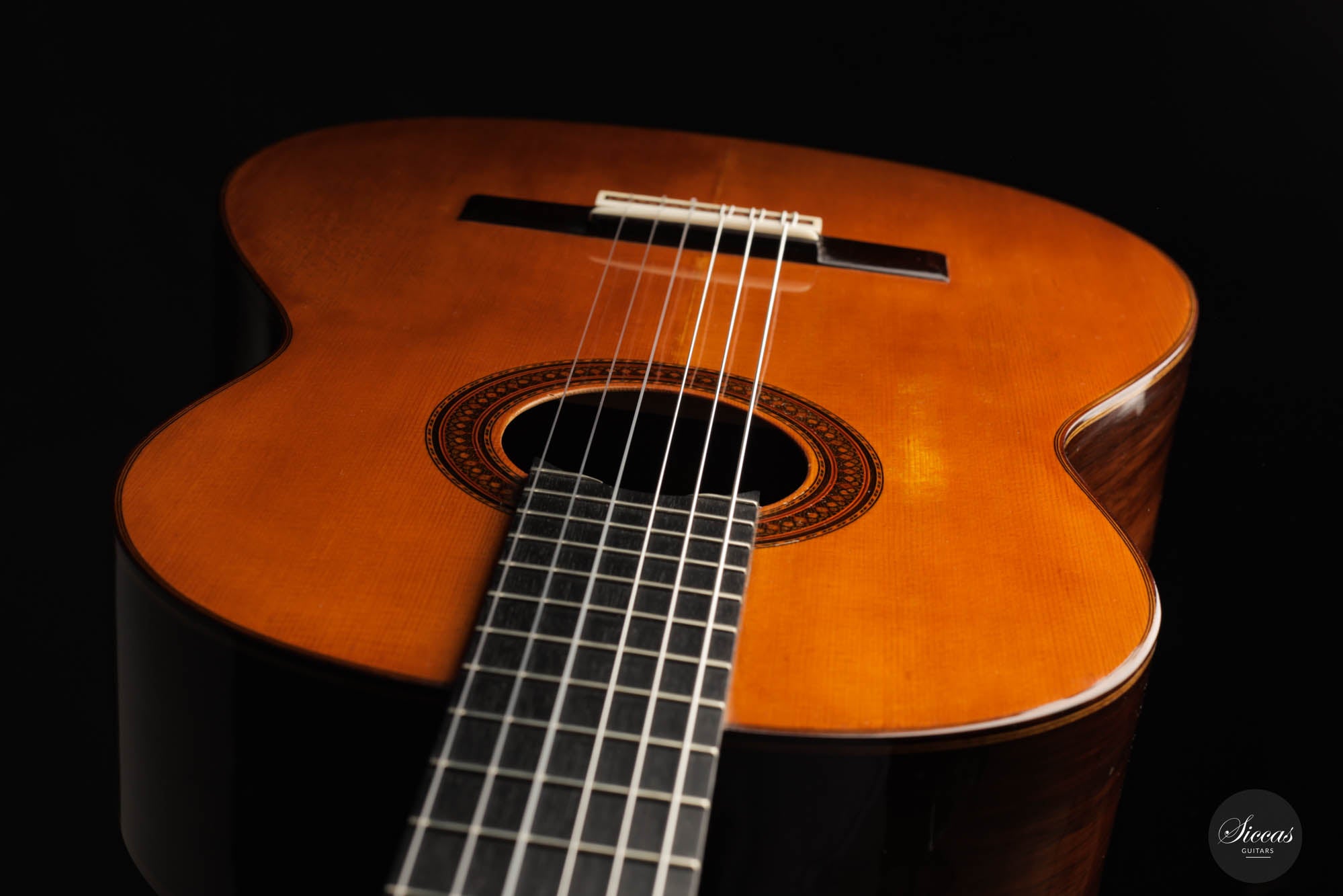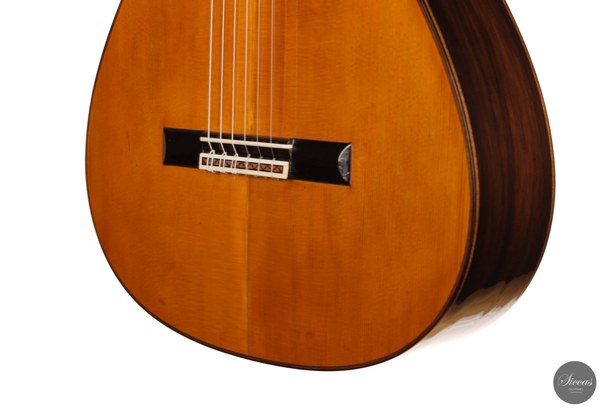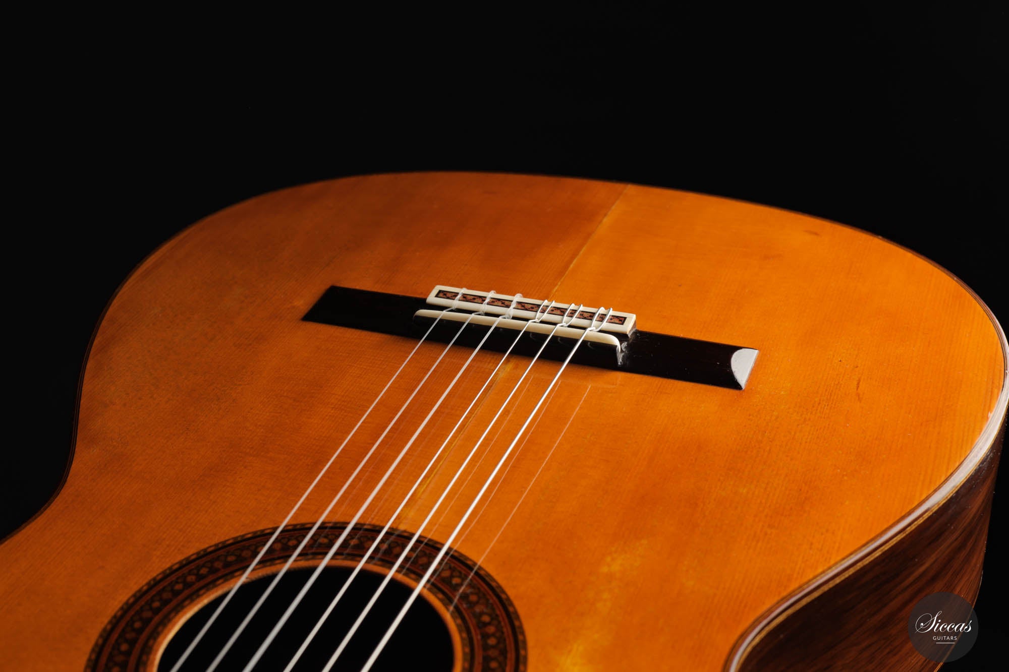 This 1968 Manuel de la Chica guitar is a zenith of Spanish guitar craftsmanship. Embodying the rich heritage of Spanish luthiery, this guitar is a testament to the talent and mastery of the legendary guitar maker Manuel de la Chica. This fine instrument showcases an exceptional state of preservation, holding a remarkable semblance to its original form despite the years since its creation. A meticulous repair was made to the middle joint of the soundboard, and a thin yet solid layer of spruce has been affixed for enhanced stability, testifying to the careful maintenance it has received. The guitar's back, and sides are crafted from stunning CITES-certified Brazilian rosewood. The aesthetic allure of this wood, its grain, and its hue contribute a distinct touch of artistry to the instrument. The spruce soundboard is a marvel of structural integrity and acoustic engineering, featuring seven fan braces and an additional short diagonal brace on the lower bout's treble and bass sides. These reinforcements bolster the instrument's resilience while influencing its tonal characteristics. Sonically, the guitar boasts a primary body resonance at the F frequency, producing bass notes that are profoundly deep and haunting, enveloping the listener in a captivating auditory experience. The trebles are bright and lively in perfect counterbalance, cutting through with clarity and brilliance. Together, this guitar's bass and treble ranges create a harmonious interplay of sound that can only be described as music at its purest form. This 1968 Manuel de la Chica guitar encapsulates the epitome of Spanish guitar-making tradition, preserving the artistry, craftsmanship, and tonal excellence that Manuel de la Chica himself championed. An instrument of such caliber is more than just a musical tool—it is a piece of history, a work of art, and a source of inspiration for musicians and aficionados alike.