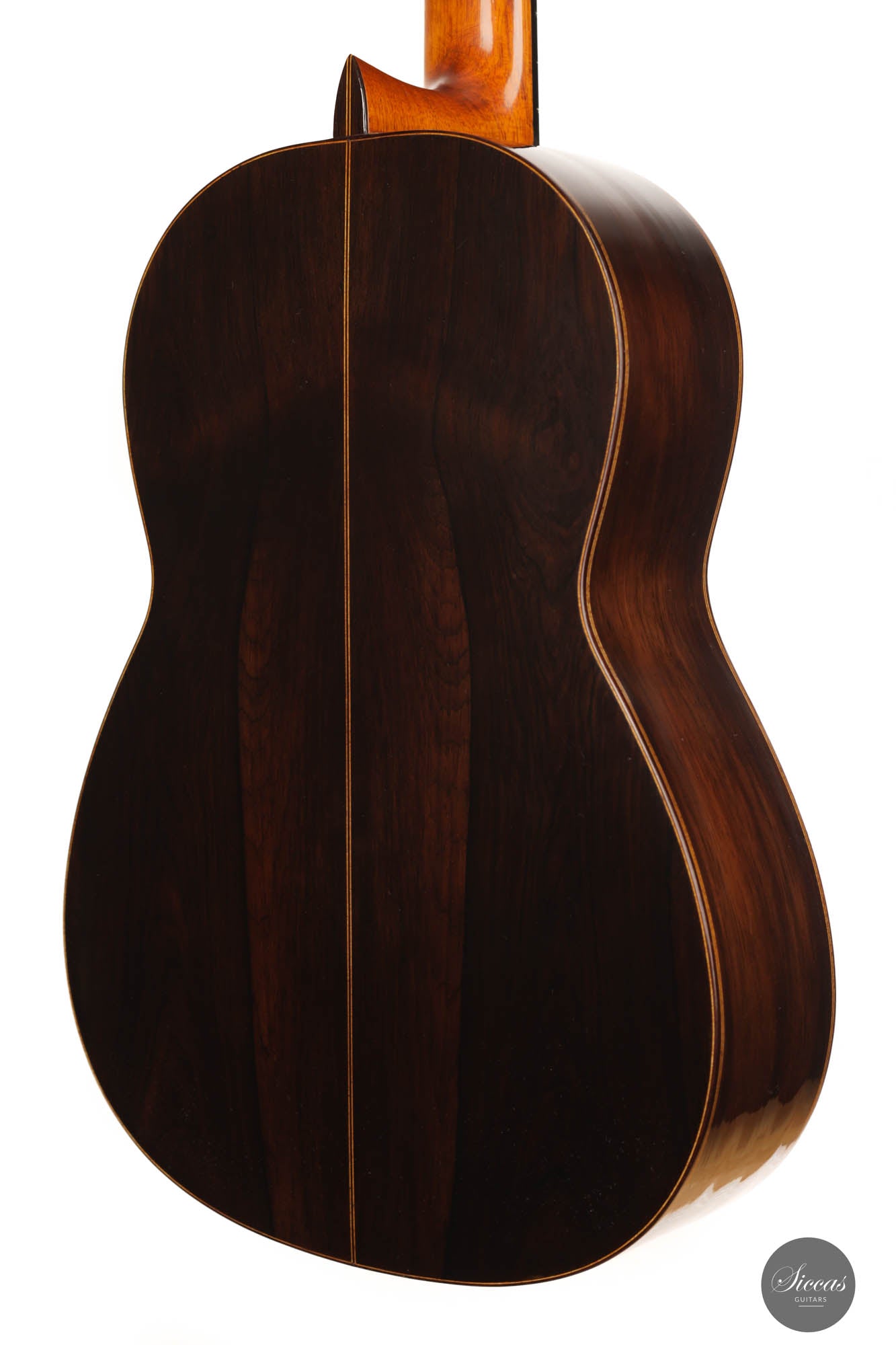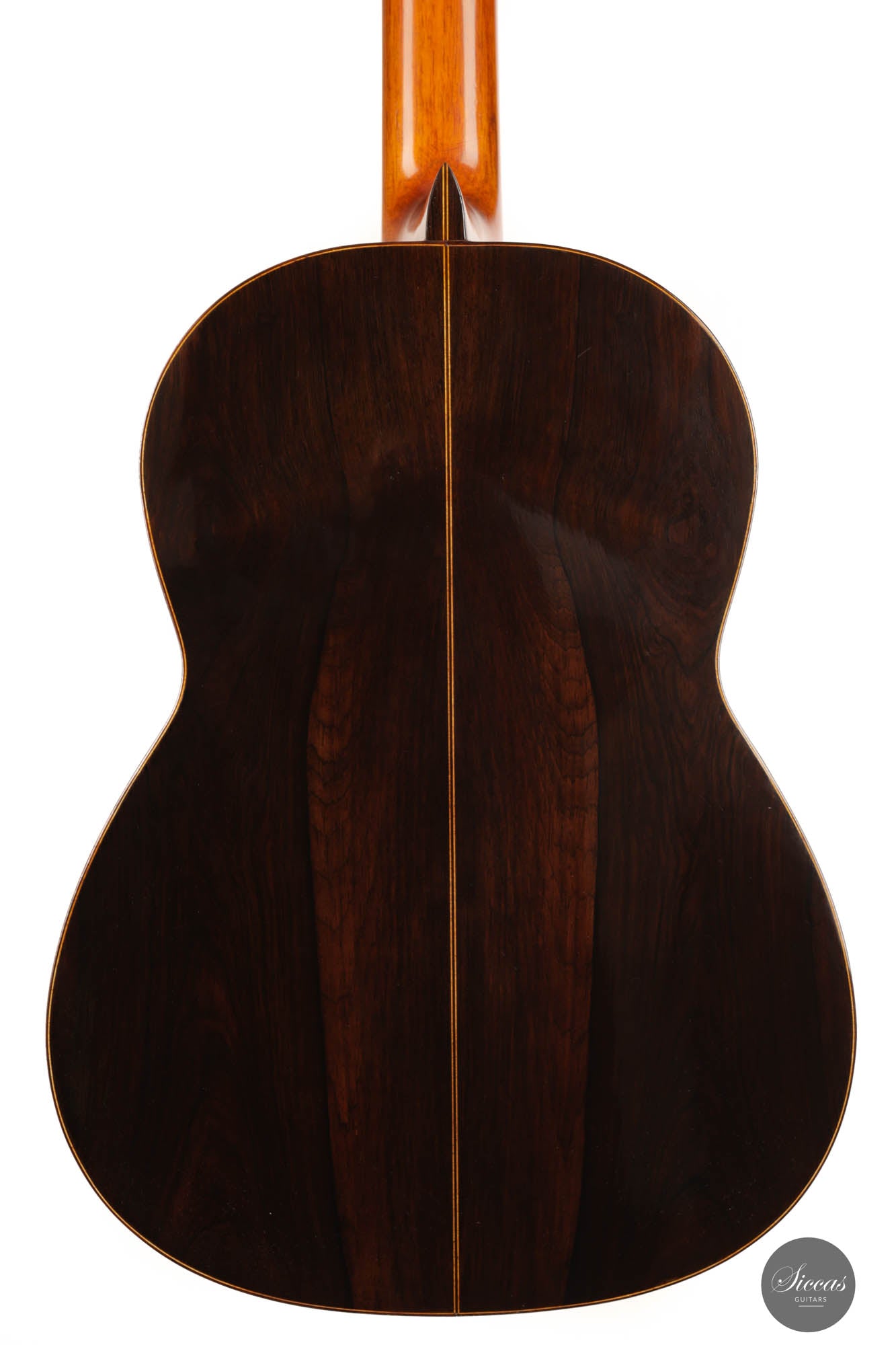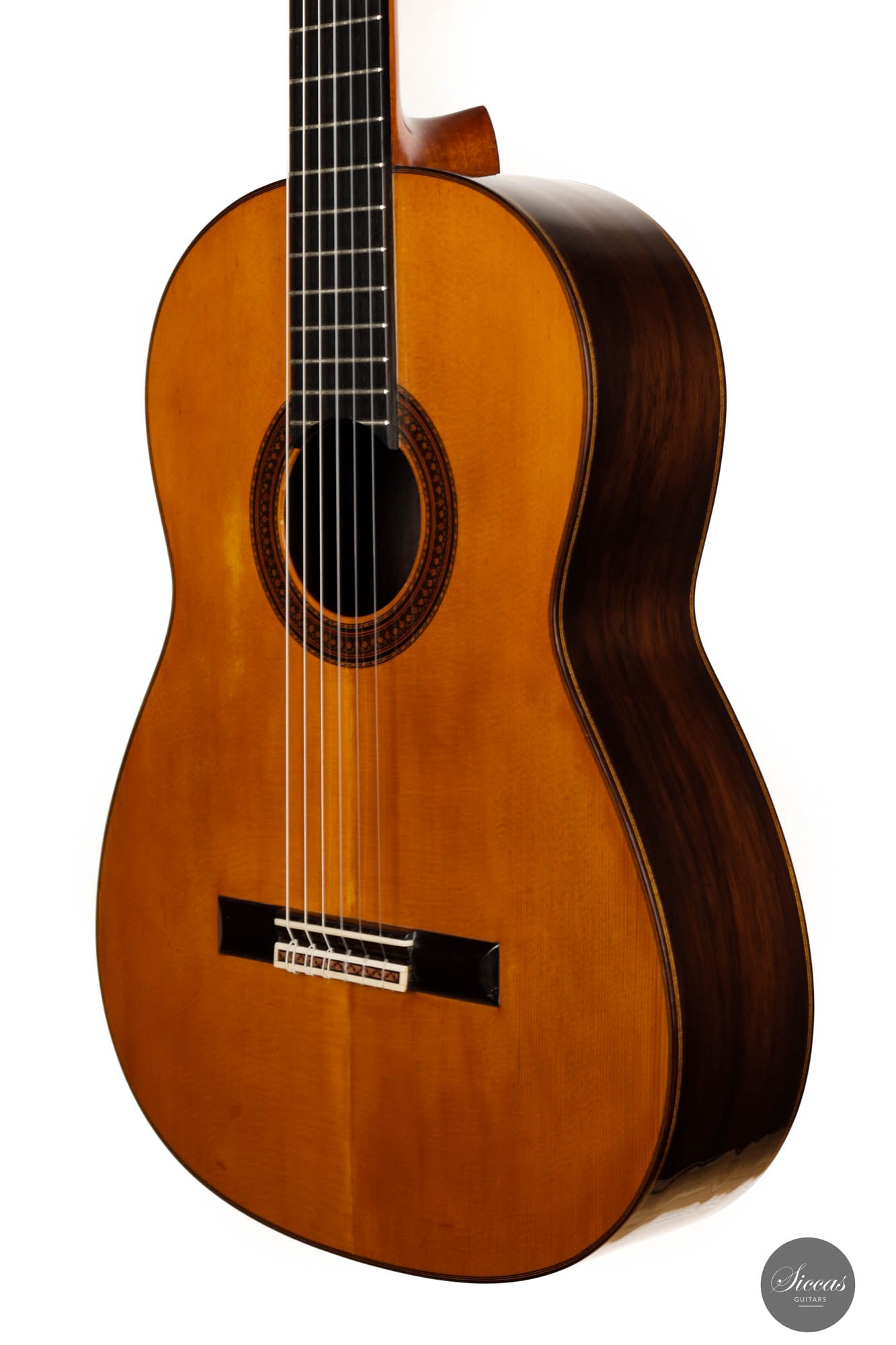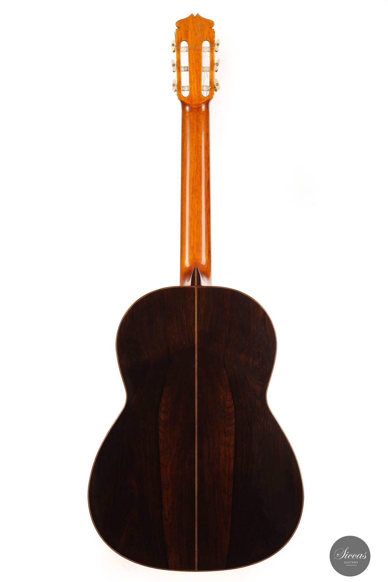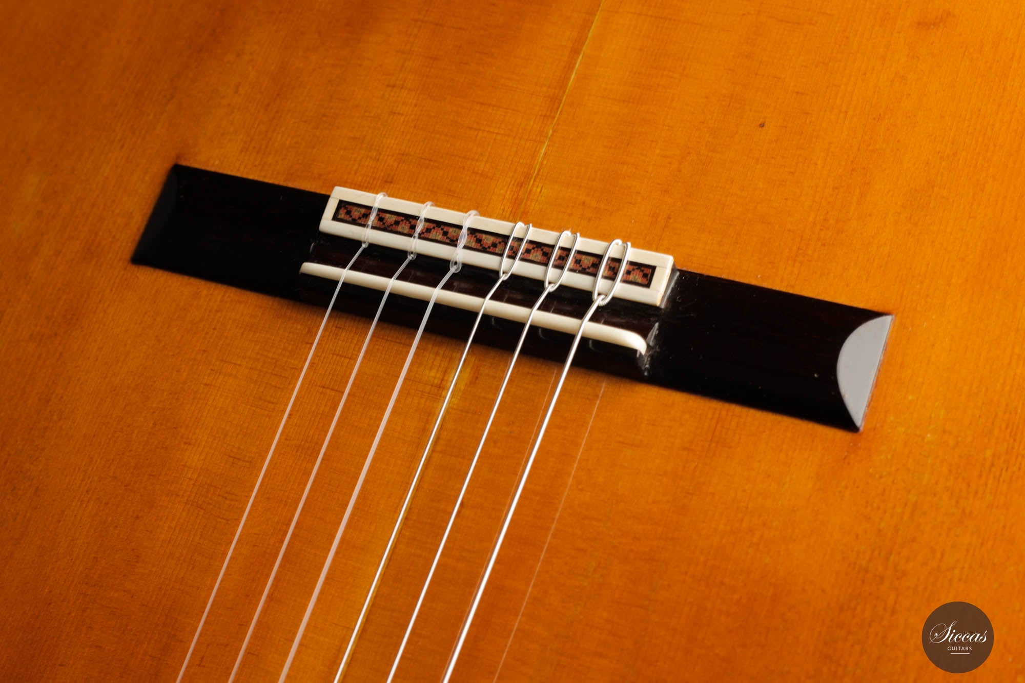 This 1968 Manuel de la Chica guitar is a zenith of Spanish guitar craftsmanship. Embodying the rich heritage of Spanish luthiery, this guitar is a testament to the talent and mastery of the legendary guitar maker Manuel de la Chica. This fine instrument showcases an exceptional state of preservation, holding a remarkable semblance to its original form despite the years since its creation. A meticulous repair was made to the middle joint of the soundboard, and a thin yet solid layer of spruce has been affixed for enhanced stability, testifying to the careful maintenance it has received. The guitar's back, and sides are crafted from stunning CITES-certified Brazilian rosewood. The aesthetic allure of this wood, its grain, and its hue contribute a distinct touch of artistry to the instrument. The spruce soundboard is a marvel of structural integrity and acoustic engineering, featuring seven fan braces and an additional short diagonal brace on the lower bout's treble and bass sides. These reinforcements bolster the instrument's resilience while influencing its tonal characteristics. Sonically, the guitar boasts a primary body resonance at the F frequency, producing bass notes that are profoundly deep and haunting, enveloping the listener in a captivating auditory experience. The trebles are bright and lively in perfect counterbalance, cutting through with clarity and brilliance. Together, this guitar's bass and treble ranges create a harmonious interplay of sound that can only be described as music at its purest form. This 1968 Manuel de la Chica guitar encapsulates the epitome of Spanish guitar-making tradition, preserving the artistry, craftsmanship, and tonal excellence that Manuel de la Chica himself championed. An instrument of such caliber is more than just a musical tool—it is a piece of history, a work of art, and a source of inspiration for musicians and aficionados alike.