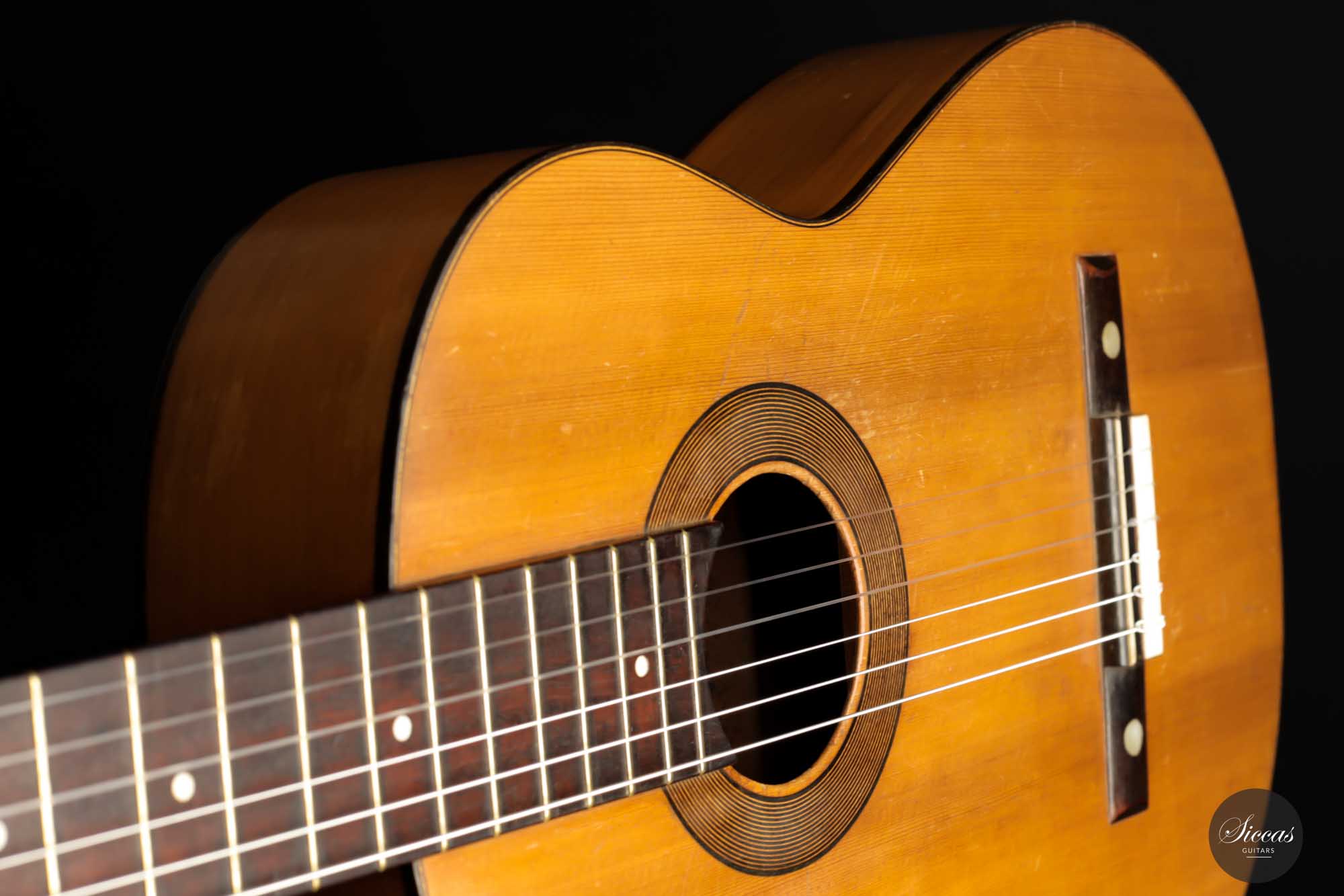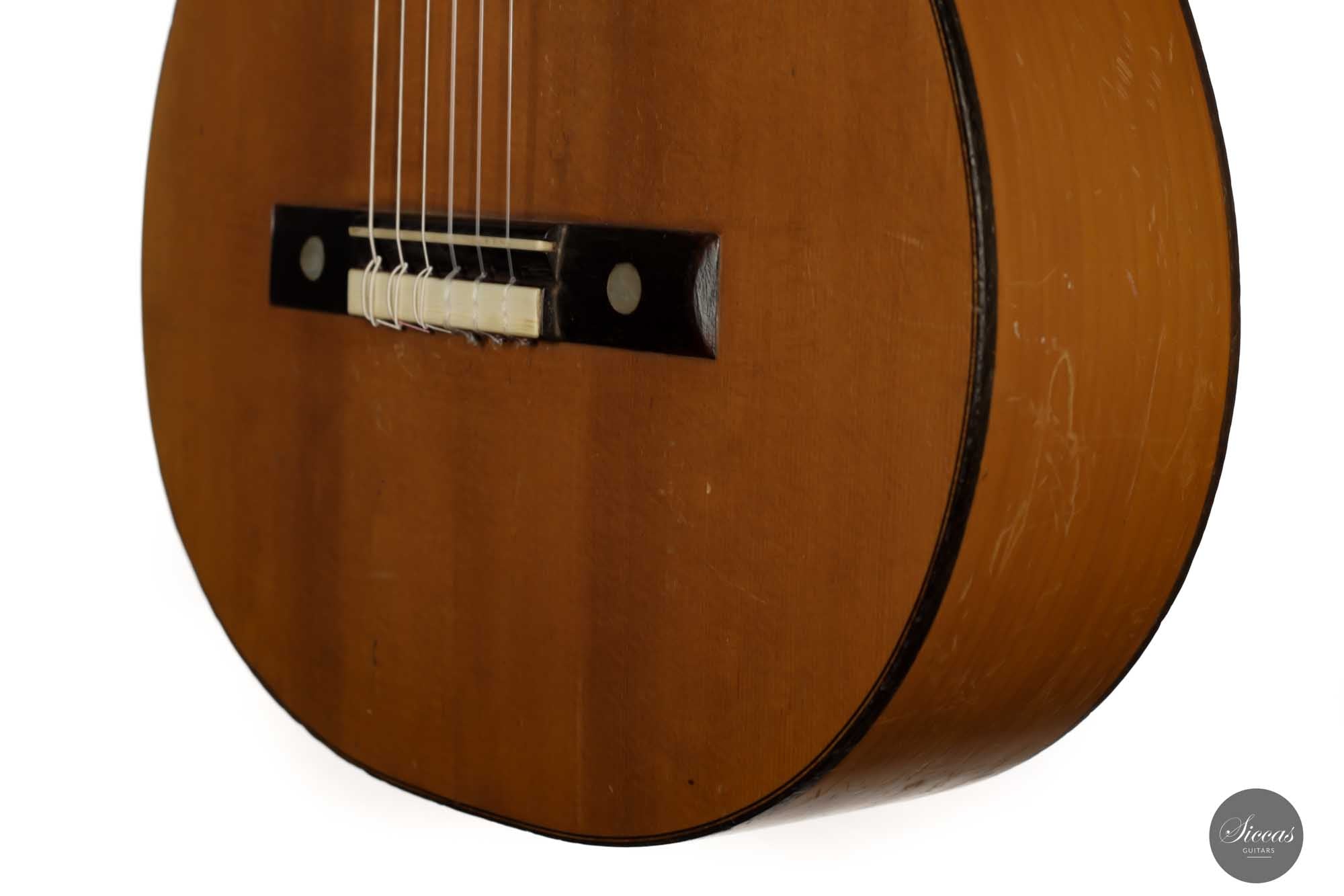 This beautiful model was made between 1903-1909 and is an essential part of Spanish guitar history. This slightly smaller-bodied instrument has a vibrant Spanish tone character with deep, dark, mysterious basses and clear bell-like smooth trebles. Due to the feather-like weight, this Manuel Ramirez possesses a considerable volume and instant response. The mystical character with its charm has continued to captivate players and listeners of any type. Despite its age, this guitar is in excellent playing condition, with only one well-repaired crack on the side. The well-aged spruce soundboard and cypress back are in remarkable condition, showing only some playing wear. This Manuel Ramirez guitar is a piece of history that will please collectors and players of any sort.