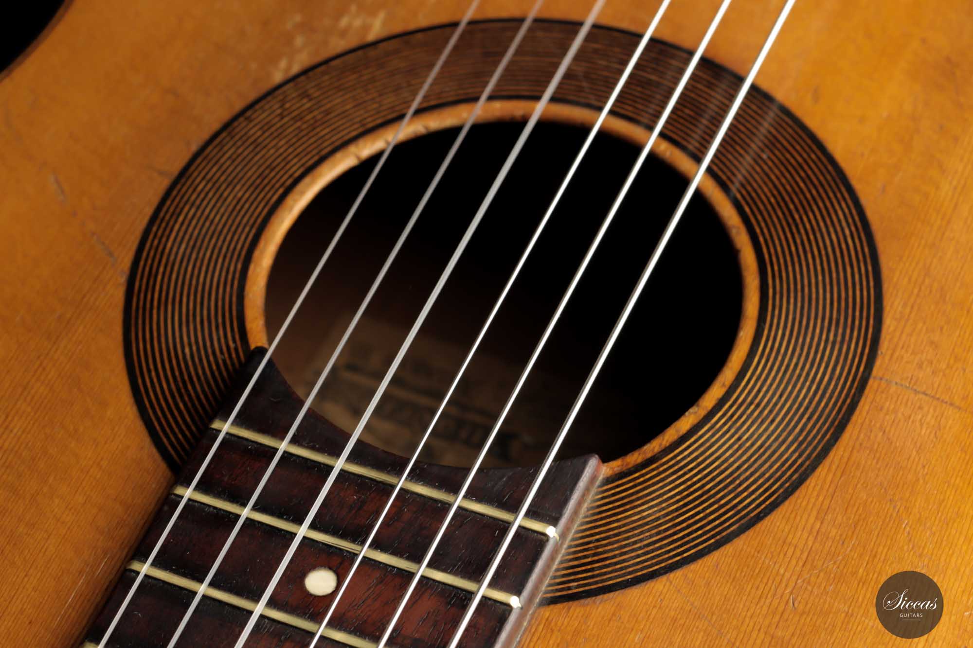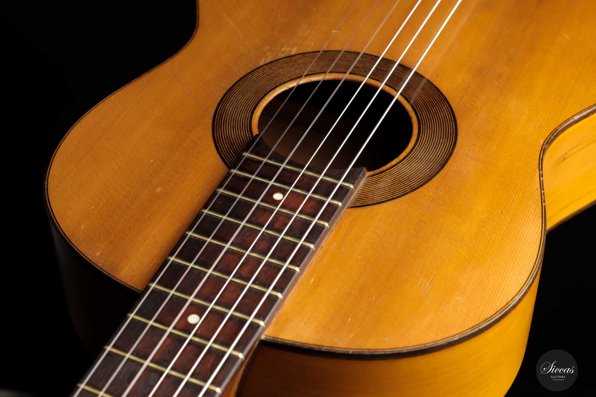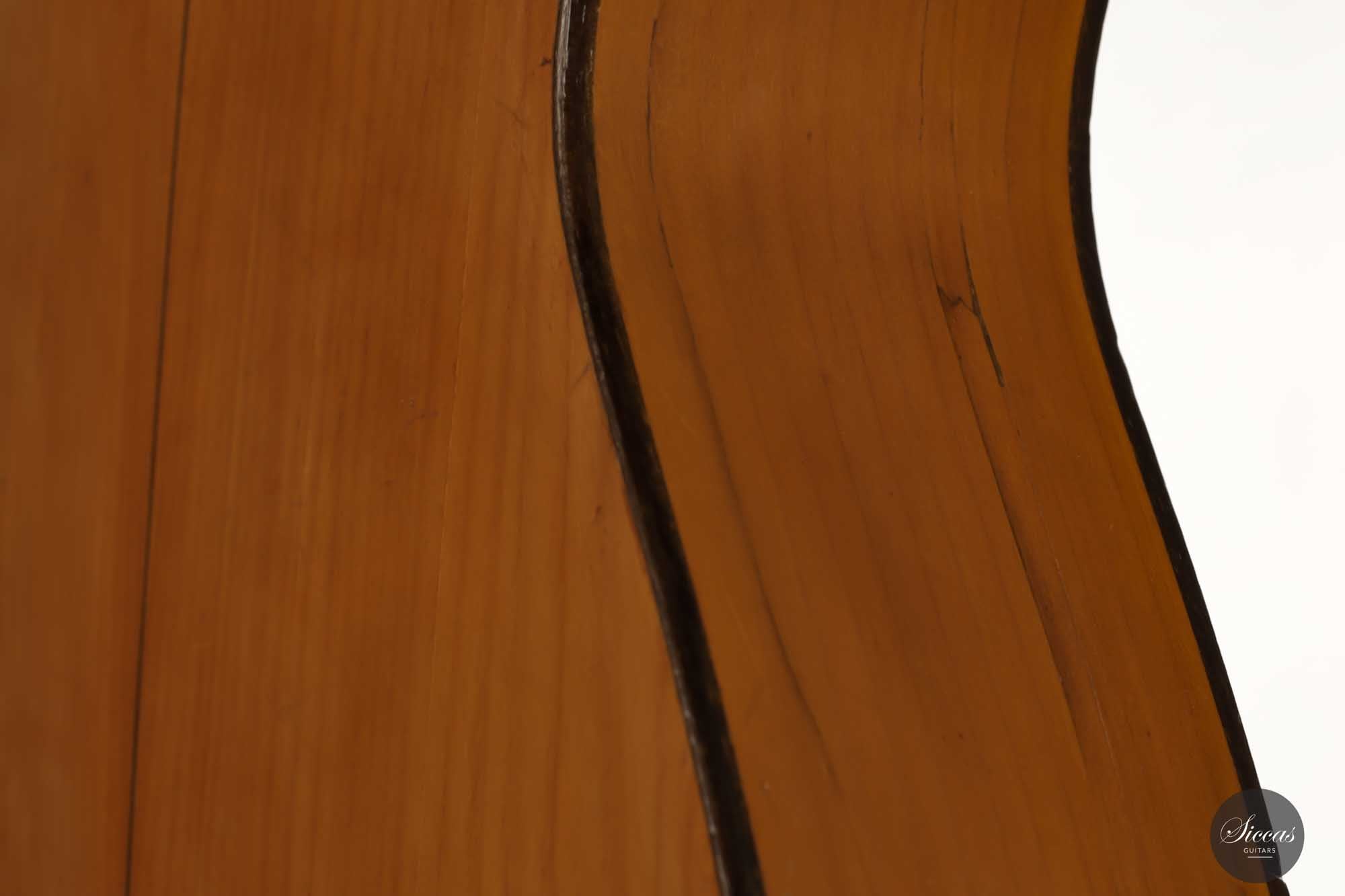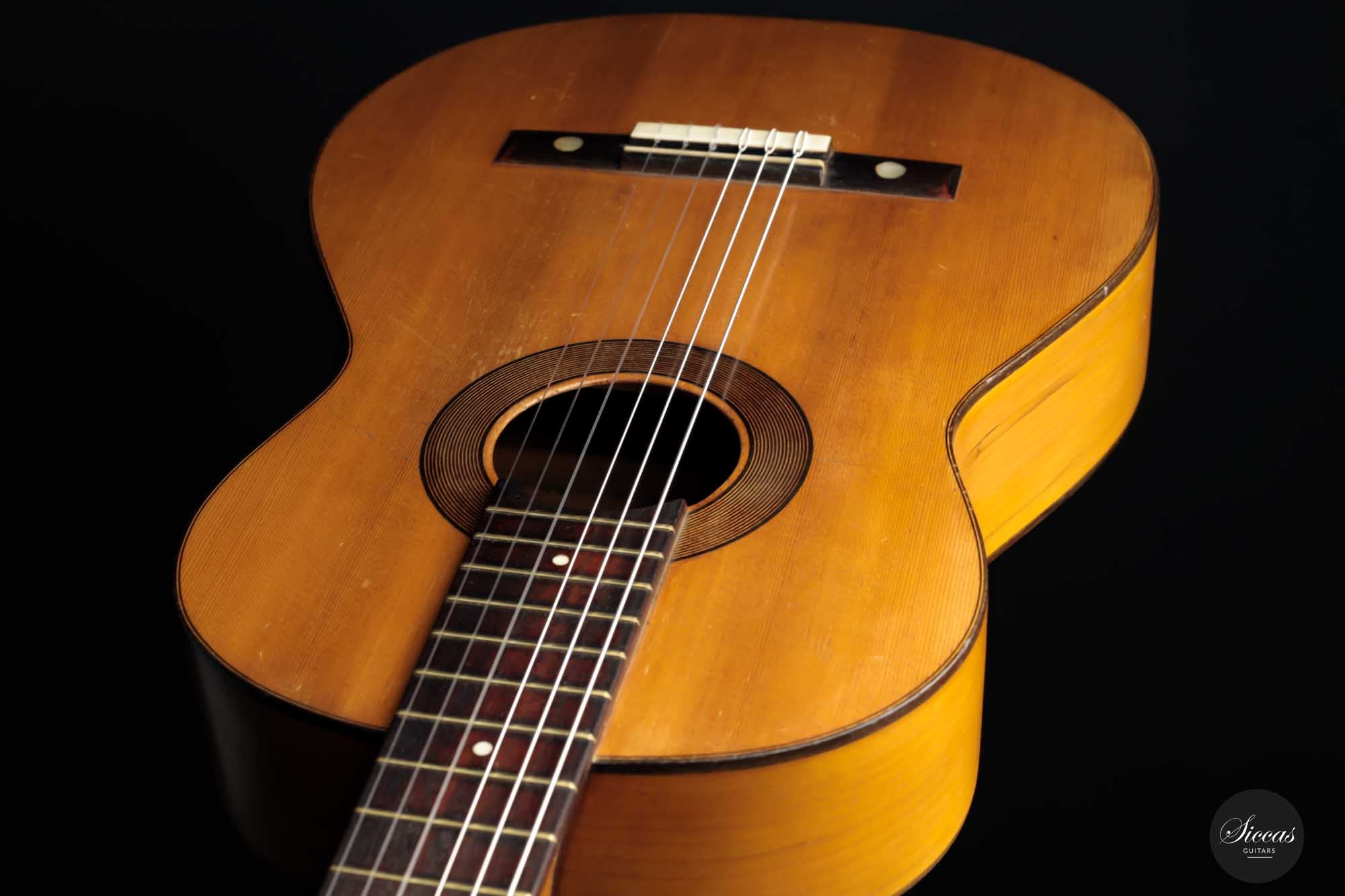 Manuel Ramirez’s design is sober yet precise and delicate, with just enough elaboration to make it precious yet enough free space to admire the quality of the wood and set the standard for generations to come. Moreover, he was one of the first luthiers in Madrid to truly understand the legacy of Antonio de Torres (1817-1892), both in terms of aesthetics and sound. From the many Torres guitars that still can be found with Manuel Ramirez’s repair label inside, it is clear that M. Ramirez studied Antonio de Torres’s instruments on many occasions. The real genius was Ramirez’s ability to grasp their essence and express it in his own way. As a result, his instruments are well-proportioned full-size concert guitars with a responsive, deeply tuned soundboard, rich, complex tone, and outstanding craftsmanship.