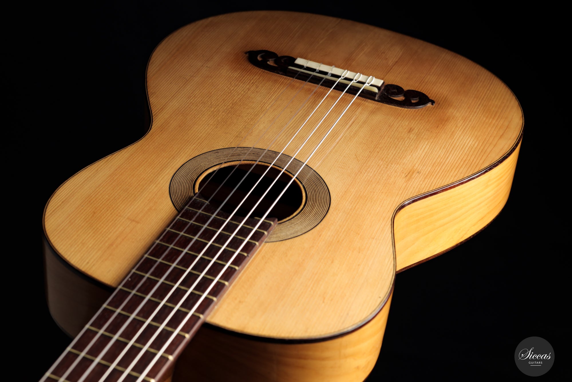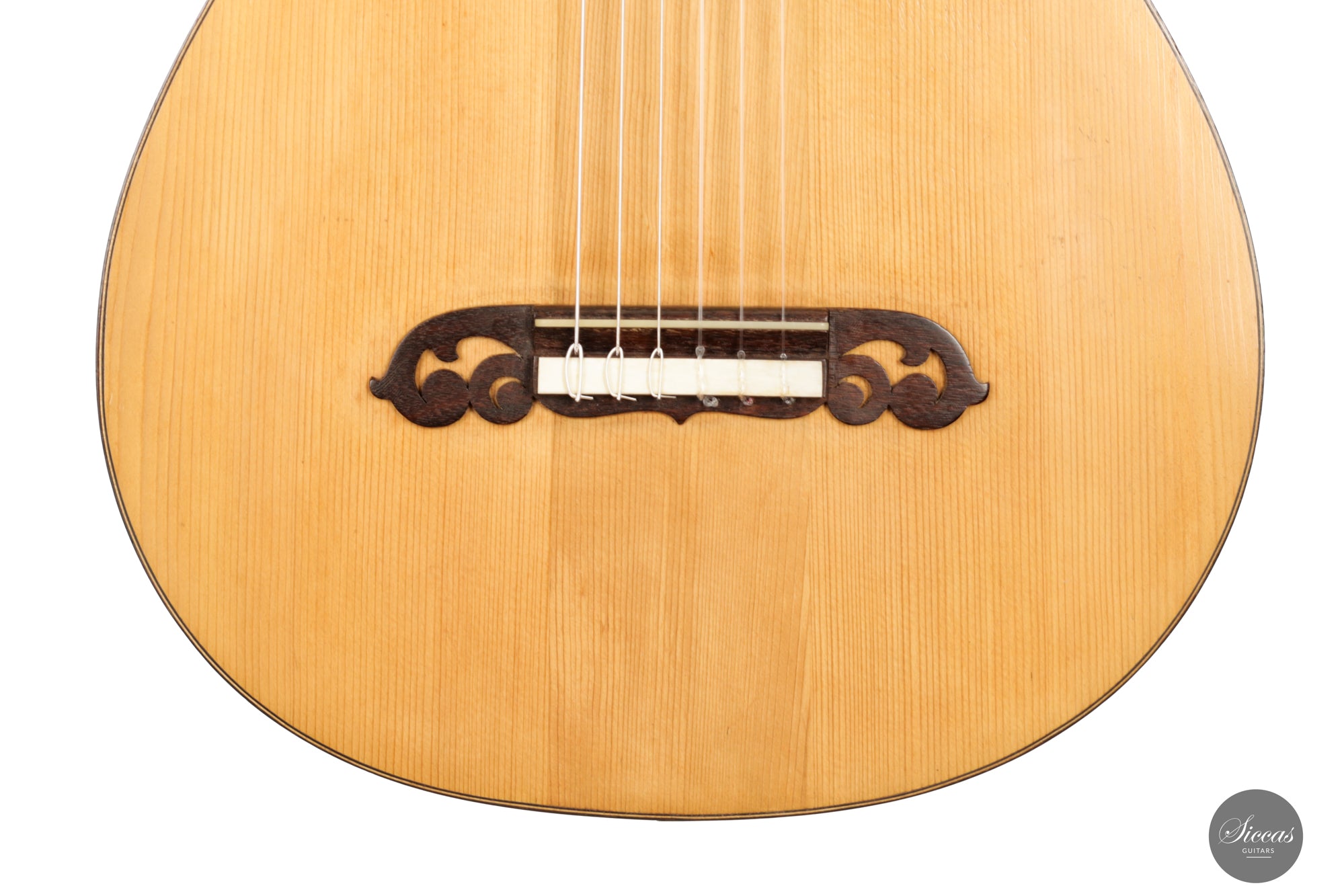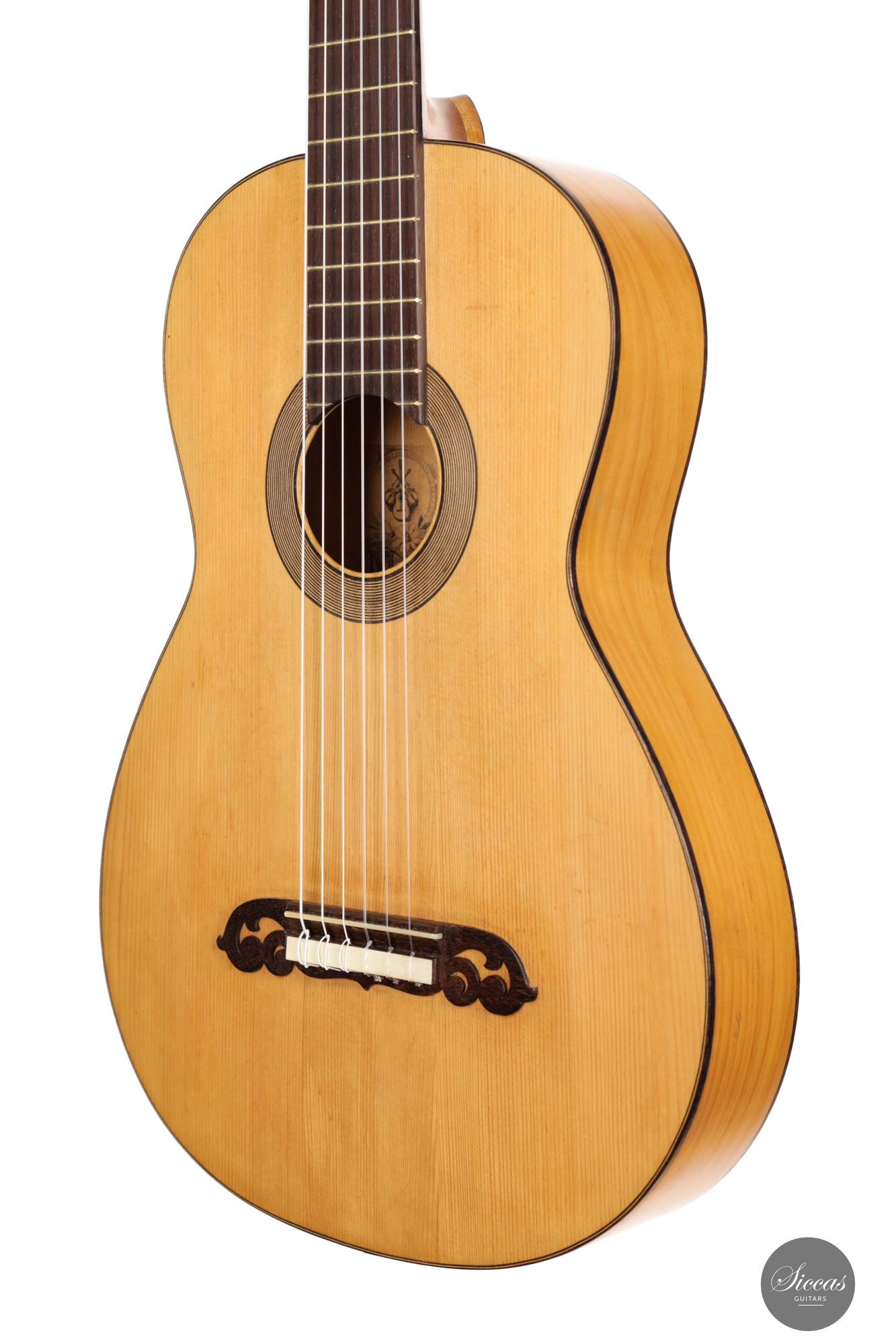 Manuel Ramirez (1864-1916) is one of the most important luthiers of guitar history. In his workshop in Madrid he trained and inspired many now-legendary luthiers such as Santos Hernandez, Enrique Garcia, Domingo Esteso, Modesto Borreguero, Antonio Emilio Pascual Viudes and José Gomez-Ramirez. His legacy can be found in almost all modern guitar-making branches. From South America with his employee Antonio Emilio Pascual Viudes (1883-1959), who migrated to Buenos Aires before the first world war, to the French school of guitar making with Julian Gomez Ramirez (1879-1943), who brought the Spanish guitar to Paris and taught the famous French luthier Robert Bouchet (1898-1986); the Barcelonian aesthetic with Enrique Garcia (1868-1922) or the following of the Madrid sound ideal with Santos Hernandez (1874-1943) and Domingo Esteso (1882–1937). It is also interesting to note that Manuel Ramirez strongly inspired cutting-edge German luthiers Matthias Damman and Gernot Wagner’s headstock shape and, more generally, the German classical guitar-making philosophy that started with the collaboration of Andrés Segovia (1893-1987) and Hermann Hauser I (1882-1952) in the 1920s, happened around Segovia’s more than famous Manuel Ramirez made in 1912.