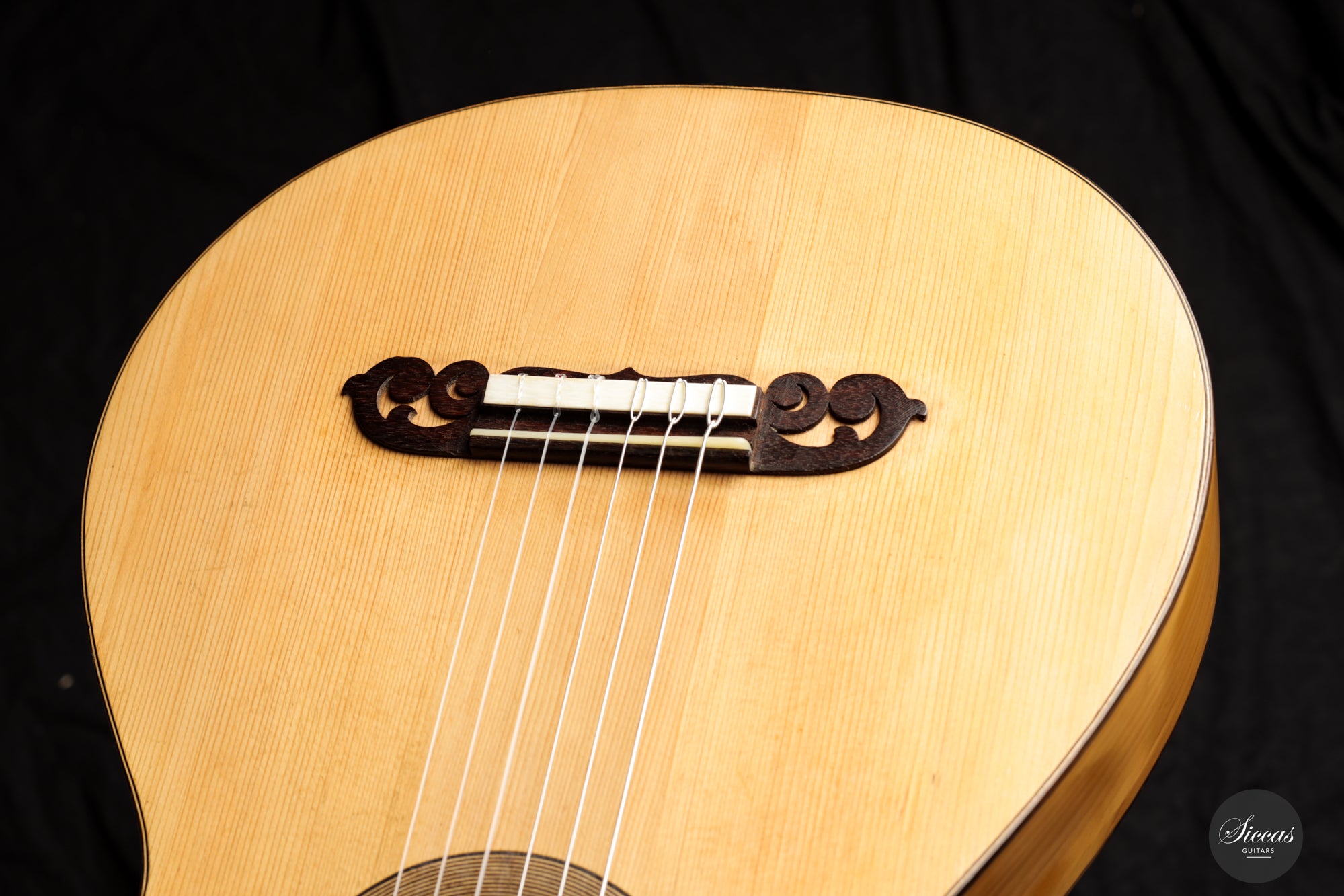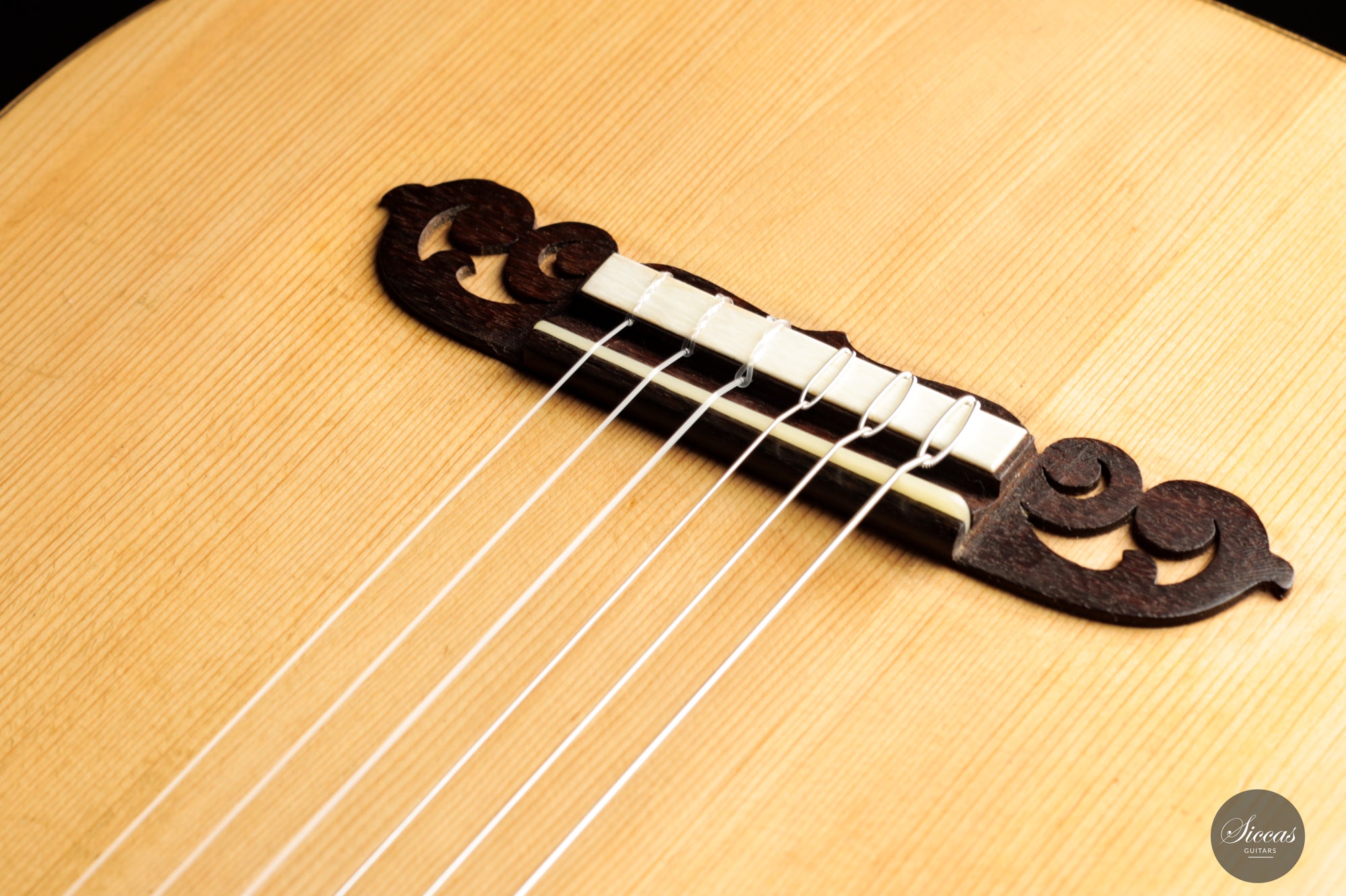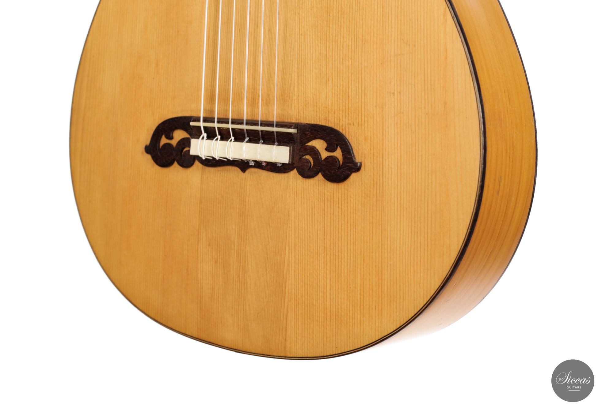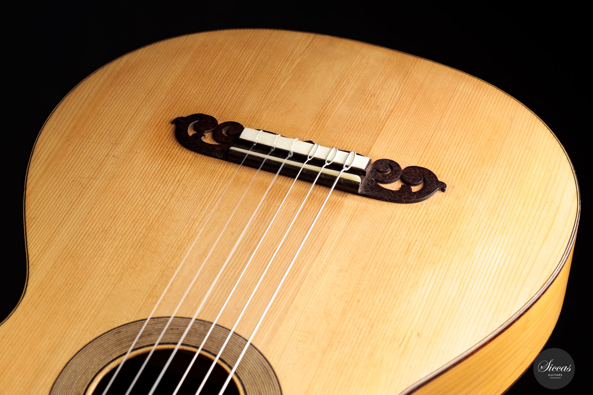 Manuel Ramirez (1864-1916) is one of the most important luthiers of guitar history. In his workshop in Madrid he trained and inspired many now-legendary luthiers such as Santos Hernandez, Enrique Garcia, Domingo Esteso, Modesto Borreguero, Antonio Emilio Pascual Viudes and José Gomez-Ramirez. His legacy can be found in almost all modern guitar-making branches. From South America with his employee Antonio Emilio Pascual Viudes (1883-1959), who migrated to Buenos Aires before the first world war, to the French school of guitar making with Julian Gomez Ramirez (1879-1943), who brought the Spanish guitar to Paris and taught the famous French luthier Robert Bouchet (1898-1986); the Barcelonian aesthetic with Enrique Garcia (1868-1922) or the following of the Madrid sound ideal with Santos Hernandez (1874-1943) and Domingo Esteso (1882–1937). It is also interesting to note that Manuel Ramirez strongly inspired cutting-edge German luthiers Matthias Damman and Gernot Wagner’s headstock shape and, more generally, the German classical guitar-making philosophy that started with the collaboration of Andrés Segovia (1893-1987) and Hermann Hauser I (1882-1952) in the 1920s, happened around Segovia’s more than famous Manuel Ramirez made in 1912.