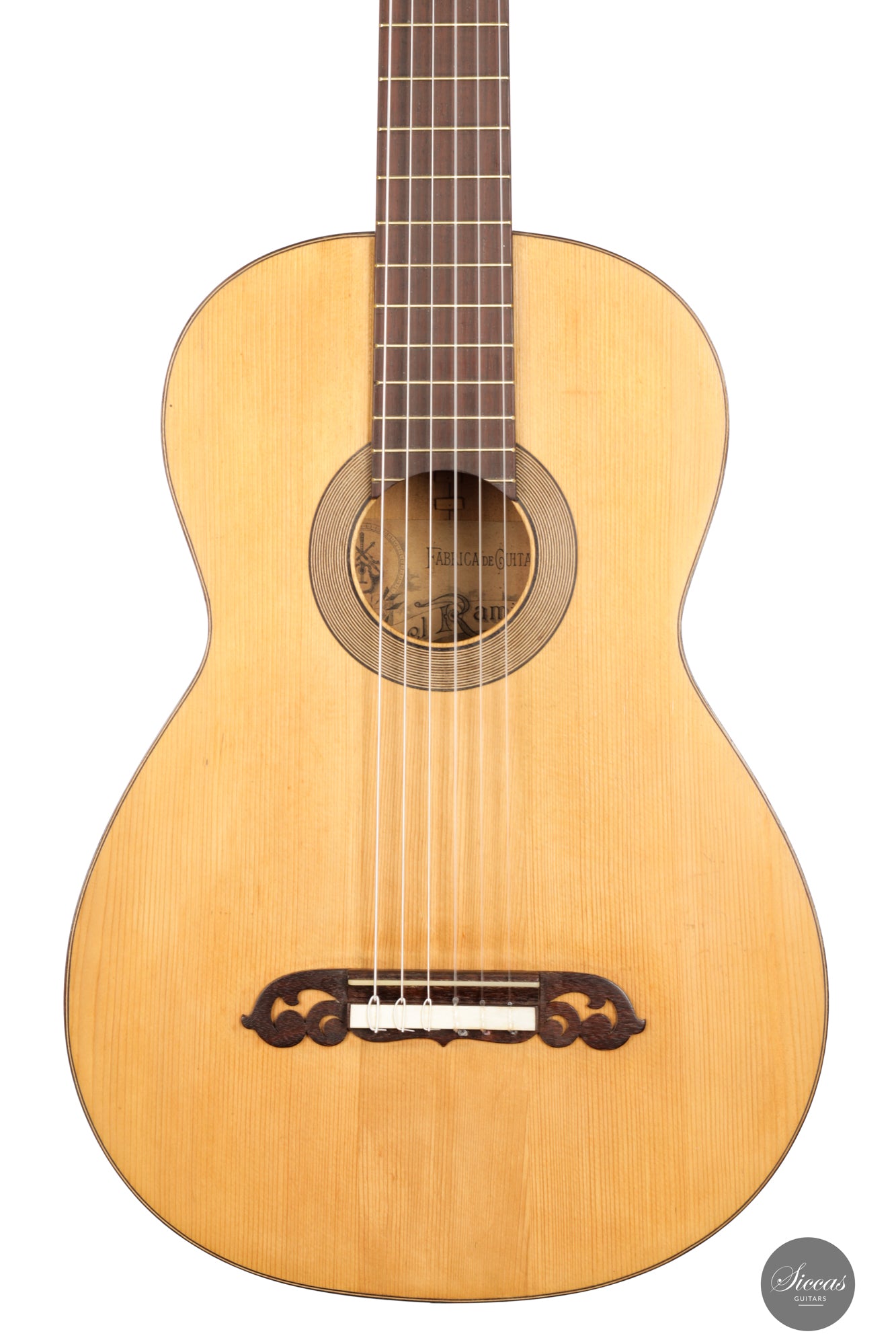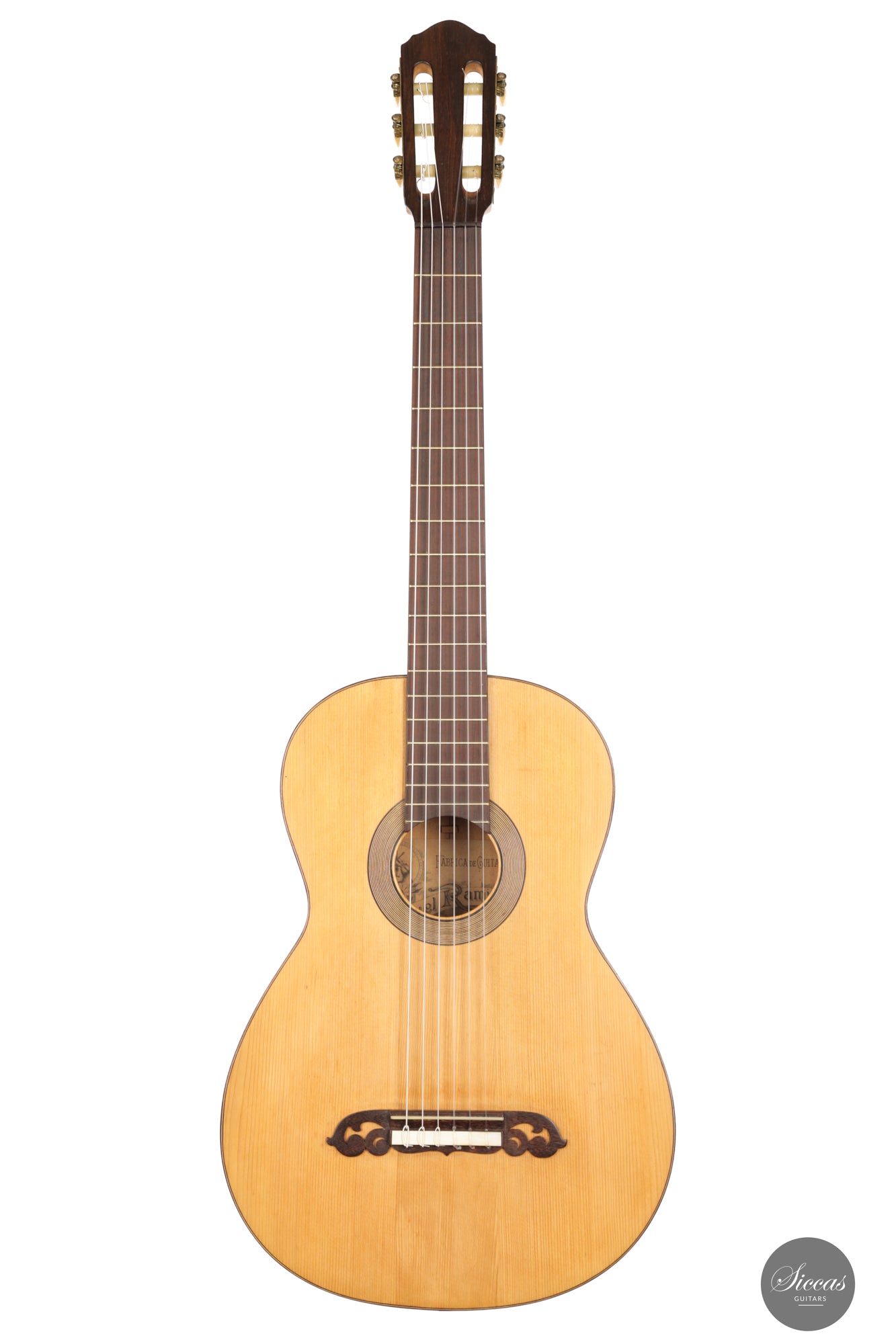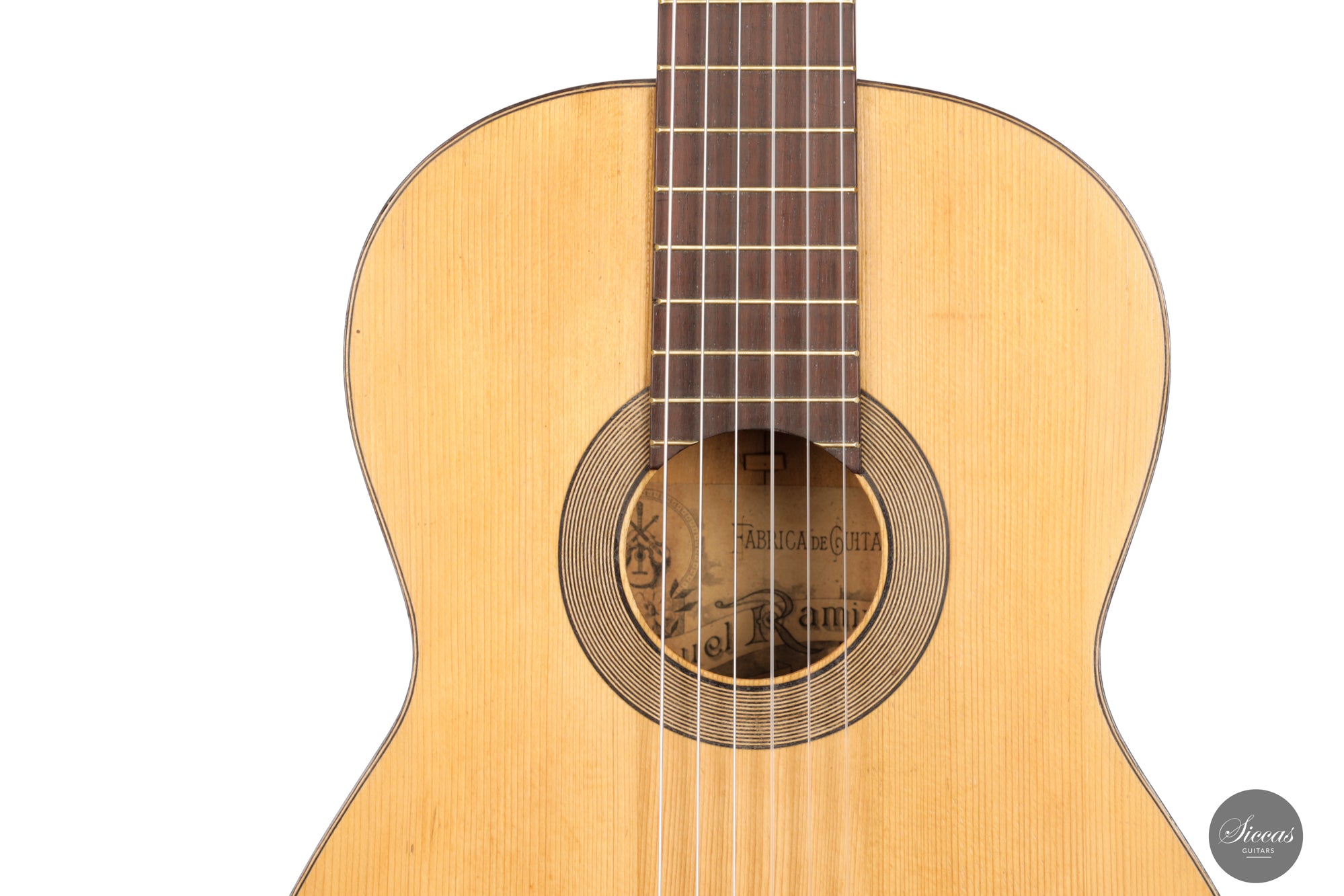 Manuel Ramirez’s design is sober yet precise and delicate, with just enough elaboration to make it precious yet enough free space to admire the quality of the wood and set the standard for generations to come. Moreover, he was one of the first luthiers in Madrid to truly understand the legacy of Antonio de Torres (1817-1892), both in terms of aesthetics and sound. From the many Torres guitars that still can be found with Manuel Ramirez’s repair label inside, it is clear that M. Ramirez studied Antonio de Torres’s instruments on many occasions. The real genius was Ramirez’s ability to grasp their essence and express it in his own way. As a result, his instruments are well-proportioned full-size concert guitars with a responsive, deeply tuned soundboard, rich, complex tone, and outstanding craftsmanship.