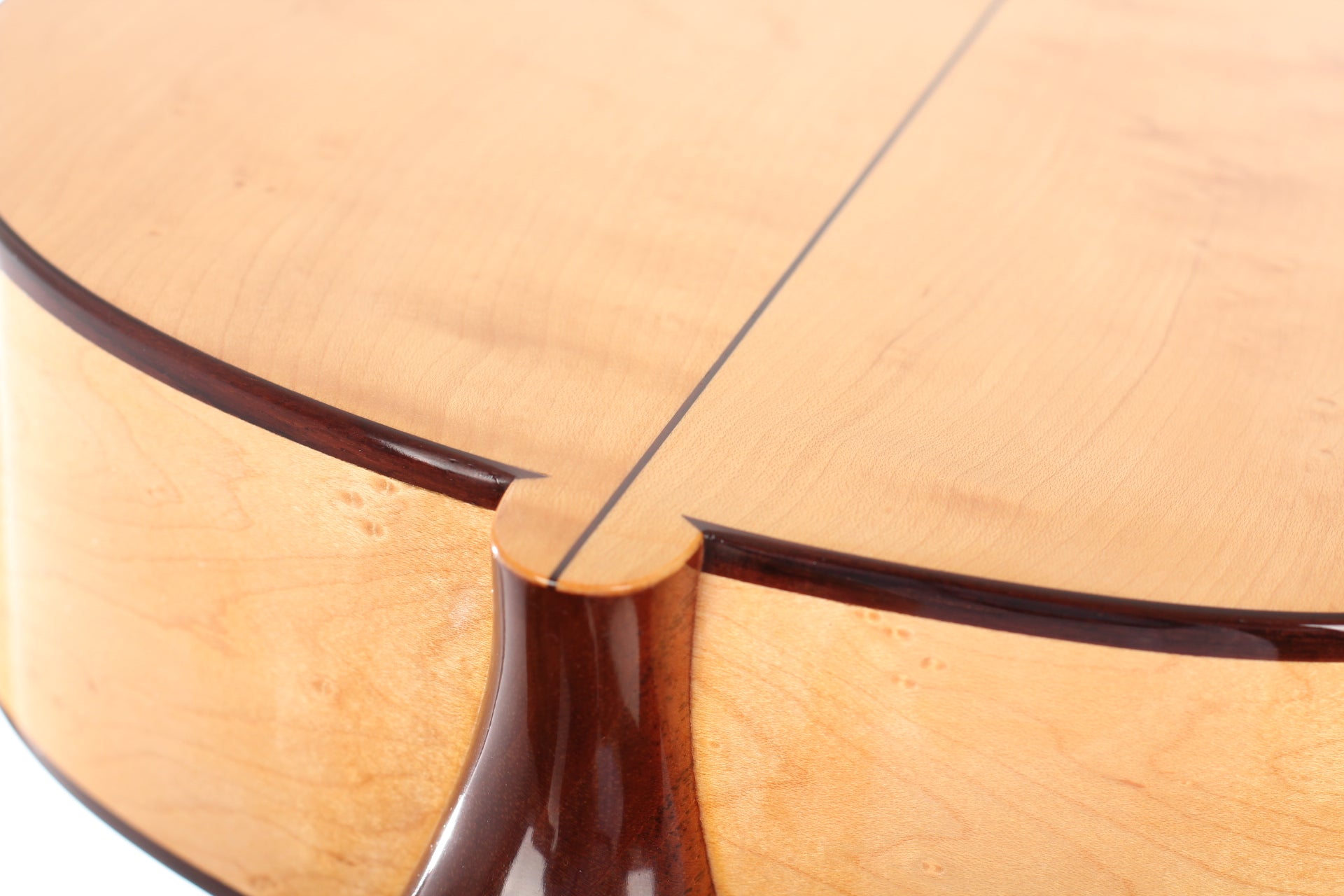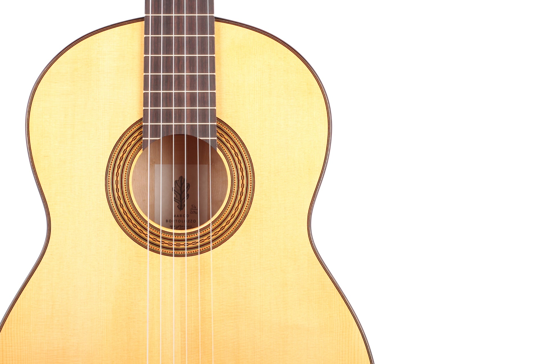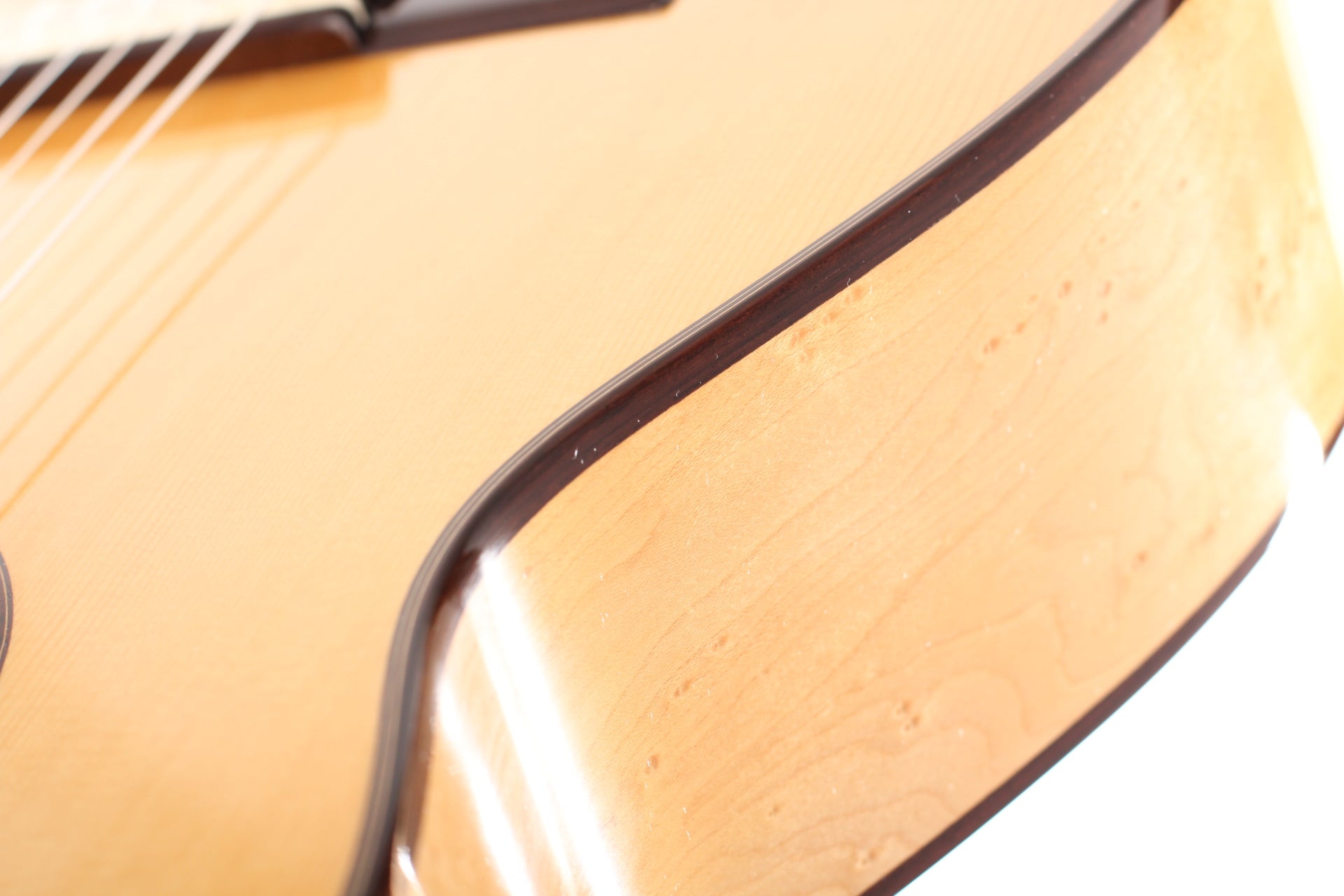 Since 2010 Marco Bortolozzo has built traditional classical guitars. This beautiful instrument is based on the template of the famous Torres FE09 and is decorated in the same style. The FE09 became famous because it was Miguel Llobet’s preferred guitar. This Bortolozzo guitar is very light and has a beautiful timbre as well as a gorgeous warm old world sound. The soundboard is made of spruce, is about 1,7-1,8 mm thick and has a traditional Torres fan bracing. The sides and the back are made of beautiful bird’s eye maple. It is all shellac French polished. The tuners are made by Alessi. Comes with a Hiscox Pro II case.