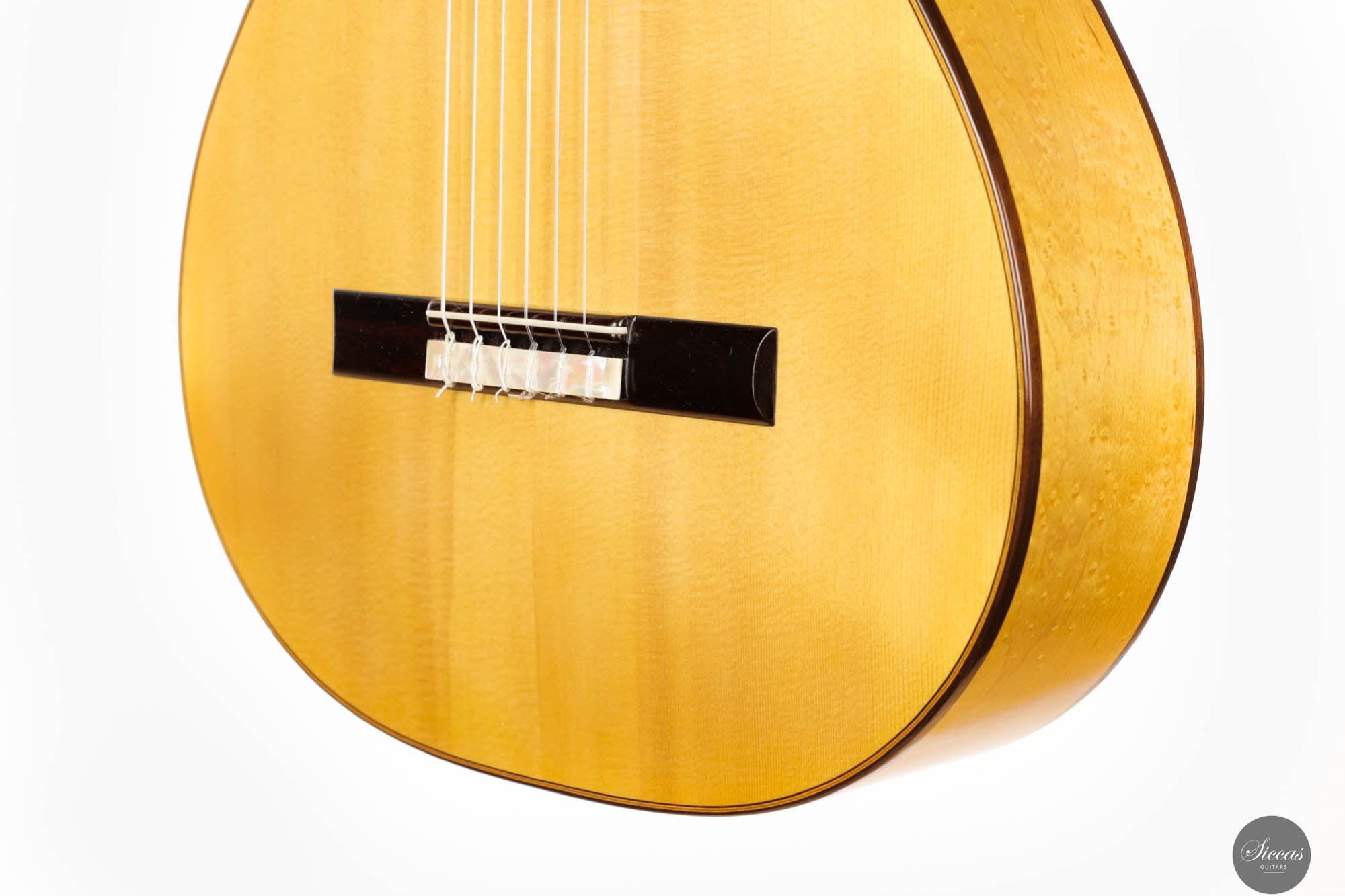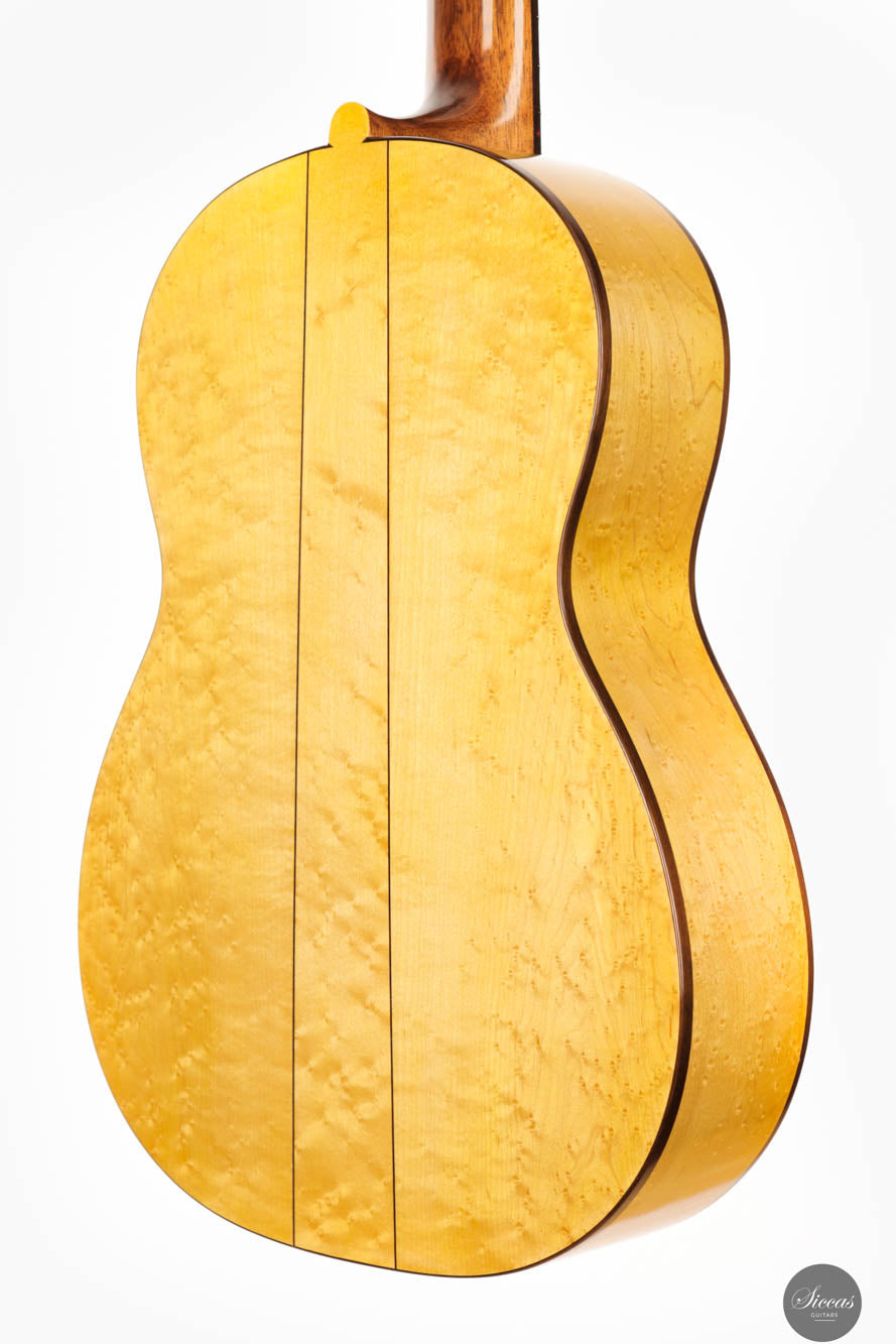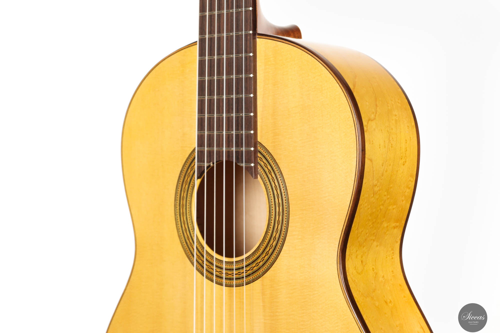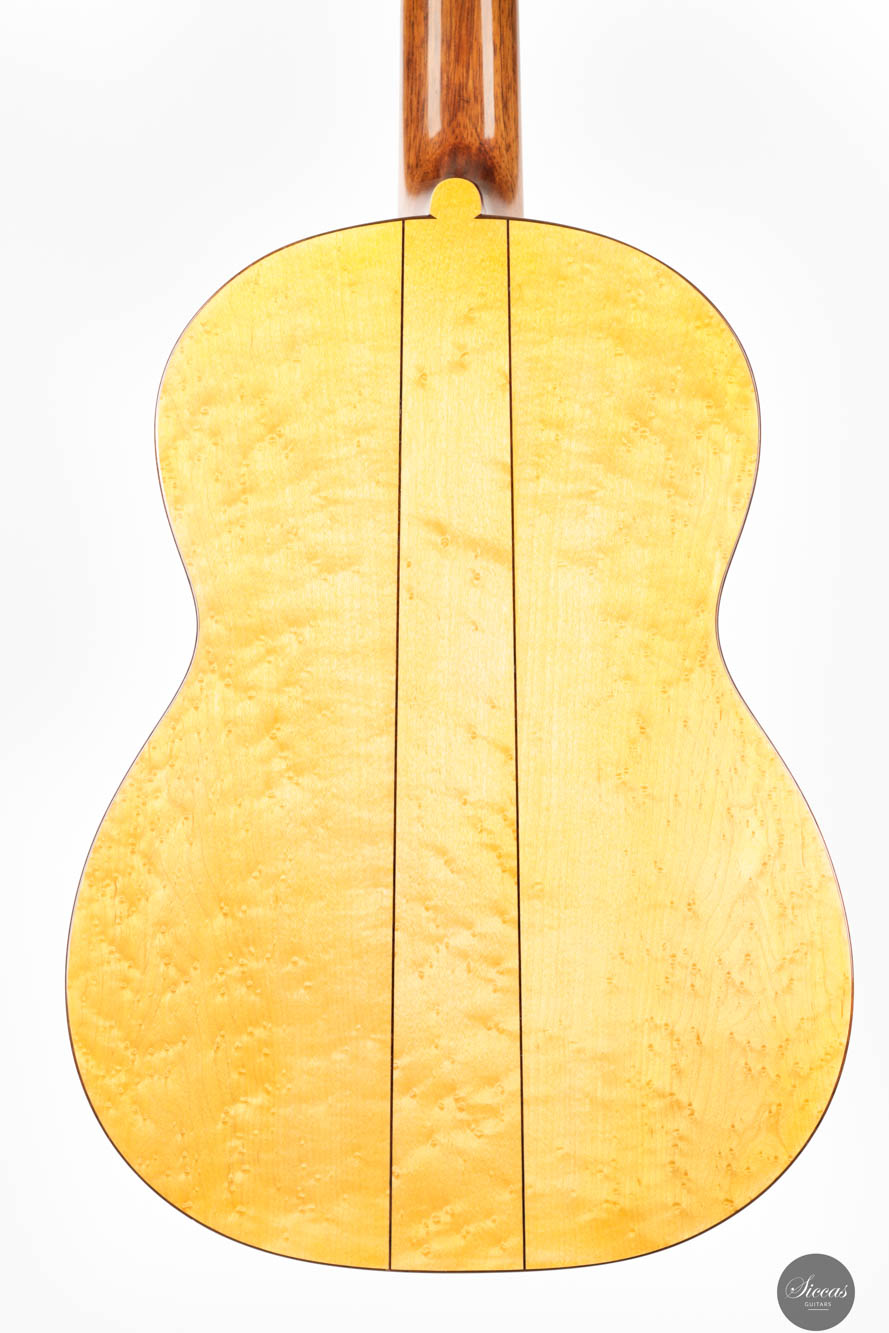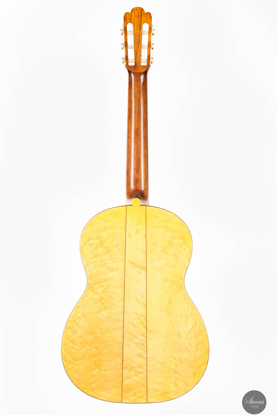 Since 2010, Marco Bortolozzo has distinguished himself in the craft of building traditional classical guitars, demonstrating remarkable skill from the outset. His creation, guitar numbered 66, draws inspiration from the iconic Antonio de Torres FE09, mirroring its historic template and decorative style. The FE09 model, renowned for being the favored guitar of Miguel Llobet, represents a pinnacle in classical guitar design, known for its profound musical expression and aesthetic beauty. Marco's homage to this tradition is evident in instrument 66, which stands out not only for its faithful adherence to the FE09's design principles but also for its exceptional craftsmanship. This guitar features a visually stunning three-piece bird's-eye maple back, alongside the finest selection of woods for its construction. The addition of Alessi tuners and the inclusion of a Hiscox Pro II case further underscore the premium nature of this guitar, making it a significant acquisition for any enthusiast.