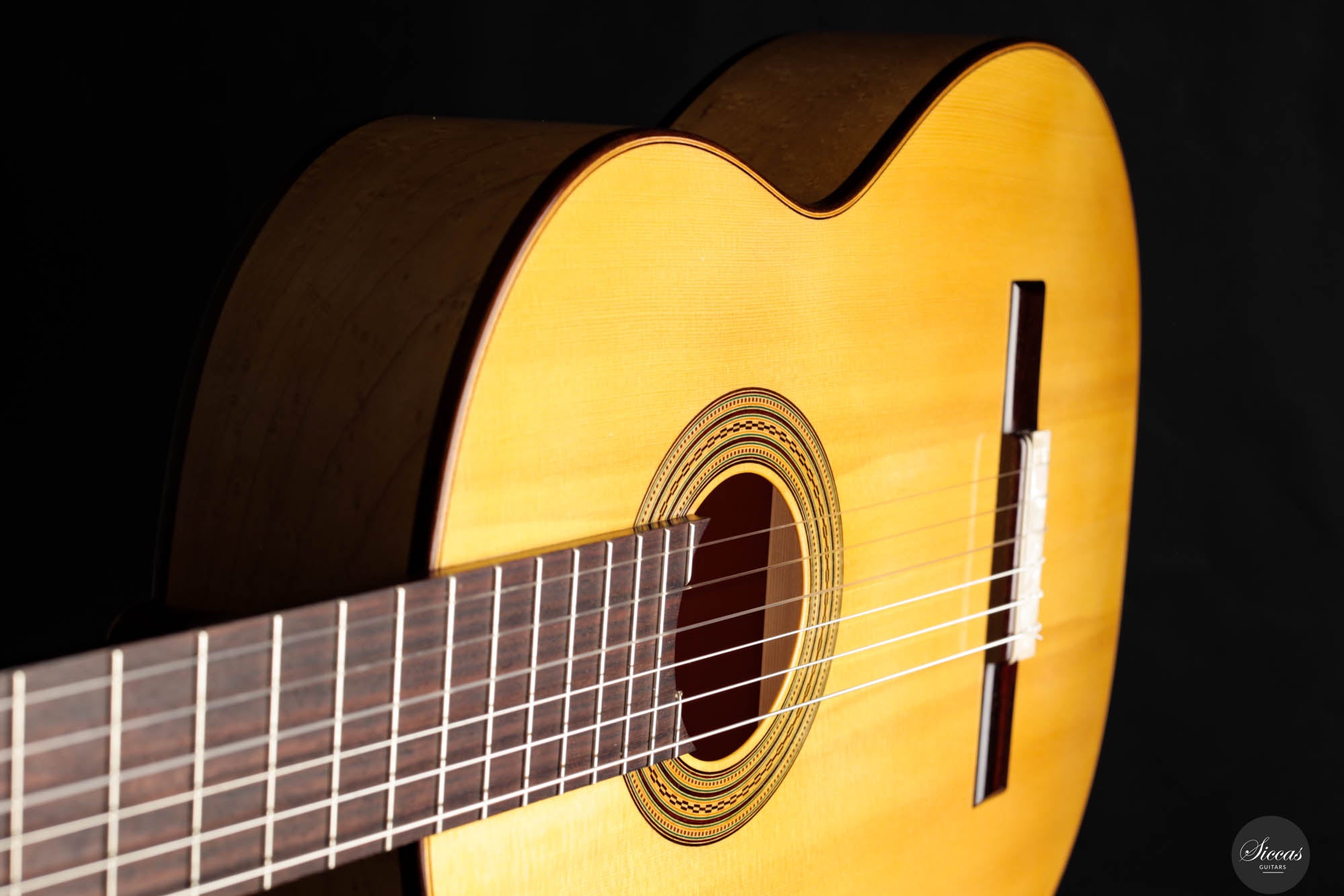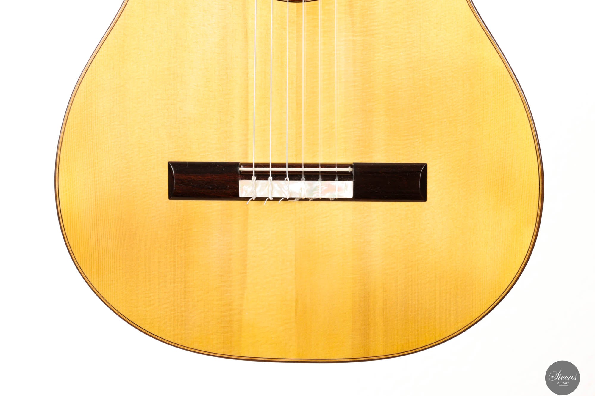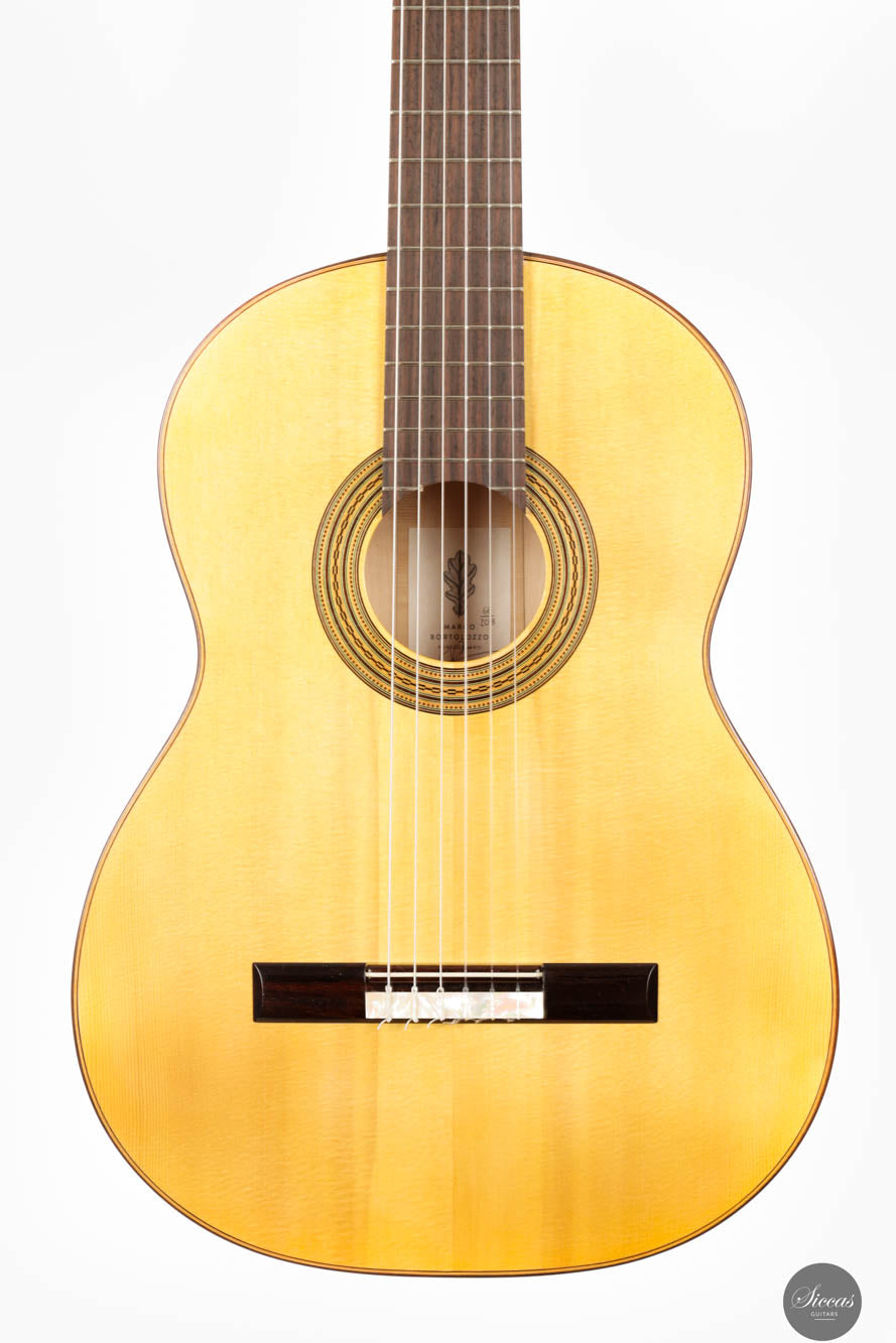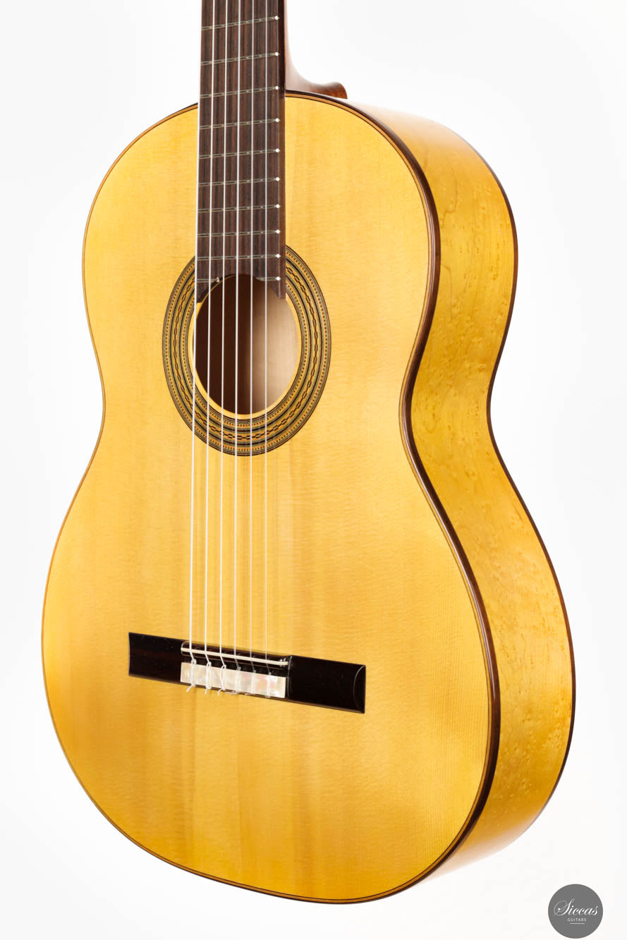 Since 2010, Marco Bortolozzo has distinguished himself in the craft of building traditional classical guitars, demonstrating remarkable skill from the outset. His creation, guitar numbered 66, draws inspiration from the iconic Antonio de Torres FE09, mirroring its historic template and decorative style. The FE09 model, renowned for being the favored guitar of Miguel Llobet, represents a pinnacle in classical guitar design, known for its profound musical expression and aesthetic beauty. Marco's homage to this tradition is evident in instrument 66, which stands out not only for its faithful adherence to the FE09's design principles but also for its exceptional craftsmanship. This guitar features a visually stunning three-piece bird's-eye maple back, alongside the finest selection of woods for its construction. The addition of Alessi tuners and the inclusion of a Hiscox Pro II case further underscore the premium nature of this guitar, making it a significant acquisition for any enthusiast.