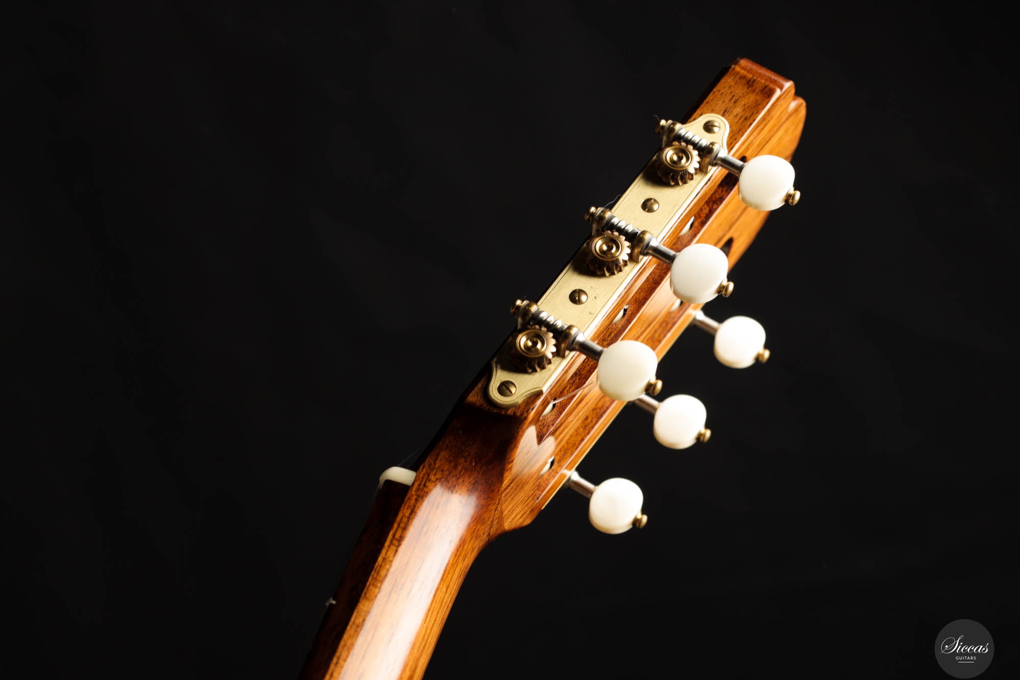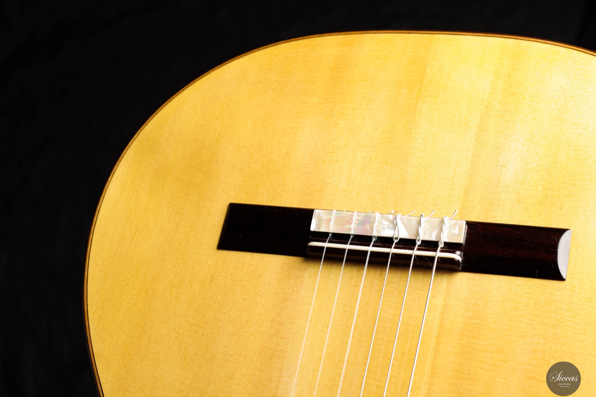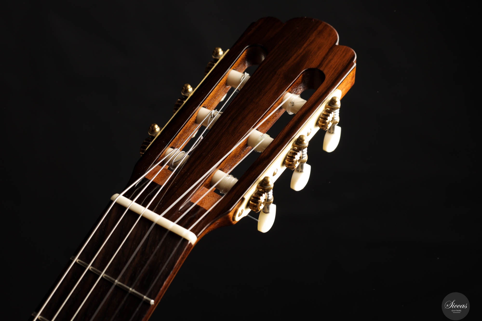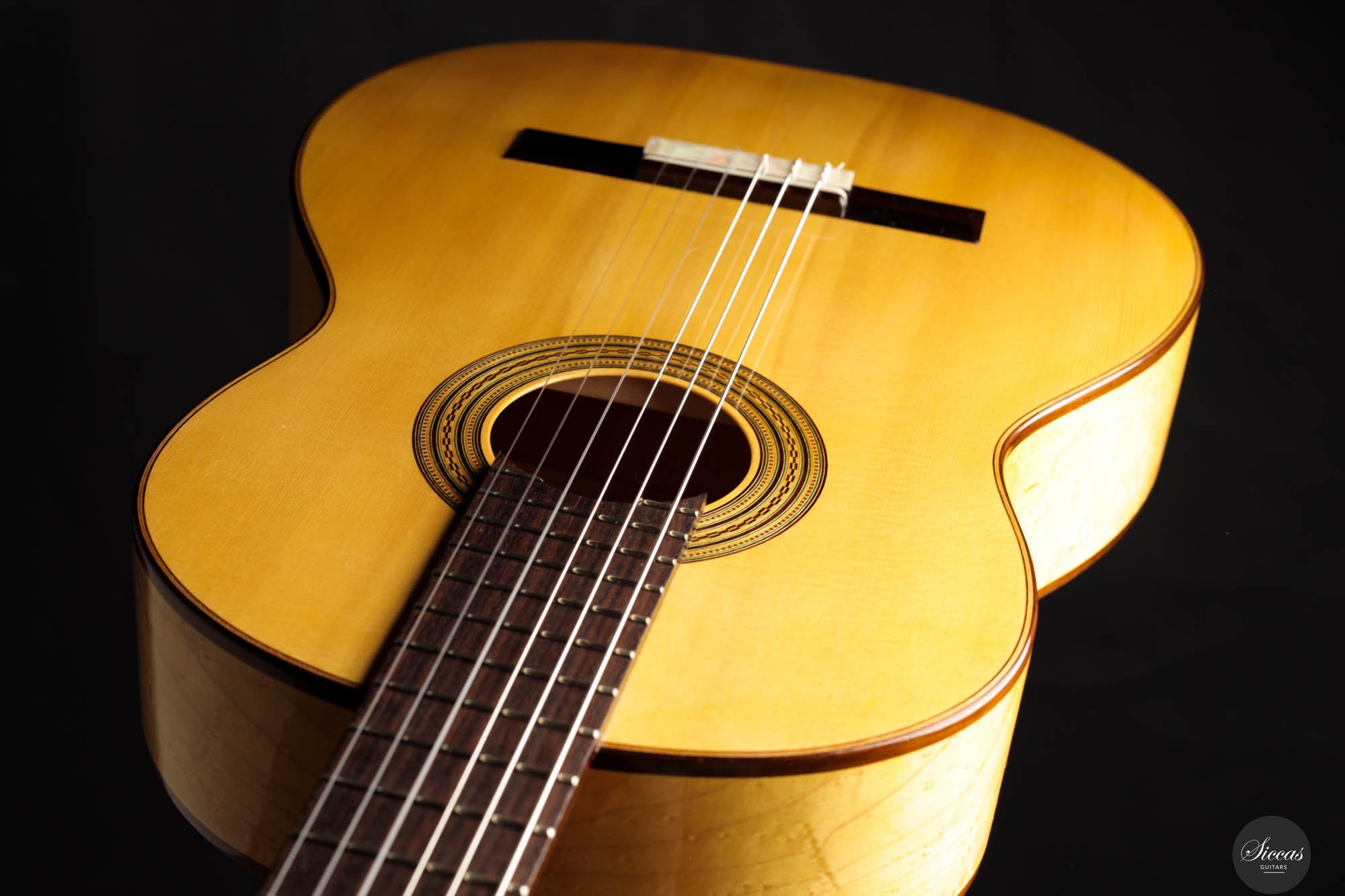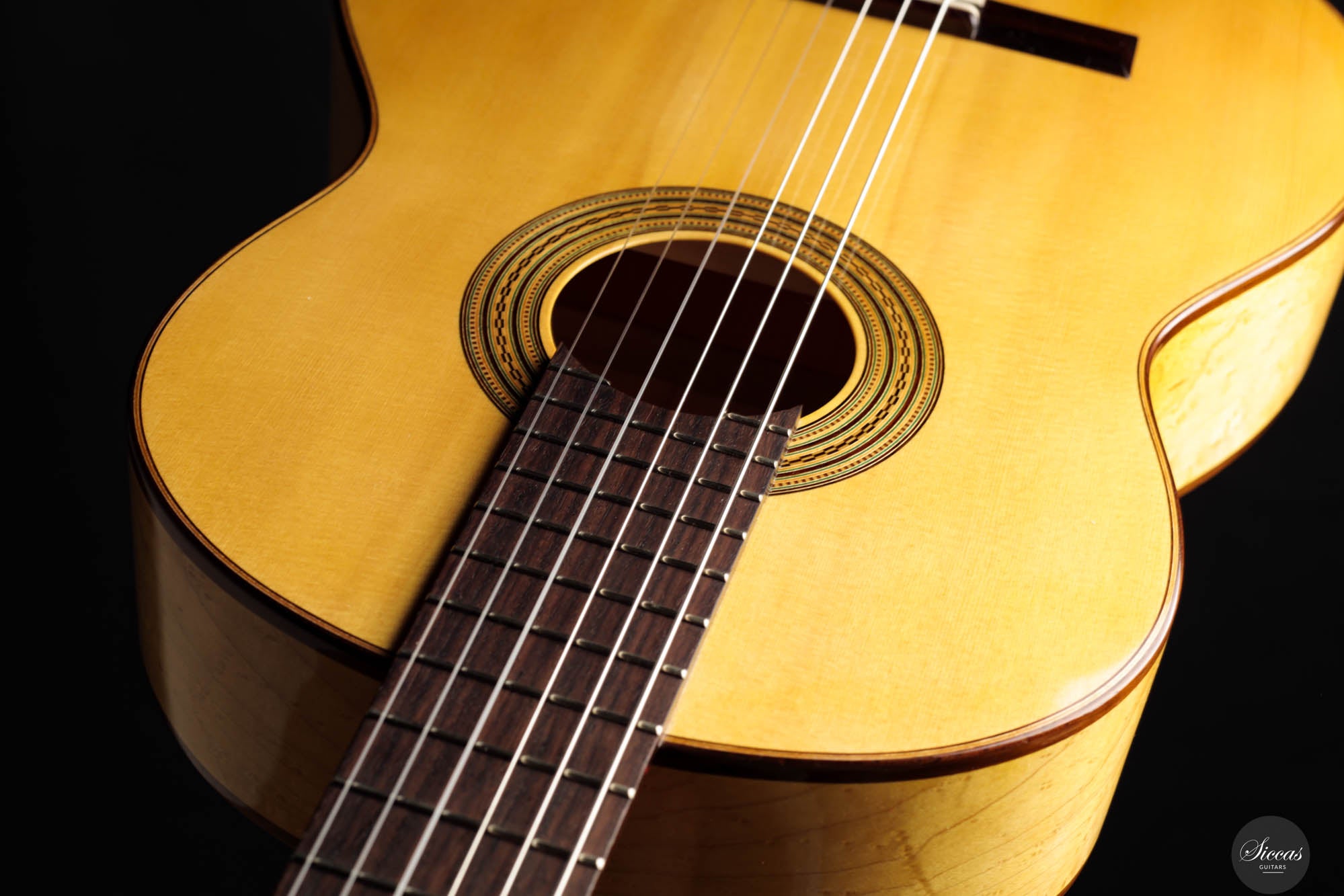 Since 2010, Marco Bortolozzo has distinguished himself in the craft of building traditional classical guitars, demonstrating remarkable skill from the outset. His creation, guitar numbered 66, draws inspiration from the iconic Antonio de Torres FE09, mirroring its historic template and decorative style. The FE09 model, renowned for being the favored guitar of Miguel Llobet, represents a pinnacle in classical guitar design, known for its profound musical expression and aesthetic beauty. Marco's homage to this tradition is evident in instrument 66, which stands out not only for its faithful adherence to the FE09's design principles but also for its exceptional craftsmanship. This guitar features a visually stunning three-piece bird's-eye maple back, alongside the finest selection of woods for its construction. The addition of Alessi tuners and the inclusion of a Hiscox Pro II case further underscore the premium nature of this guitar, making it a significant acquisition for any enthusiast.