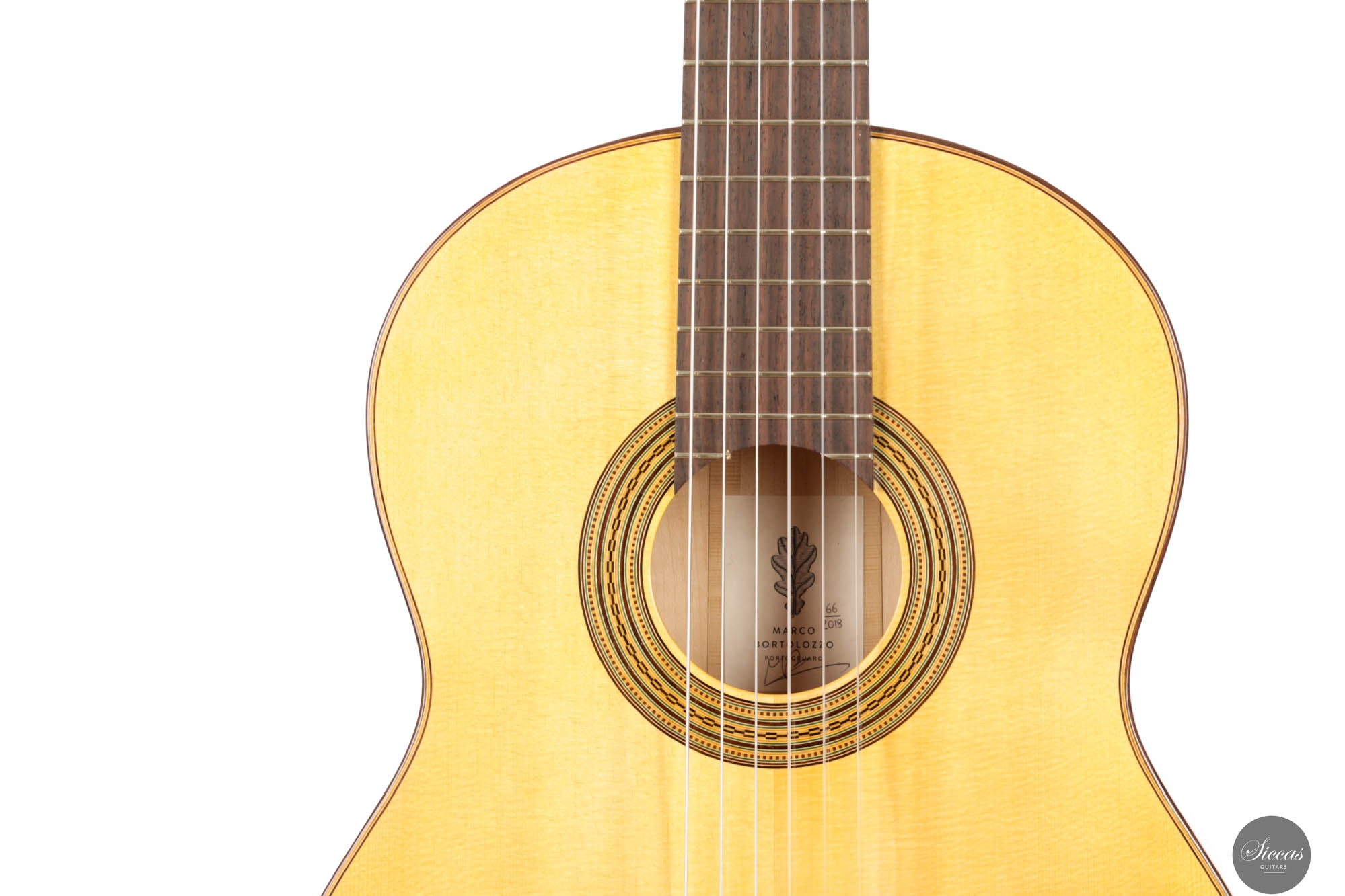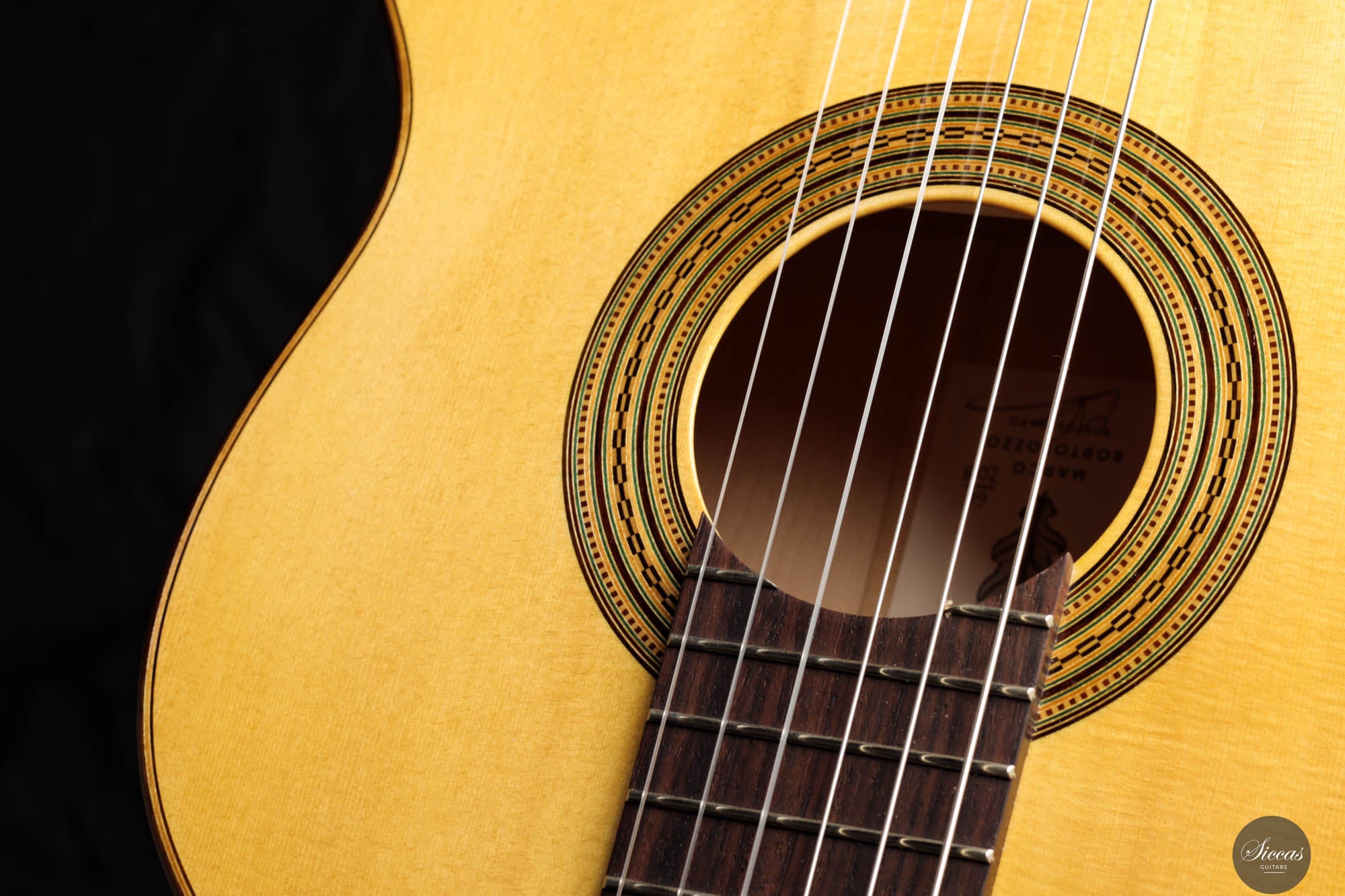 The sonic characteristics of this Marco Bortolozzo guitar are as impressive as its aesthetics. A noteworthy feature is the instrument's exceptionally low air body resonance frequency, tuned to D#, which enriches the basses with a captivating depth and imbues the overall sound with an old-world charm that is rare and highly sought after. This low resonance frequency contributes to the guitar's ability to produce a sound that is both profound and nuanced, offering players a wide dynamic range and expressive possibilities. Additionally, the guitar's lightweight construction and design enhancements make it incredibly easy to play, appealing to both seasoned musicians and those seeking an instrument that facilitates technical agility. The trebles are notably clear and melodious, contributing to an overall sound profile that is both graceful and enchanting. As a pre-loved instrument, this guitar is in a very good condition only showing several playing marks.