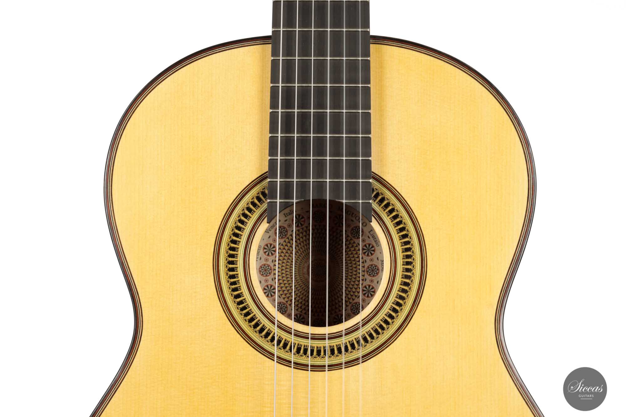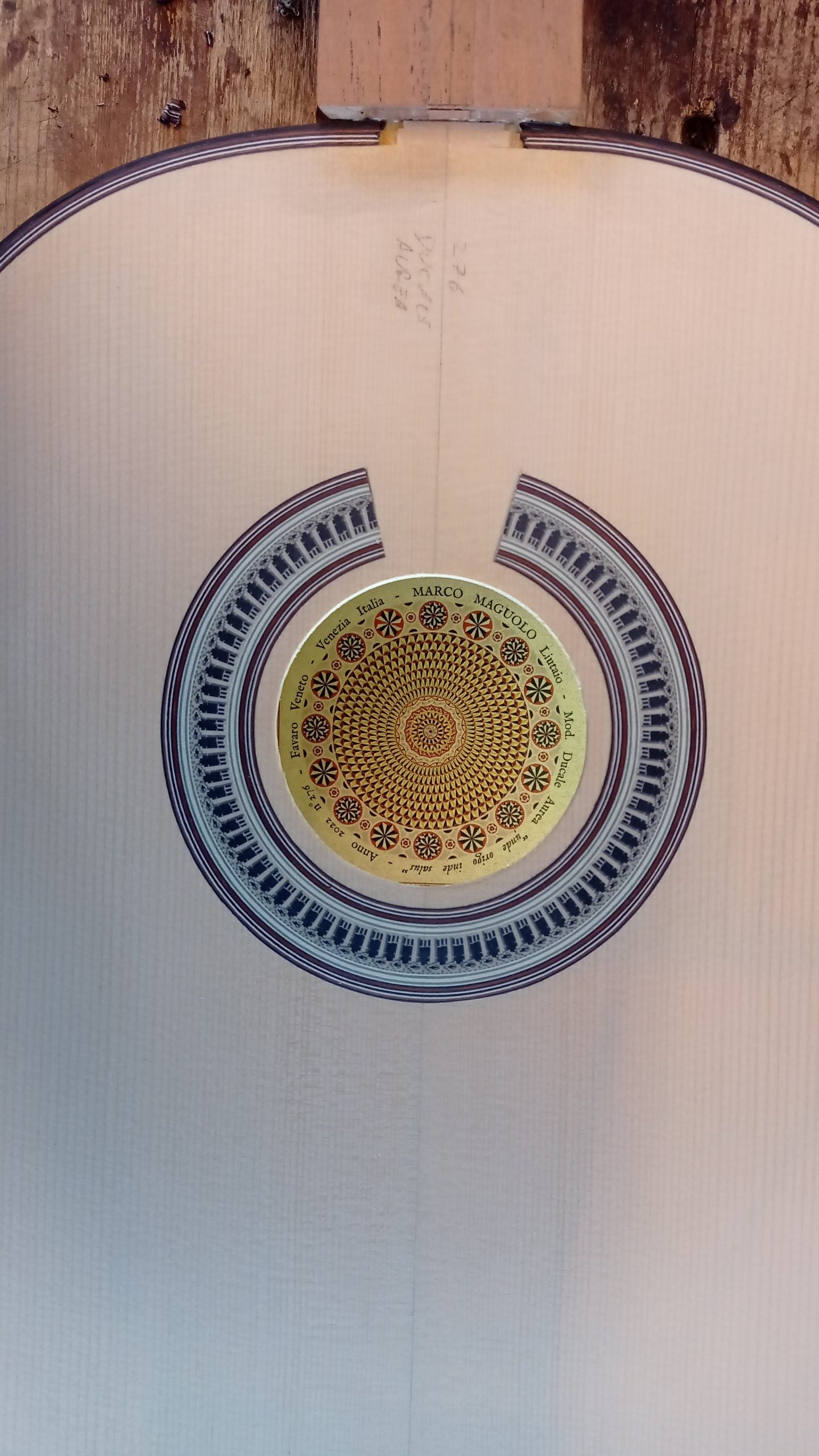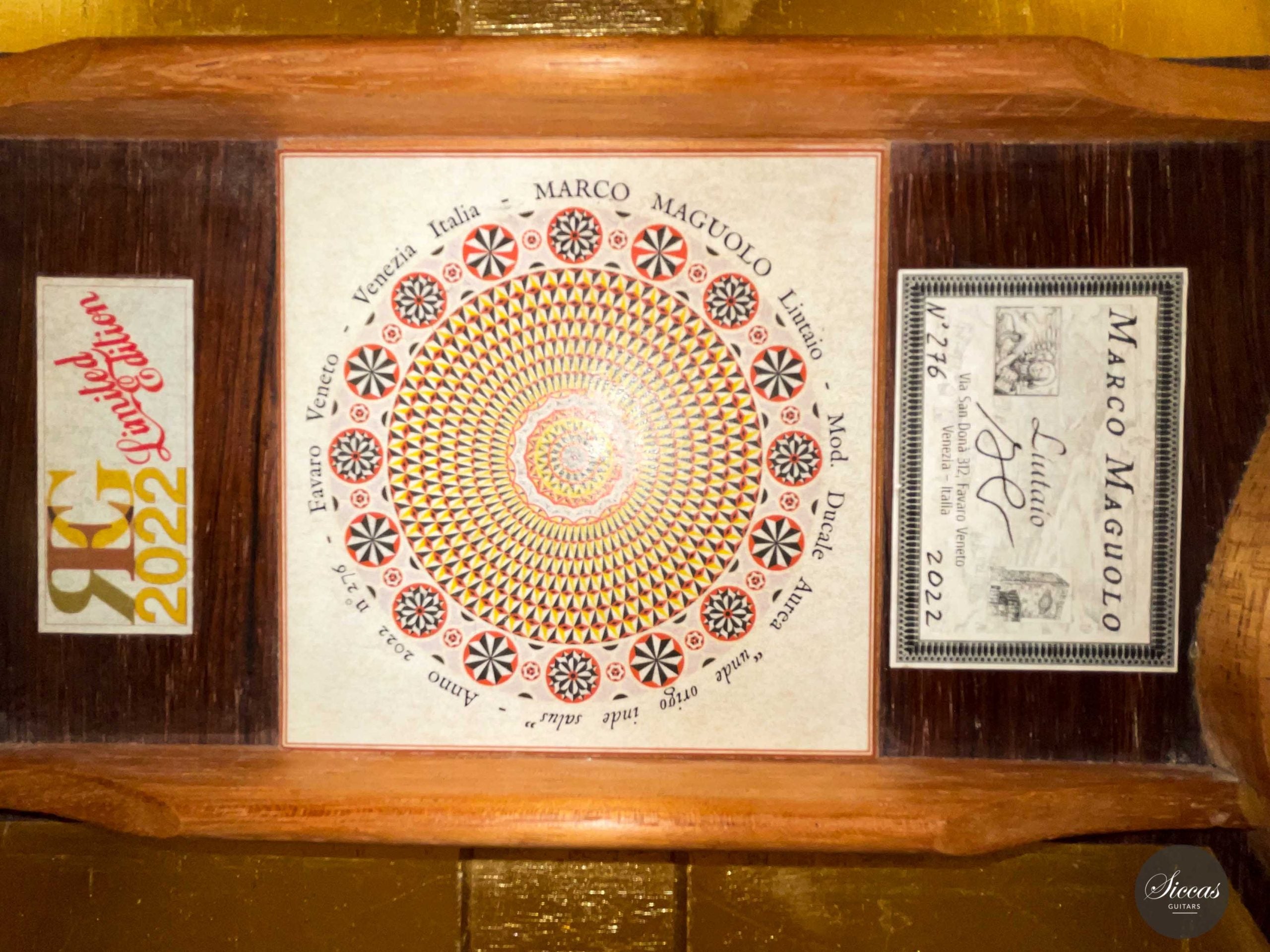 Marco Maguolo's 2022 REG Limited Edition guitar is the third and last of Marco Maguolo's "Ducale Aurea" guitars. This art piece, named "Unde Origo Inde Salus," is dedicated to Venice's "Chiesa della Salute" church. In the centre of the latter's floor, one can find the sentence mentioned above, "Unde Origo Inde Salus" meaning "Salvation comes only from the origin". This church was built from 1631 to 1687 to celebrate the end of the bubonic plague pandemic in Venice, and this instrument is Marco Maguolo's message of hope for an ending time of the COVID pandemic period. It is interesting to note that the label represents the church's floor and was designed by the guitar teacher and architect Marco Costa. Looking from the sound hole, it seems like one looks down to the floor from the dome. One of Marco Maguolo's masterpiece's most striking features is that the instrument's inside is covered in gold leaves, matching the golden dome of the St Mark's Basilica in Venice. This unique feature gave its name to this tryptic, three extremely rare and complex instruments, of which this one is the very last, the "Ducale Aurea" guitars.