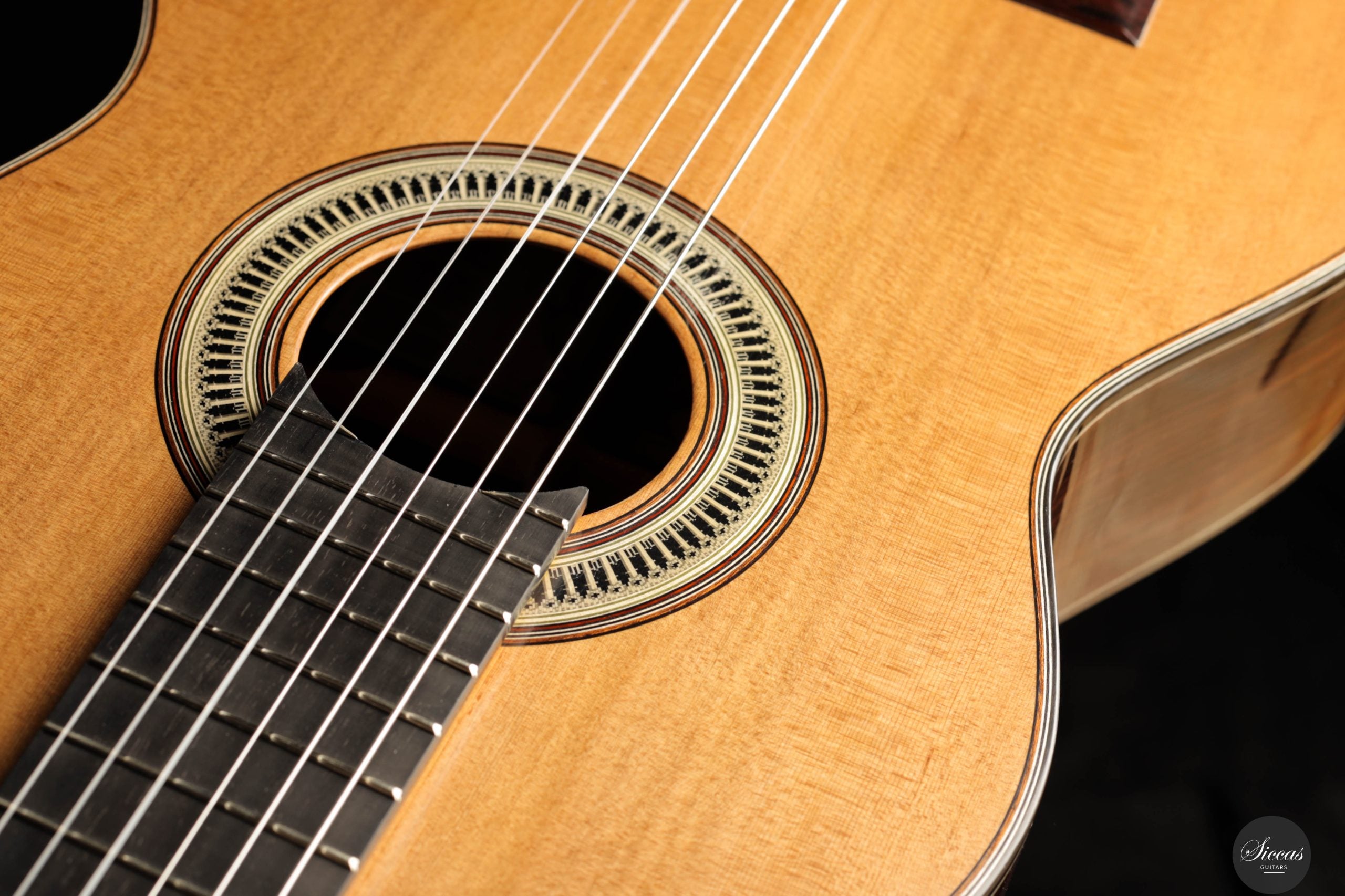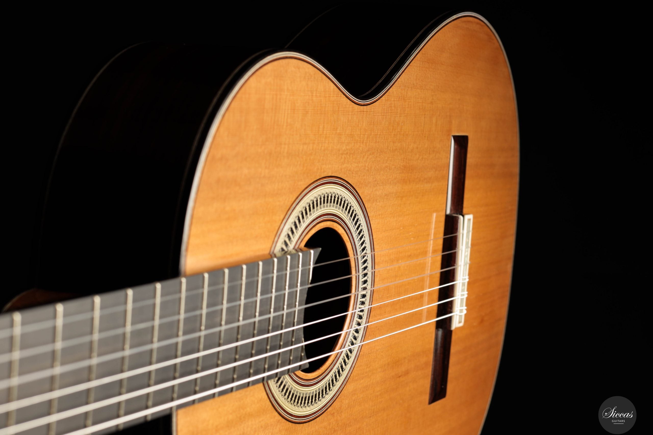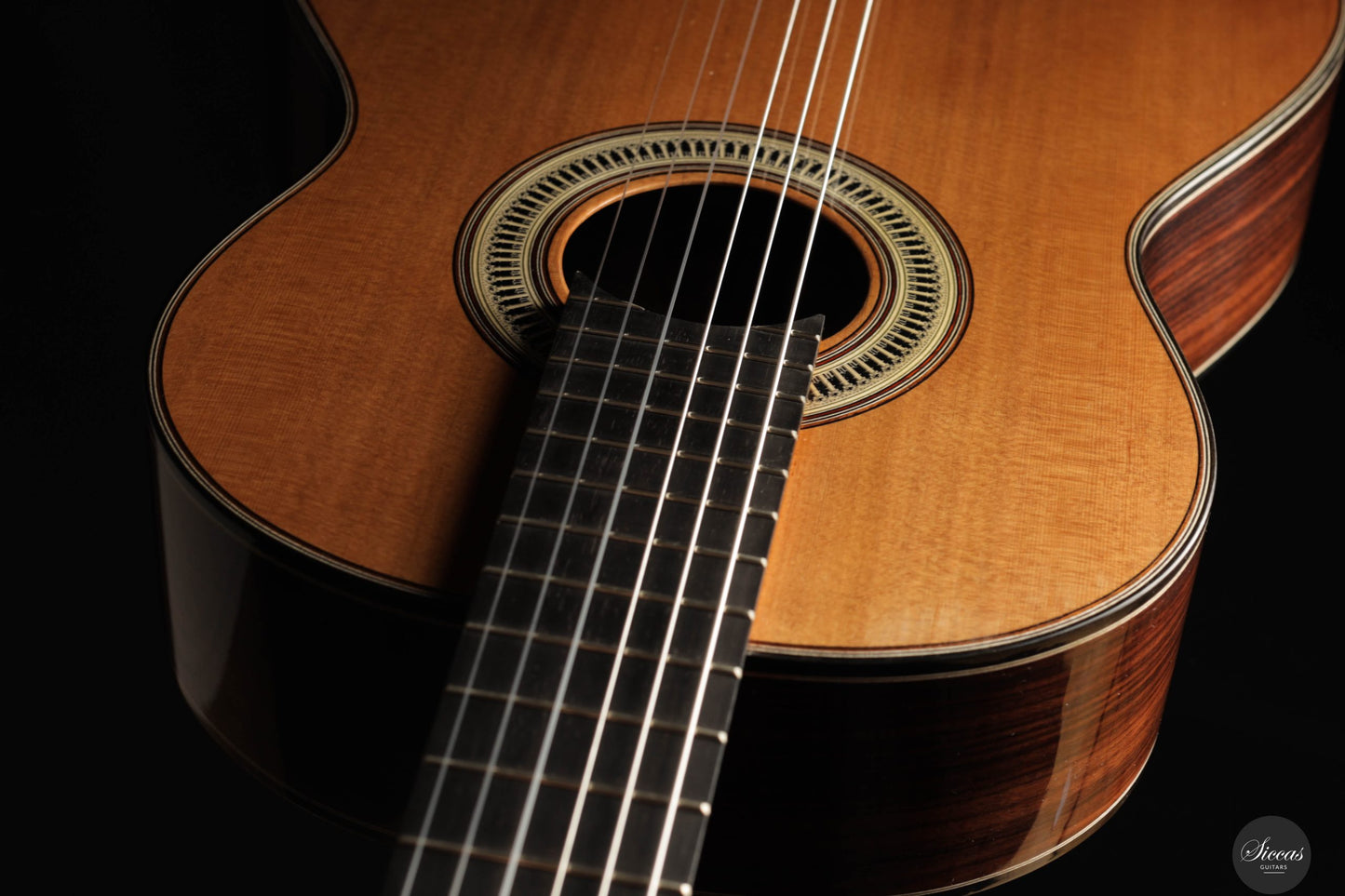 From a luthier’s perspective, the "Ekphrasis" model maintains the traditional qualities of a classical guitar, with masterful craftsmanship and attention to acoustic performance. The soundboard, made using a special antiquing process derived from techniques used in string instruments, gives the wood a beautifully aged appearance while preserving a sparkling brilliance. The overall sound is defined by rich harmonic complexity, with silky, woody notes that give the guitar a serious and solemn character.