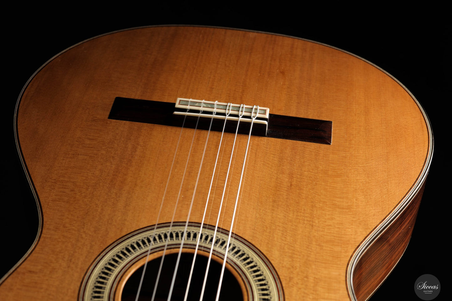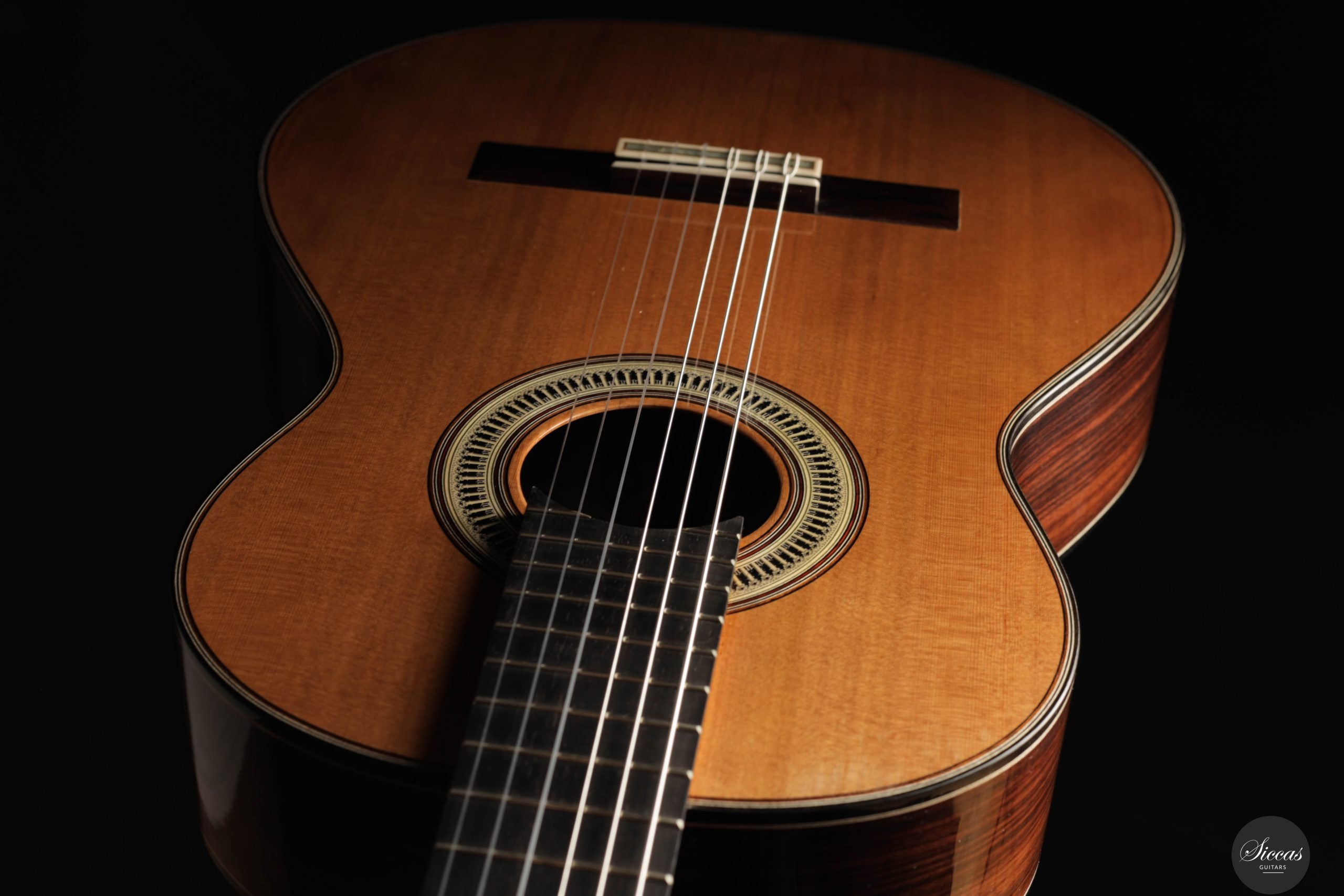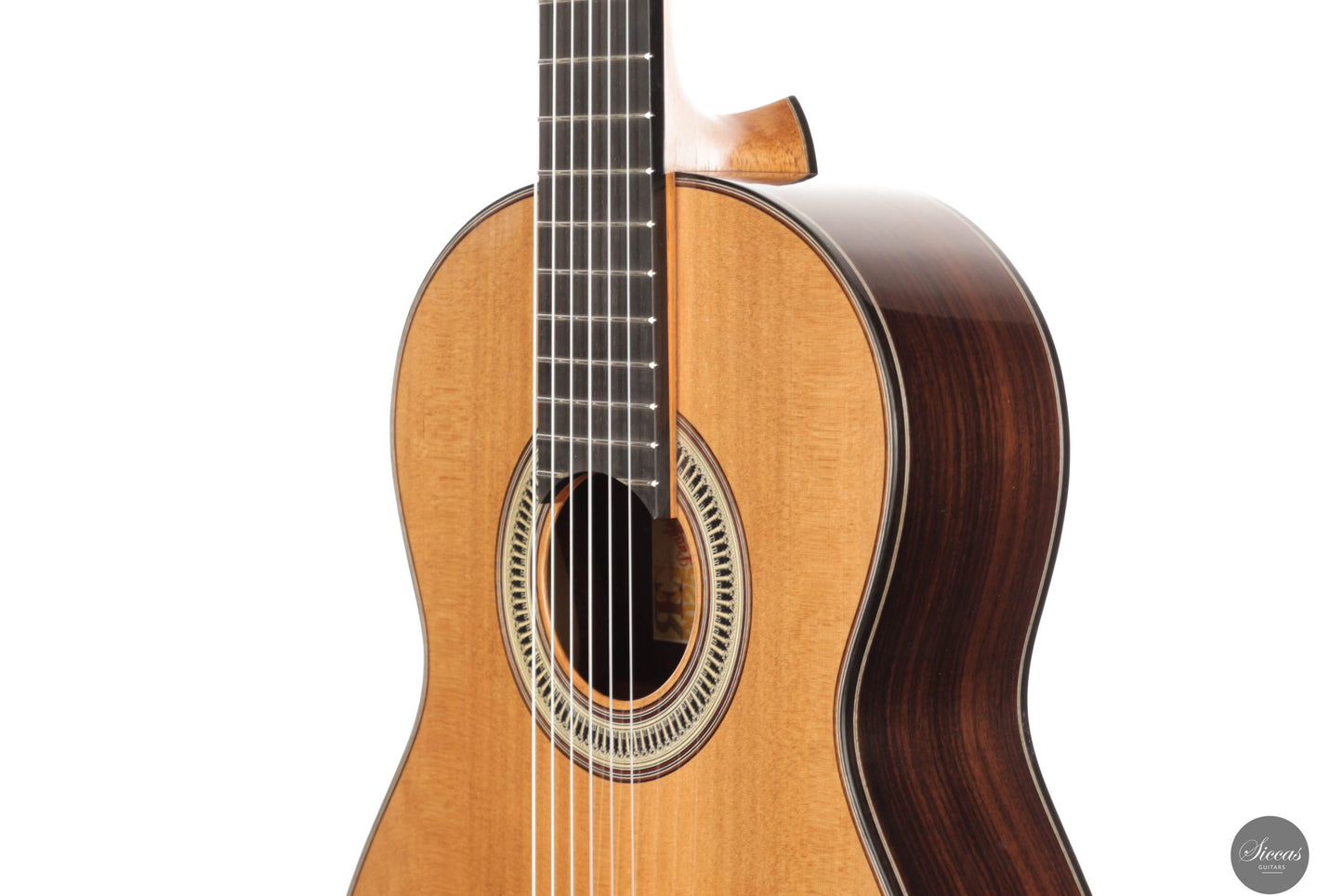 From a luthier’s perspective, the "Ekphrasis" model maintains the traditional qualities of a classical guitar, with masterful craftsmanship and attention to acoustic performance. The soundboard, made using a special antiquing process derived from techniques used in string instruments, gives the wood a beautifully aged appearance while preserving a sparkling brilliance. The overall sound is defined by rich harmonic complexity, with silky, woody notes that give the guitar a serious and solemn character.