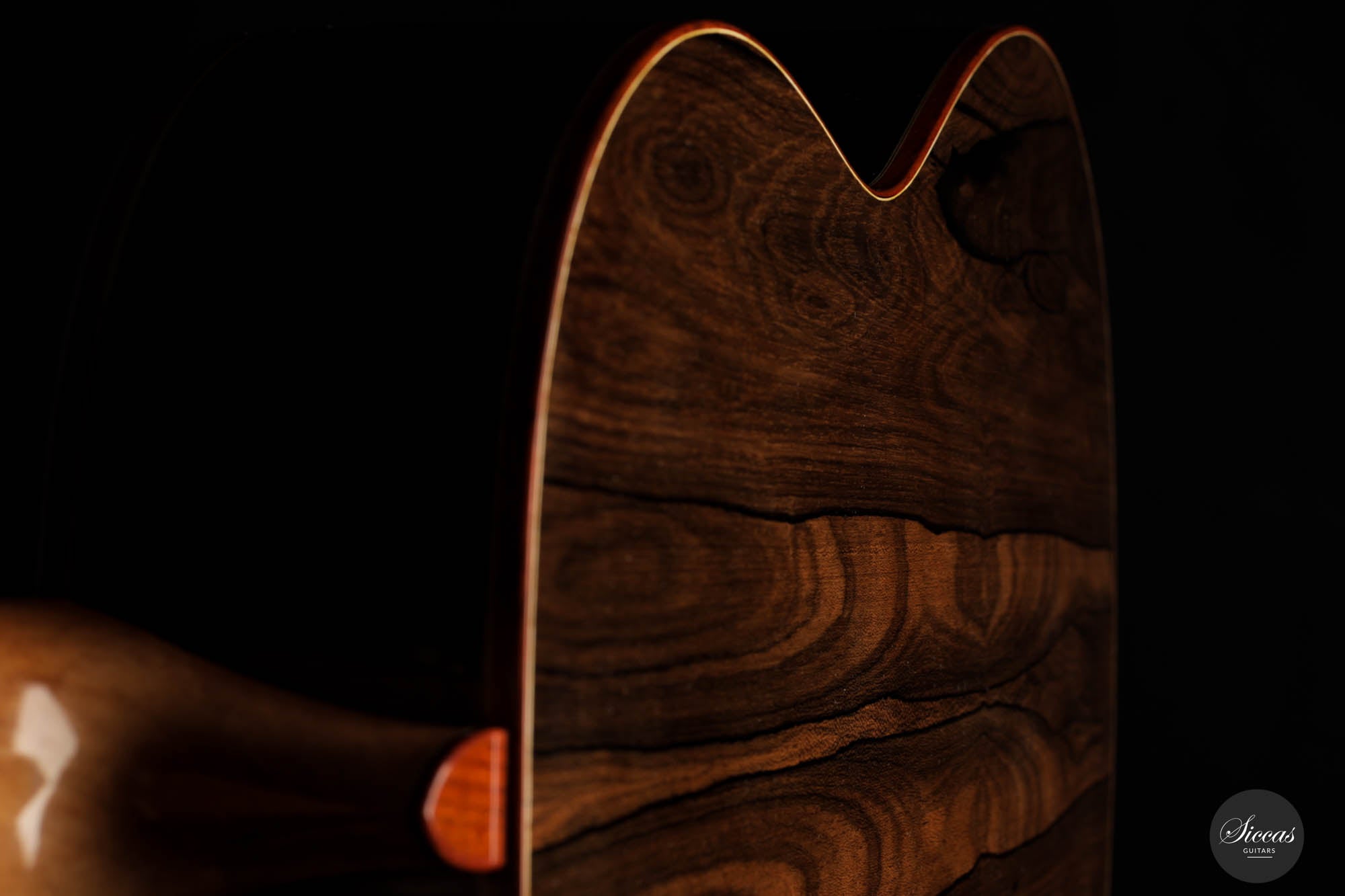 “Over time, I have refined my visual and acoustic perception. I build each guitar one by one in order to work on them as a whole. I use traditional construction methods inspired by the great masters such as Fleta, Friederich, and Bouchet. The combination of the soundboard with the back and sides, according to the different densities, is carefully thought out. I also pay a lot of attention to aesthetic research in the marriage of colors or the composition of the rosettes.