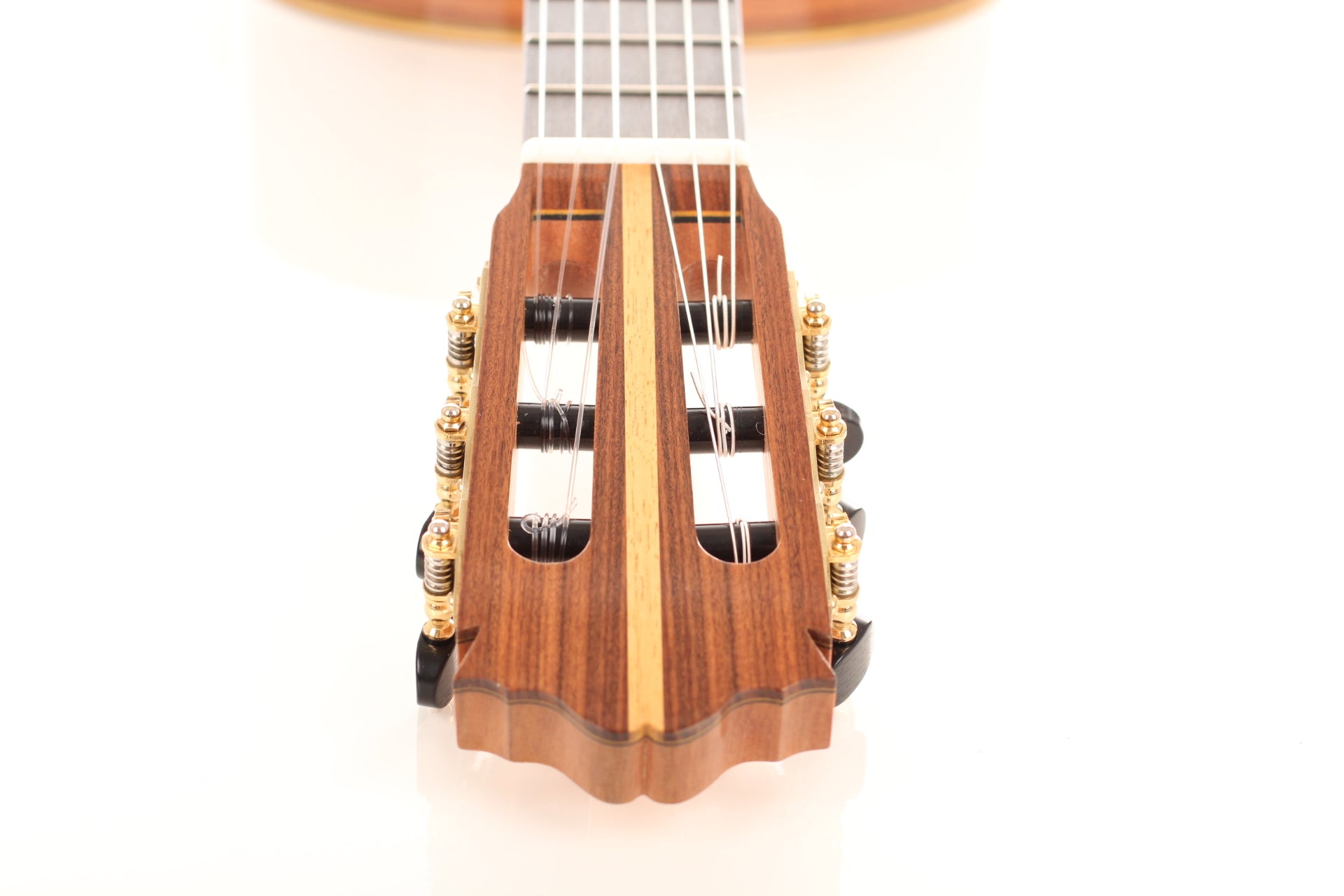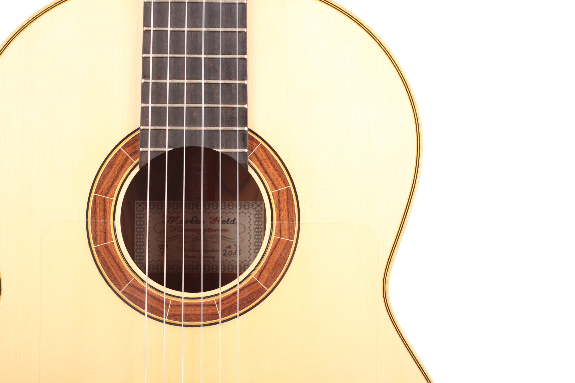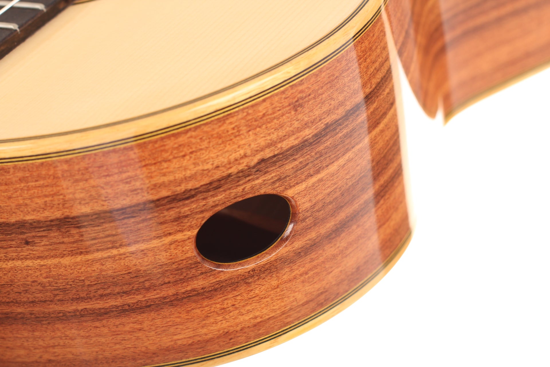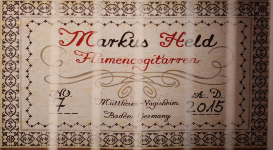 Markus Held was born in 1973 in Heidenheim, Germany. At the age of seven he started to play classical guitar. Since ten years he builds traditional Spanish classical and flamenco guitars. Today he lives in the south of Germany (Müllheim-Vögisheim) where he has also his workshop. His guitars have a very powerful sound, strong basses and the voices have a very good separation. The top of this guitar is made of spruce, back and sides are made of Pao Ferro. A special feature is the soundport in the upper bout sides near the heel that increases the air flow through the body which lets the soundboard move more freely. These hole not only increase the presence of the sound for the player but also add to the volume, clarity, openness and depth for the listener. All French-polished. A hardshell case is included.
