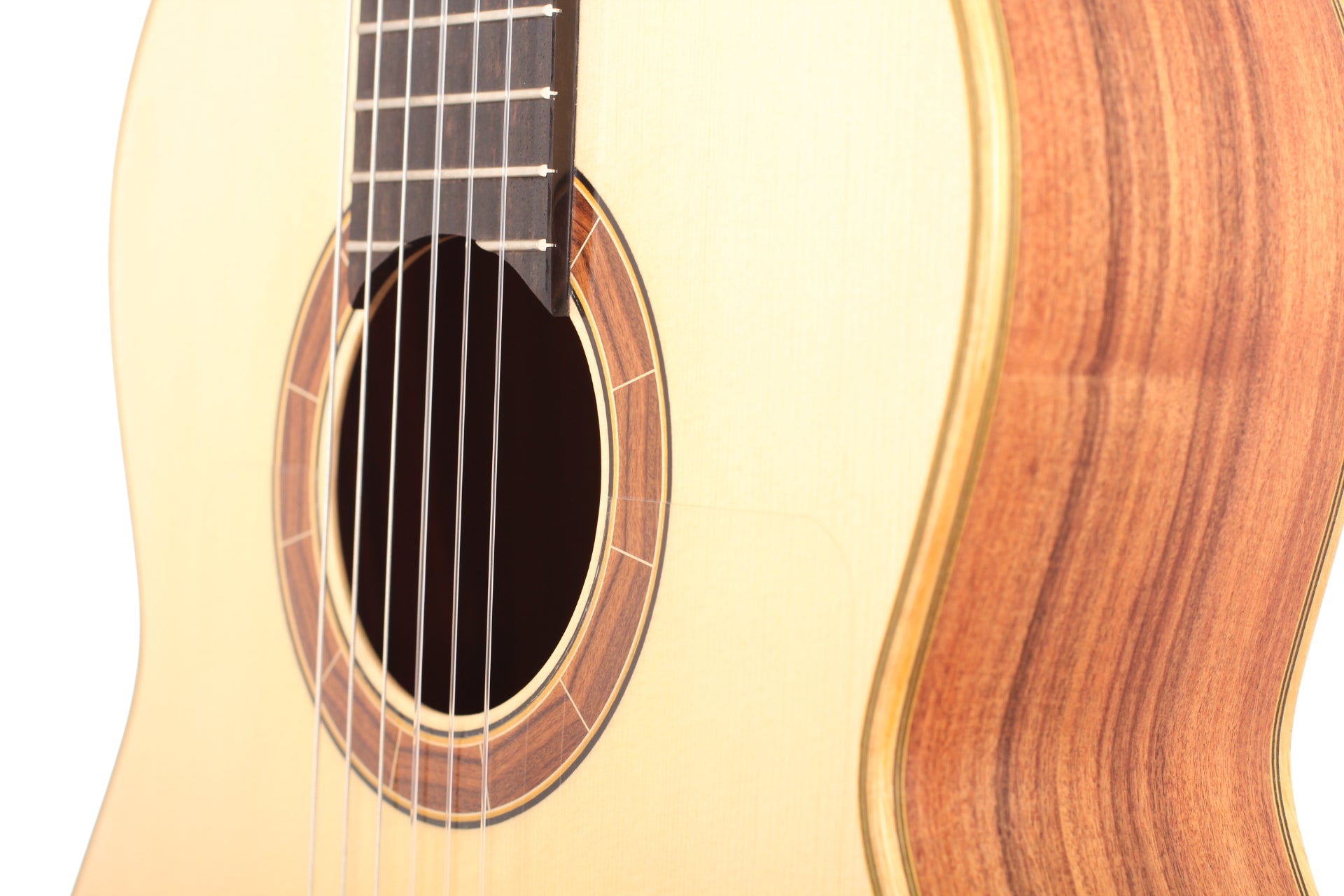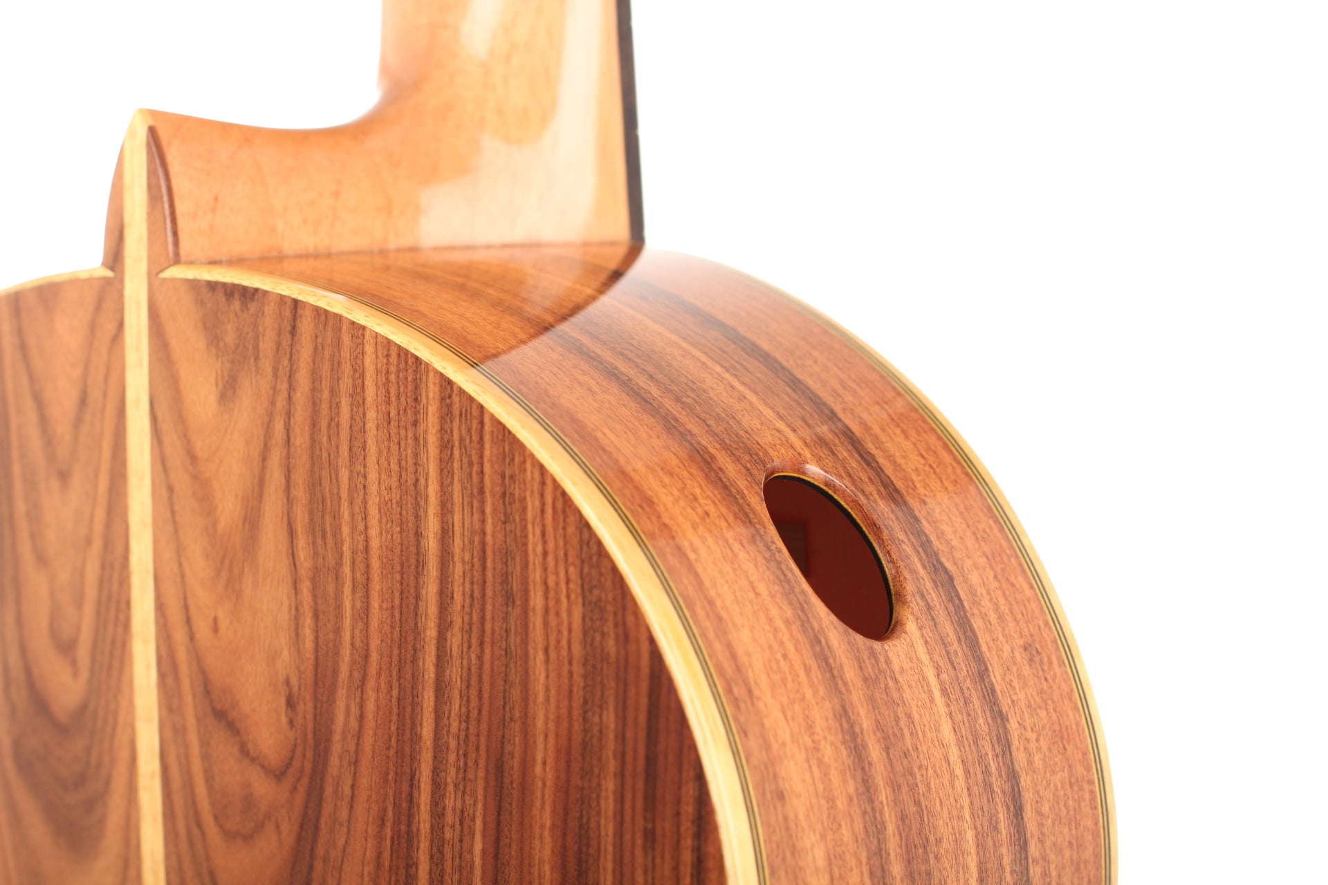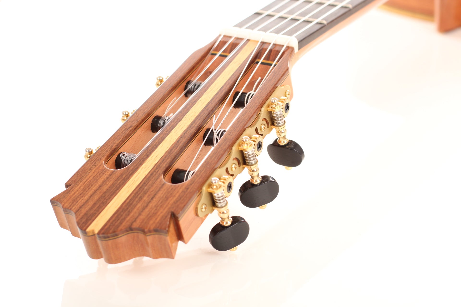 Markus Held was born in 1973 in Heidenheim, Germany. At the age of seven he started to play classical guitar. Since ten years he builds traditional Spanish classical and flamenco guitars. Today he lives in the south of Germany (Müllheim-Vögisheim) where he has also his workshop. His guitars have a very powerful sound, strong basses and the voices have a very good separation. The top of this guitar is made of spruce, back and sides are made of Pao Ferro. A special feature is the soundport in the upper bout sides near the heel that increases the air flow through the body which lets the soundboard move more freely. These hole not only increase the presence of the sound for the player but also add to the volume, clarity, openness and depth for the listener. All French-polished. A hardshell case is included.