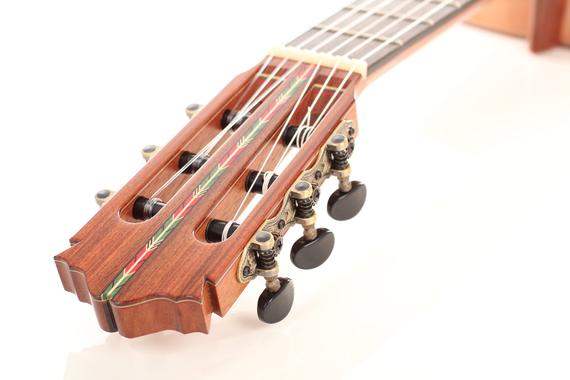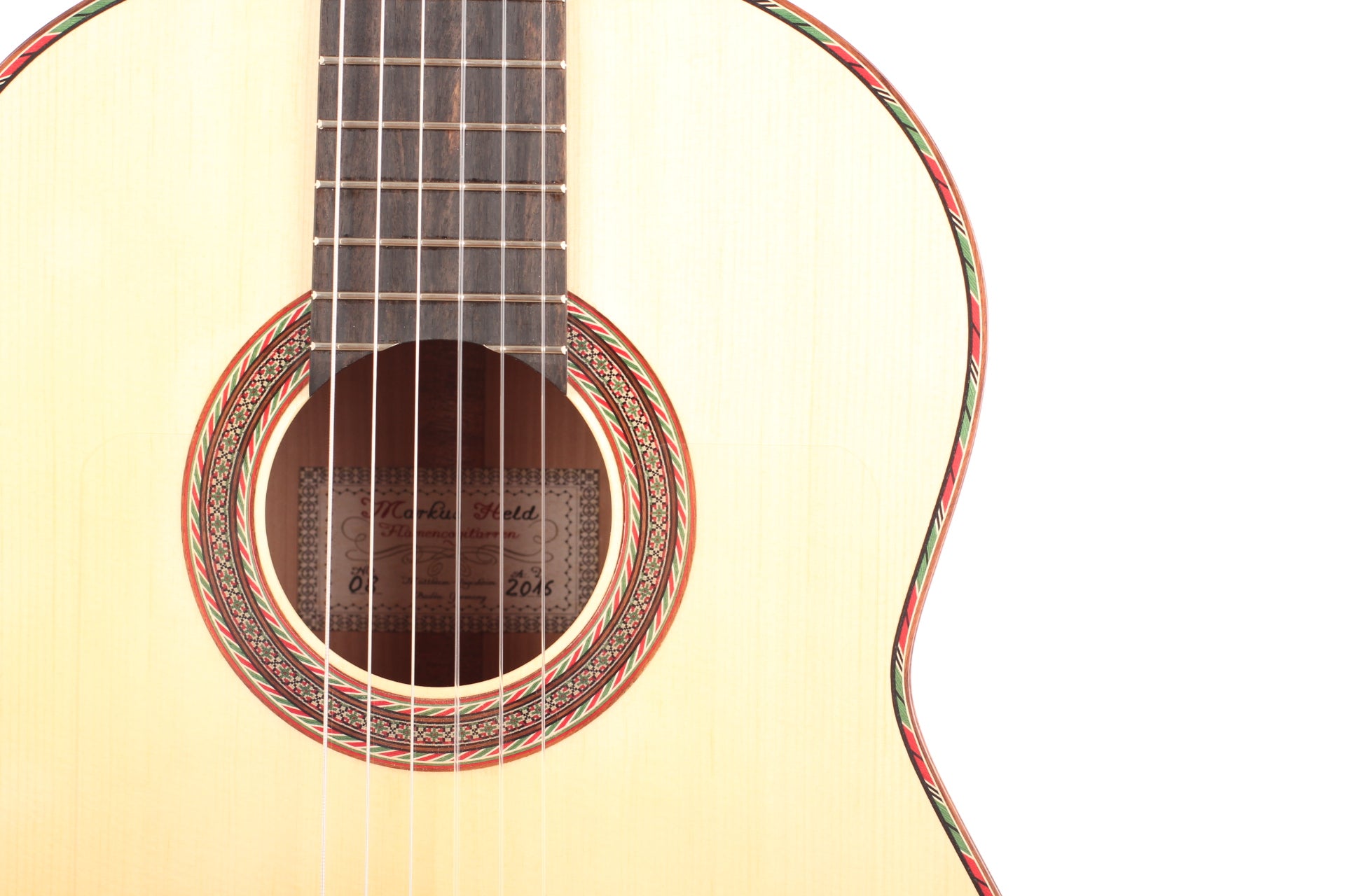 Markus Held was born in 1973 in Heidenheim, Germany. At the age of seven he started to play classical guitar. Since ten years he builds traditional Spanish classical and flamenco guitars. Today he lives in the south of Germany (Müllheim-Vögisheim) where he has also his workshop. His guitars have a very powerful sound, strong basses and the voices have a very good separation. The top of this guitar is made of spruce, back and sides are made of service tree (Sorbus domestica). All French-polished. A hardshell case is included.