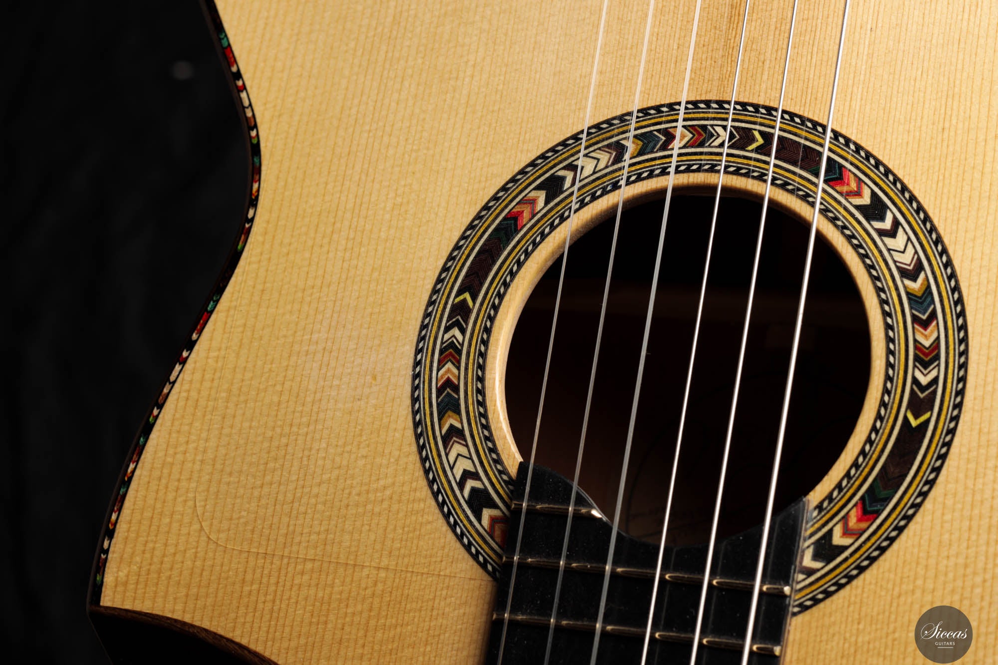 The Lattice Soulcut guitar represents a pinnacle of contemporary guitar design, blending traditional craftsmanship with innovative materials and techniques. With a scale length of 650mm and a neck width of 52mm, it offers a classic feel that accommodates both intricate fingerstyle playing and bold strumming. The body is crafted from Elsbeere (Swiss pearwood), a choice that's as unique as it is visually striking, providing a distinct tonal character that complements the guitar's overall design. The top features thermo-treated spruce with lattice bracing, a technique that enhances the instrument's resonance and projection, giving it a powerful voice that's full of clarity and depth.