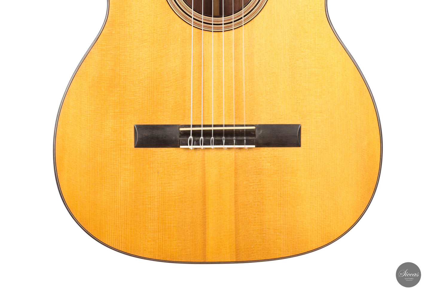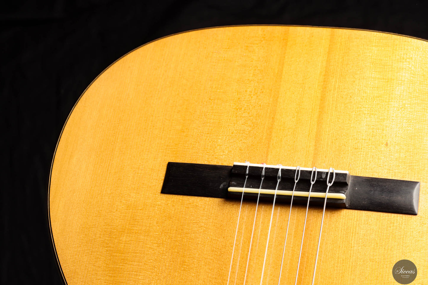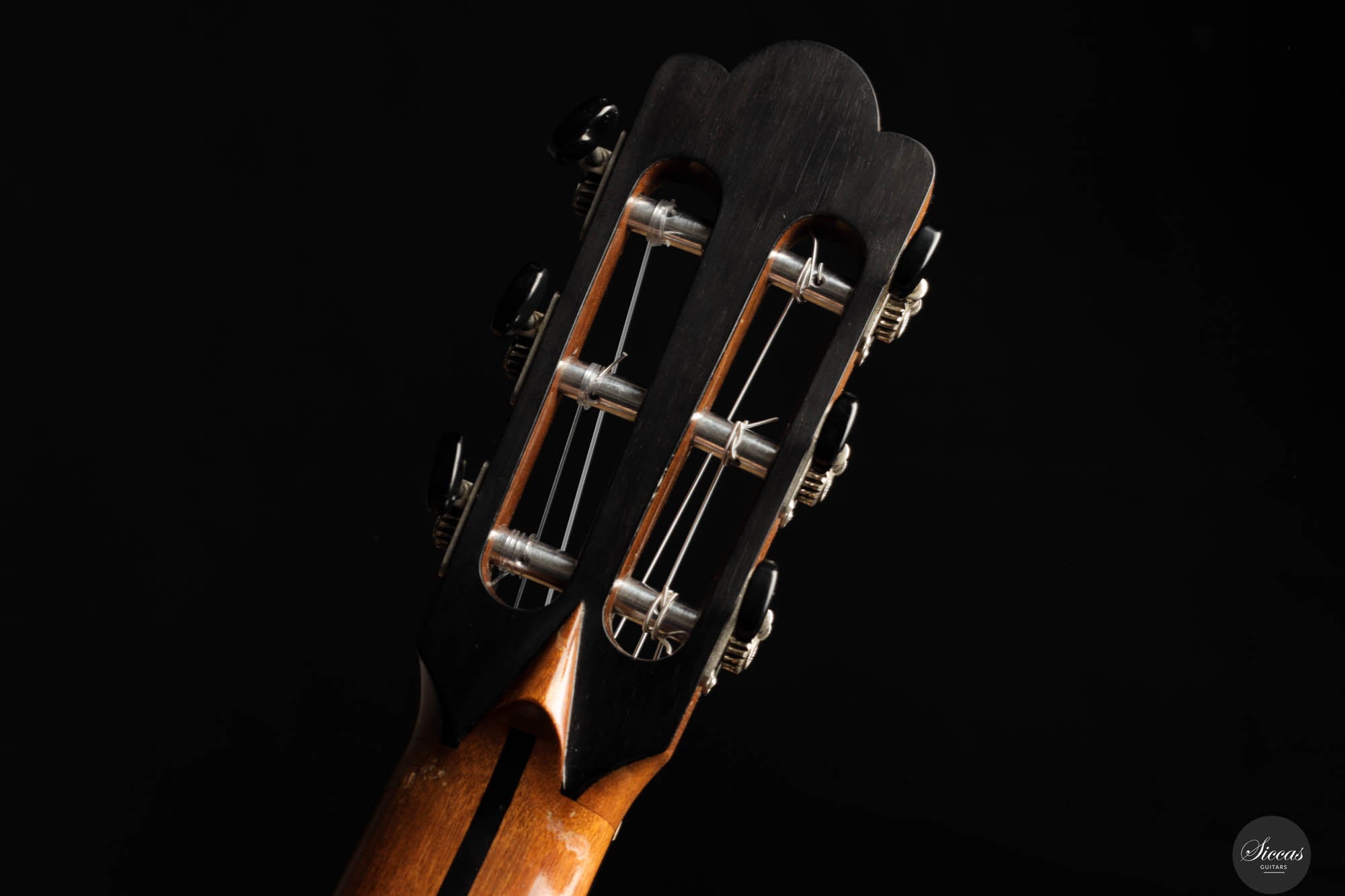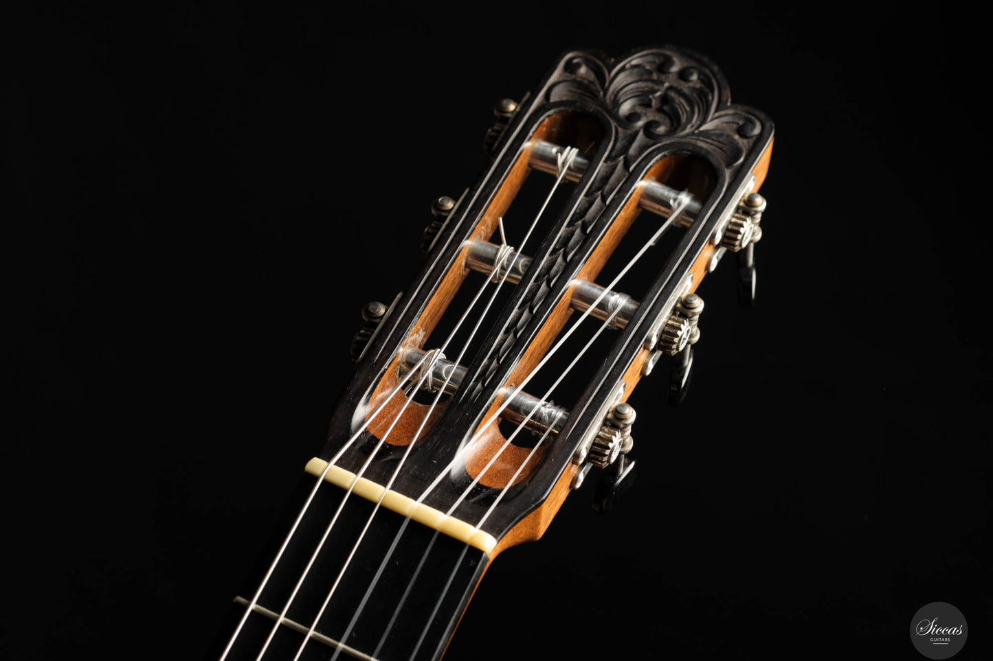 This beautiful guitar was built around 1960 by Martin Jacob. Although it does not bear a label — which is quite common for Weissgerber guitars — there is an ‘MJ’ stamp inside, indicating that the instrument was made for Martin Jacob. A distinctive feature of this guitar is that, in addition to the ‘MJ’ stamp, it also carries the same Weissgerber brand stamp that was used by his father, Richard Jacob Weissgerber. This can be seen as a sign of his artistic emancipation: in terms of construction and sound quality, his guitars are in no way inferior to those of his father. Due to its dimensions and body shape, the guitar is classified as a “Große Spanische Modell,” closely inspired by traditional Spanish guitar design. The instrument was once owned by Maria Jacob, daughter of Martin Jacob, and it remains in excellent condition, with no structural issues. In terms of sound, the guitar delivers dry, punchy, and present basses, while the trebles are clean, clear, and focused. Structurally, the spruce soundboard features four fan bracings, complemented by two V-shaped bars angled outward toward the sides. This unusual yet effective internal bracing contributes to the guitar’s rich resonance and overall stability. A fine example of German craftsmanship with the soul of Spanish guitar tradition—a rare and expressive instrument with both historical and musical value.