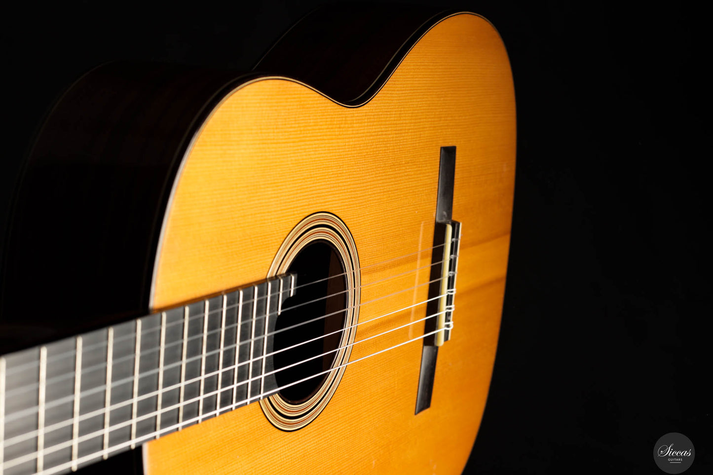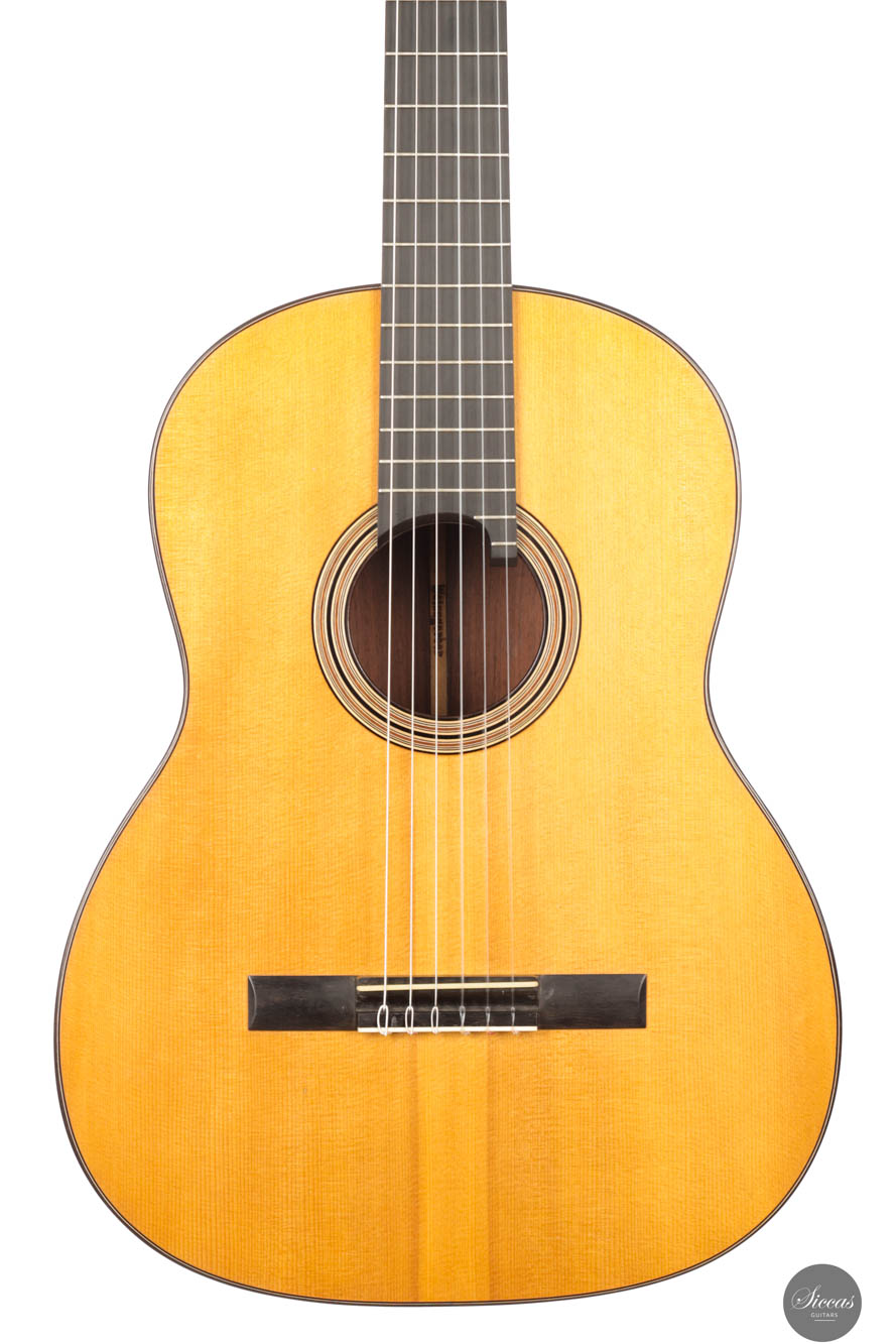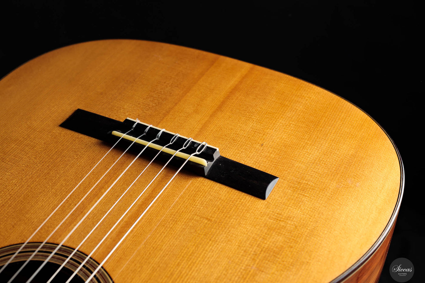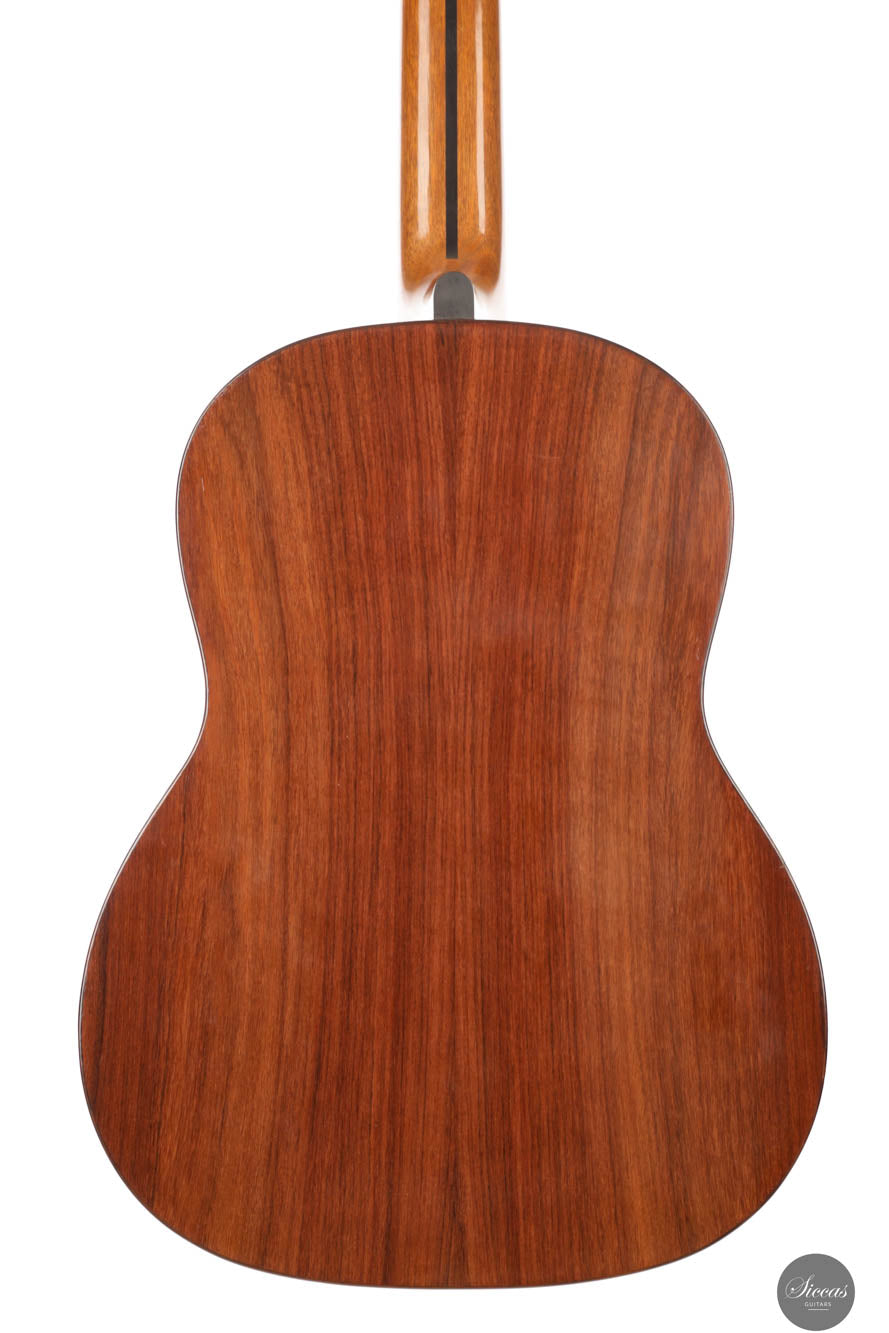 This beautiful guitar was built around 1960 by Martin Jacob. Although it does not bear a label — which is quite common for Weissgerber guitars — there is an ‘MJ’ stamp inside, indicating that the instrument was made for Martin Jacob. A distinctive feature of this guitar is that, in addition to the ‘MJ’ stamp, it also carries the same Weissgerber brand stamp that was used by his father, Richard Jacob Weissgerber. This can be seen as a sign of his artistic emancipation: in terms of construction and sound quality, his guitars are in no way inferior to those of his father. Due to its dimensions and body shape, the guitar is classified as a “Große Spanische Modell,” closely inspired by traditional Spanish guitar design. The instrument was once owned by Maria Jacob, daughter of Martin Jacob, and it remains in excellent condition, with no structural issues. In terms of sound, the guitar delivers dry, punchy, and present basses, while the trebles are clean, clear, and focused. Structurally, the spruce soundboard features four fan bracings, complemented by two V-shaped bars angled outward toward the sides. This unusual yet effective internal bracing contributes to the guitar’s rich resonance and overall stability. A fine example of German craftsmanship with the soul of Spanish guitar tradition—a rare and expressive instrument with both historical and musical value.
