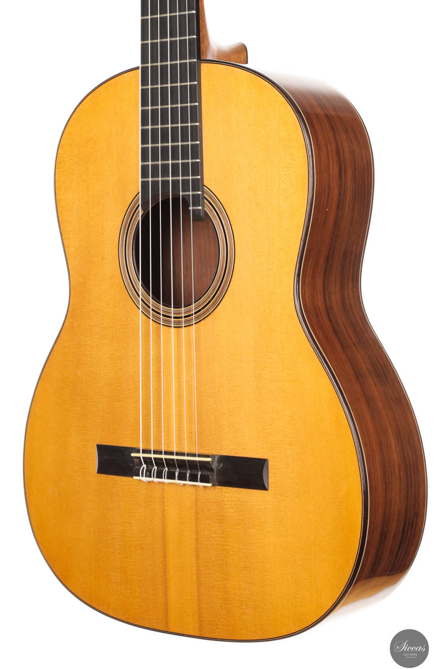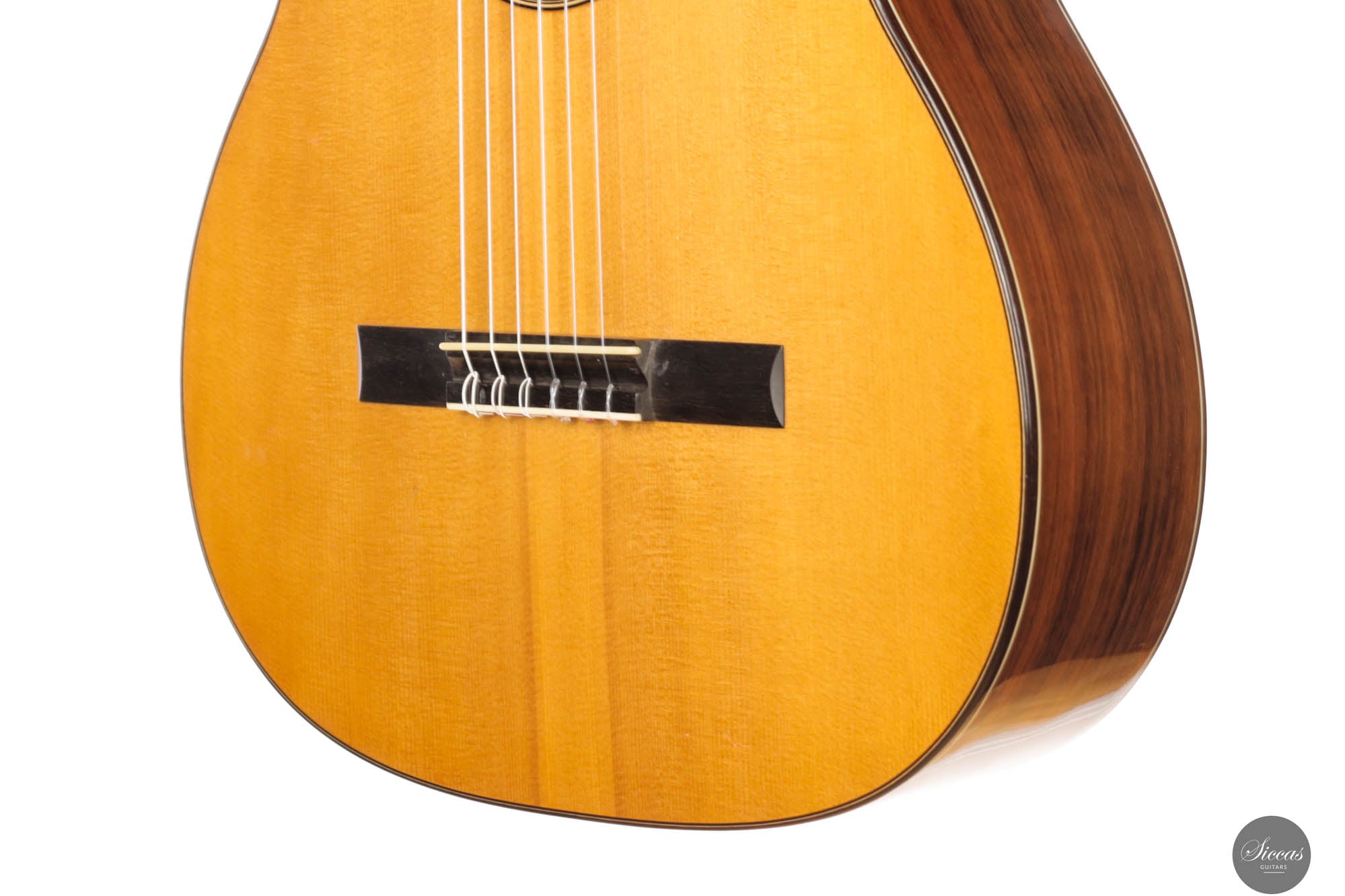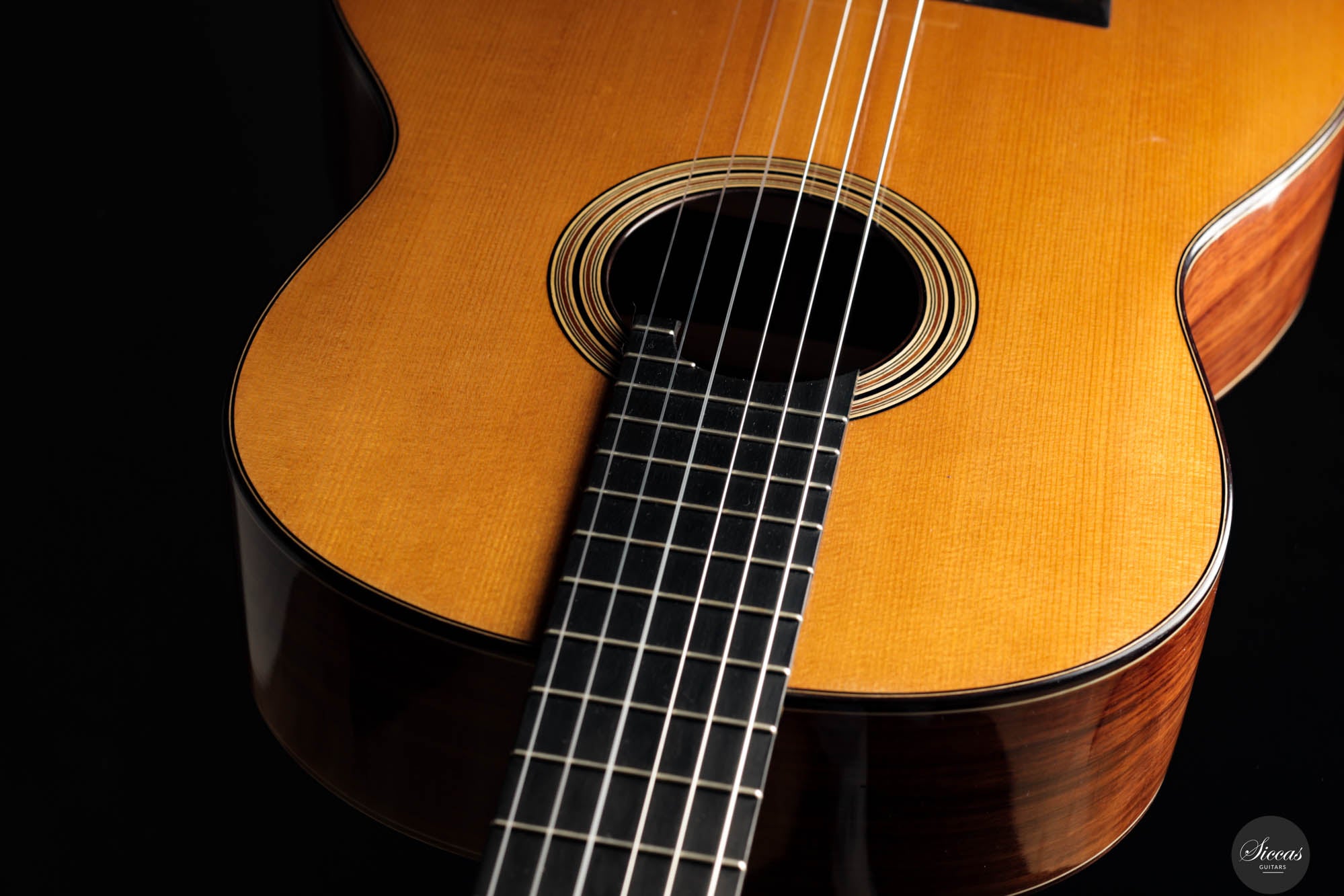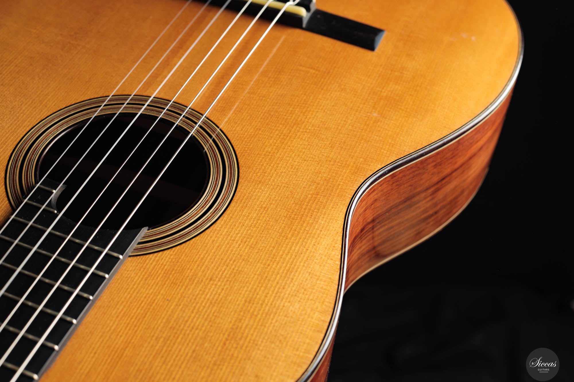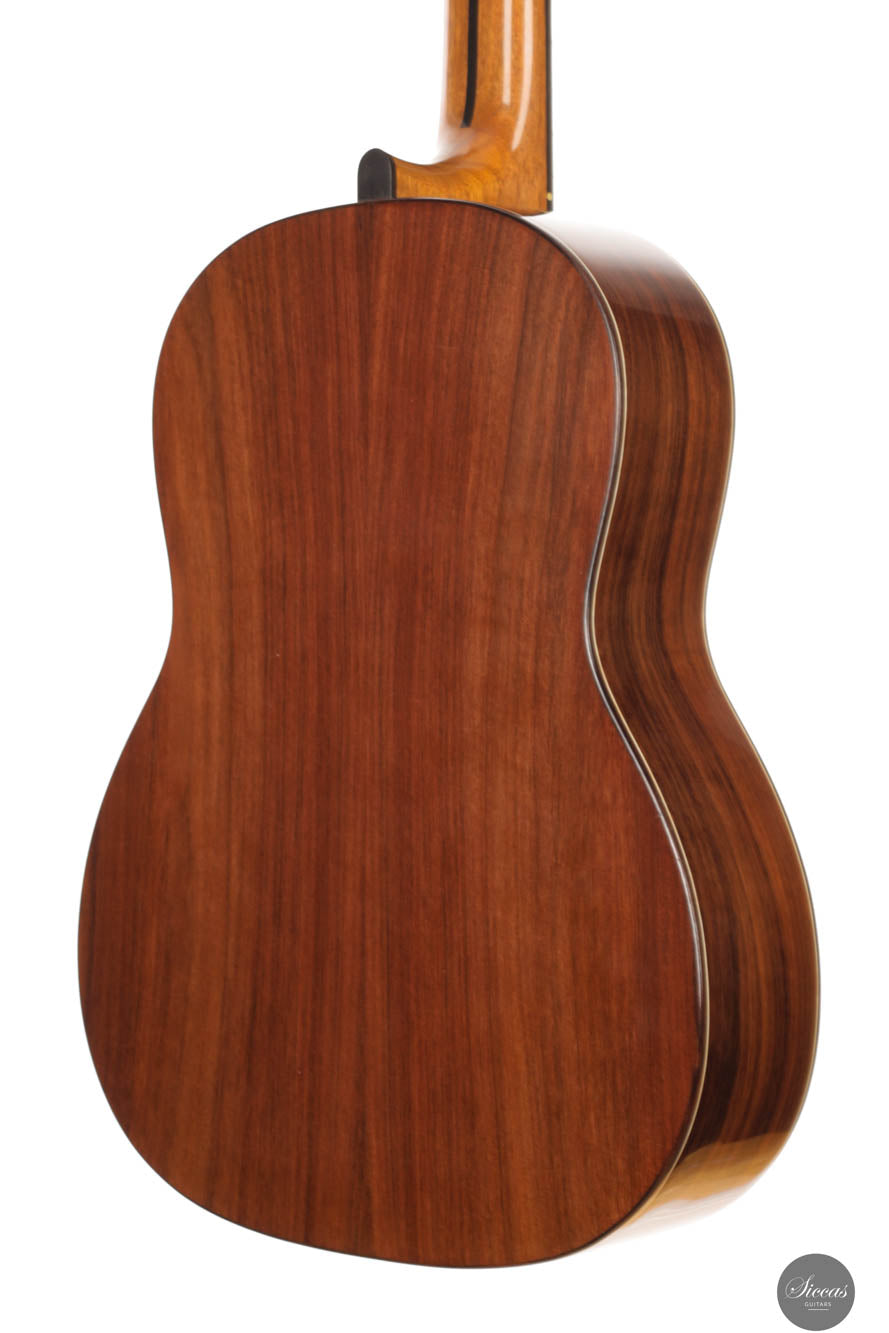 This beautiful guitar was built around 1960 by Martin Jacob. Although it does not bear a label — which is quite common for Weissgerber guitars — there is an ‘MJ’ stamp inside, indicating that the instrument was made for Martin Jacob. A distinctive feature of this guitar is that, in addition to the ‘MJ’ stamp, it also carries the same Weissgerber brand stamp that was used by his father, Richard Jacob Weissgerber. This can be seen as a sign of his artistic emancipation: in terms of construction and sound quality, his guitars are in no way inferior to those of his father. Due to its dimensions and body shape, the guitar is classified as a “Große Spanische Modell,” closely inspired by traditional Spanish guitar design. The instrument was once owned by Maria Jacob, daughter of Martin Jacob, and it remains in excellent condition, with no structural issues. In terms of sound, the guitar delivers dry, punchy, and present basses, while the trebles are clean, clear, and focused. Structurally, the spruce soundboard features four fan bracings, complemented by two V-shaped bars angled outward toward the sides. This unusual yet effective internal bracing contributes to the guitar’s rich resonance and overall stability. A fine example of German craftsmanship with the soul of Spanish guitar tradition—a rare and expressive instrument with both historical and musical value.