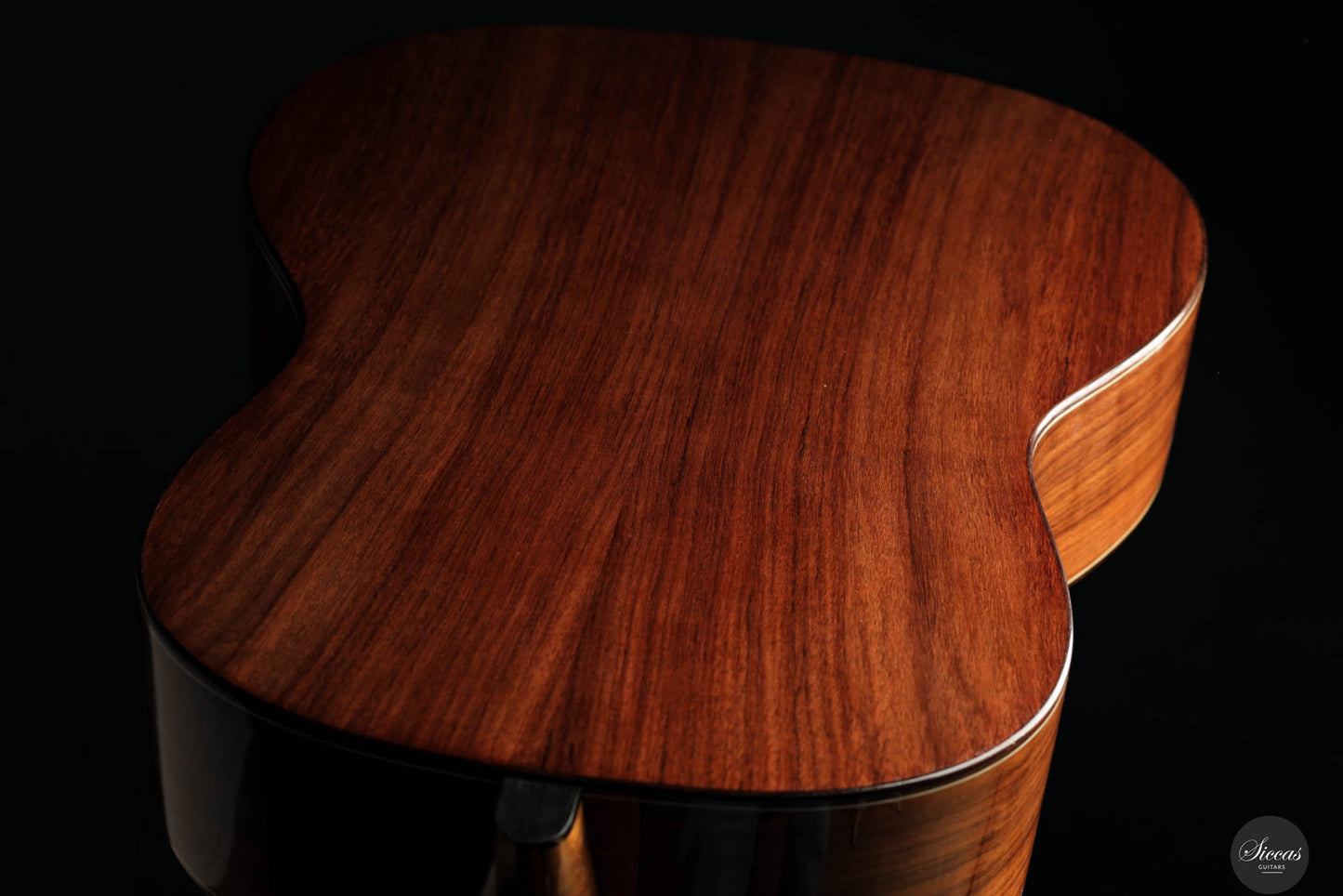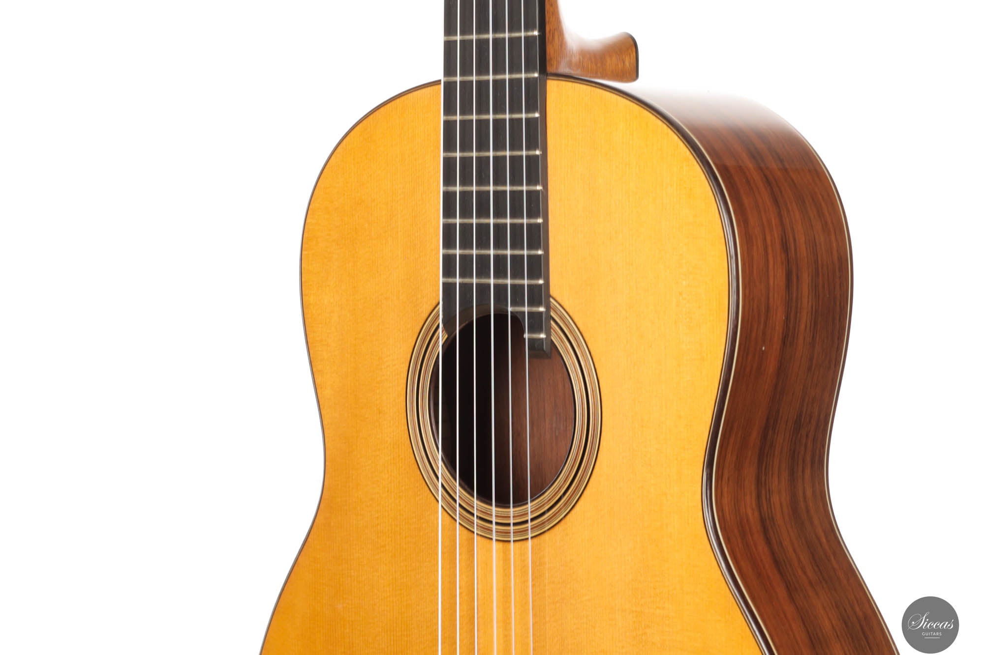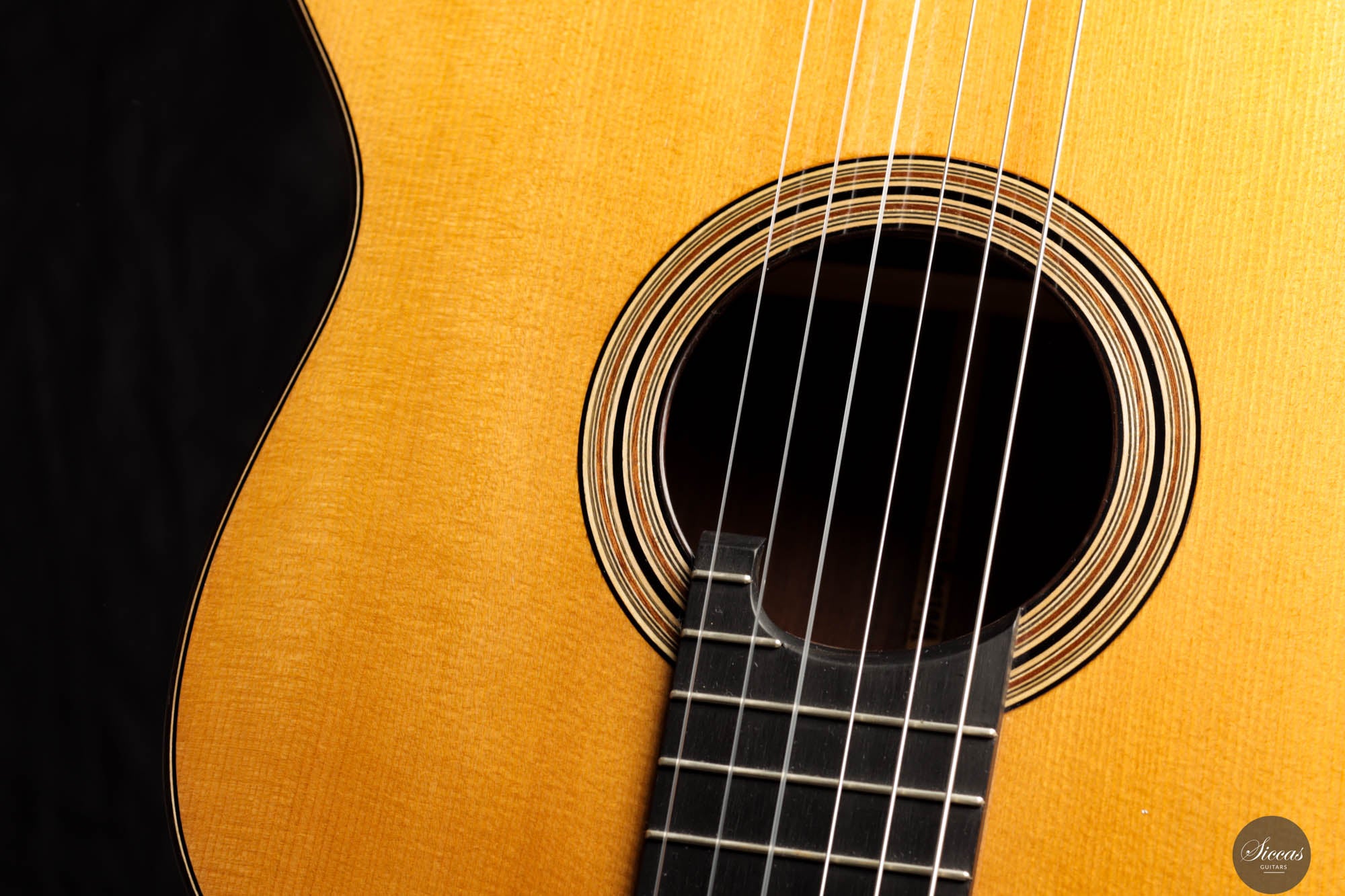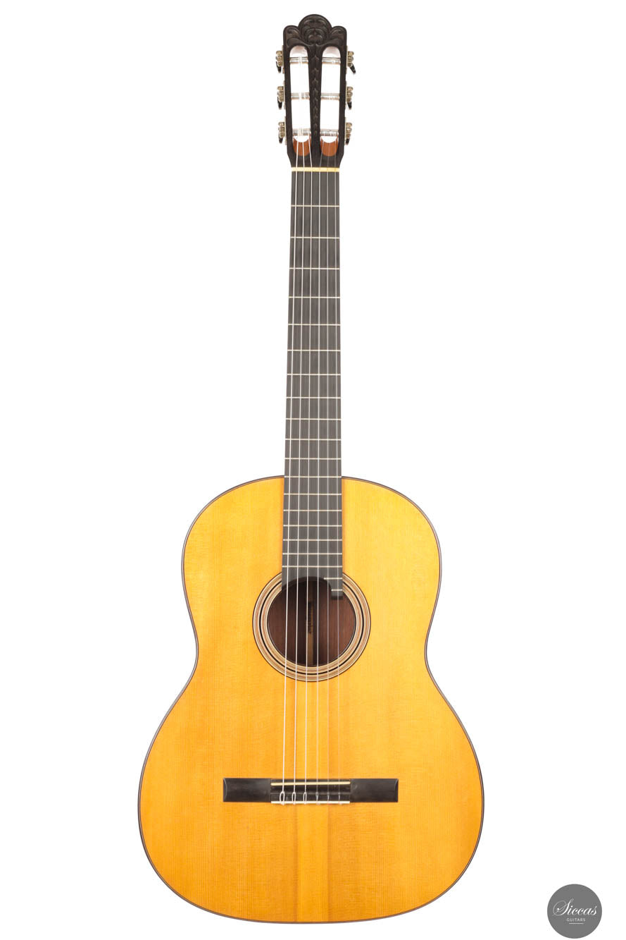 This beautiful guitar was built around 1960 by Martin Jacob. Although it does not bear a label — which is quite common for Weissgerber guitars — there is an ‘MJ’ stamp inside, indicating that the instrument was made for Martin Jacob. A distinctive feature of this guitar is that, in addition to the ‘MJ’ stamp, it also carries the same Weissgerber brand stamp that was used by his father, Richard Jacob Weissgerber. This can be seen as a sign of his artistic emancipation: in terms of construction and sound quality, his guitars are in no way inferior to those of his father. Due to its dimensions and body shape, the guitar is classified as a “Große Spanische Modell,” closely inspired by traditional Spanish guitar design. The instrument was once owned by Maria Jacob, daughter of Martin Jacob, and it remains in excellent condition, with no structural issues. In terms of sound, the guitar delivers dry, punchy, and present basses, while the trebles are clean, clear, and focused. Structurally, the spruce soundboard features four fan bracings, complemented by two V-shaped bars angled outward toward the sides. This unusual yet effective internal bracing contributes to the guitar’s rich resonance and overall stability. A fine example of German craftsmanship with the soul of Spanish guitar tradition—a rare and expressive instrument with both historical and musical value.
