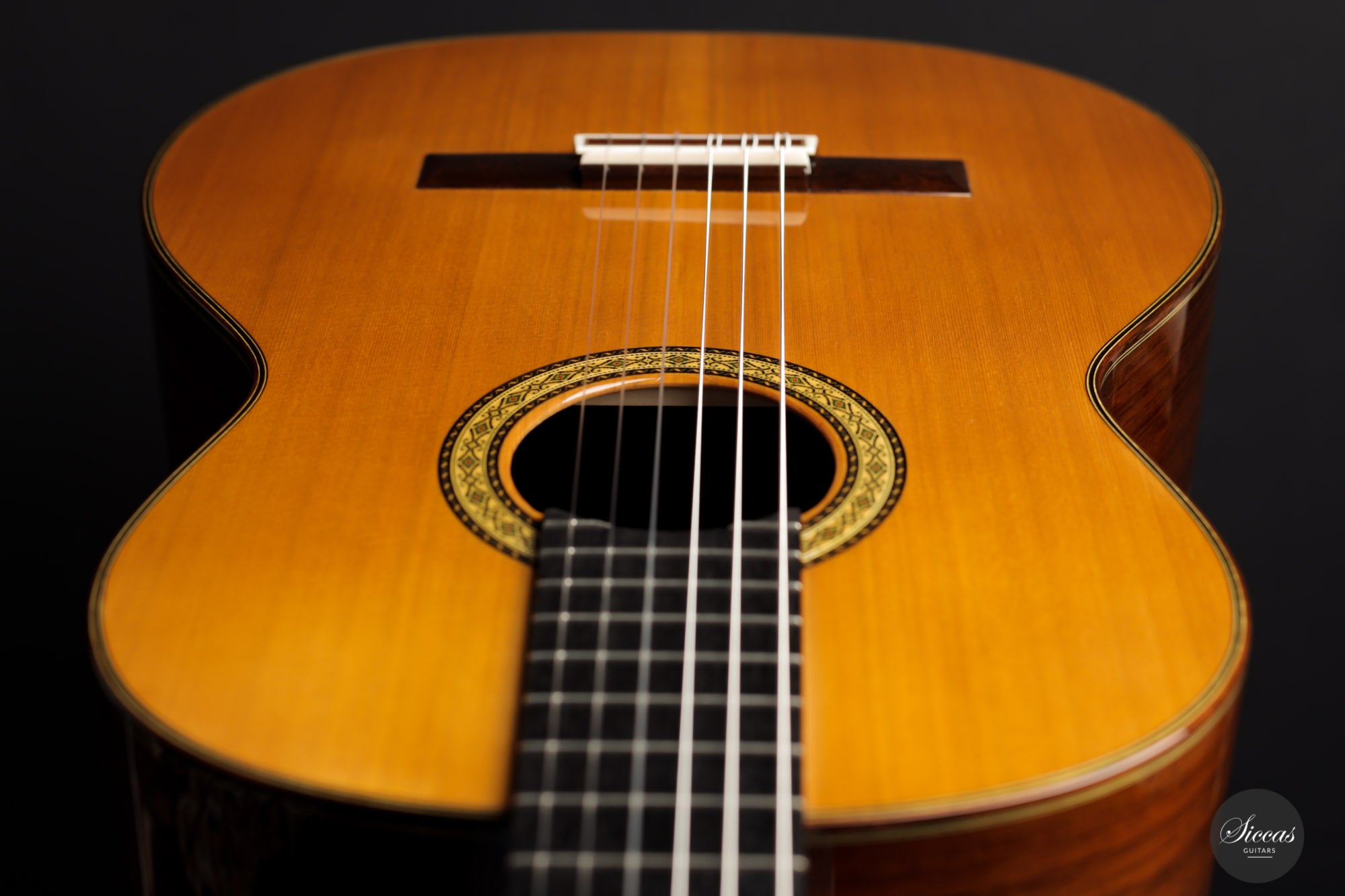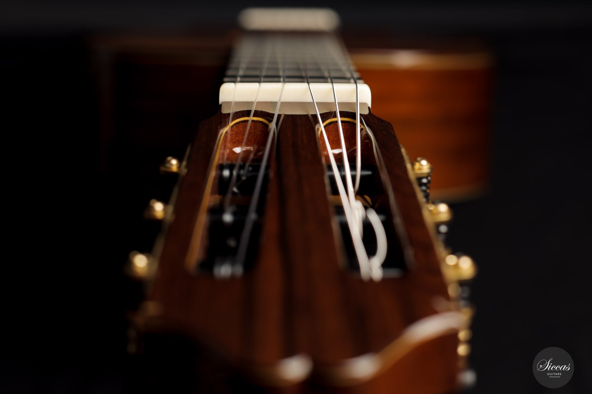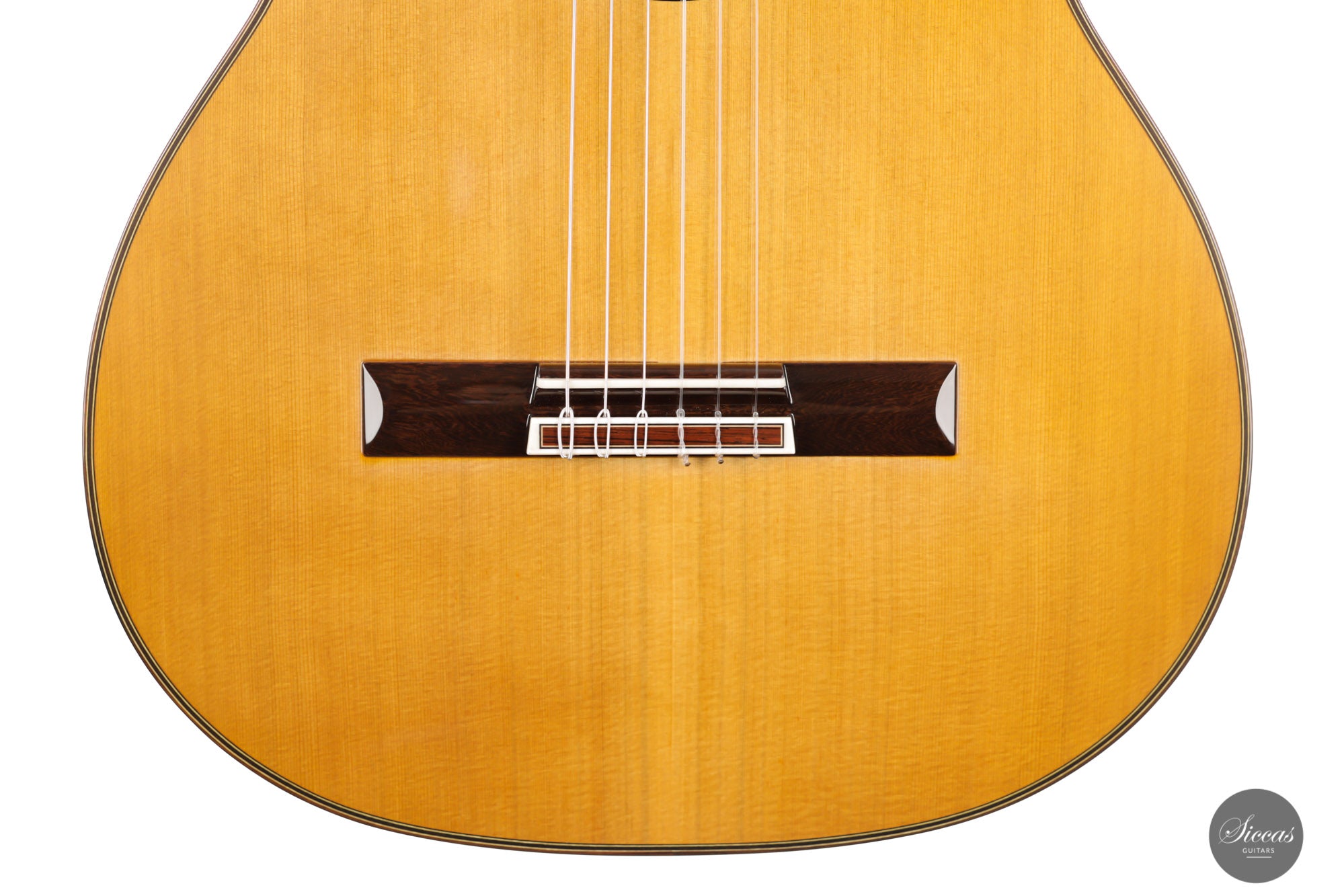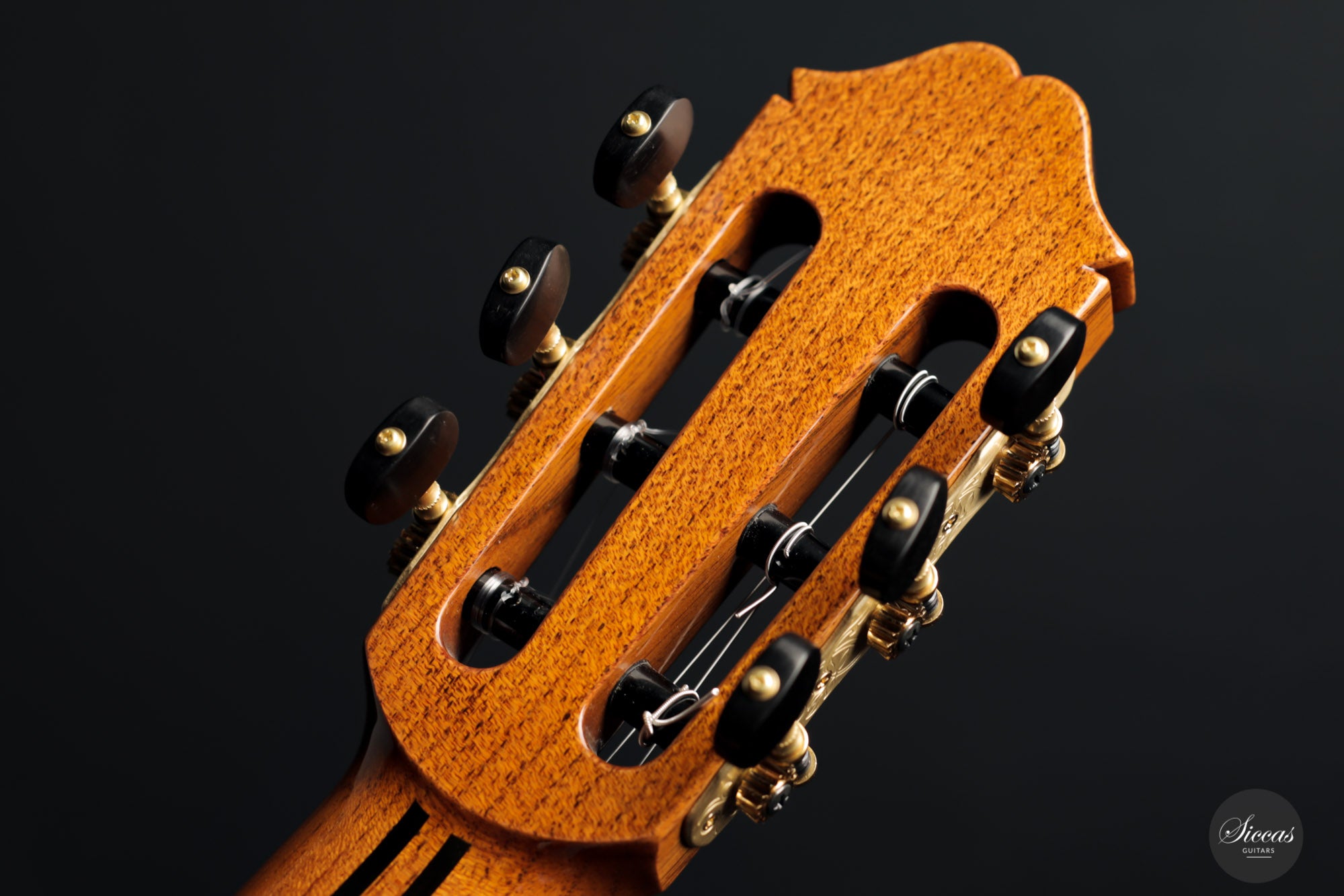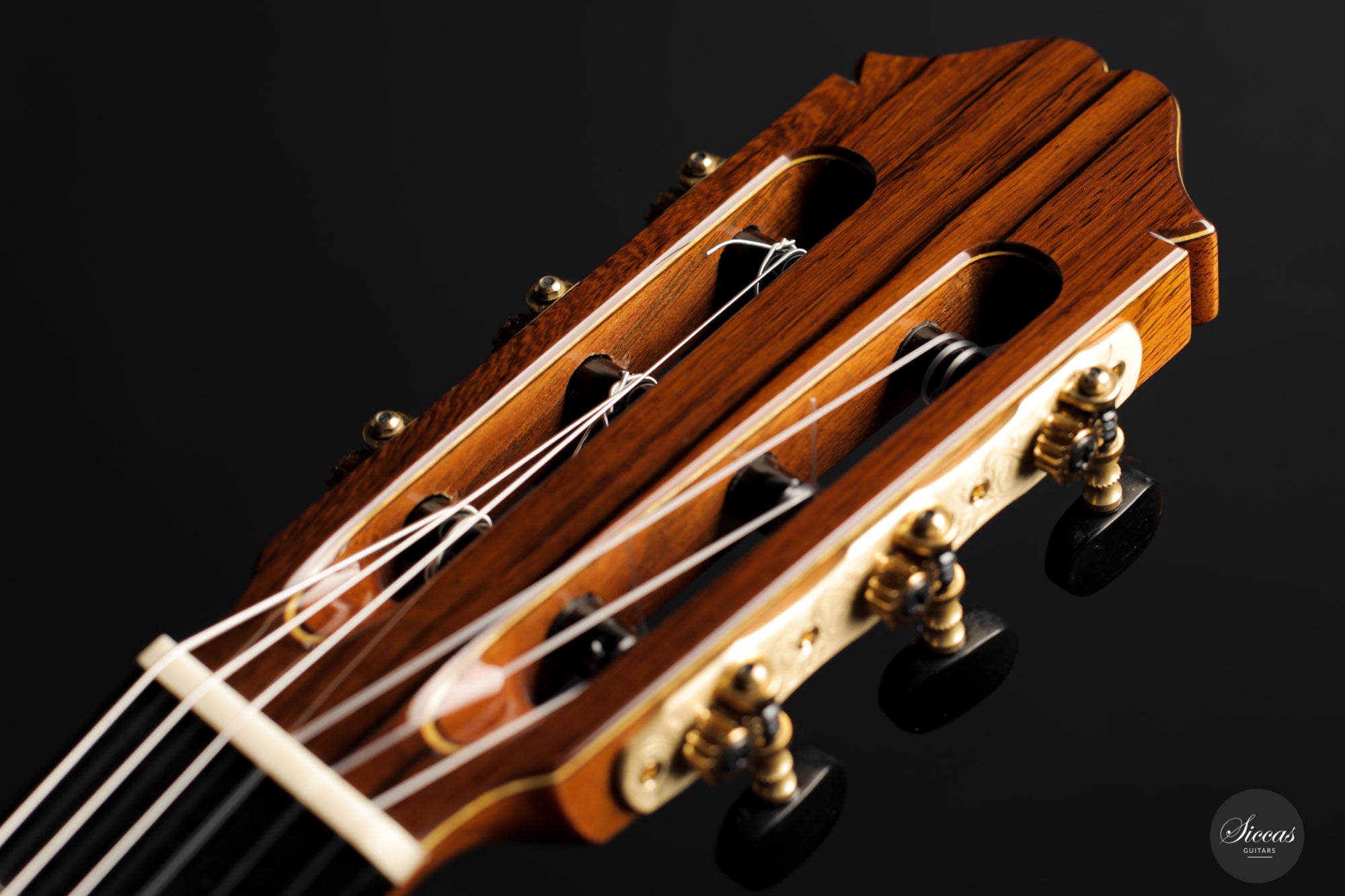Diese schöne Gitarre hat alle ästhetischen Qualitäten von Kohno-Gitarren, wie z.B. eine perfekte Verarbeitung und eine Fichtendecke mit einer schönen Honigfarbe. Die Form der Kopfplatte ist eine Kombination aus der Kopfform der Gitarren von Robert Bouchet und Masaru Kohno. Die Mechaniken werden von Gotoh hergestellt und haben die Besonderheit, dass sie silberne Achsen haben. Der Klang dieser Gitarre ist einfach erstaunlich und übertrifft unsere Erwartungen an dieses sehr zugängliche Modell bei weitem. Kraft und Projektion sind mit einer fantastischen Bespielbarkeit kombiniert. Die erste Saite ist brillant und singt elegant mit ihrem außergewöhnlichen Sustain. Es ist eine Gitarre mit einem fast spanischen Anschlag und einem tiefen und präzisen Bass. Eine sehr schöne Überraschung und ein Instrument, das allen Arten von Gitarristen, Amateuren und Profis gleichermaßen sehr zu empfehlen ist.