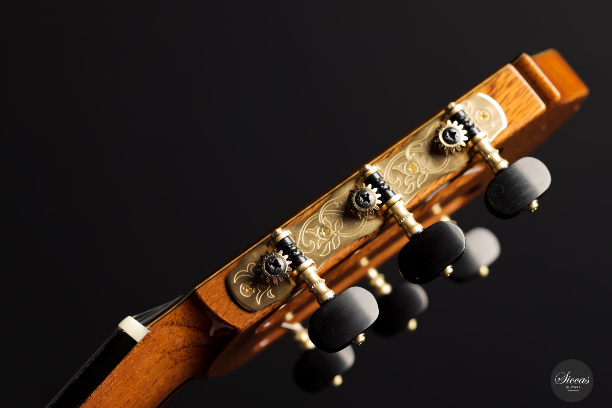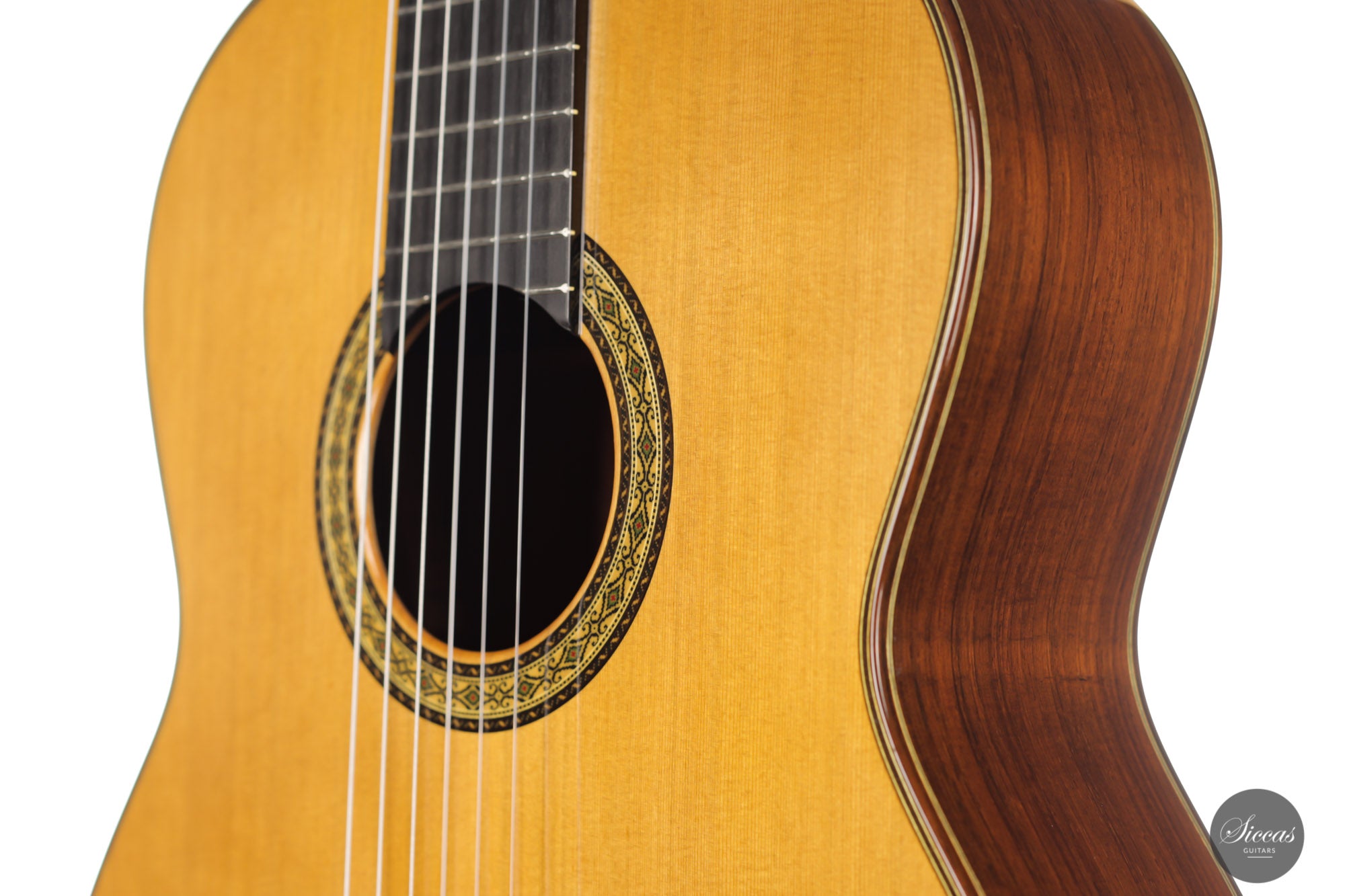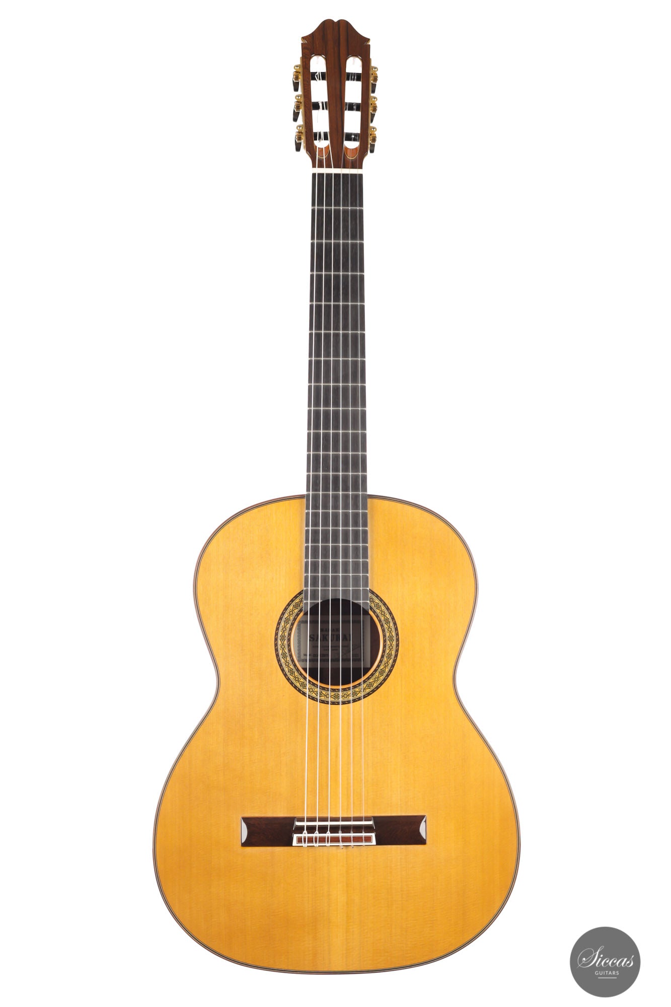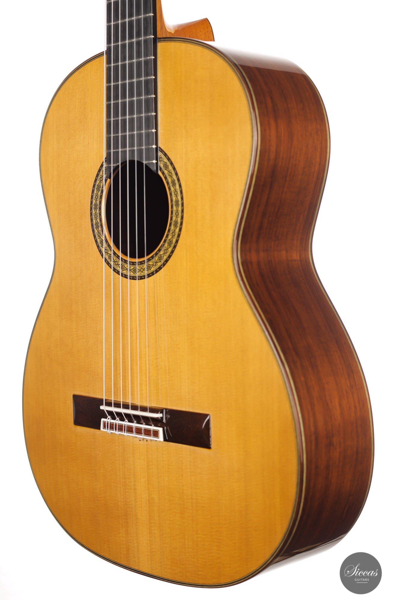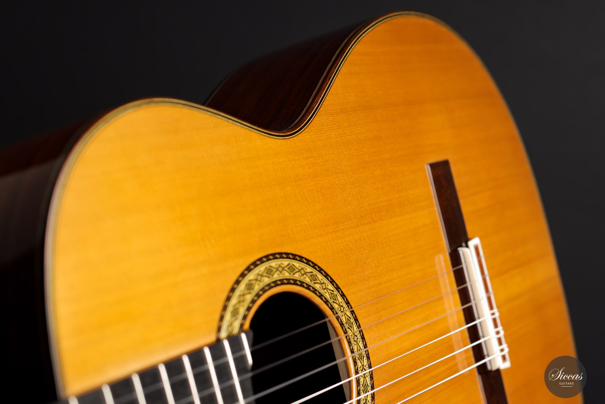 Diese schöne Gitarre hat alle ästhetischen Qualitäten von Kohno-Gitarren, wie z.B. eine perfekte Verarbeitung und eine Fichtendecke mit einer schönen Honigfarbe. Die Form der Kopfplatte ist eine Kombination aus der Kopfform der Gitarren von Robert Bouchet und Masaru Kohno. Die Mechaniken werden von Gotoh hergestellt und haben die Besonderheit, dass sie silberne Achsen haben. Der Klang dieser Gitarre ist einfach erstaunlich und übertrifft unsere Erwartungen an dieses sehr zugängliche Modell bei weitem. Kraft und Projektion sind mit einer fantastischen Bespielbarkeit kombiniert. Die erste Saite ist brillant und singt elegant mit ihrem außergewöhnlichen Sustain. Es ist eine Gitarre mit einem fast spanischen Anschlag und einem tiefen und präzisen Bass. Eine sehr schöne Überraschung und ein Instrument, das allen Arten von Gitarristen, Amateuren und Profis gleichermaßen sehr zu empfehlen ist.