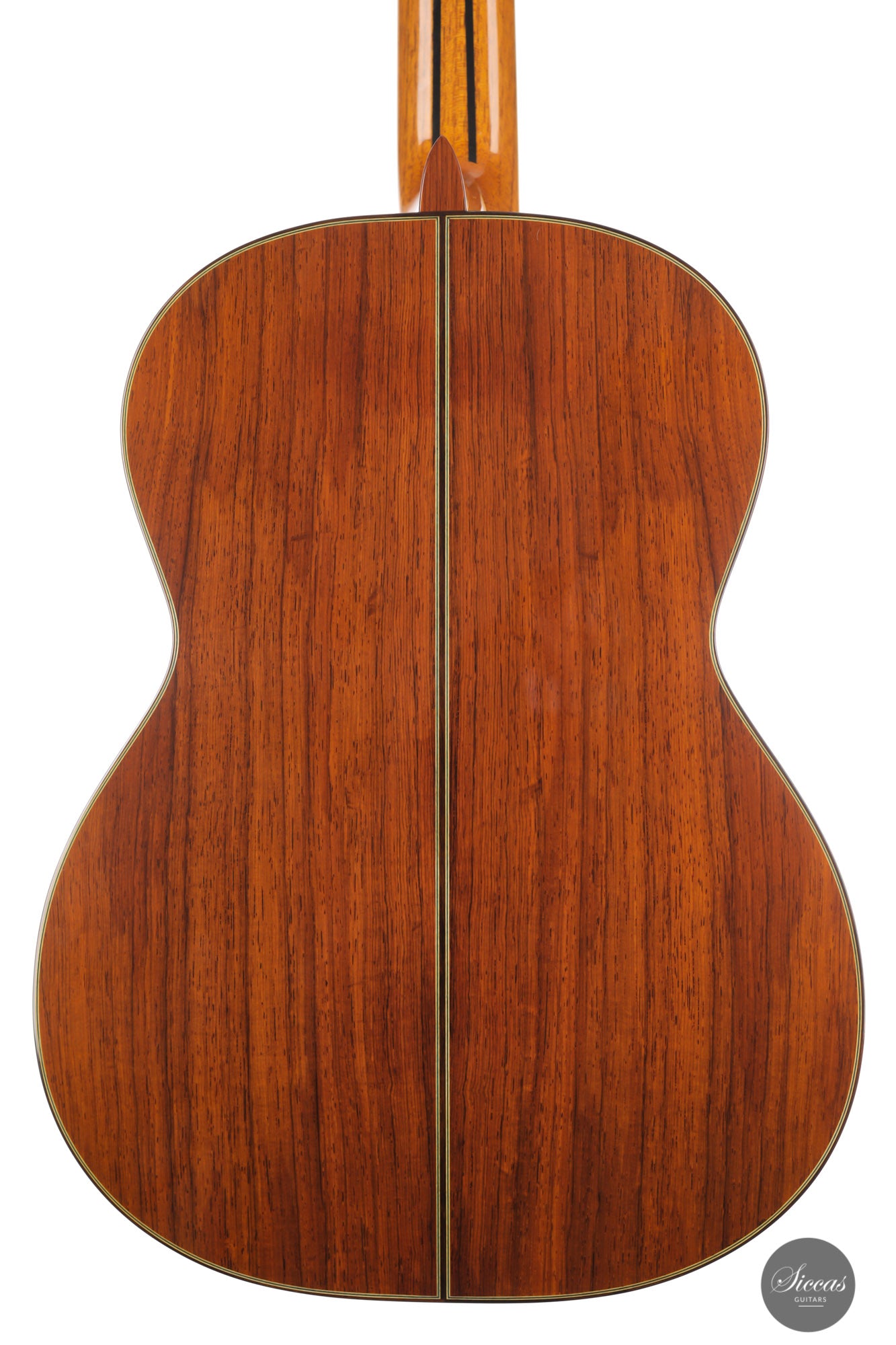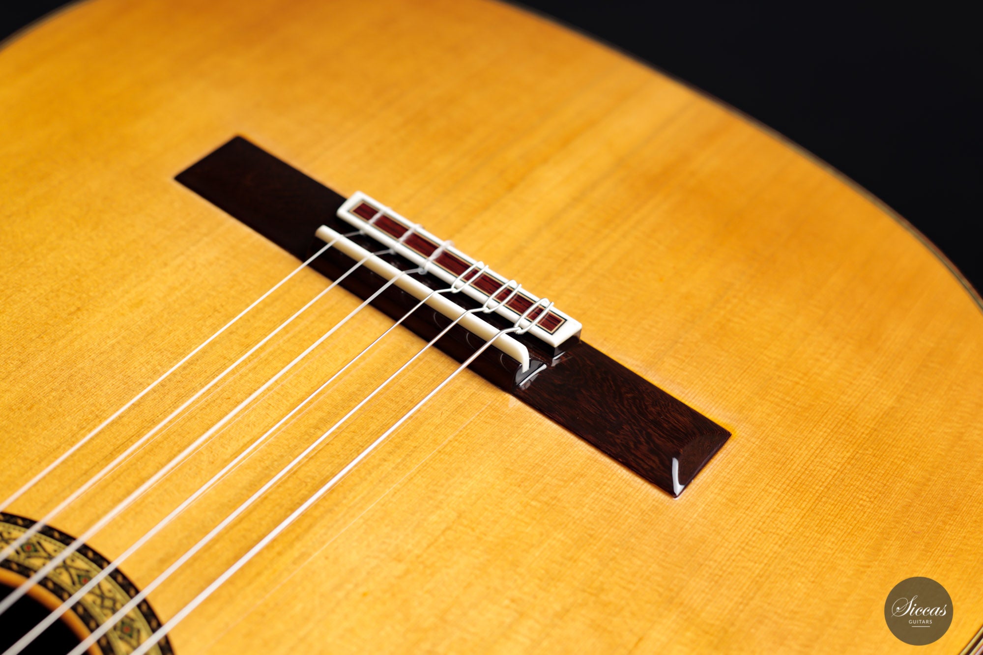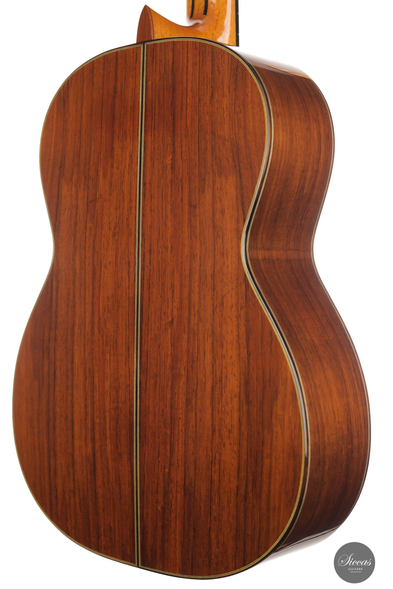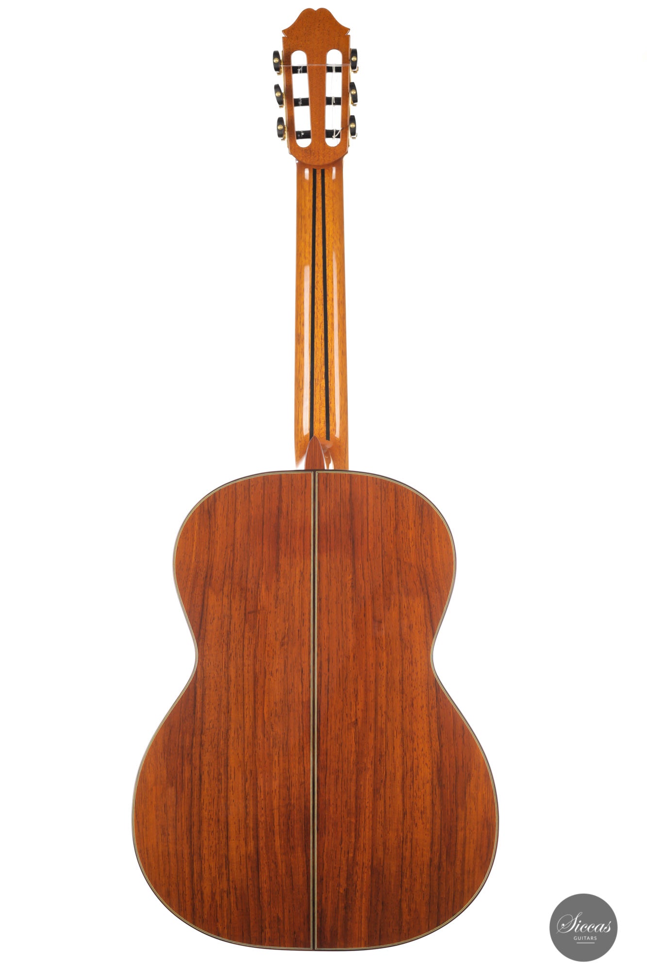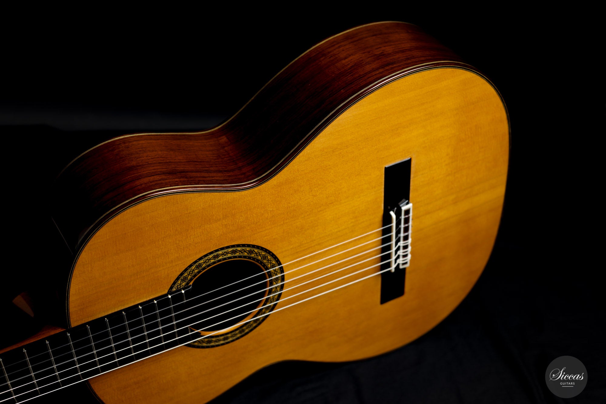 Diese schöne Gitarre hat alle ästhetischen Qualitäten von Kohno-Gitarren, wie z.B. eine perfekte Verarbeitung und eine Fichtendecke mit einer schönen Honigfarbe. Die Form der Kopfplatte ist eine Kombination aus der Kopfform der Gitarren von Robert Bouchet und Masaru Kohno. Die Mechaniken werden von Gotoh hergestellt und haben die Besonderheit, dass sie silberne Achsen haben. Der Klang dieser Gitarre ist einfach erstaunlich und übertrifft unsere Erwartungen an dieses sehr zugängliche Modell bei weitem. Kraft und Projektion sind mit einer fantastischen Bespielbarkeit kombiniert. Die erste Saite ist brillant und singt elegant mit ihrem außergewöhnlichen Sustain. Es ist eine Gitarre mit einem fast spanischen Anschlag und einem tiefen und präzisen Bass. Eine sehr schöne Überraschung und ein Instrument, das allen Arten von Gitarristen, Amateuren und Profis gleichermaßen sehr zu empfehlen ist.