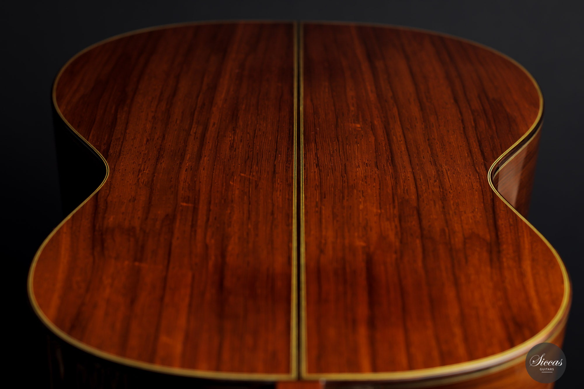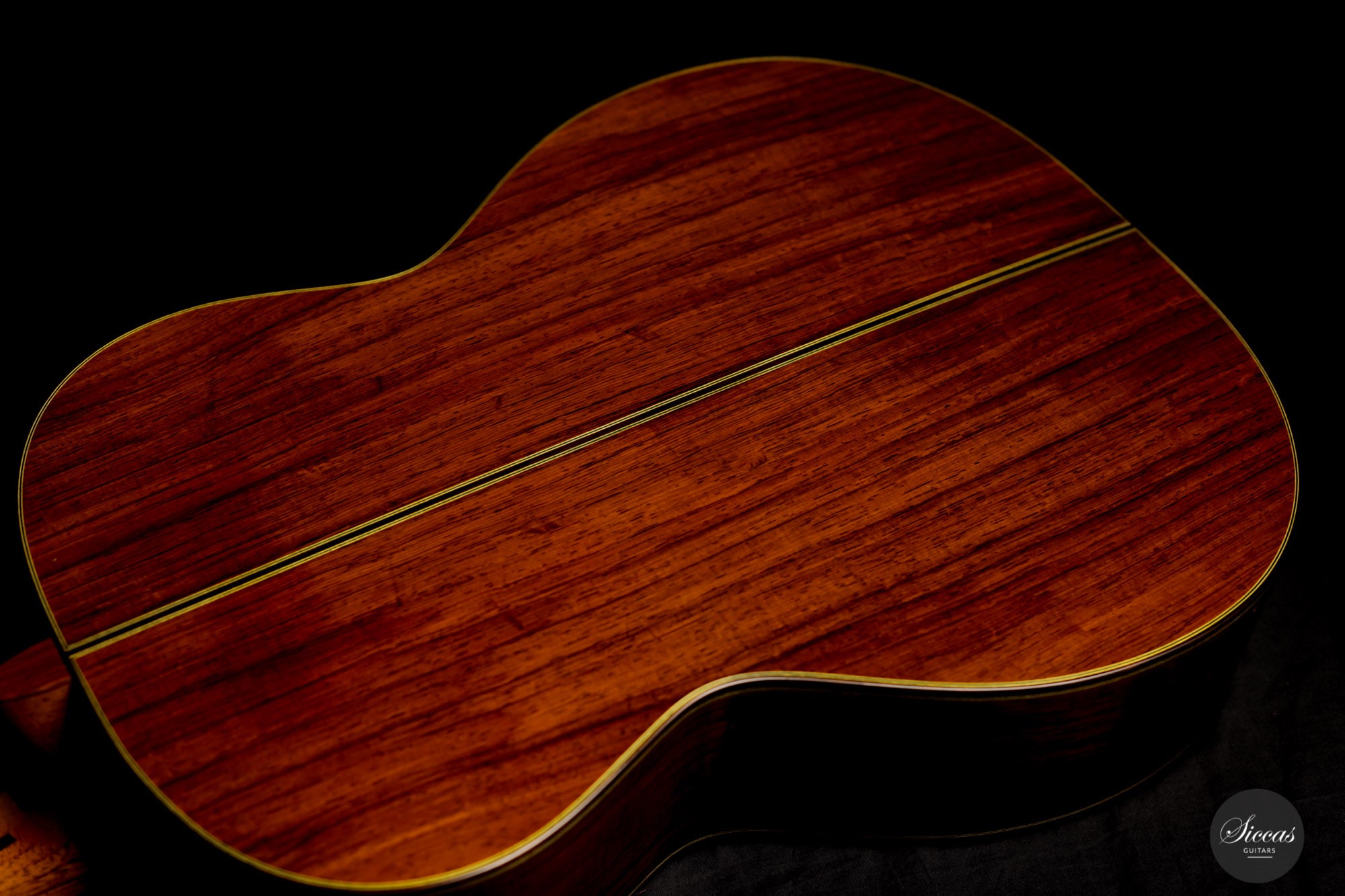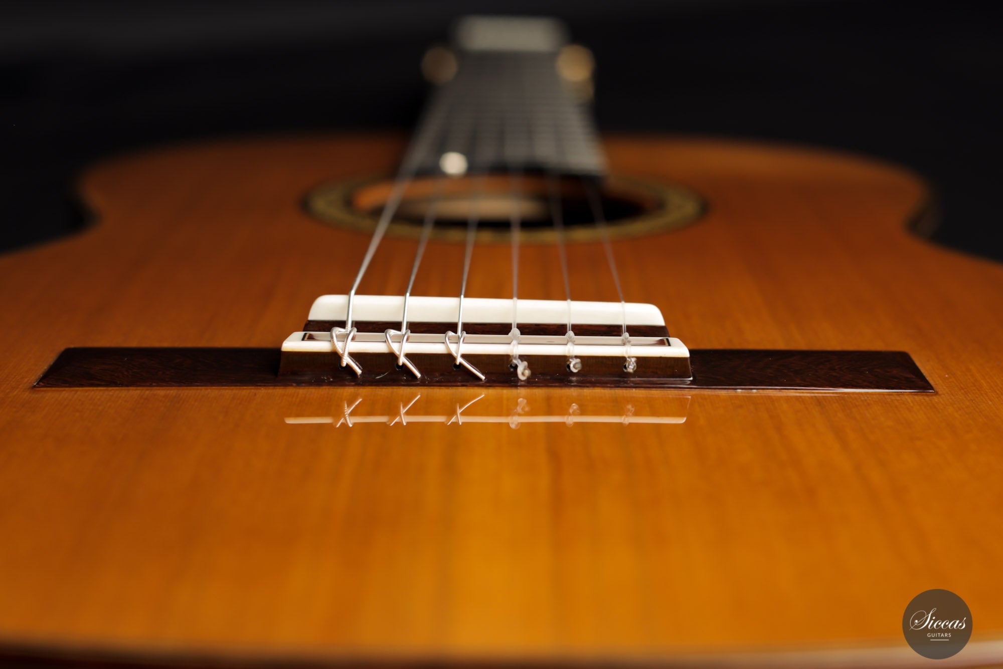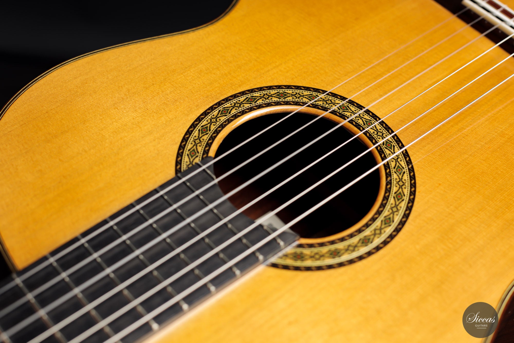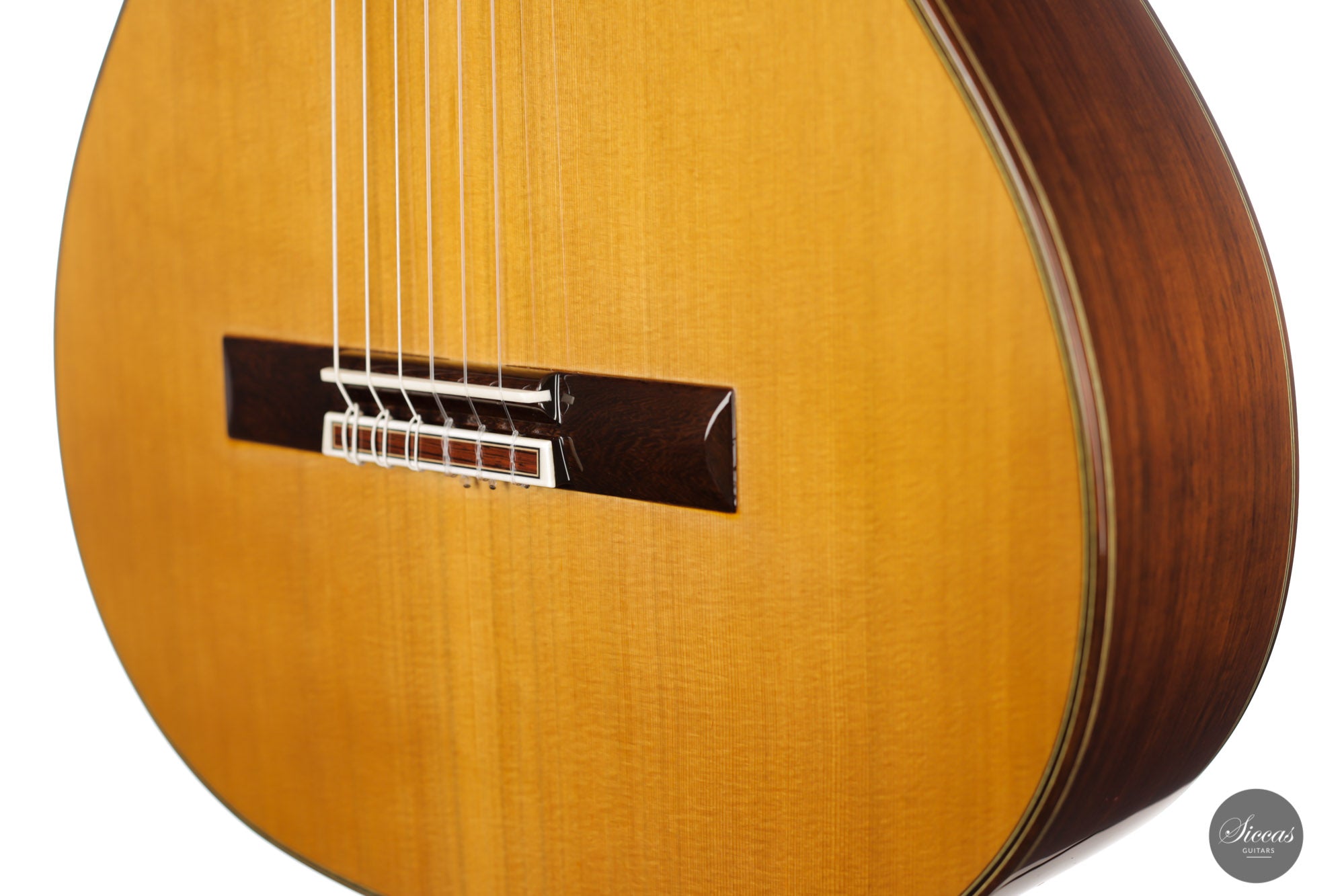 Diese schöne Gitarre hat alle ästhetischen Qualitäten von Kohno-Gitarren, wie z.B. eine perfekte Verarbeitung und eine Fichtendecke mit einer schönen Honigfarbe. Die Form der Kopfplatte ist eine Kombination aus der Kopfform der Gitarren von Robert Bouchet und Masaru Kohno. Die Mechaniken werden von Gotoh hergestellt und haben die Besonderheit, dass sie silberne Achsen haben. Der Klang dieser Gitarre ist einfach erstaunlich und übertrifft unsere Erwartungen an dieses sehr zugängliche Modell bei weitem. Kraft und Projektion sind mit einer fantastischen Bespielbarkeit kombiniert. Die erste Saite ist brillant und singt elegant mit ihrem außergewöhnlichen Sustain. Es ist eine Gitarre mit einem fast spanischen Anschlag und einem tiefen und präzisen Bass. Eine sehr schöne Überraschung und ein Instrument, das allen Arten von Gitarristen, Amateuren und Profis gleichermaßen sehr zu empfehlen ist.