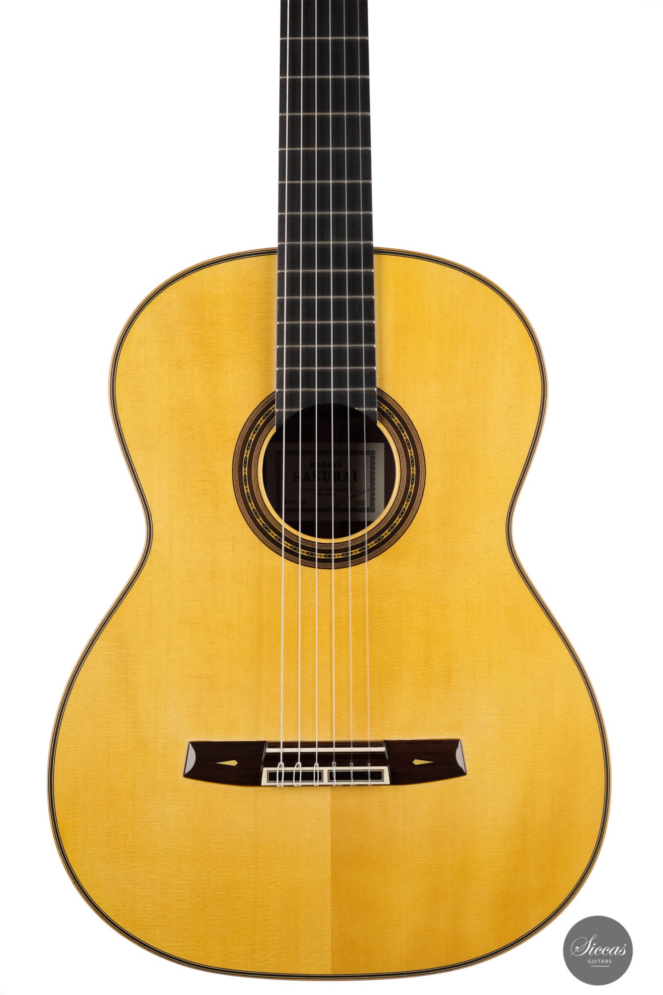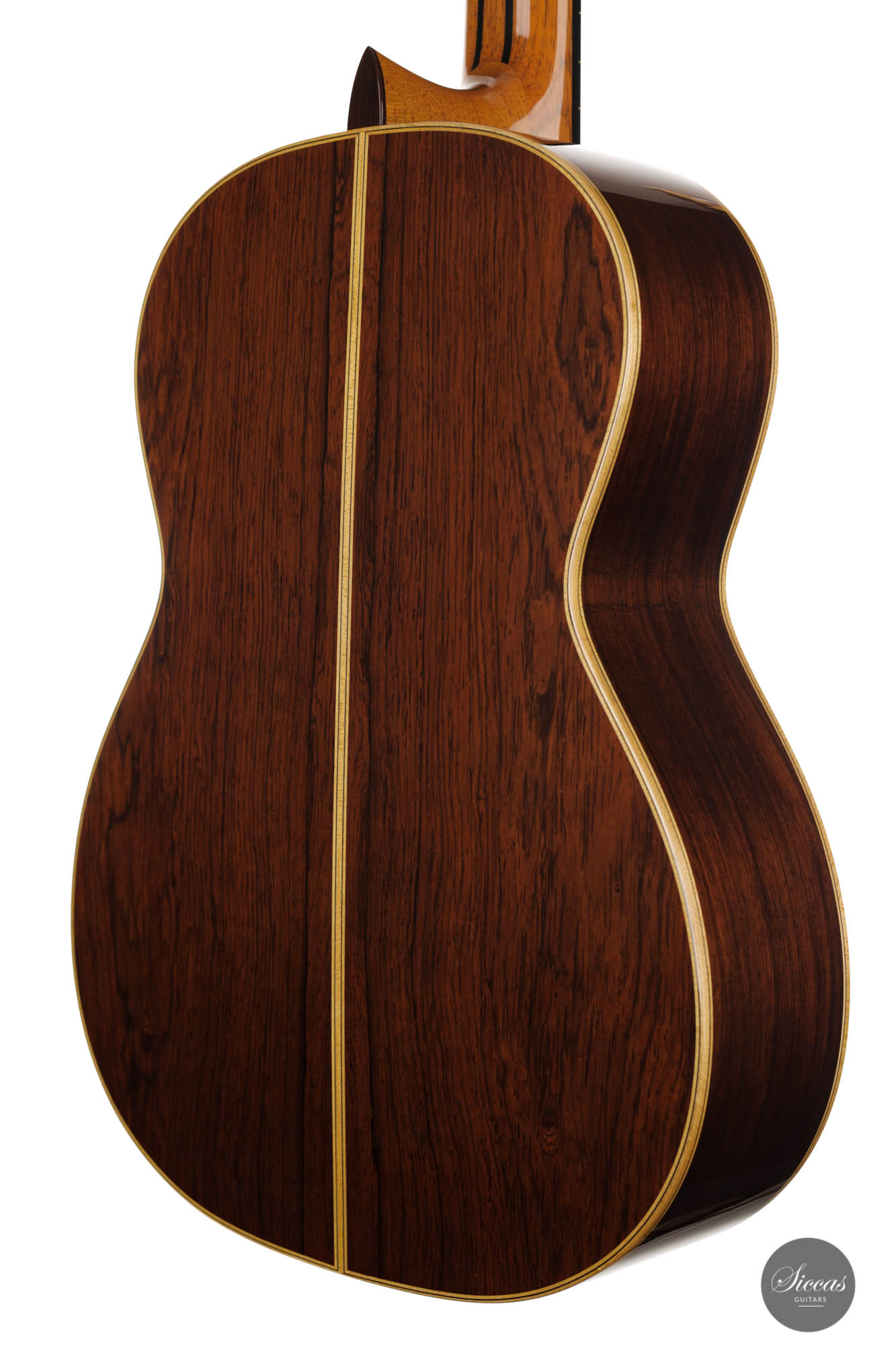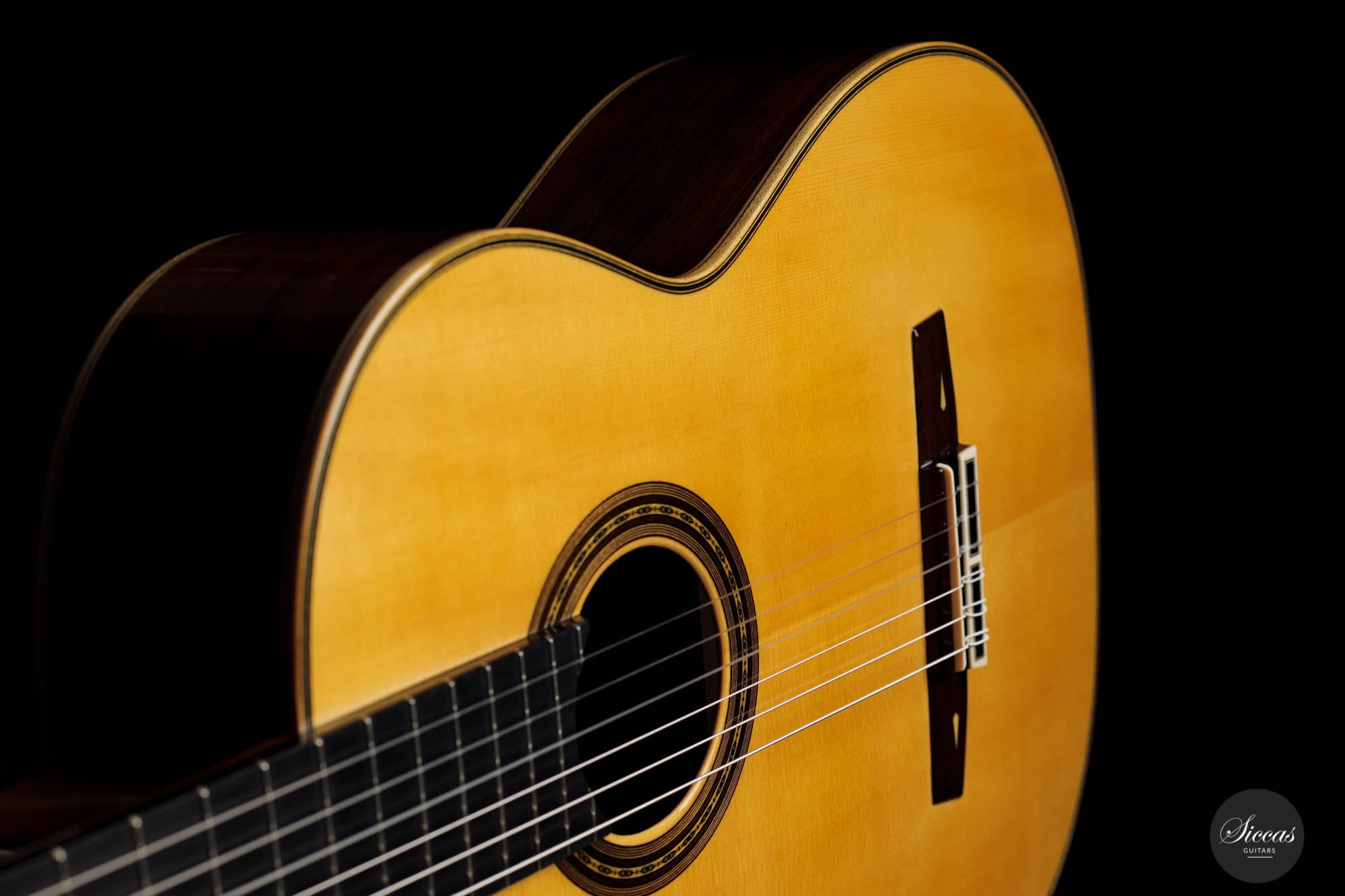 This elegant and classy guitar is a one-to-one replica of the instrument that won Mazaki Sakurai the first prize at the 1988 prestigious Paris International Guitar Luthiers Competition. This model "PC", standing for "Paris Competition", crystallizes Mazaki Sakurai's decades of experience in one guitar. It is characterized by the finest woods, most elaborate bracing pattern, and richest sound.