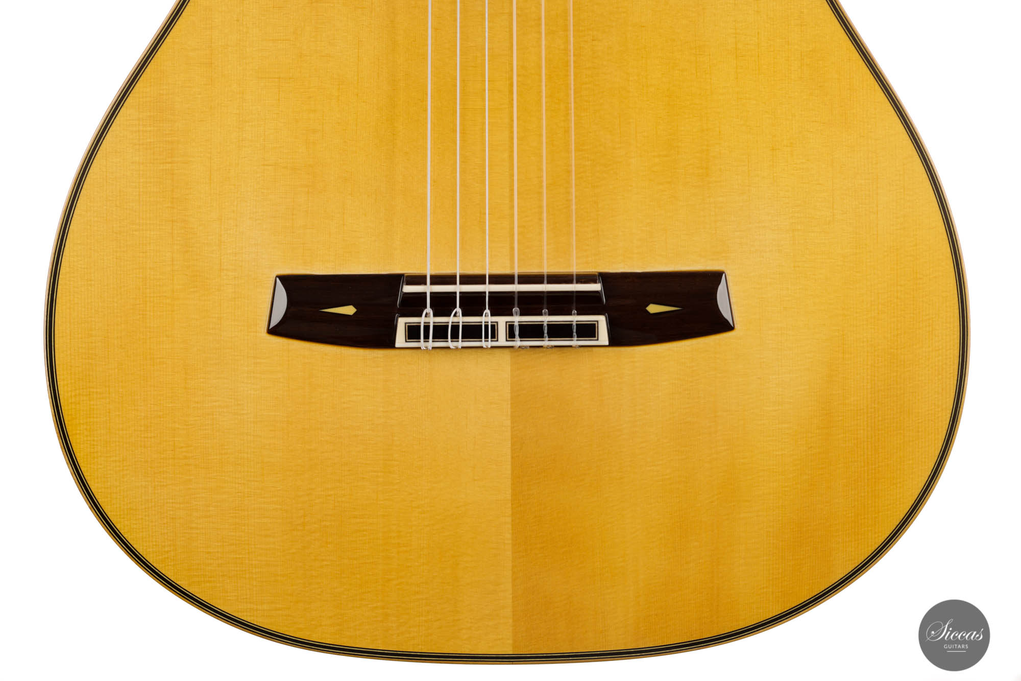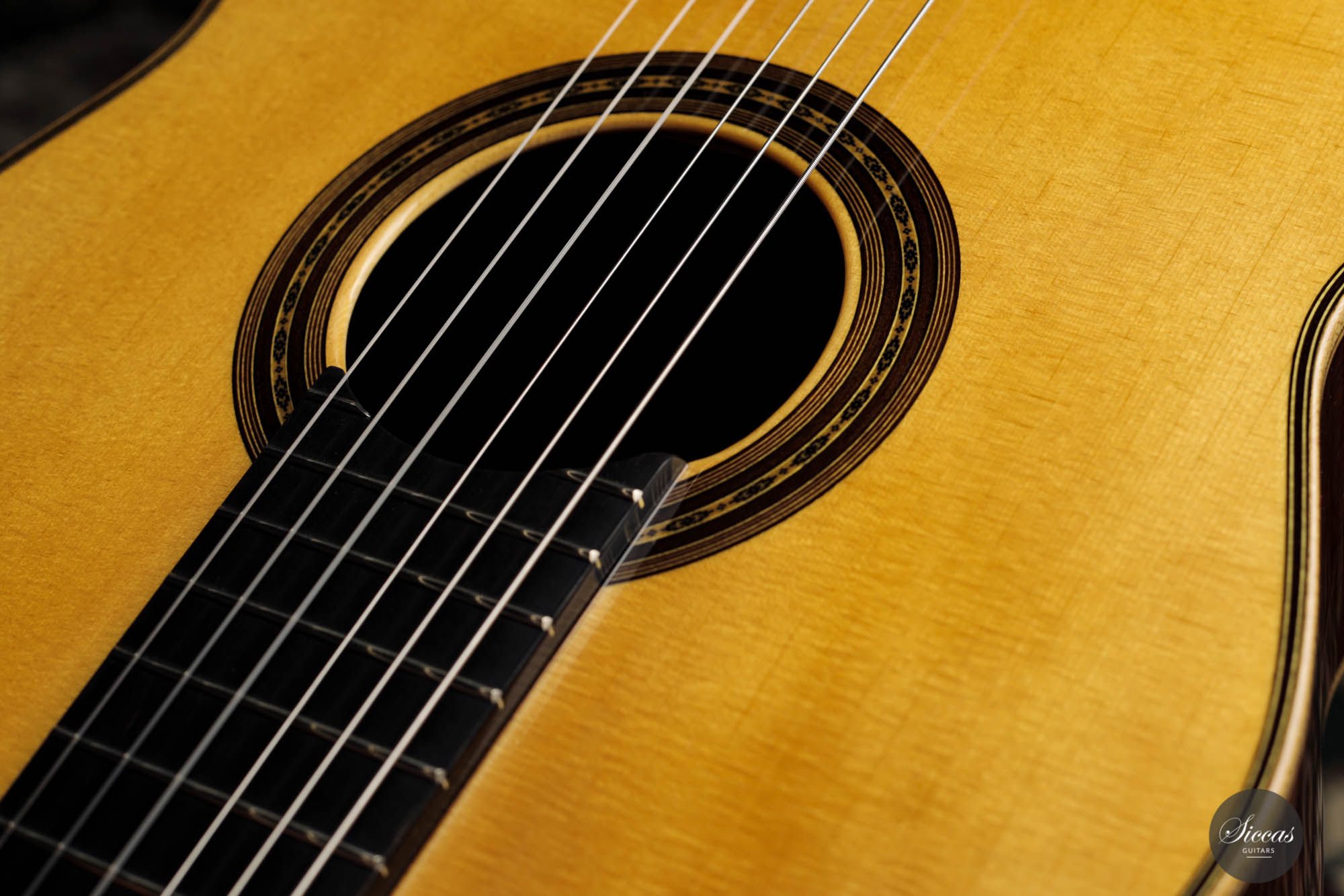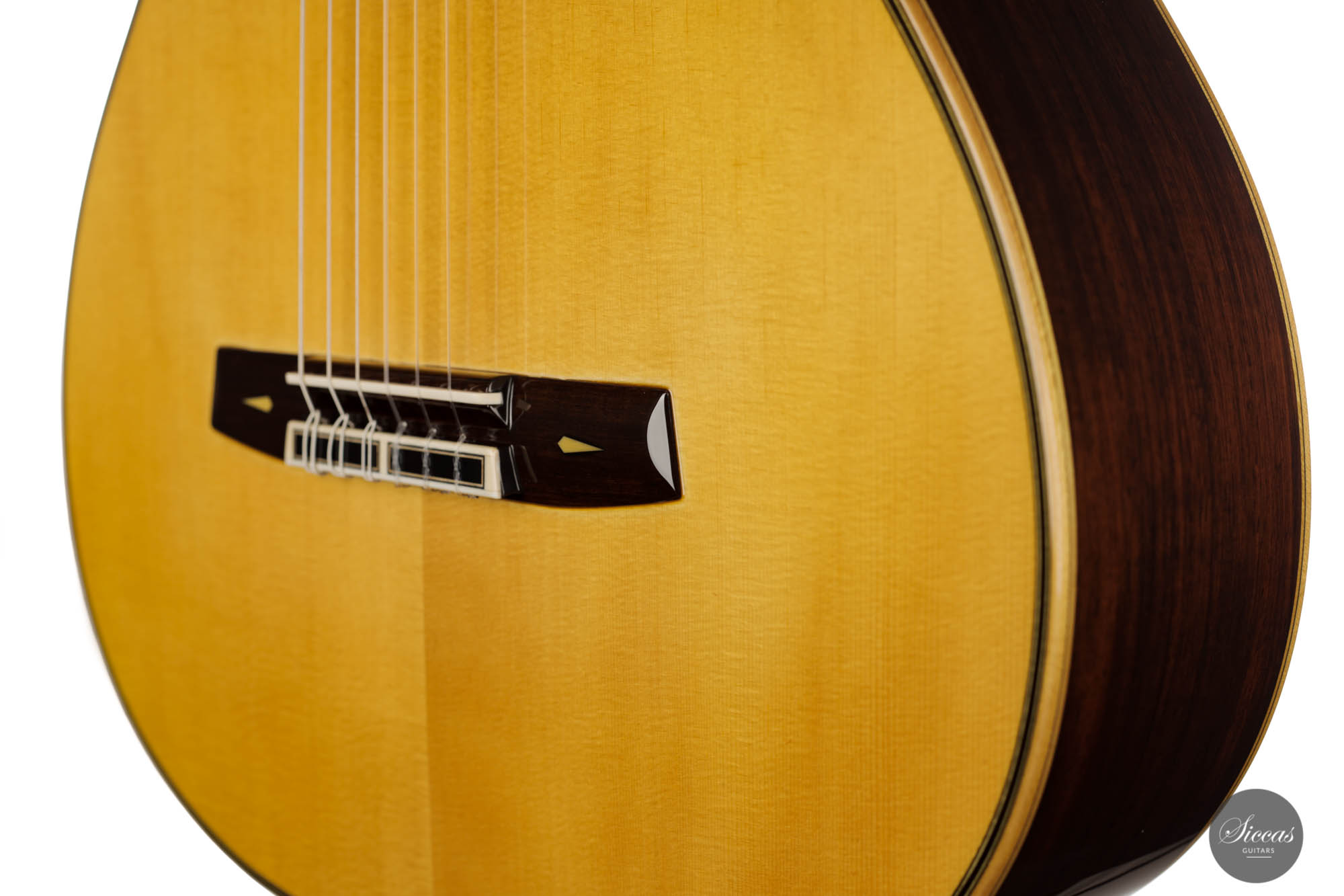 This elegant and classy guitar is a one-to-one replica of the instrument that won Mazaki Sakurai the first prize at the 1988 prestigious Paris International Guitar Luthiers Competition. This model "PC", standing for "Paris Competition", crystallizes Mazaki Sakurai's decades of experience in one guitar. It is characterized by the finest woods, most elaborate bracing pattern, and richest sound.