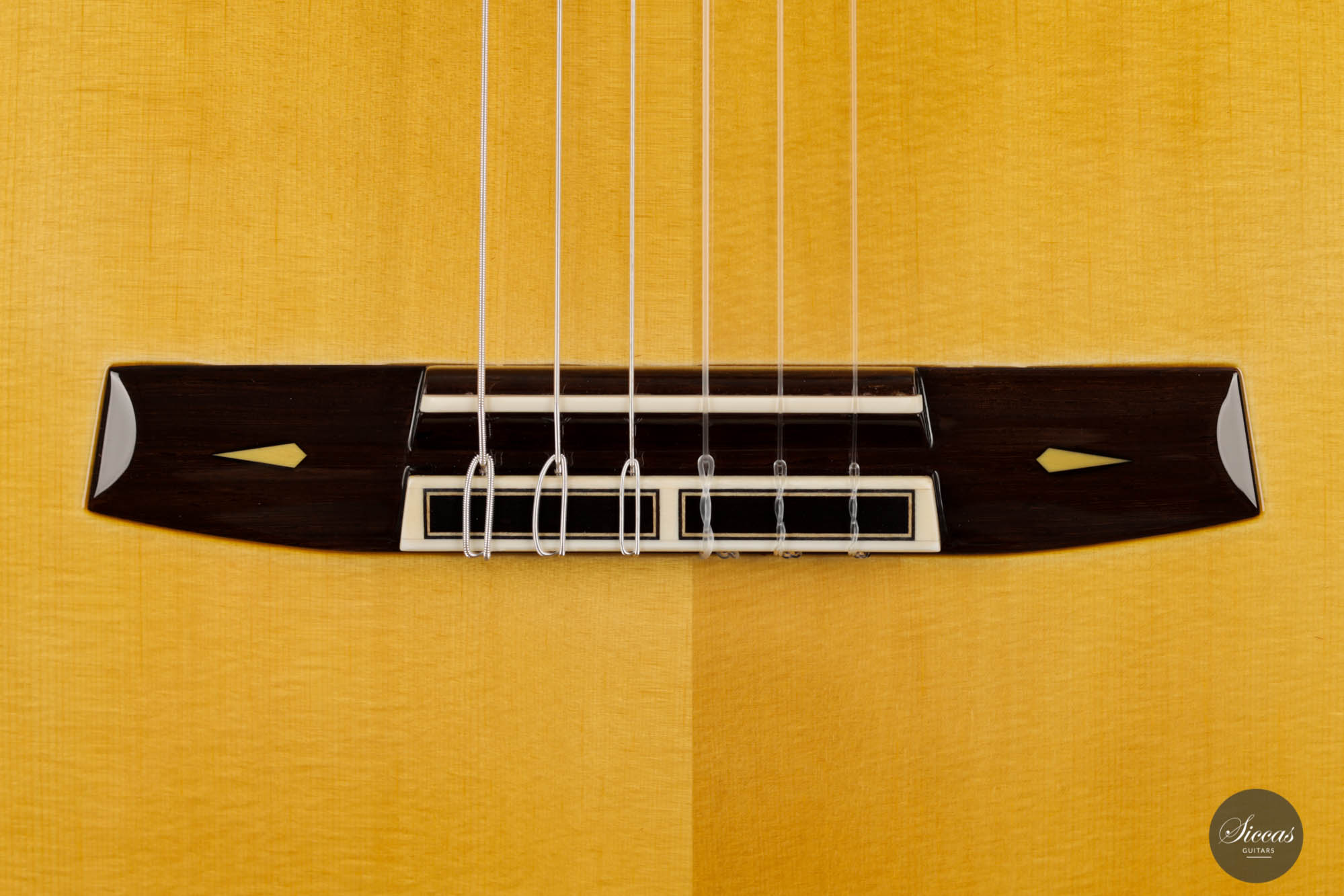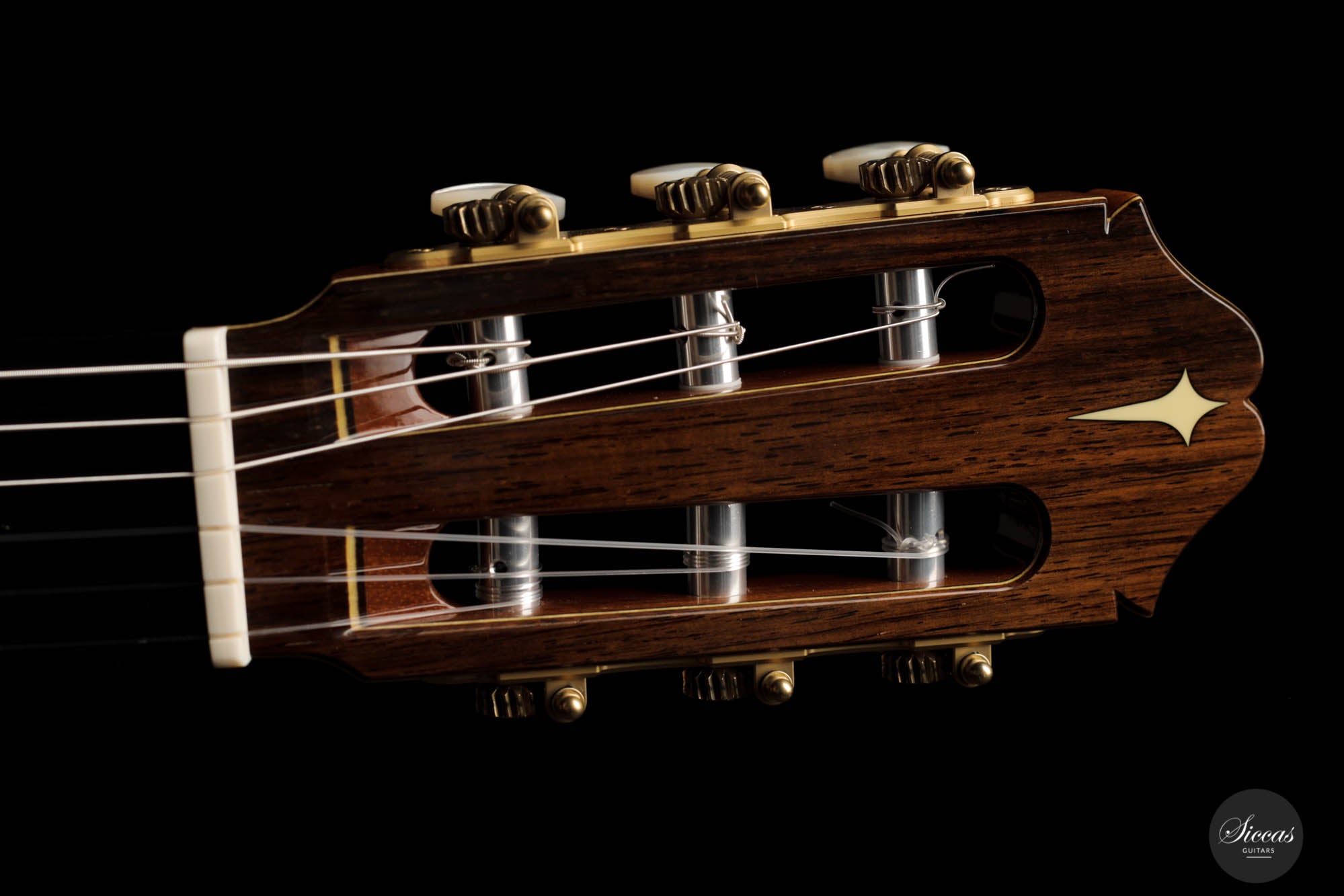 This beautiful guitar has all the aesthetic qualities of Kohno guitars, such as perfect craftsmanship and a fine-grained soundboard. The shape of the headstock is a combination of the head shape of the guitars of Robert Bouchet and Masaru Kohno. The tuners are made by Gotoh and have the peculiarity of having silver barrels.
