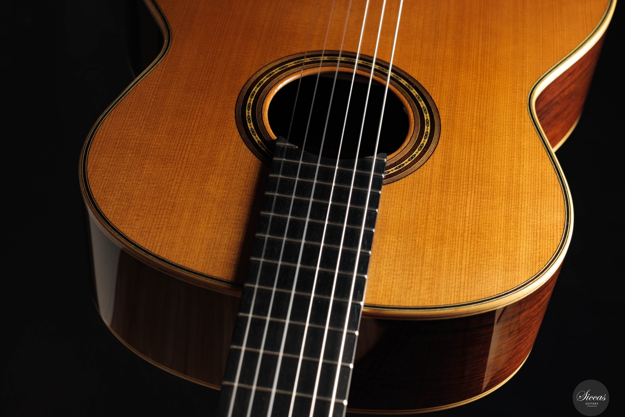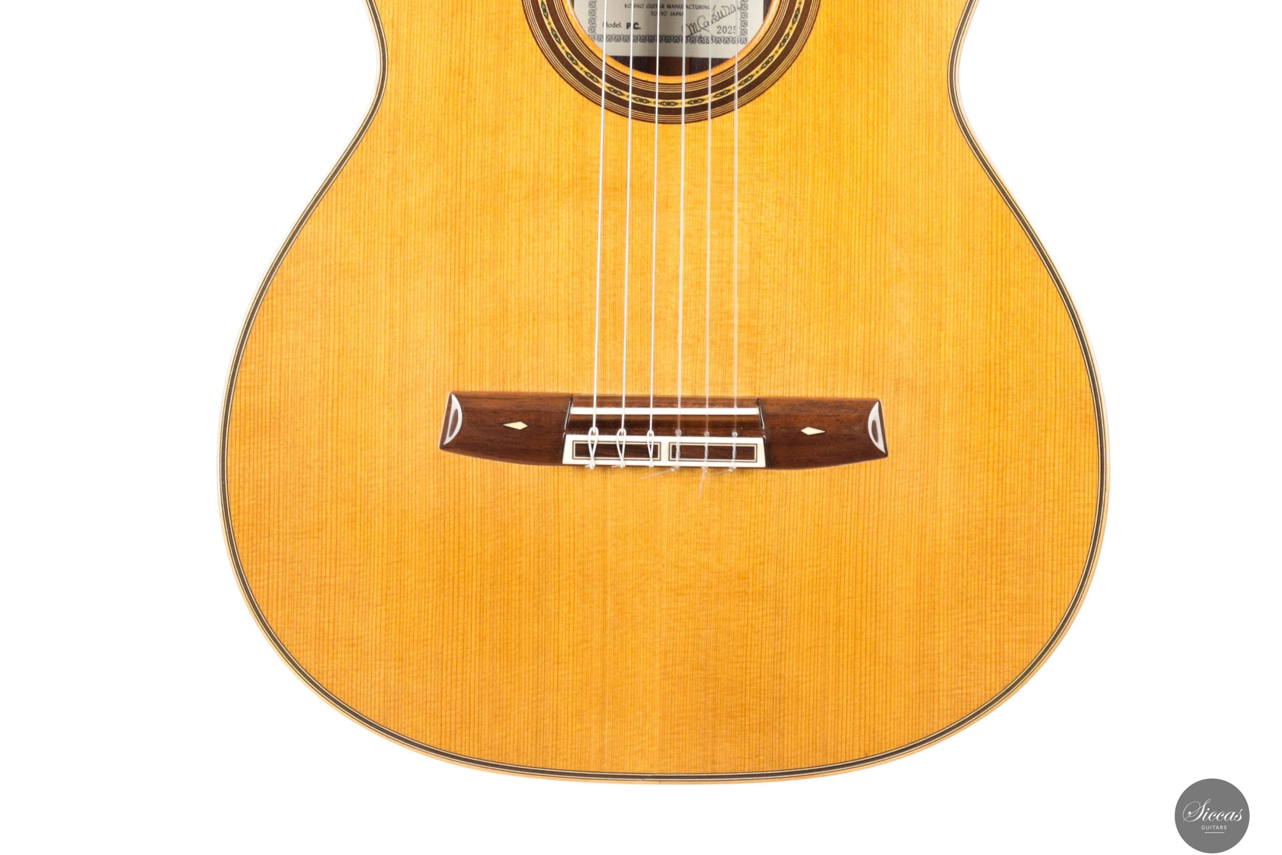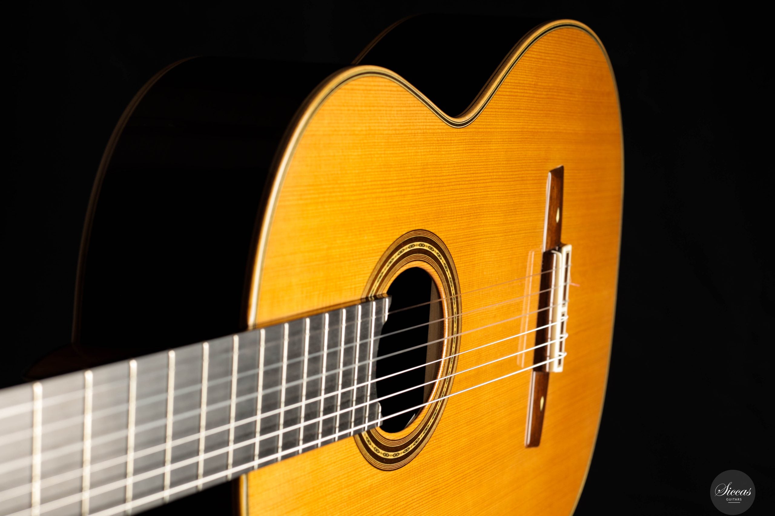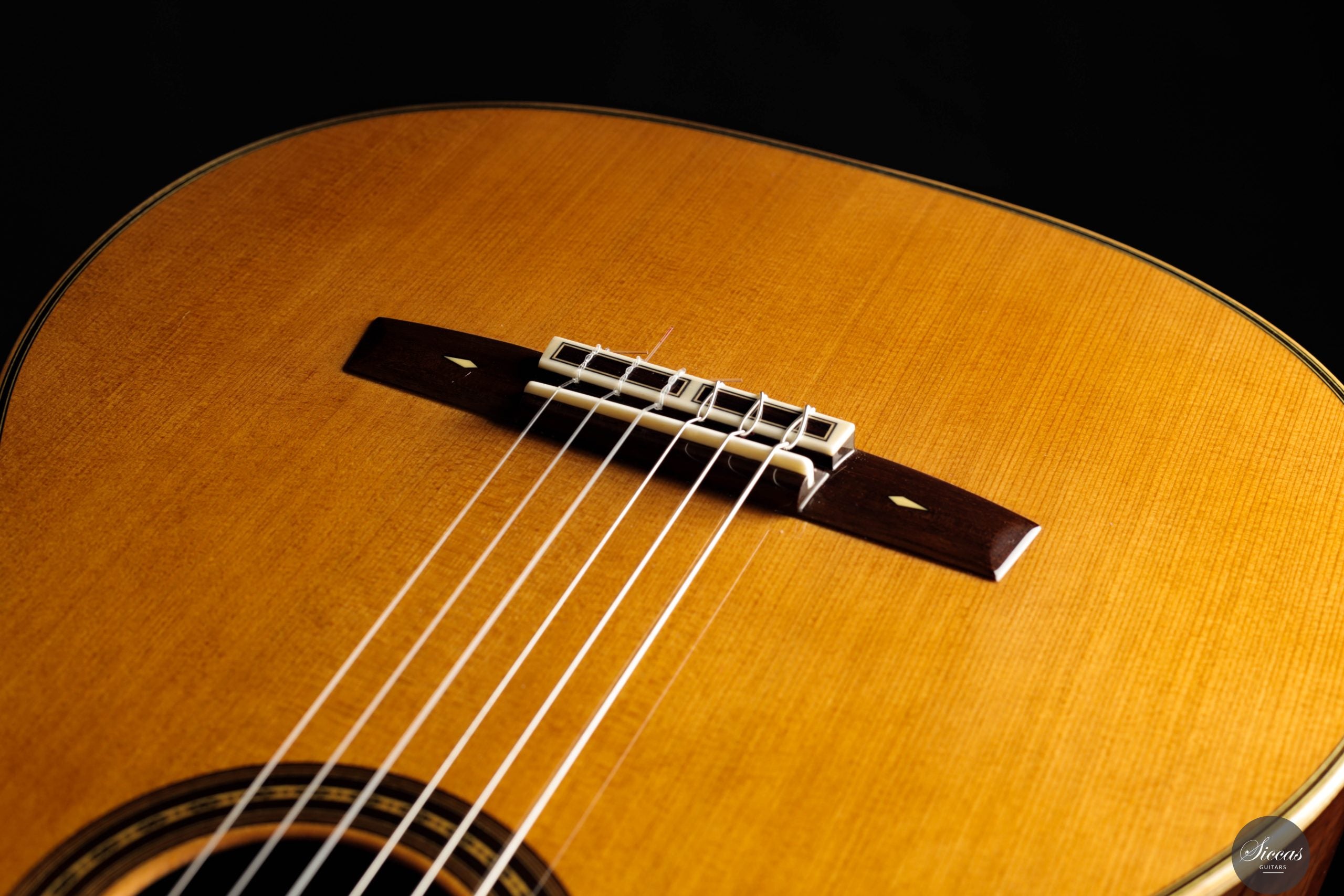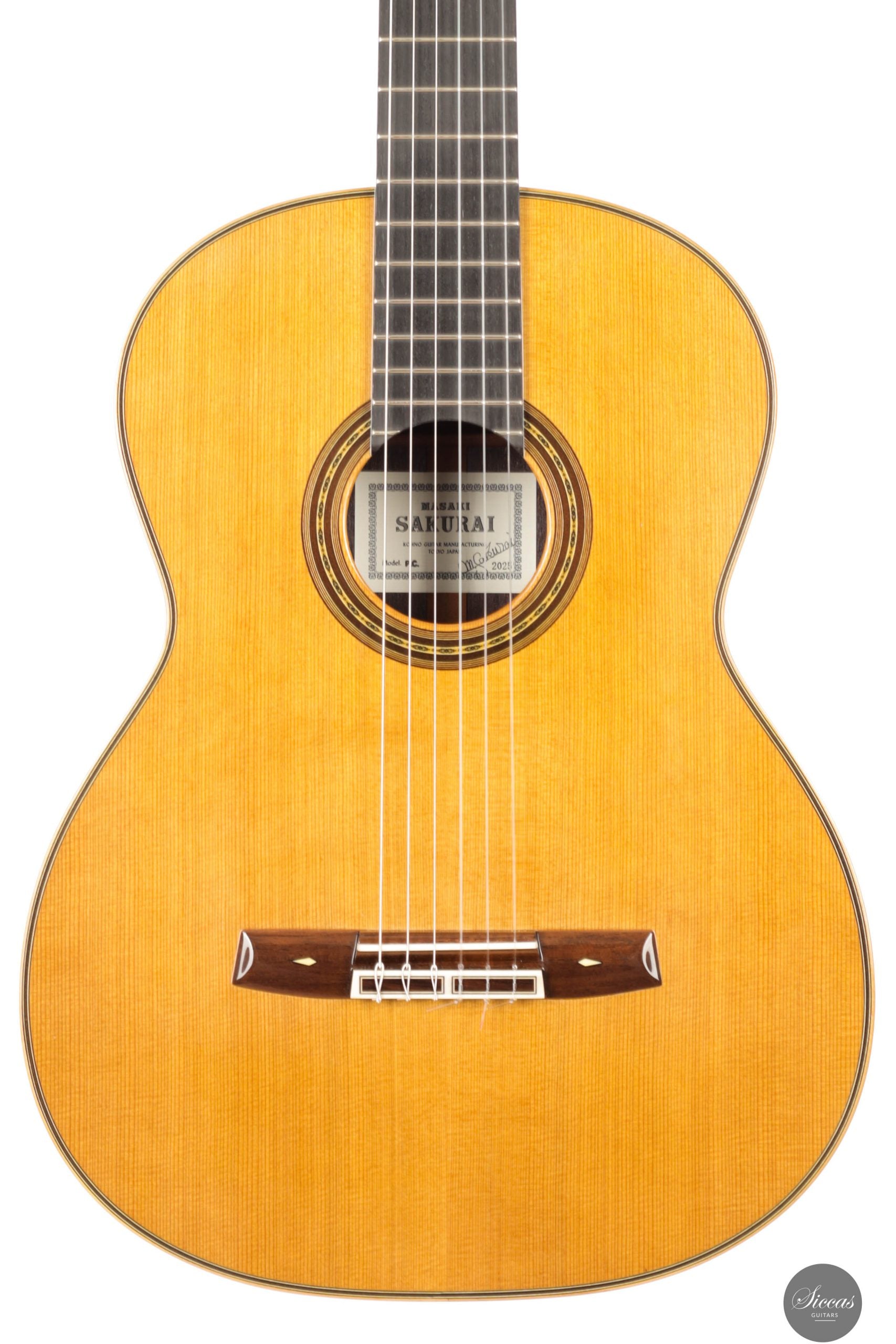 This exceptional 2025 “PC” model (Paris Competition) is a direct descendant of the award-winning guitar that secured Sakurai first prize in Paris in 1988. It represents the culmination of decades of experience and refinement and stands out for its expressive power and elegant presence. The cedar top is finely grained and harmonizes beautifully with the dark, straight-grained Madagascar rosewood back and sides, producing a balanced tonal spectrum with strong basses, full mids, and rounded trebles. Its voice is clear, nuanced, and effortlessly projects, making it an ideal concert instrument.